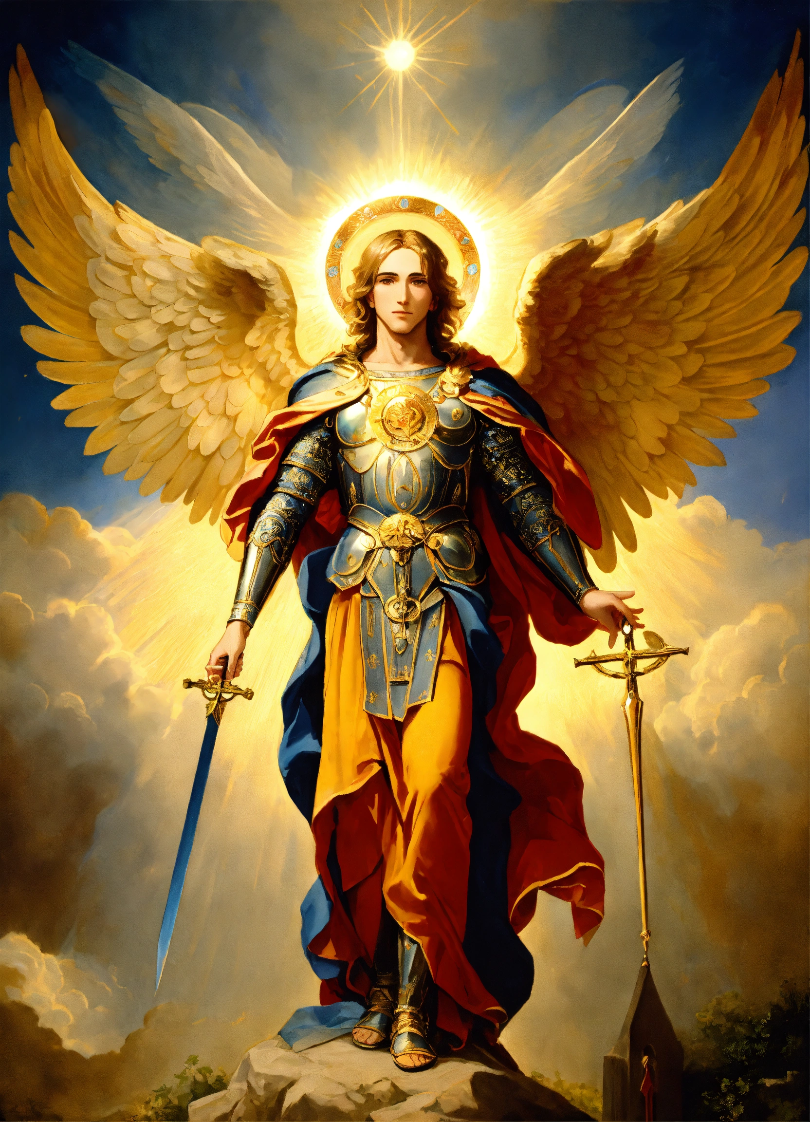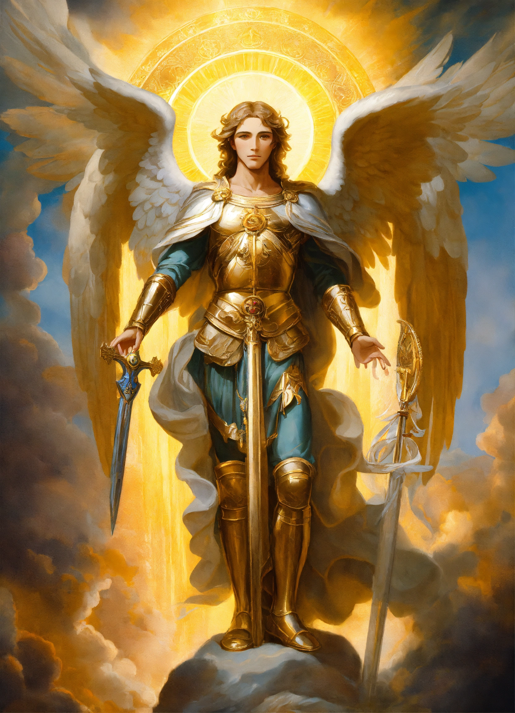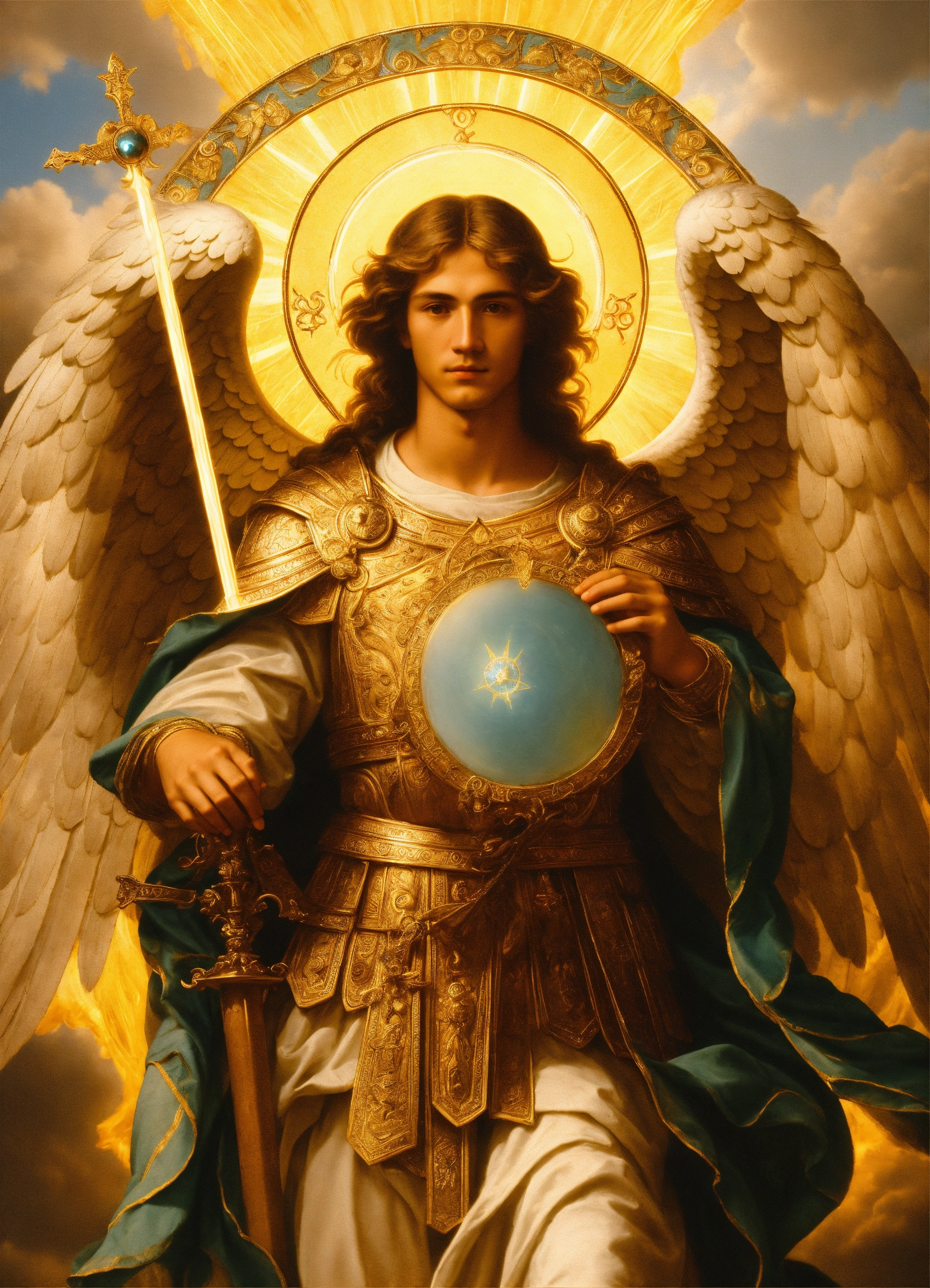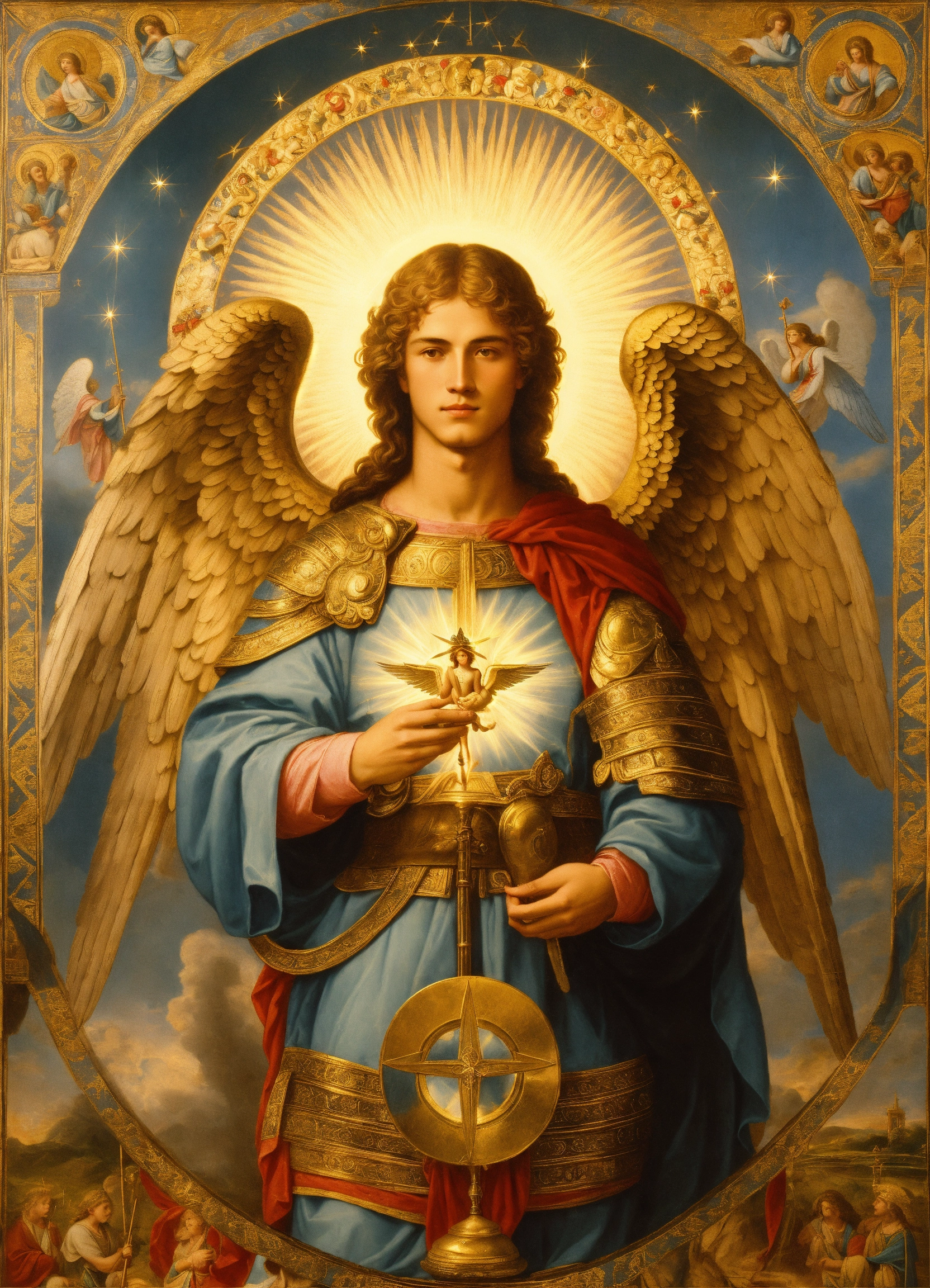 Archangel michael with an elderly visage, mystical presence, radiant halos, surrounded by divine messengers.