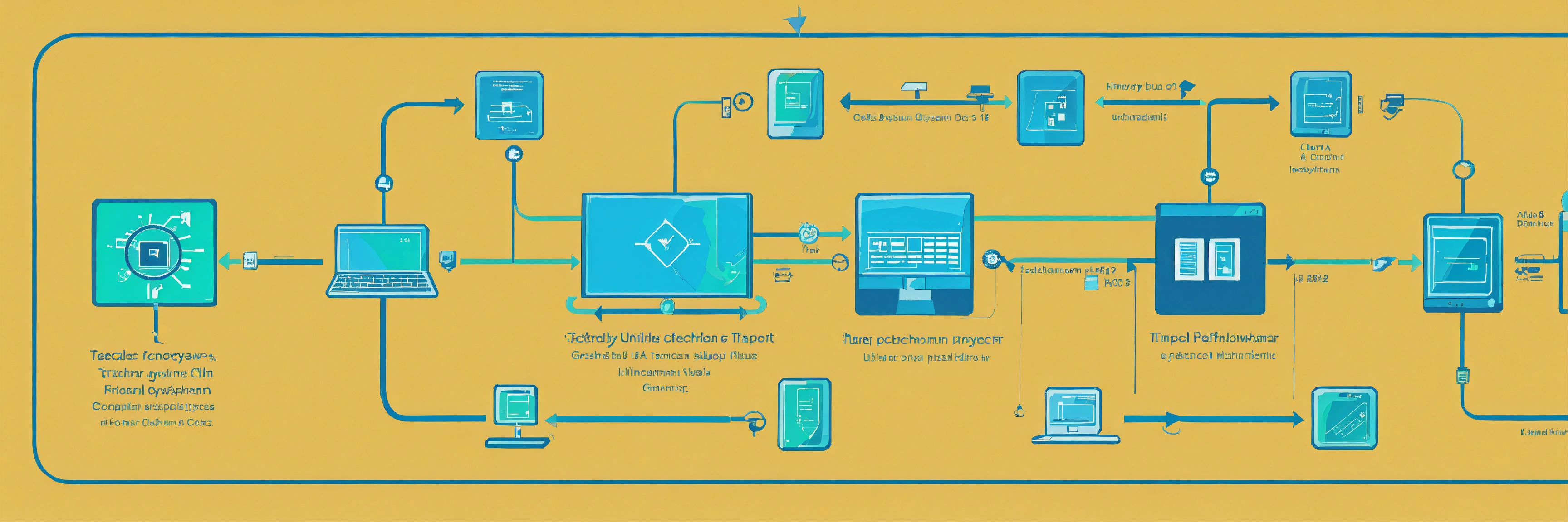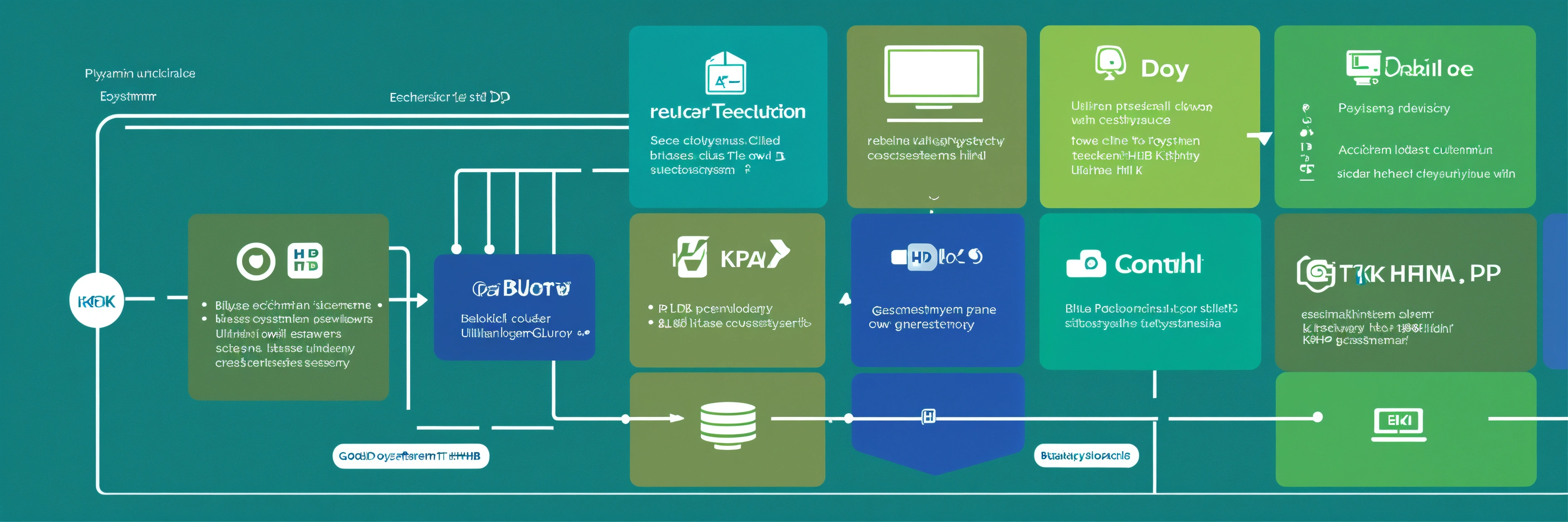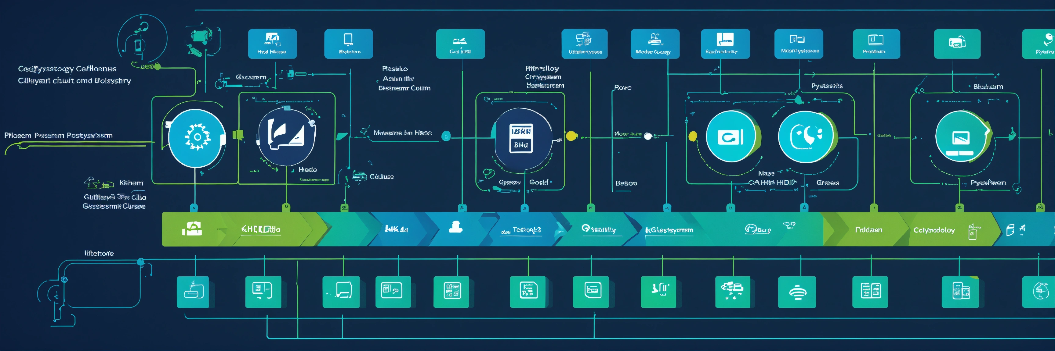 A simple flowchart of technology symbols that represents a partner ecosystem for use as a slide background. modern. brand colours are #024da1 and #37b884. blues and greens. ultrahd, kodak colour quality, 8k.