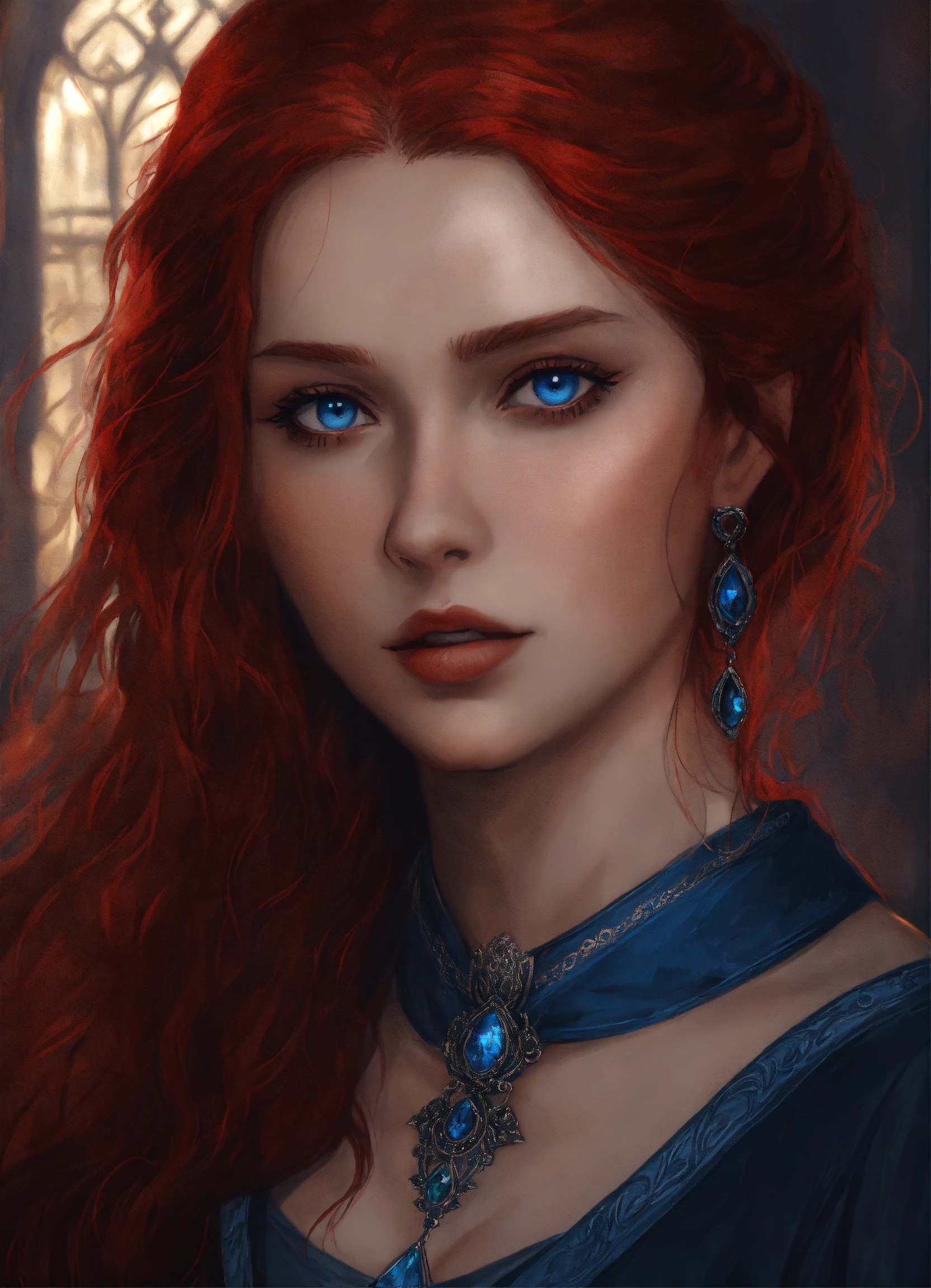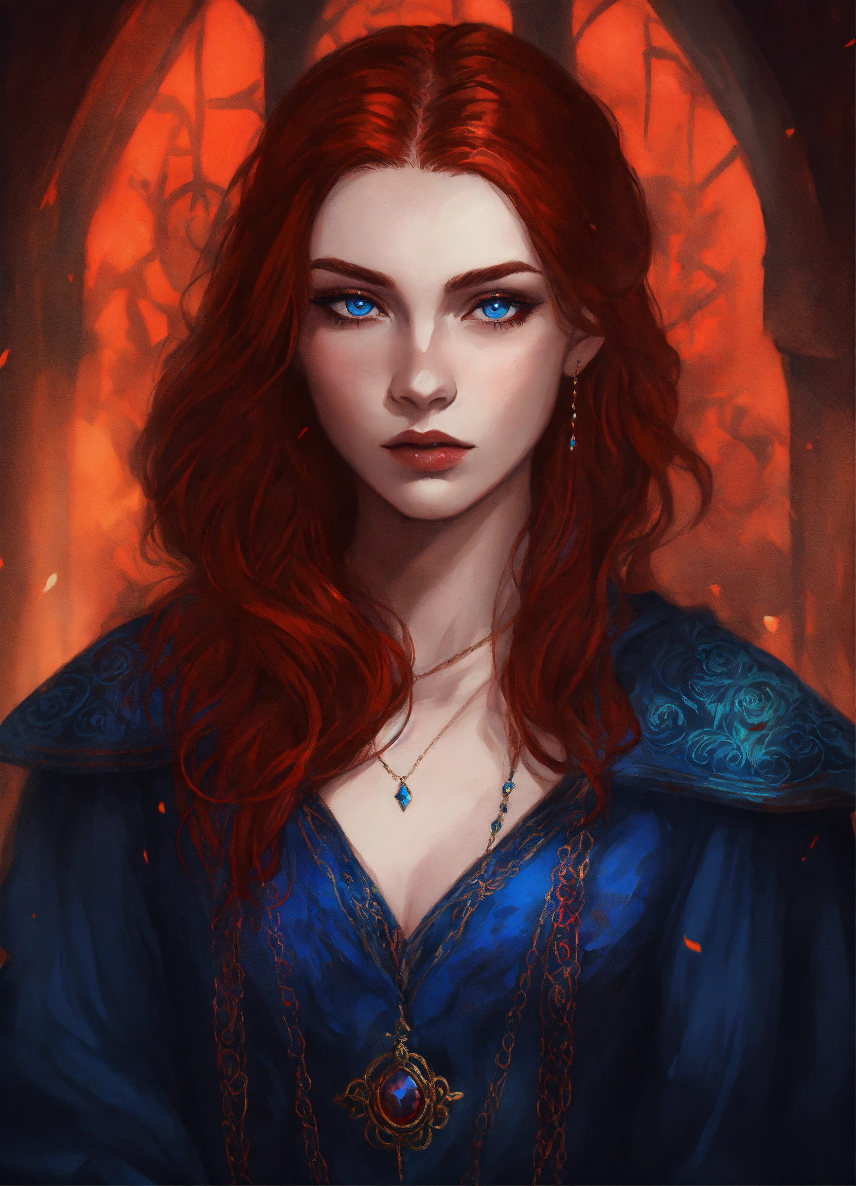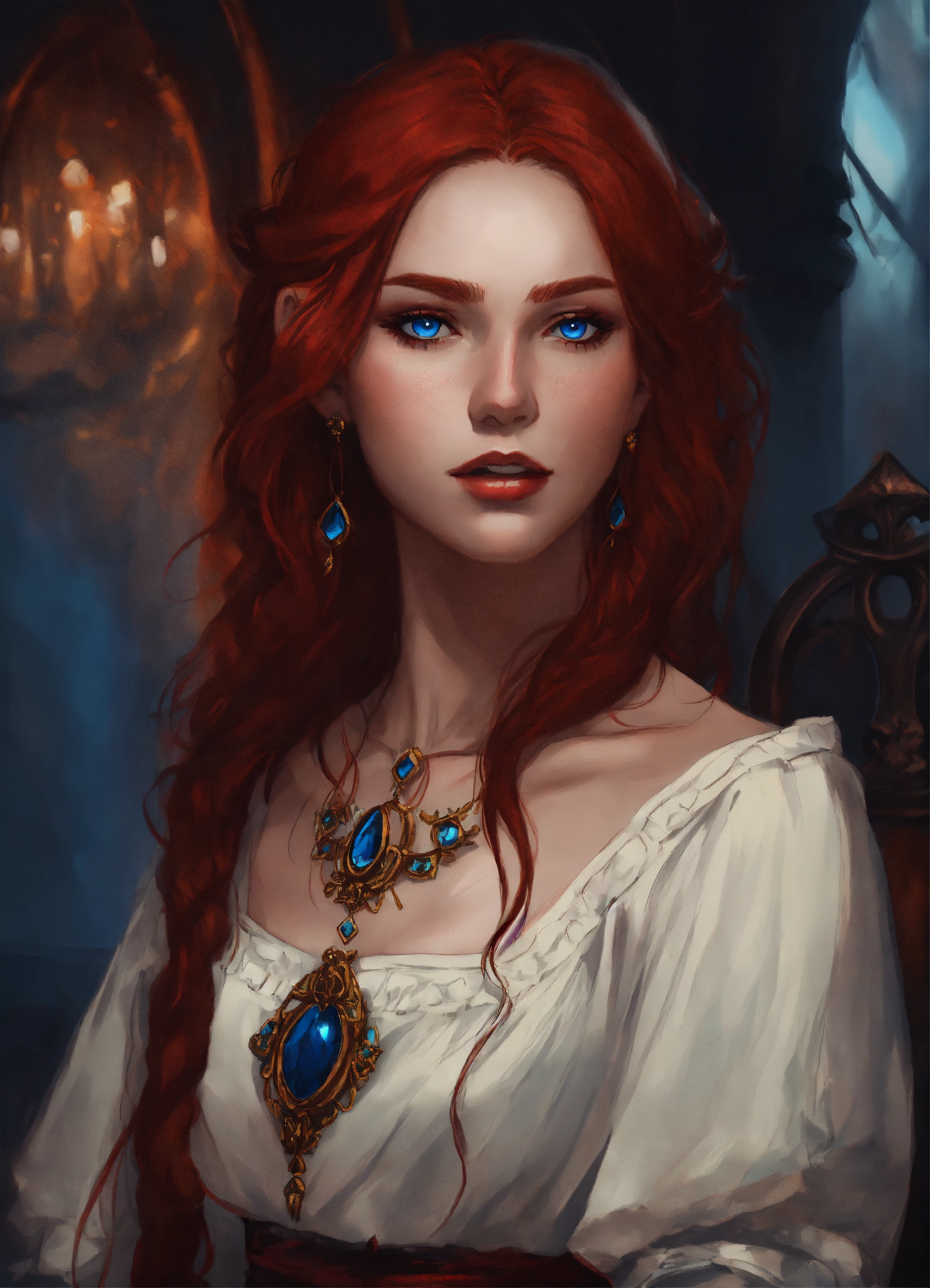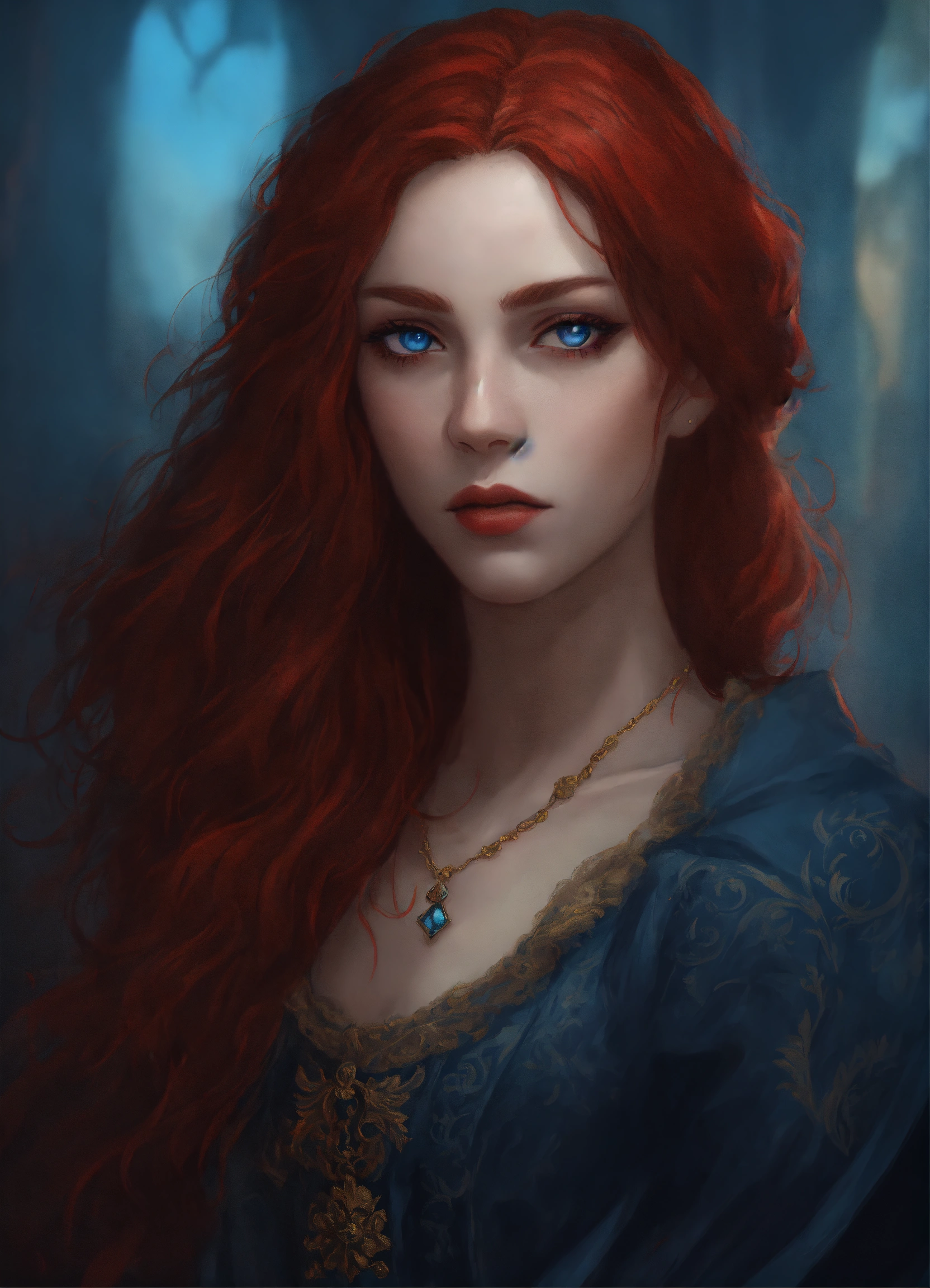 Drawing of portrait of russian 20 year old woman dark evil red hair, fantasy, pale skin, blue eyes, grunge aesthetic!!! fantasy dark background!! curse of strahd