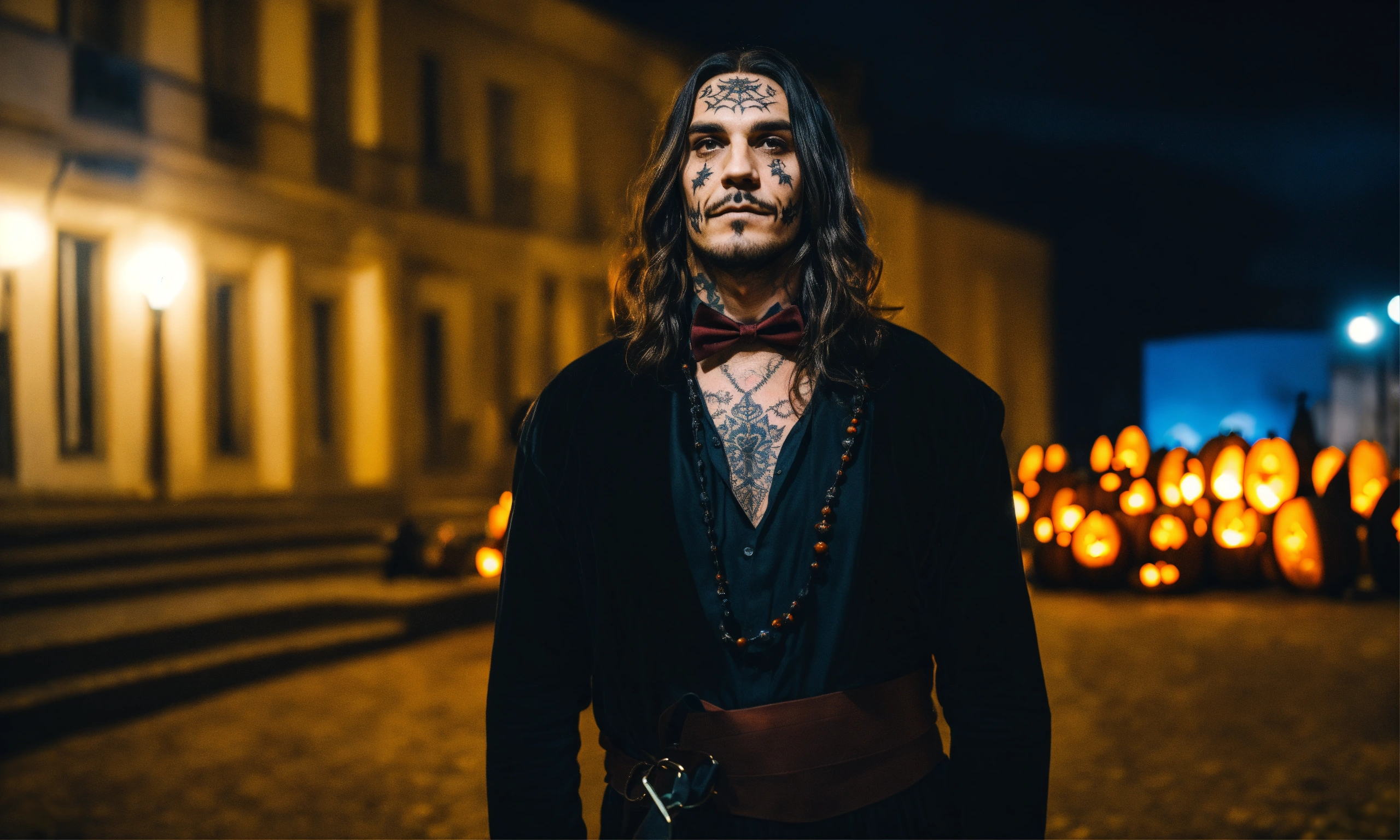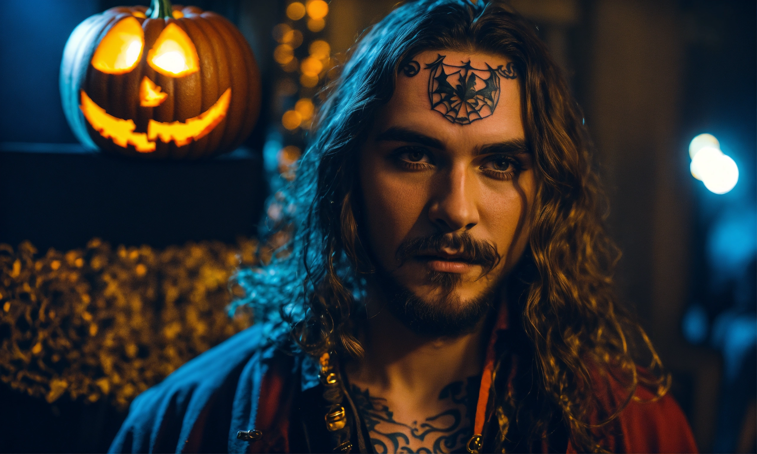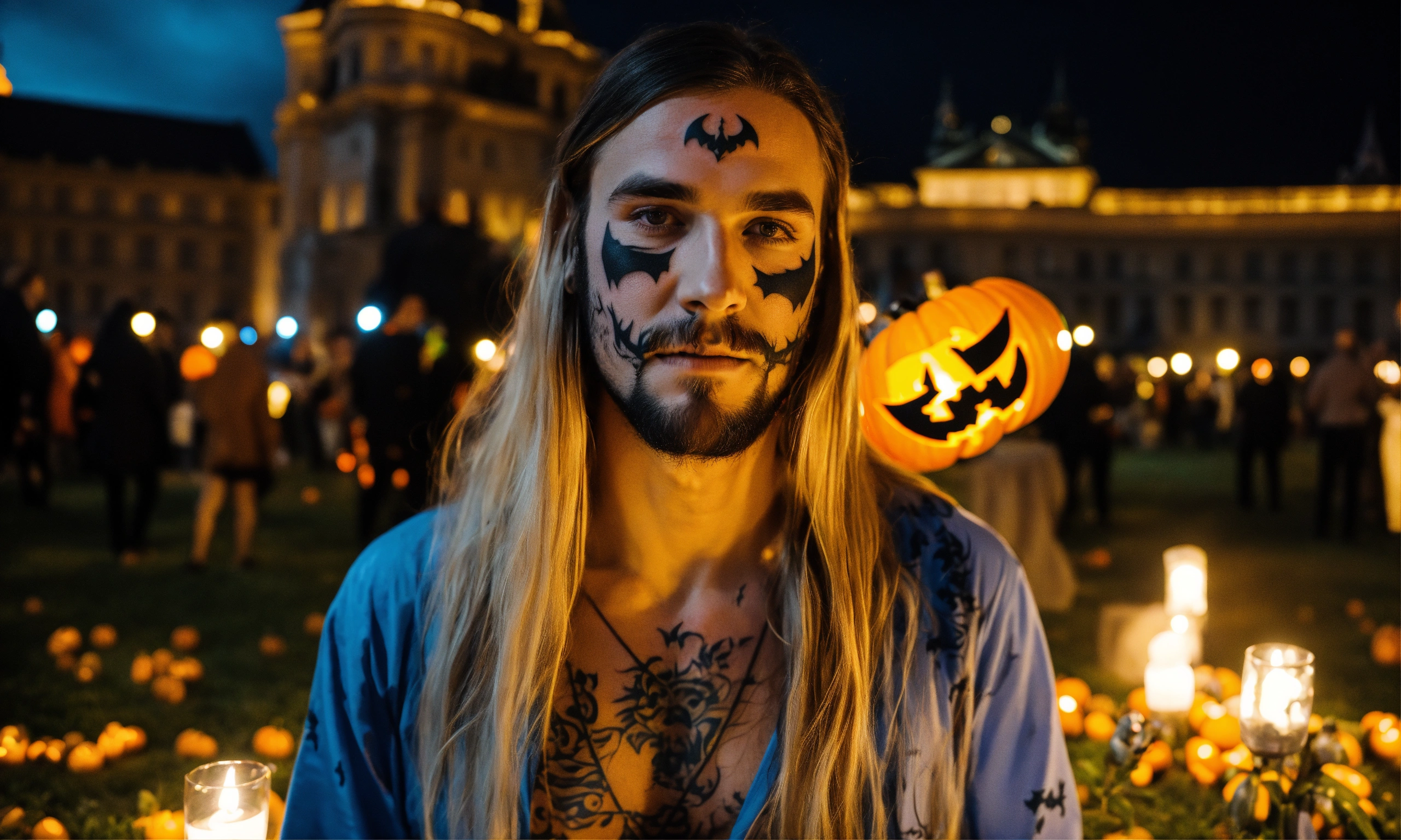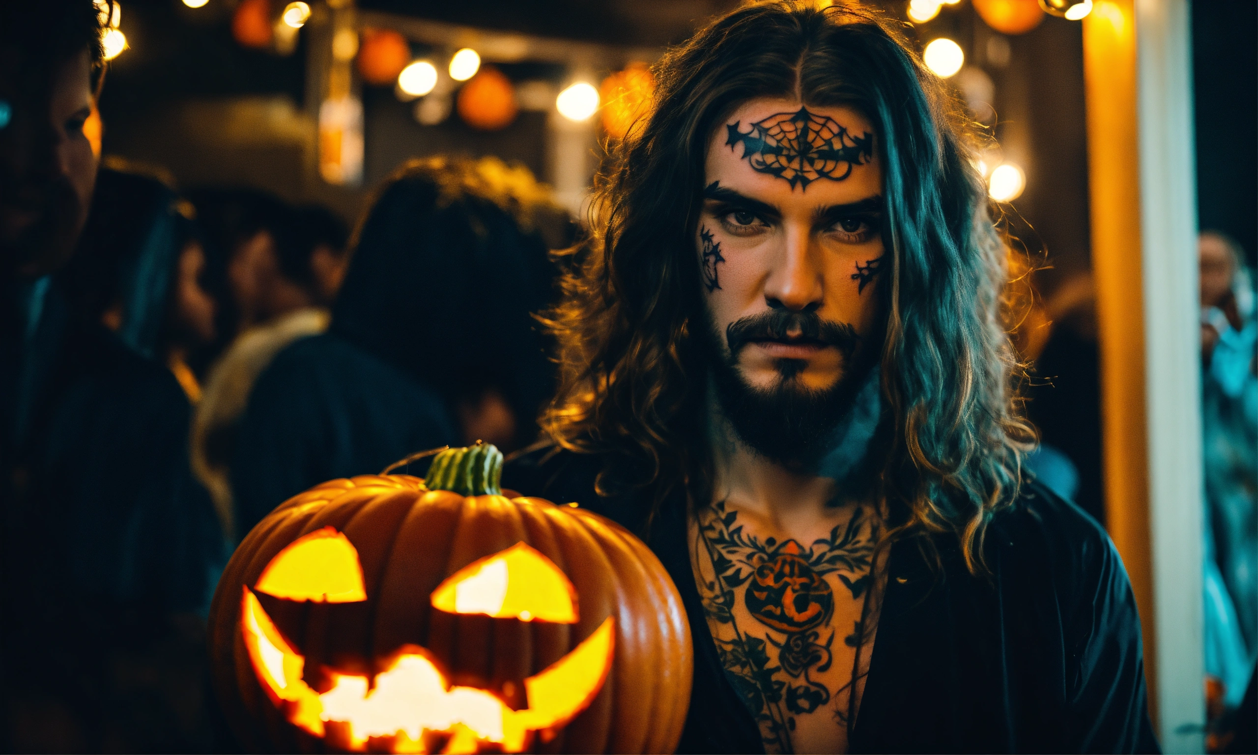 Сute man with light long hair and have tattoo, at a halloween party, in poland, in a halloween costume, warsaw, poland, at the top of the riviera lookinag at the camera at half height, focus on the face, pumpkins