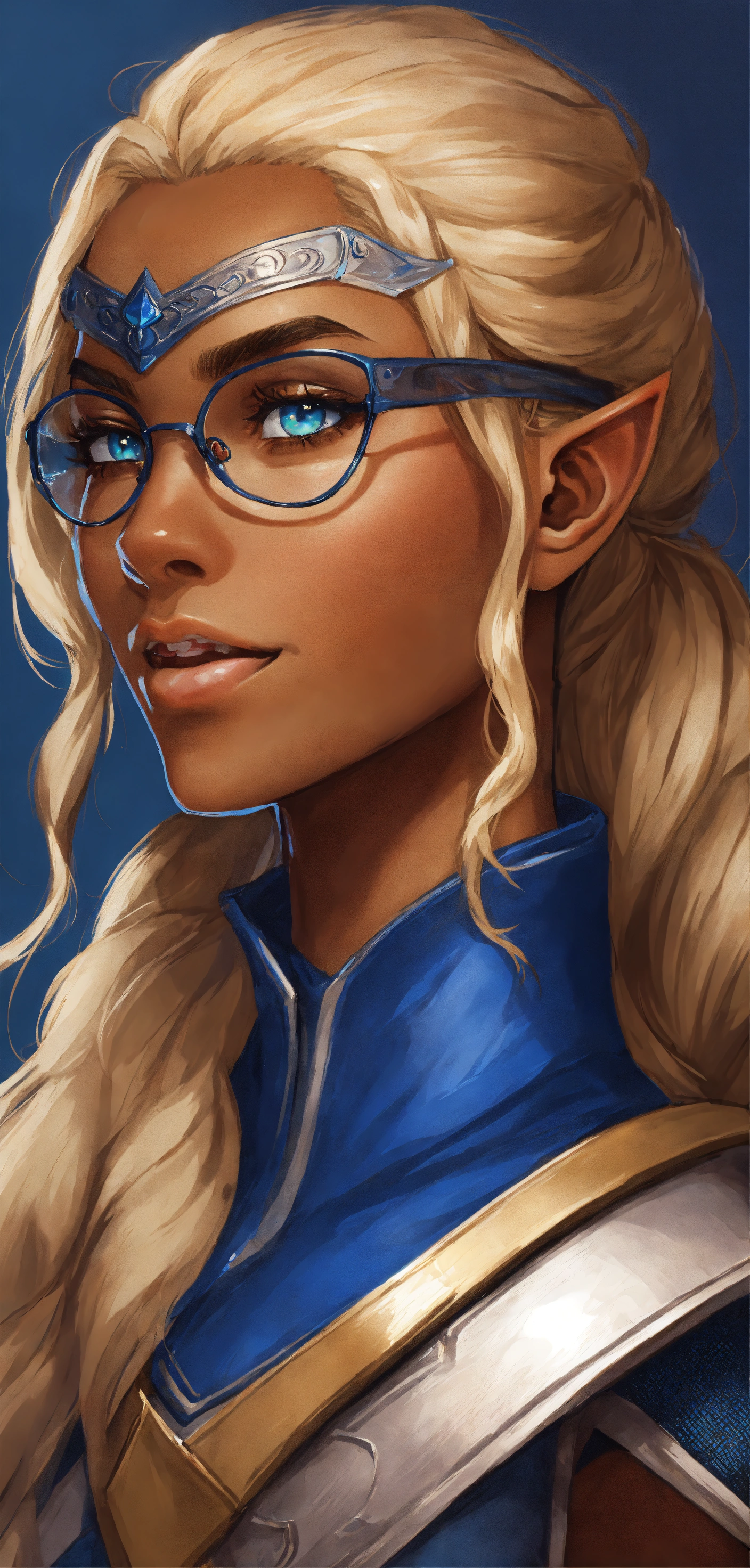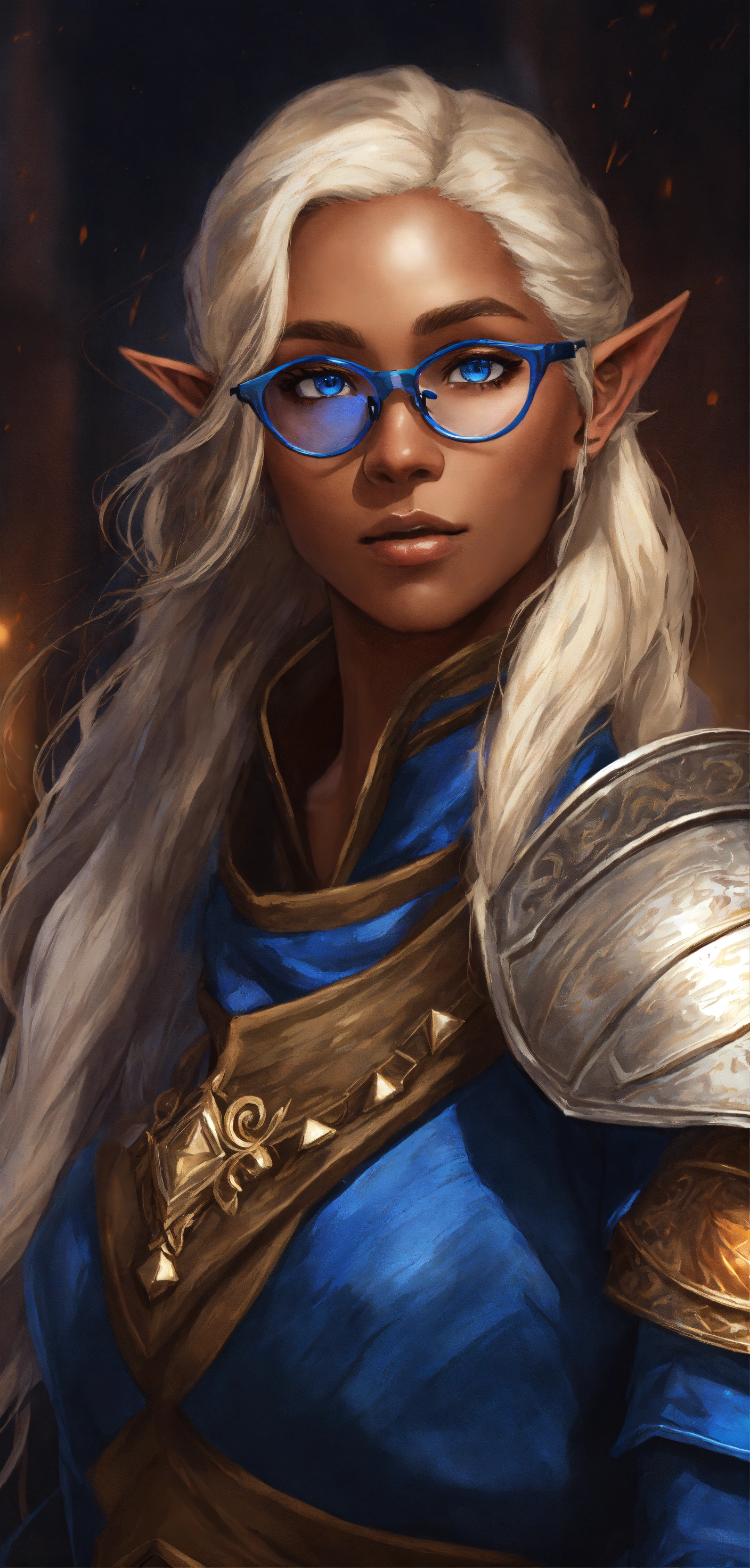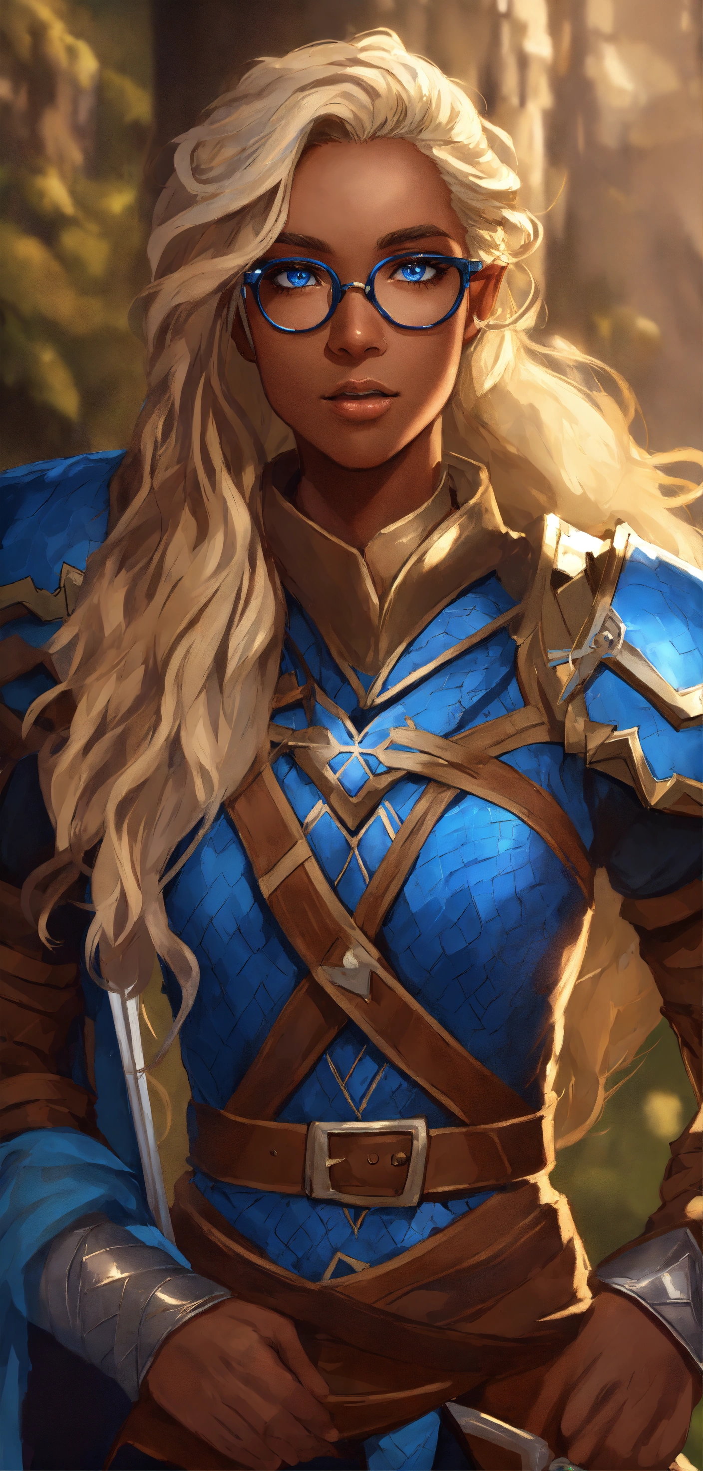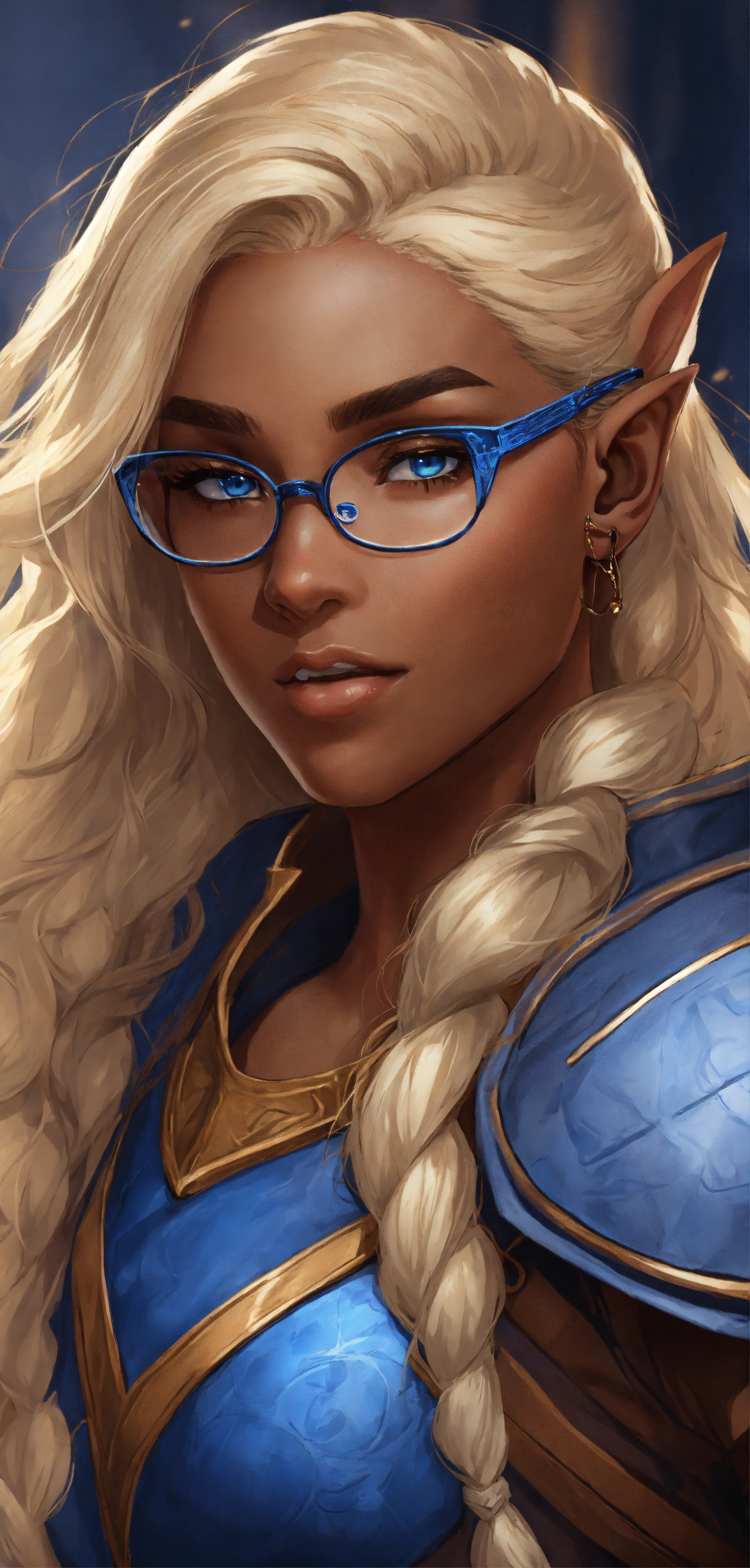 A very brown skinned half elf woman, wearing glasses with deep azure blue eyes, long wavy blonde hair in a ponytail, wearing mail armor