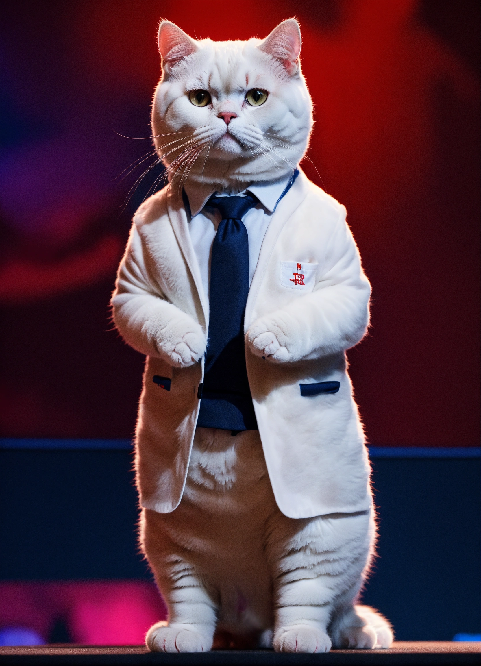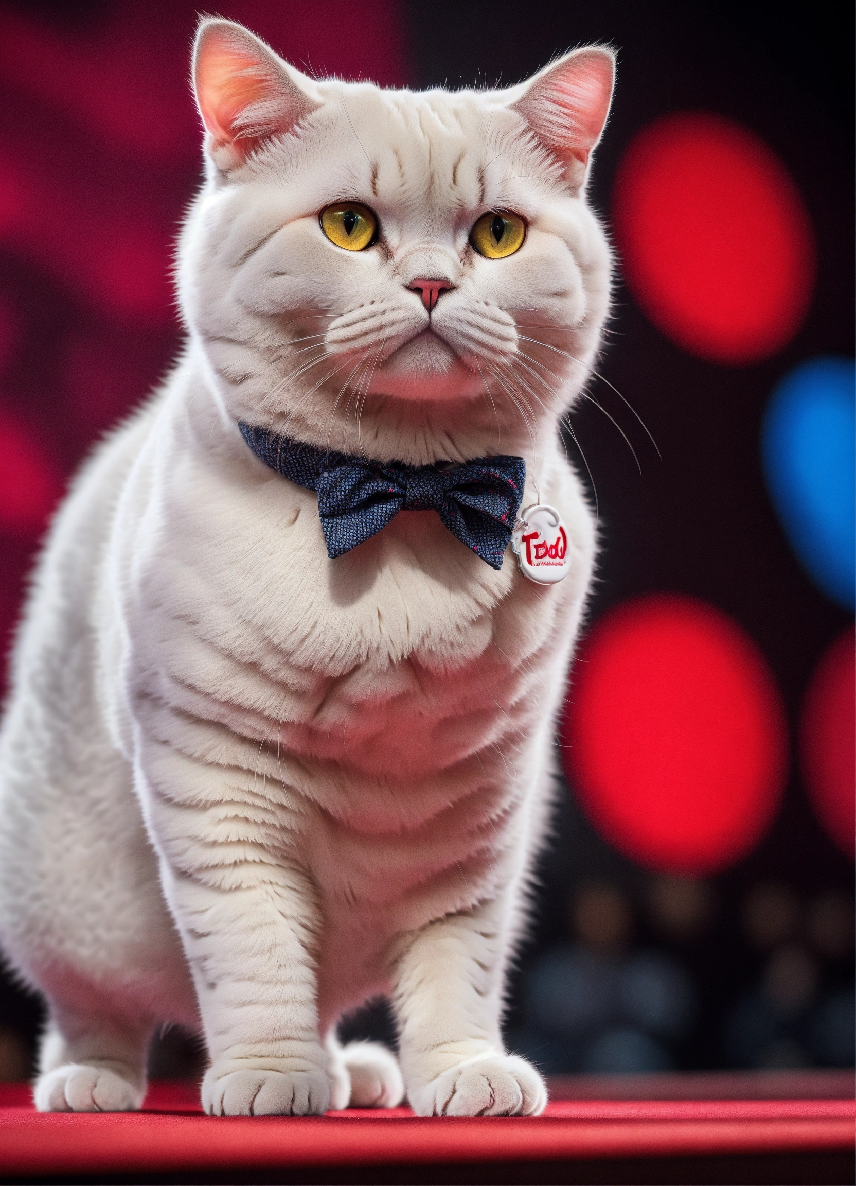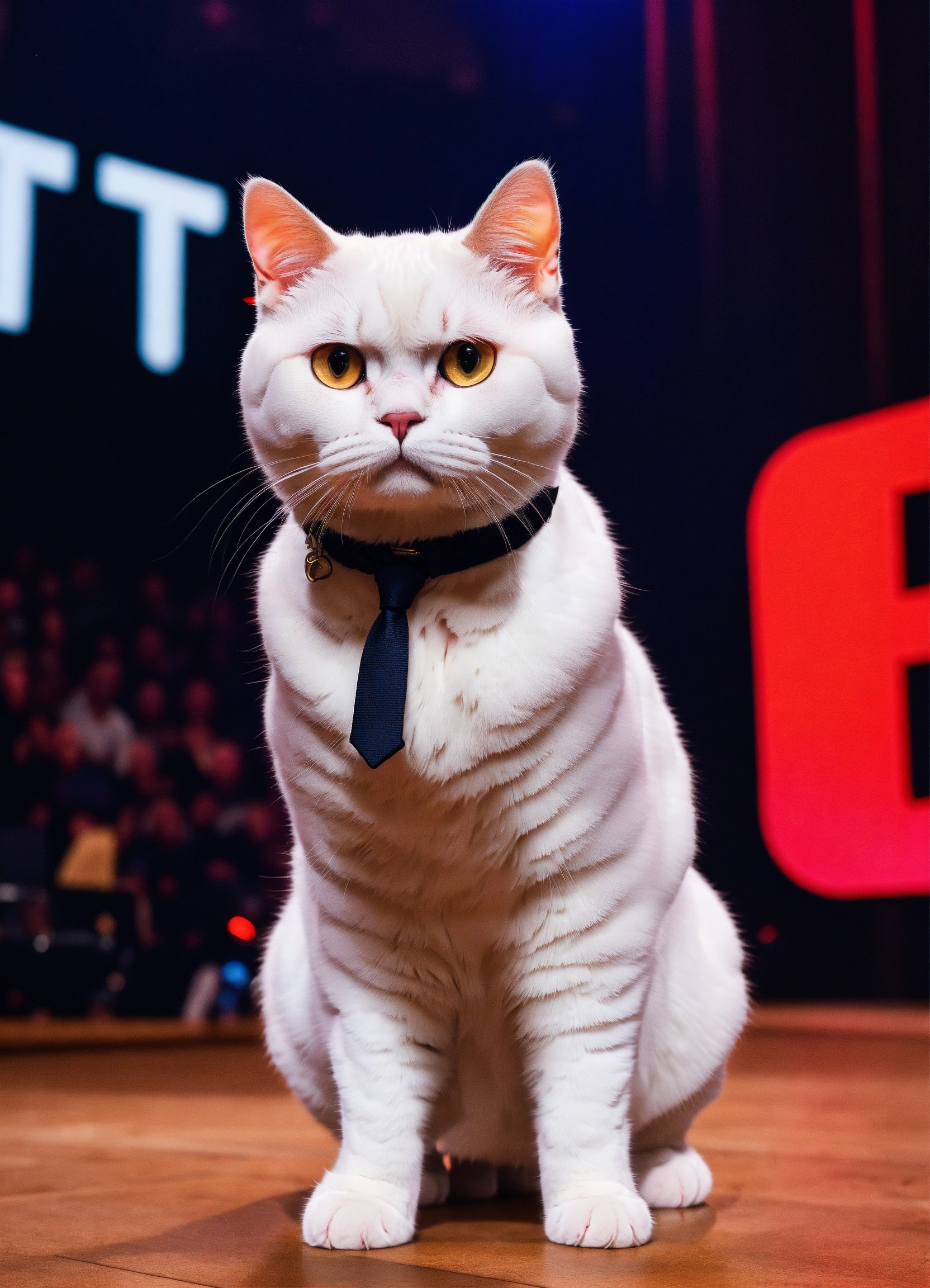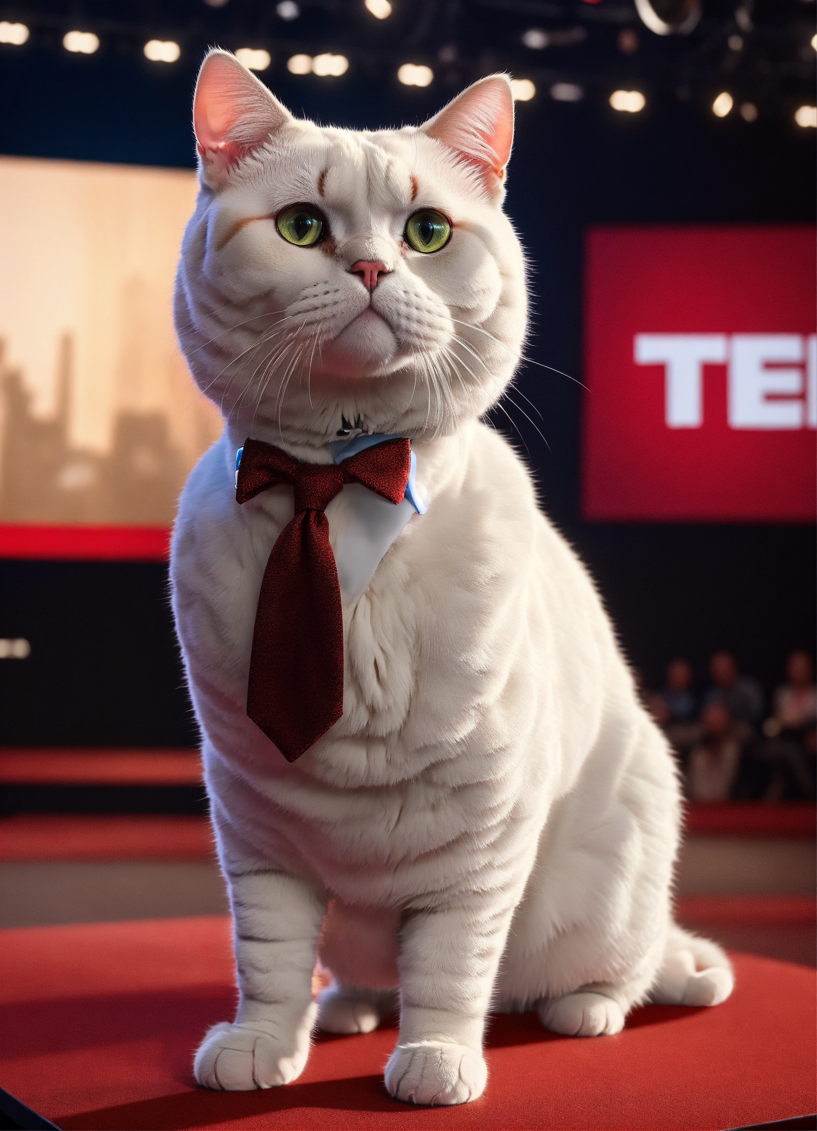 A white british shorthair cat wearing giving a ted talk, standing on stage, business casual, hyper realistic 8k