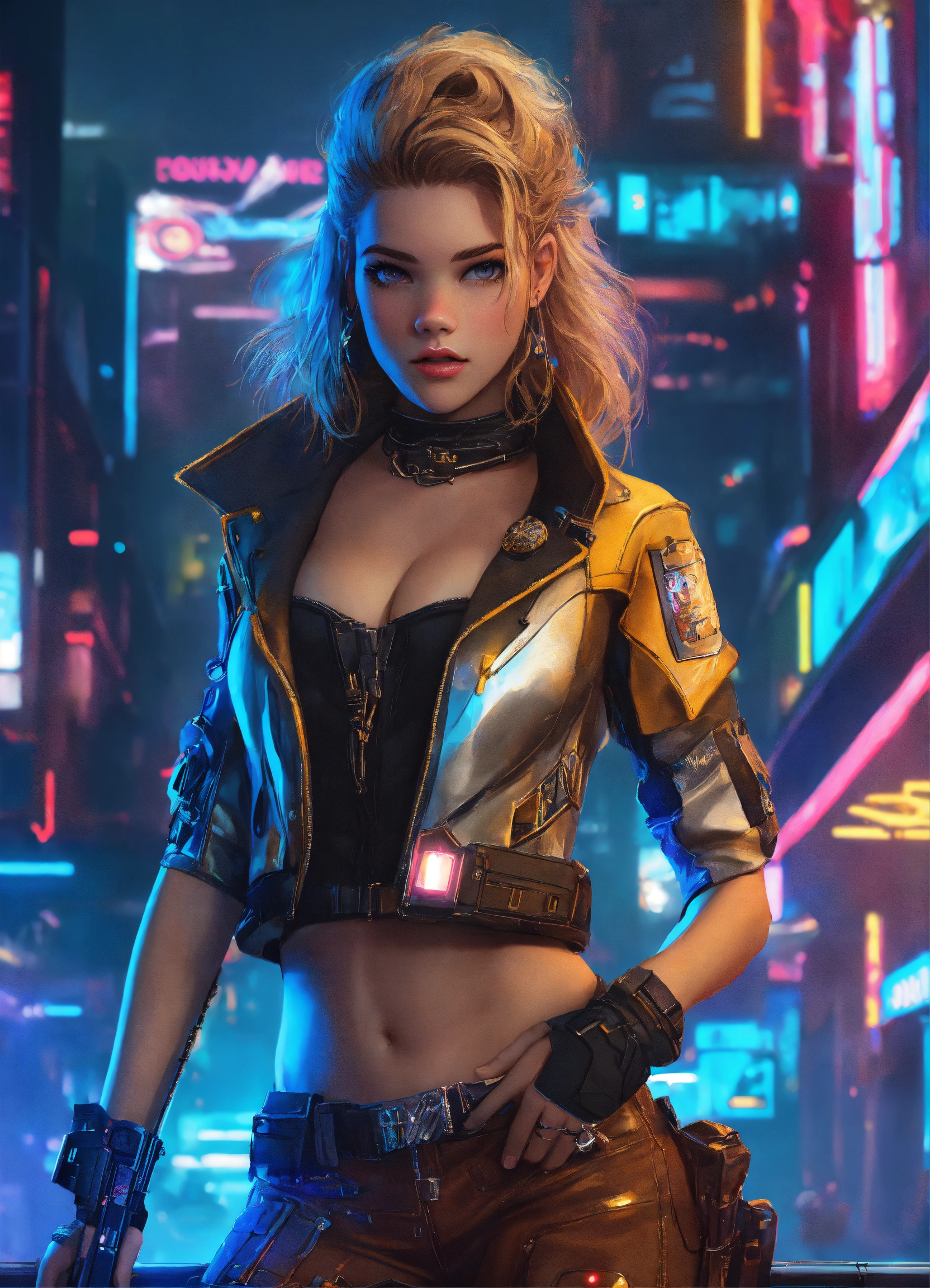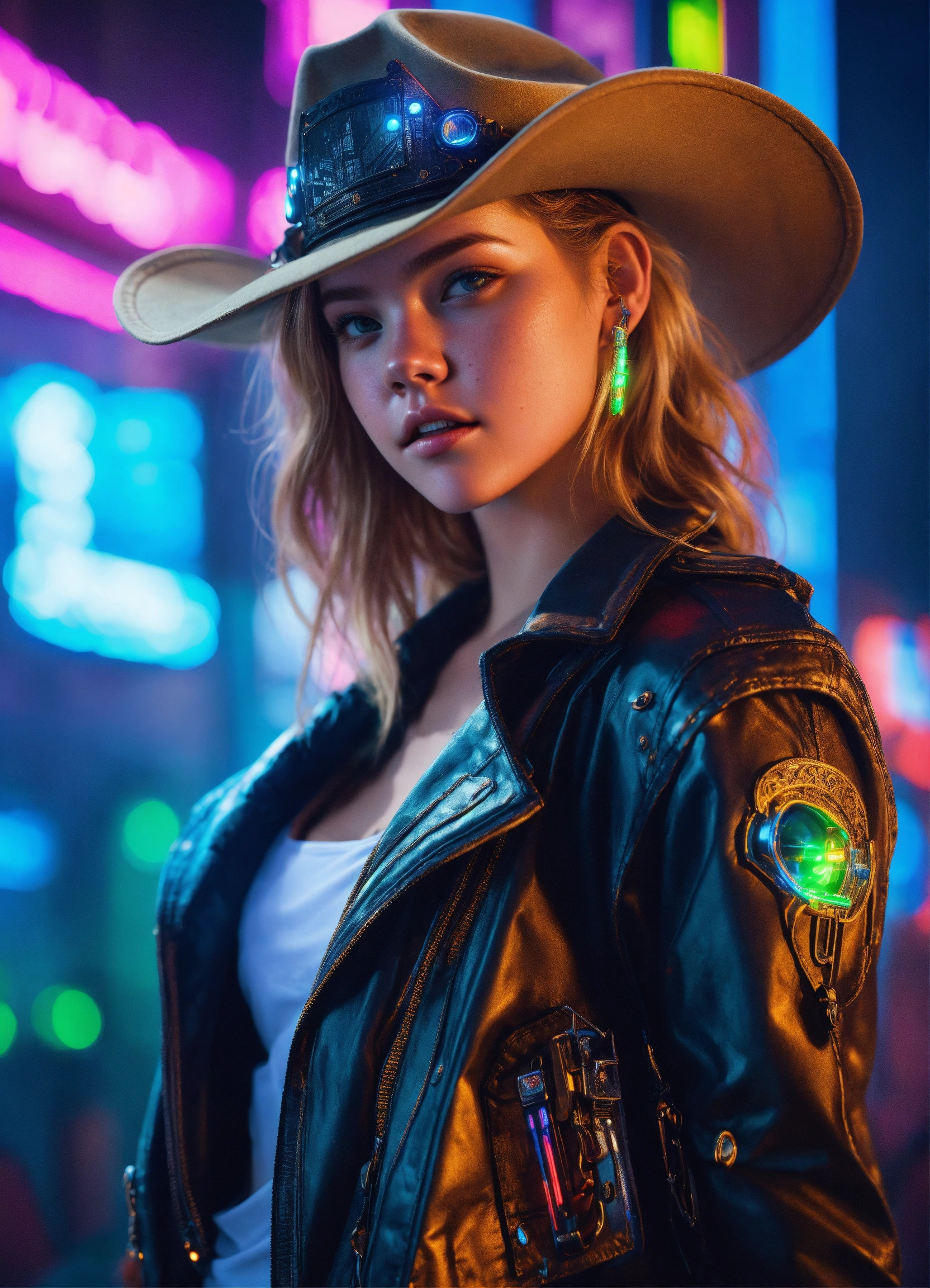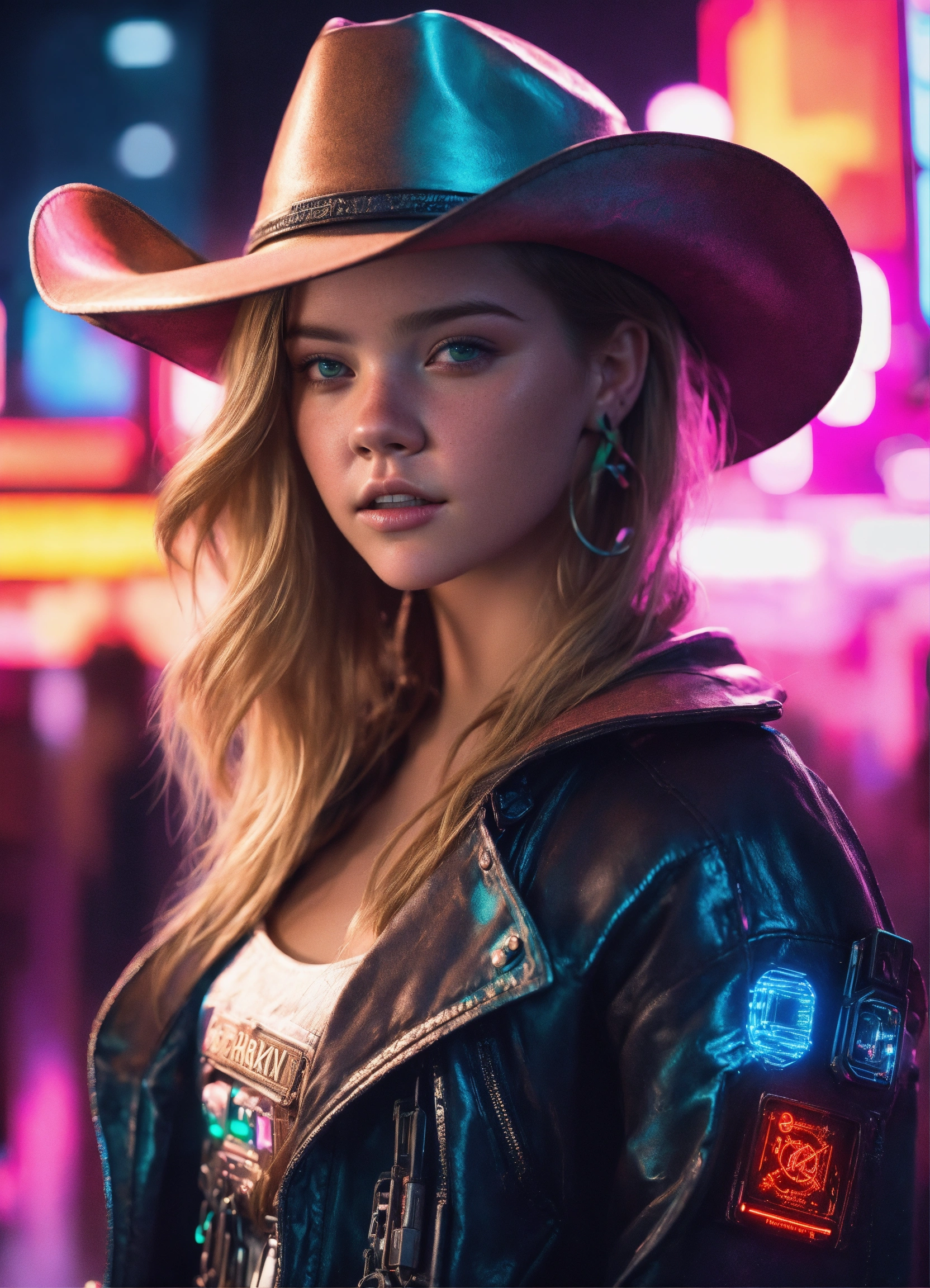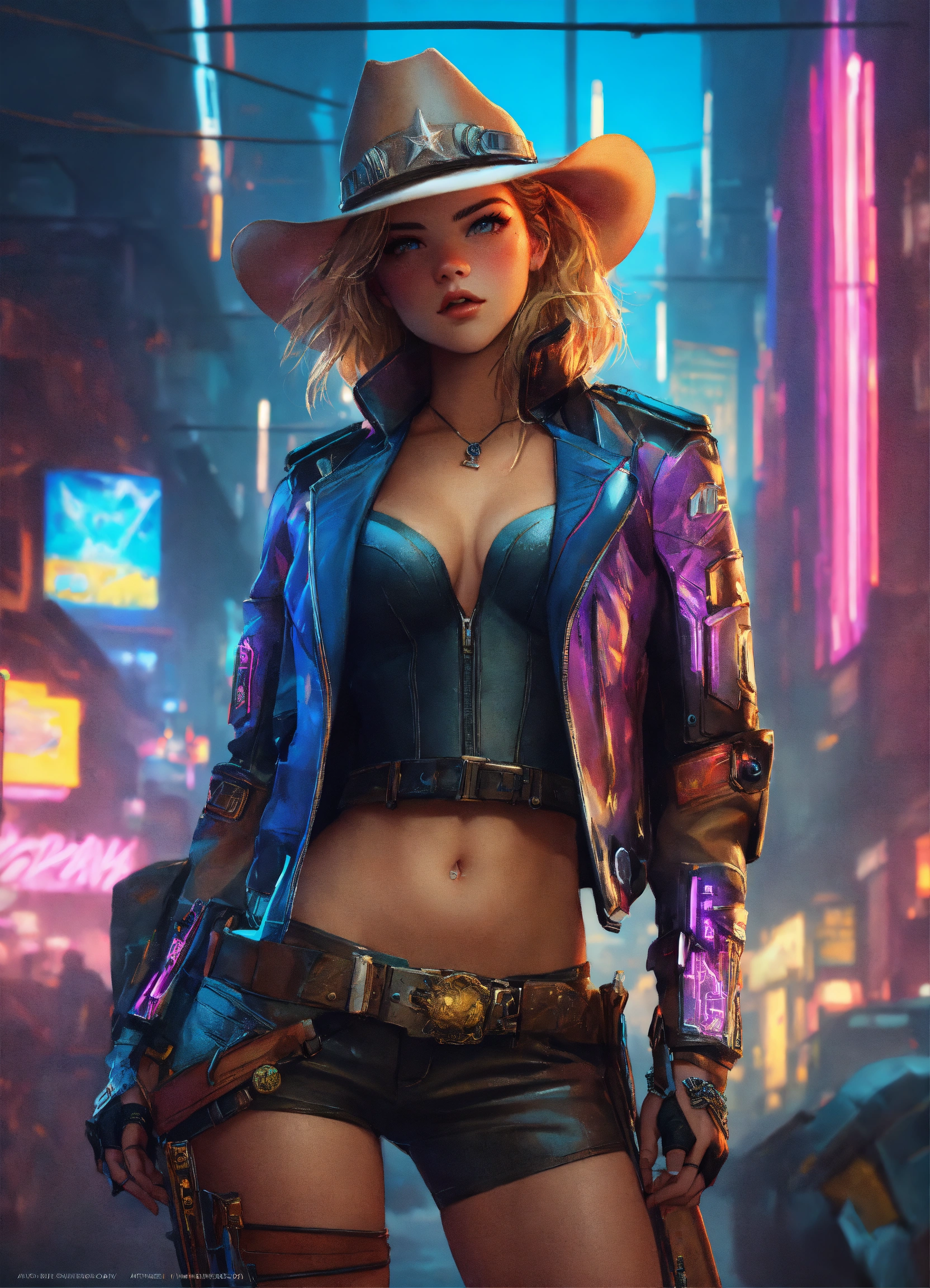 Blonde barbara palvin wearing a cowboy outfit. the scene is set in a futuristic cyberpunk cityscape, with neon lights illuminating the surroundings, the artwork is highly detailed and intricate, this piece is trending on artstation, reference artists for inspiration include artgerm, greg rutkowski, and jiří barbacha