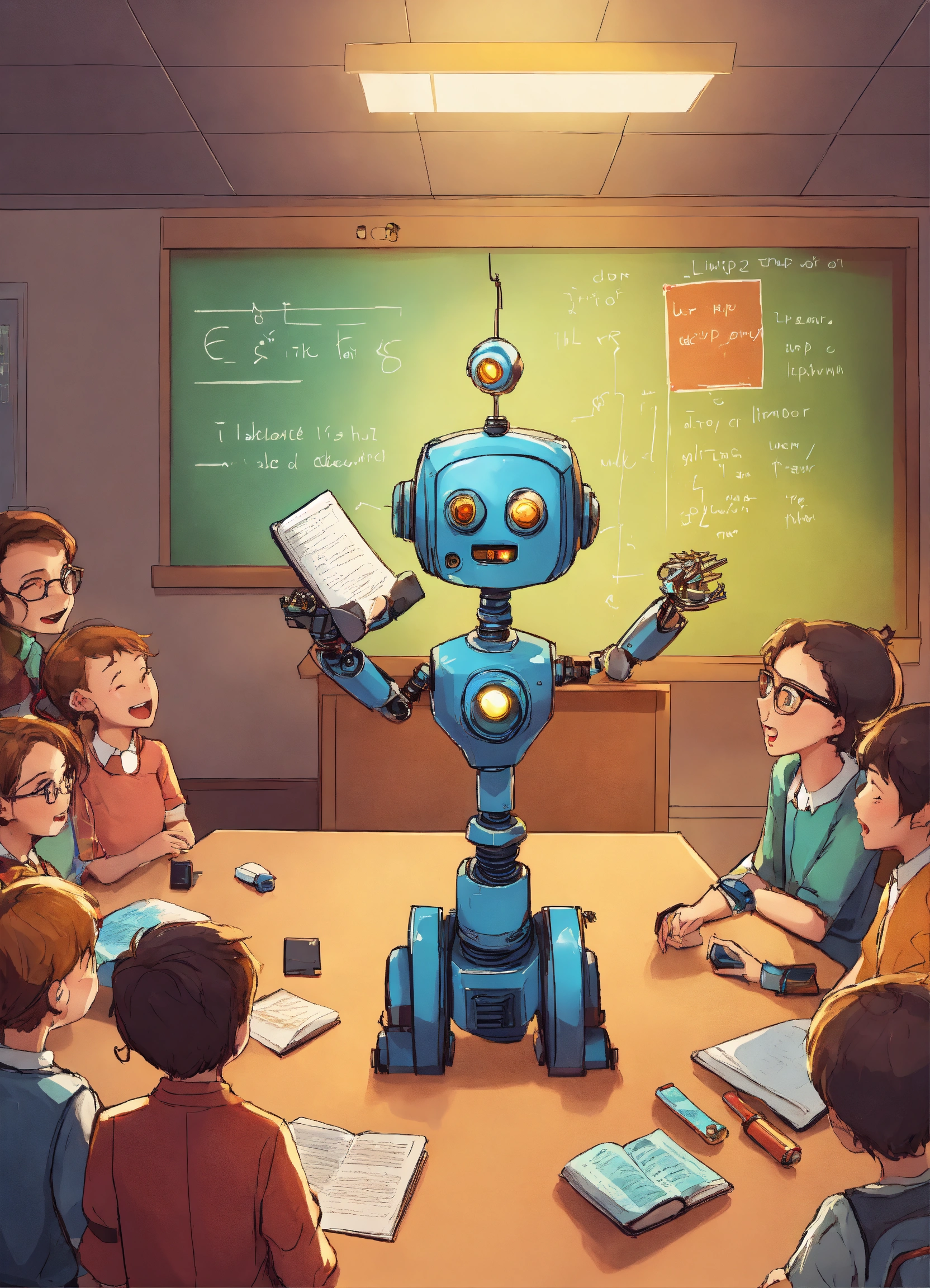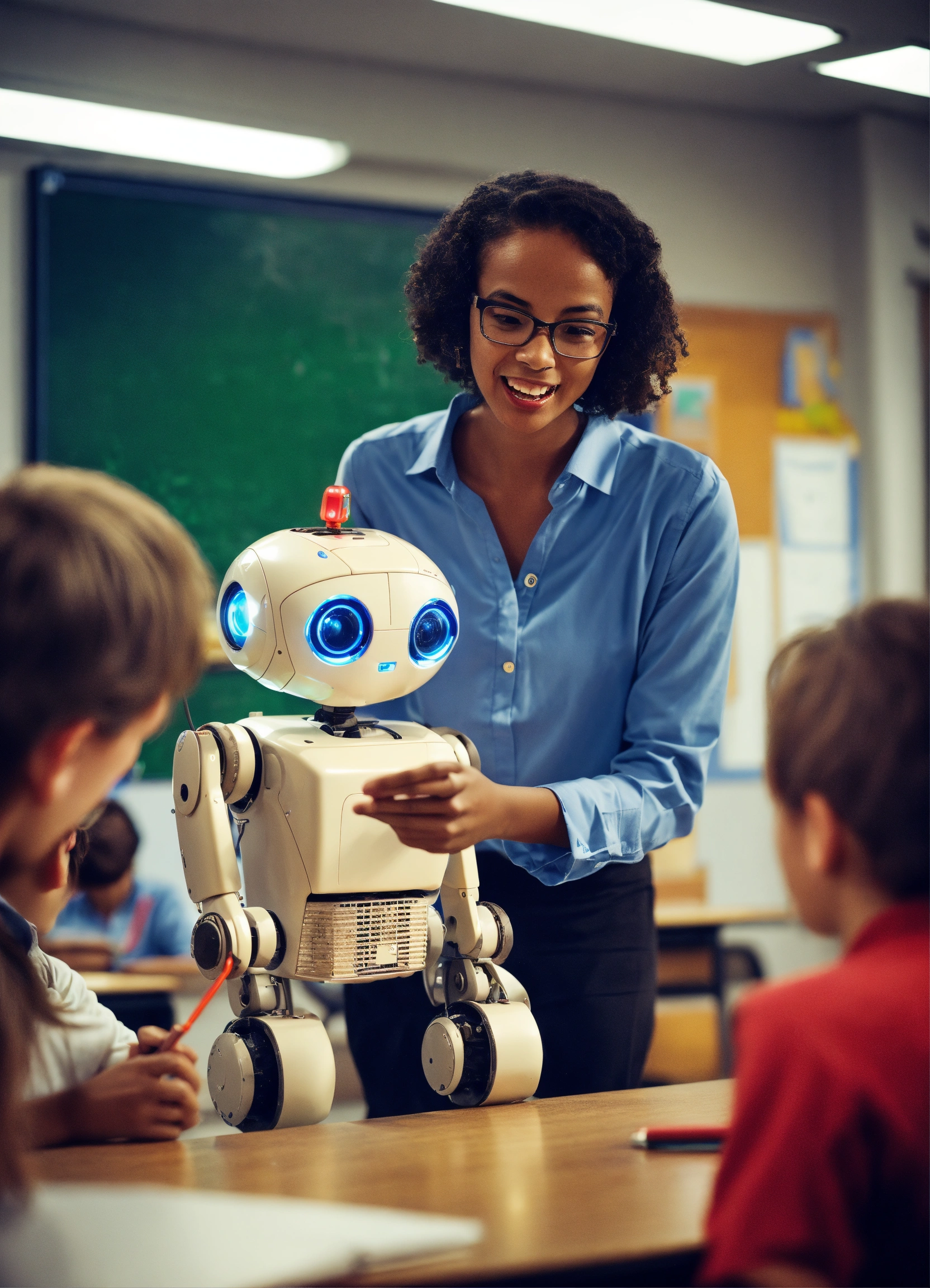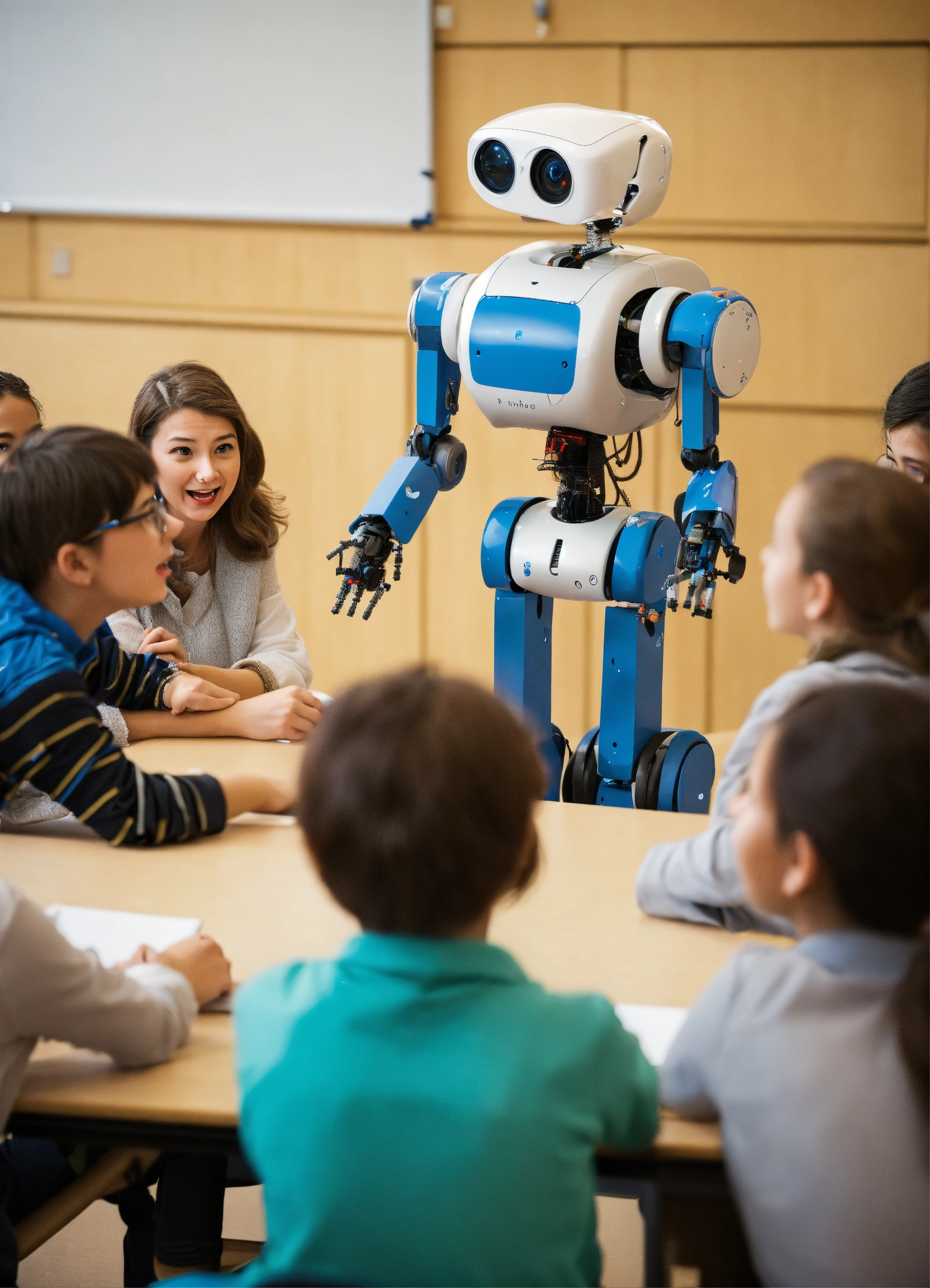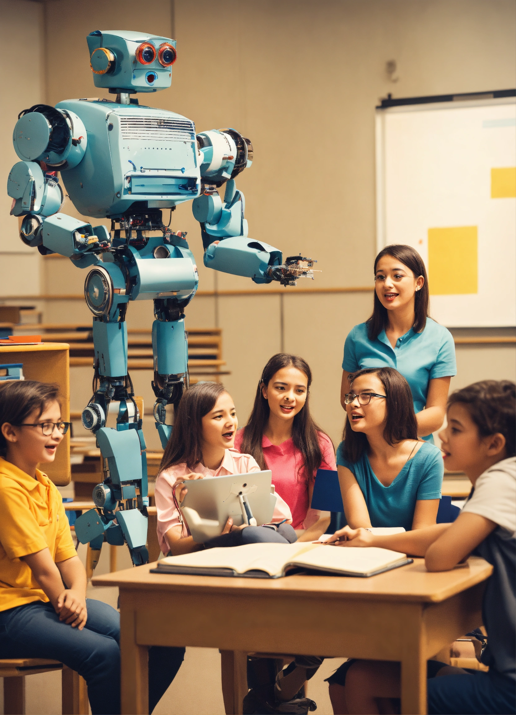Euphoric teacher explaining a lecture to a group of brilliant students with the help of a little robot