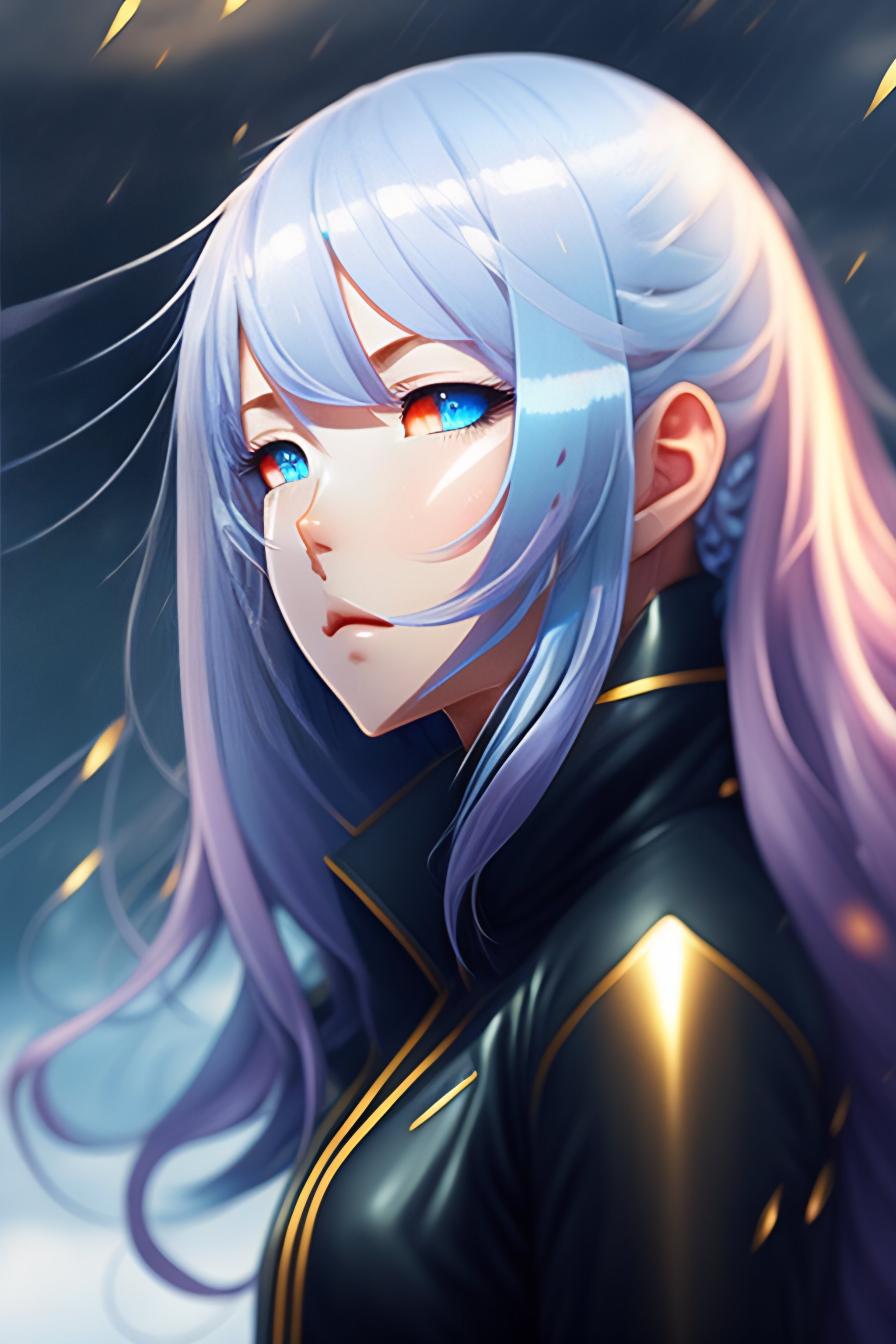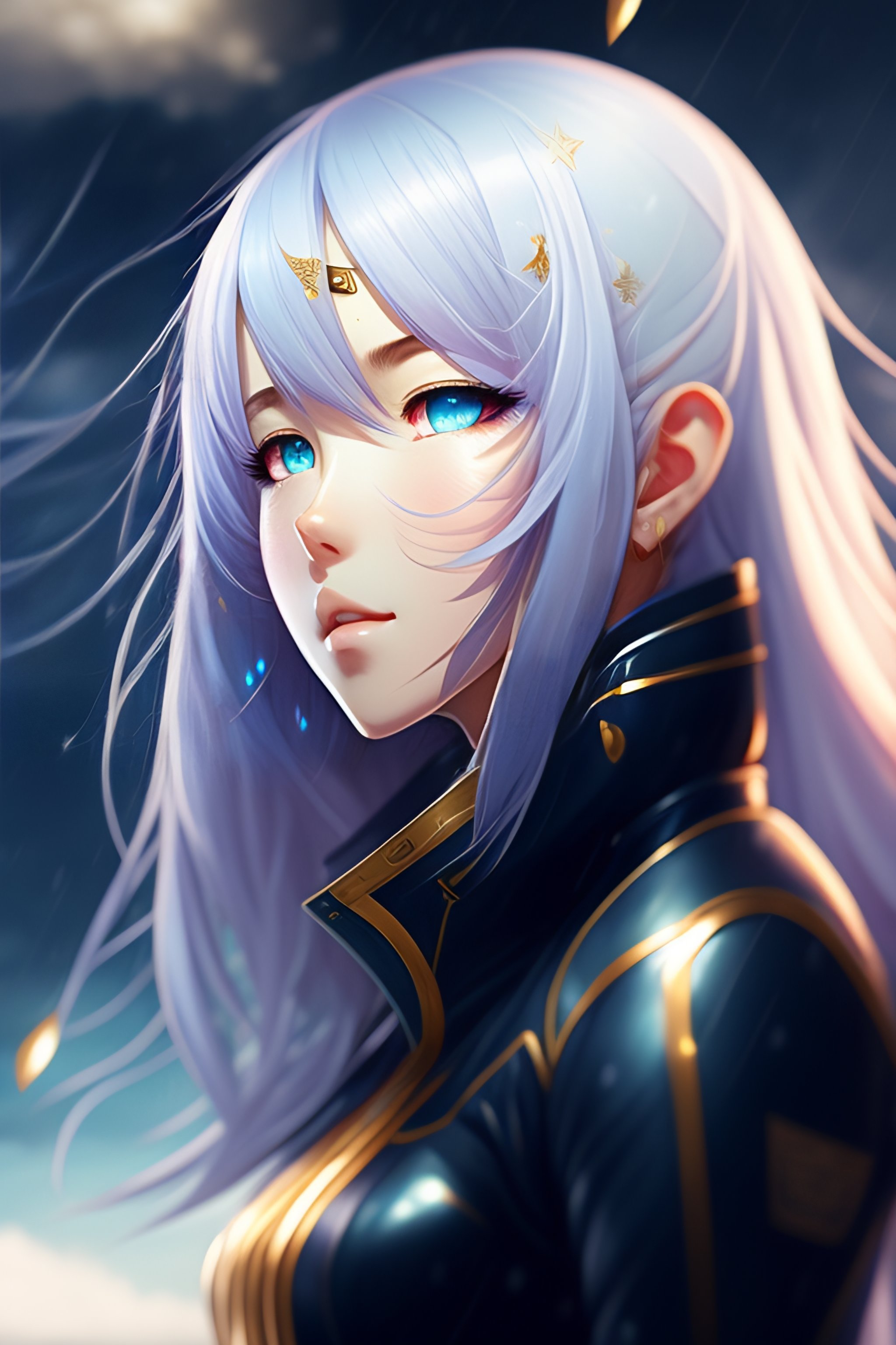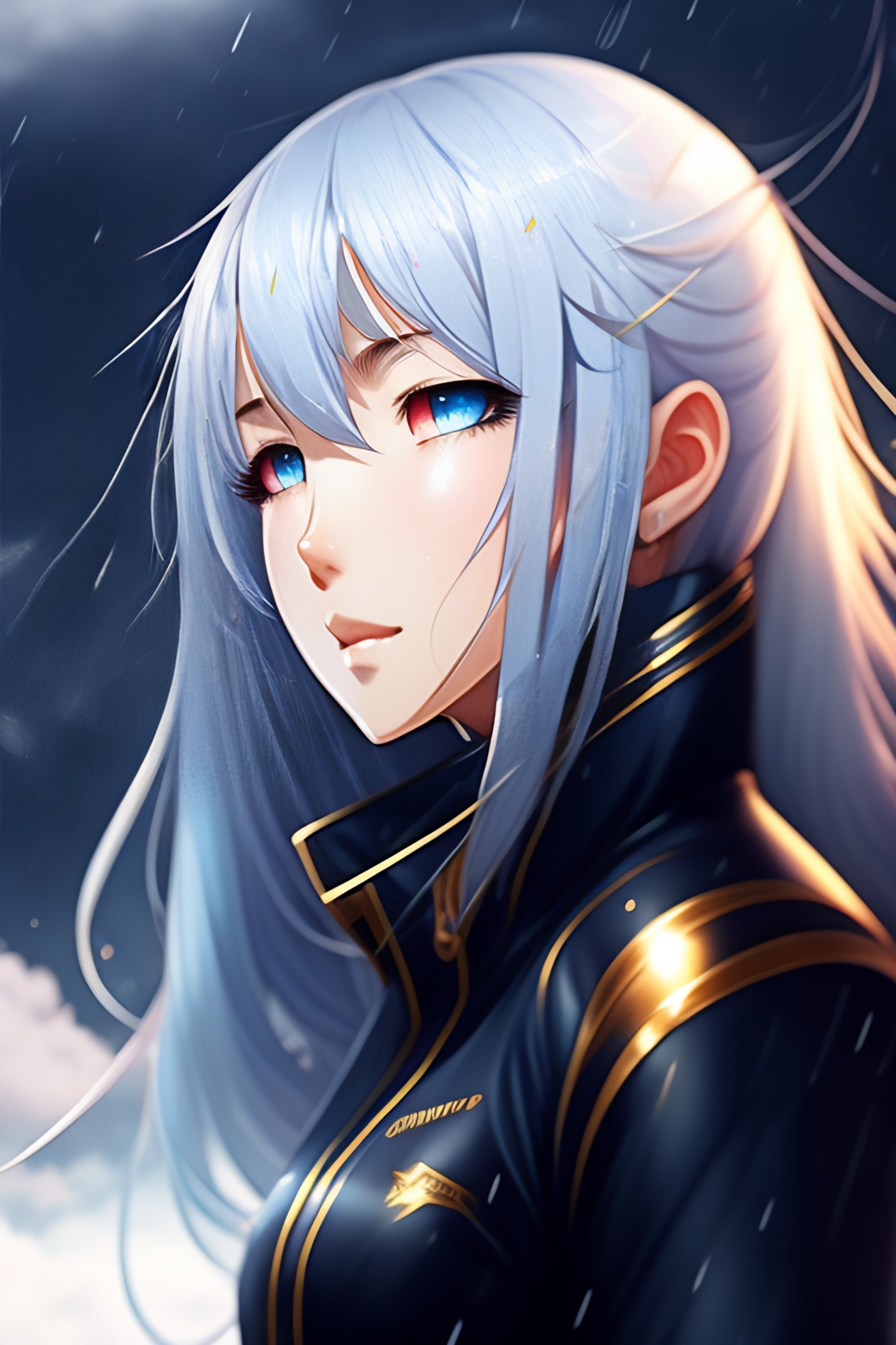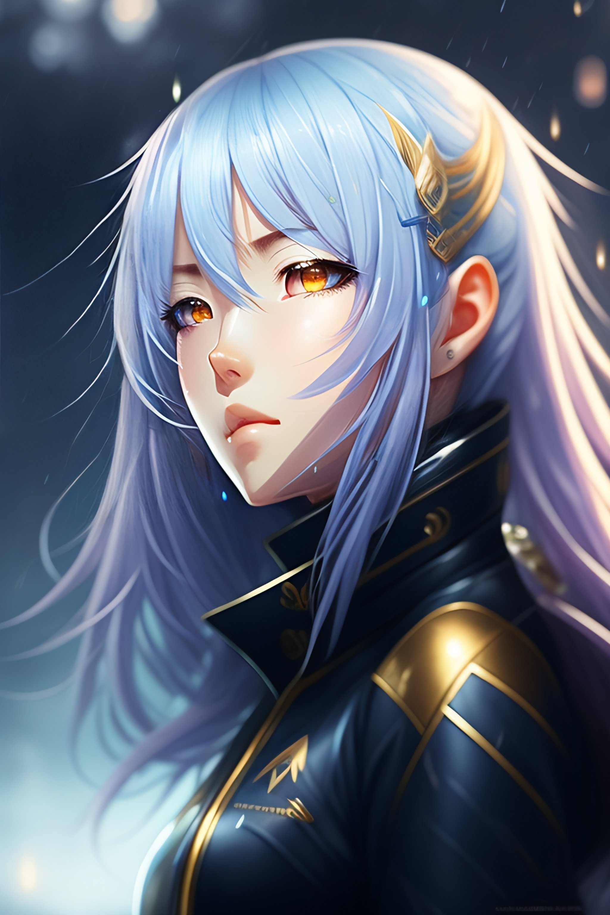 Side profile of rimuru tempest with sky blue hair, long hair, sharp face, gold eyes, high collar, black jacket | shiny, highly detailed, rain, professional digital painting, concept art, award - winning photography, cinematic, wlop | art by pixiv art, yoshitaka amano, deviantart