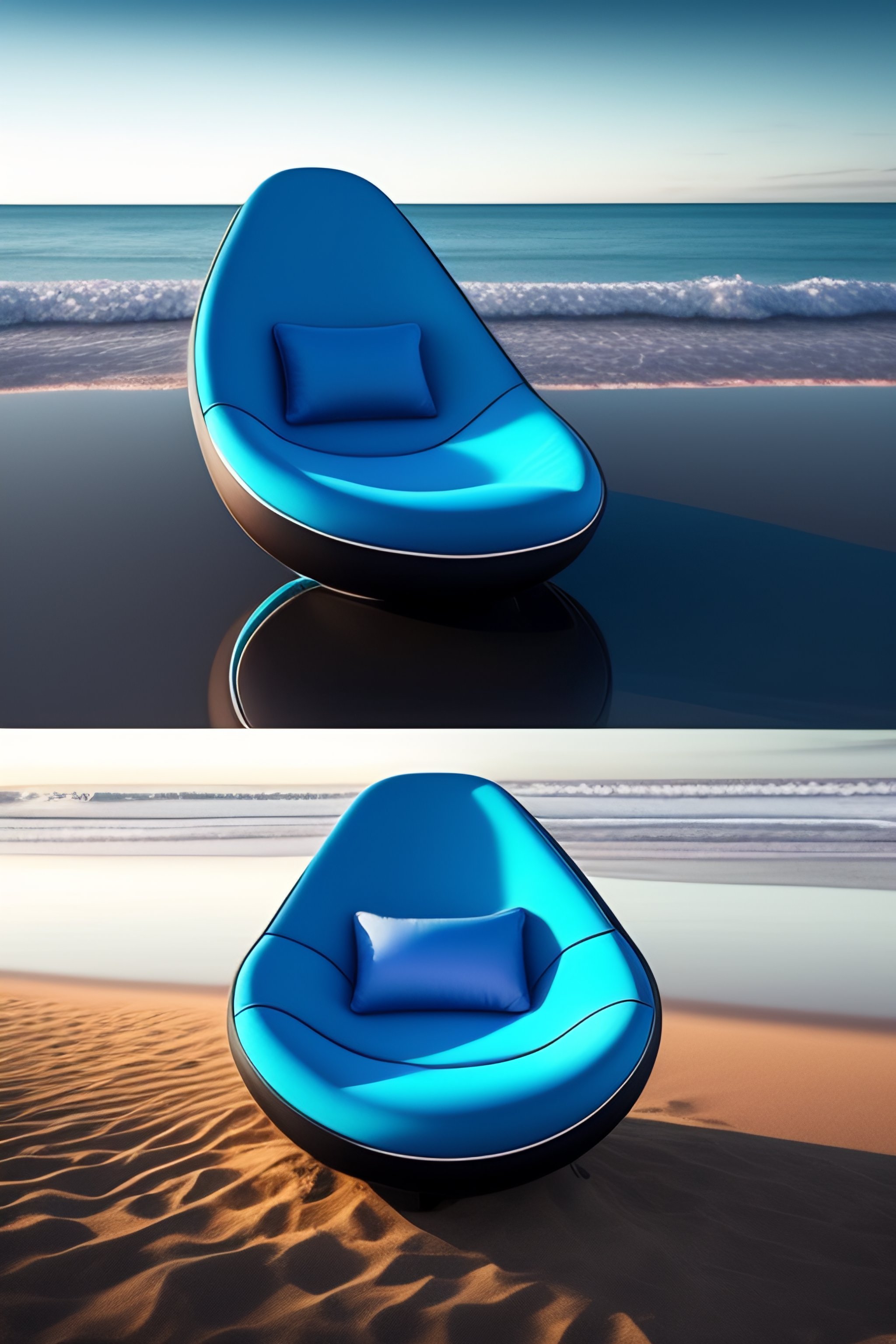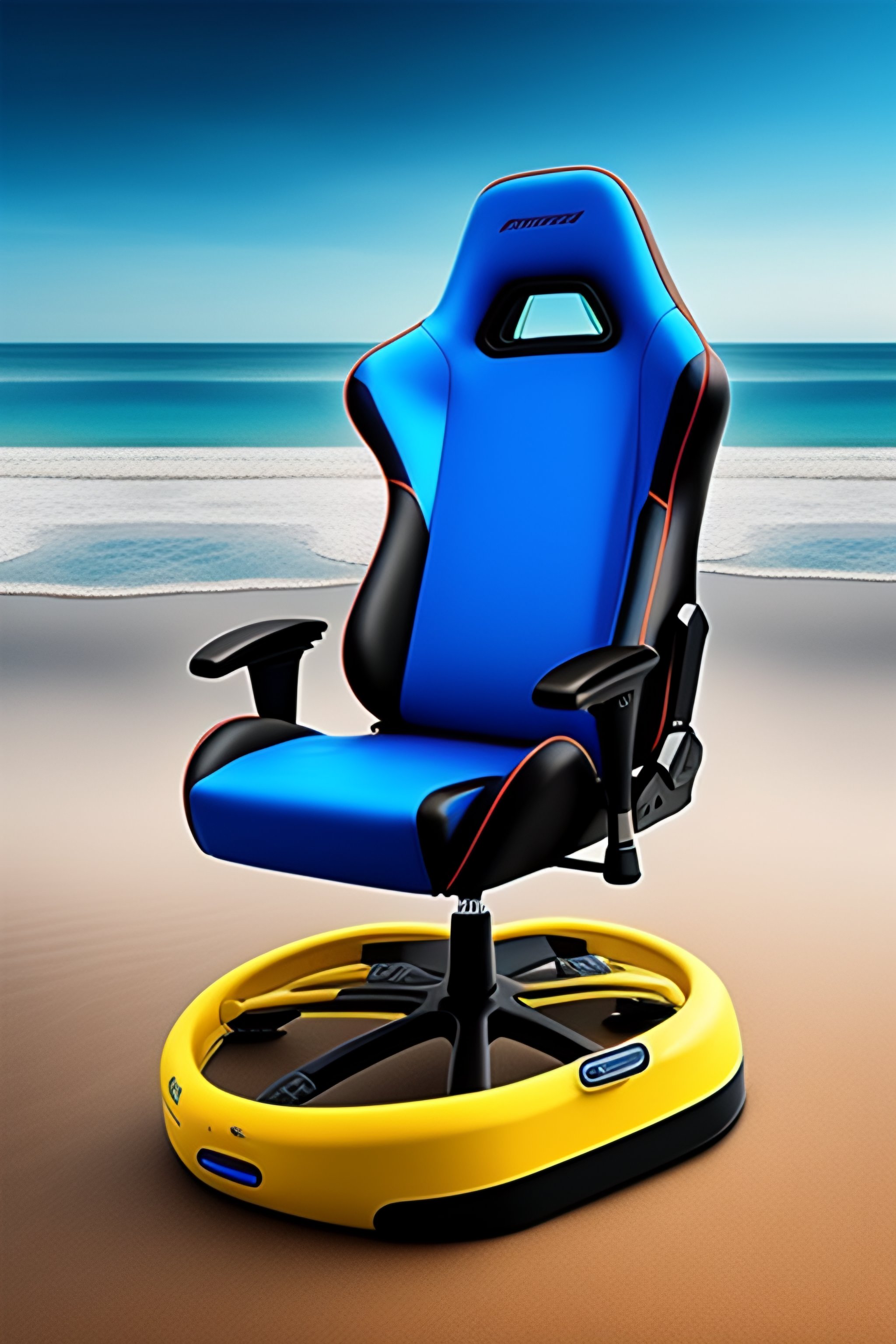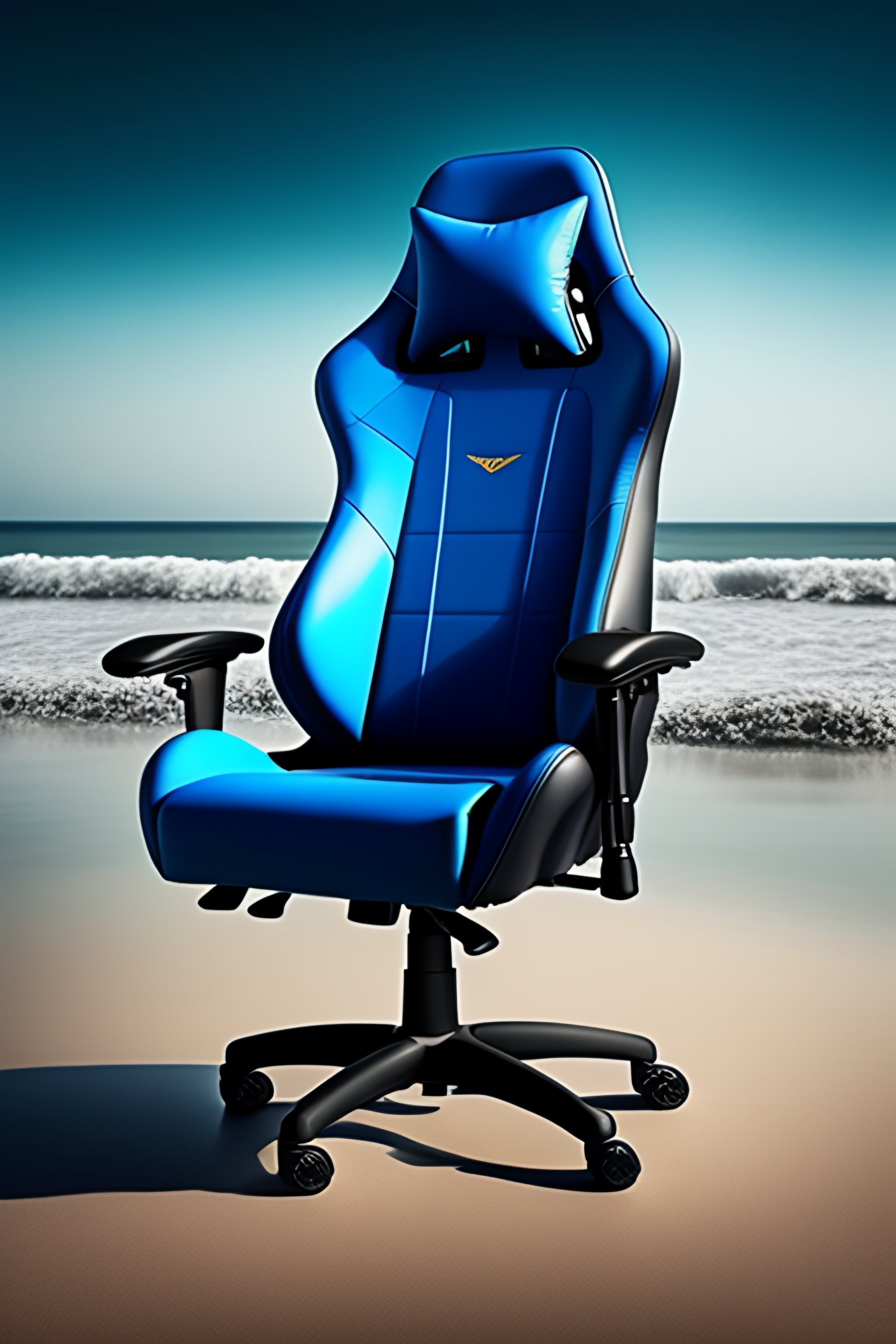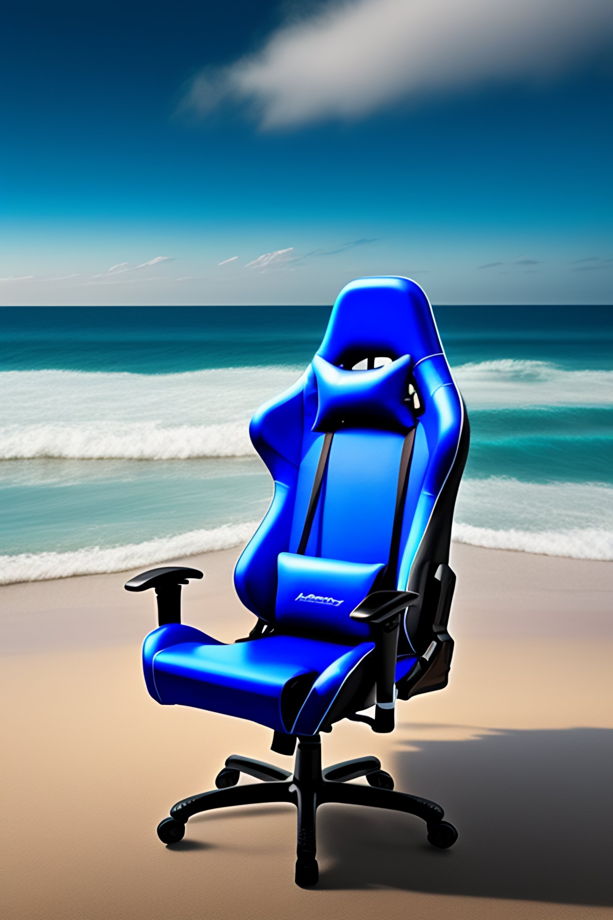 Waterproof gaming chair on a beach with headrest, built in speakers, made from blue leather. has a round base
