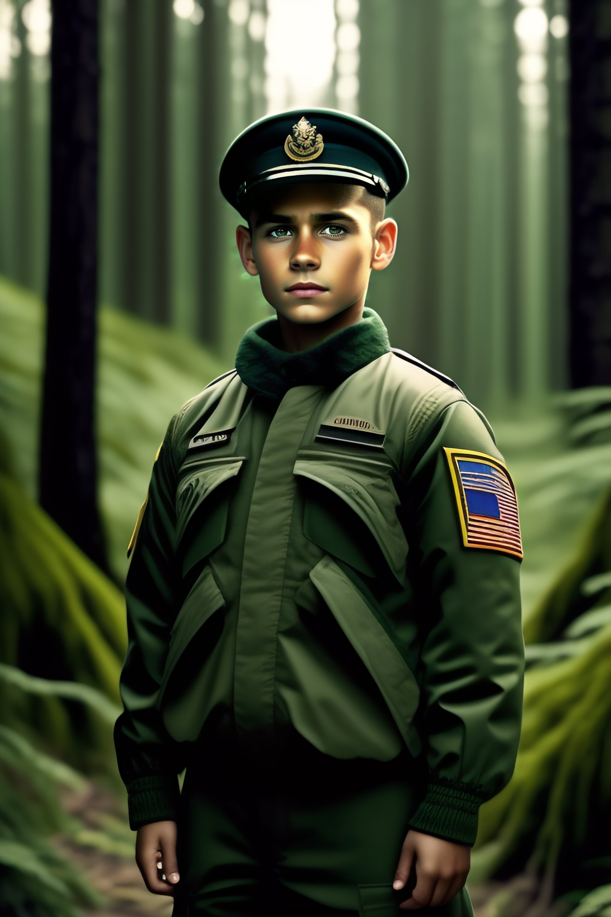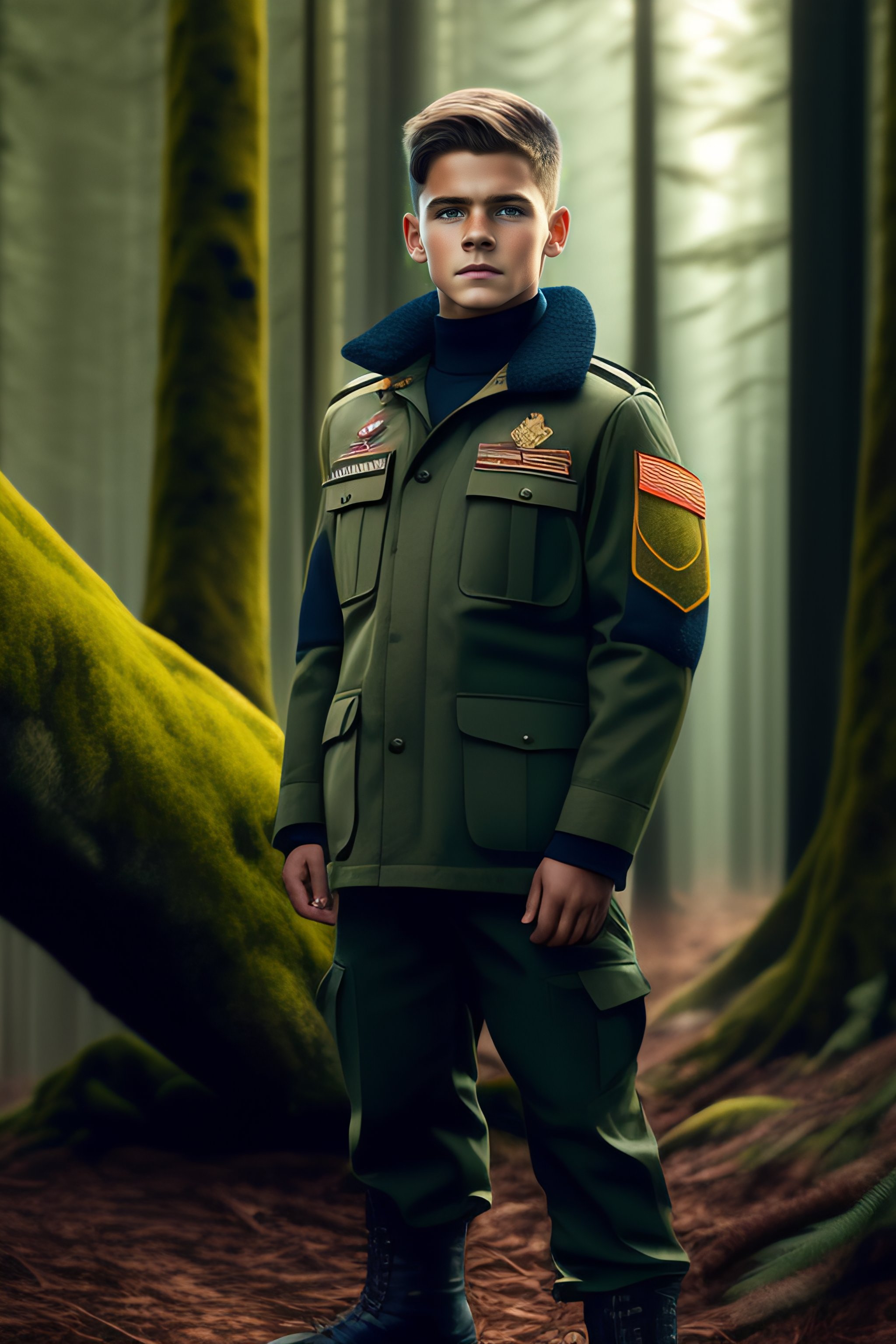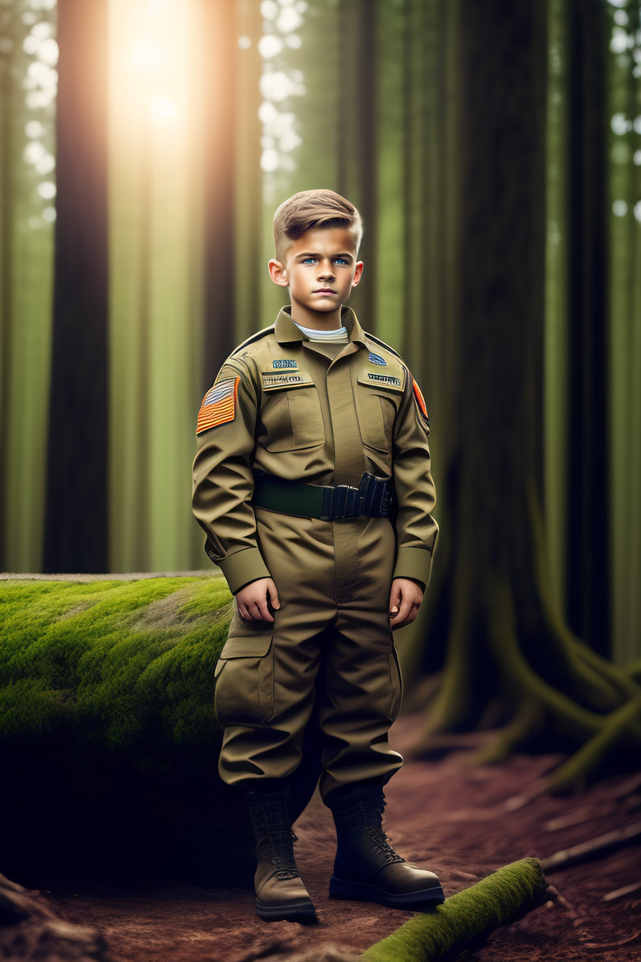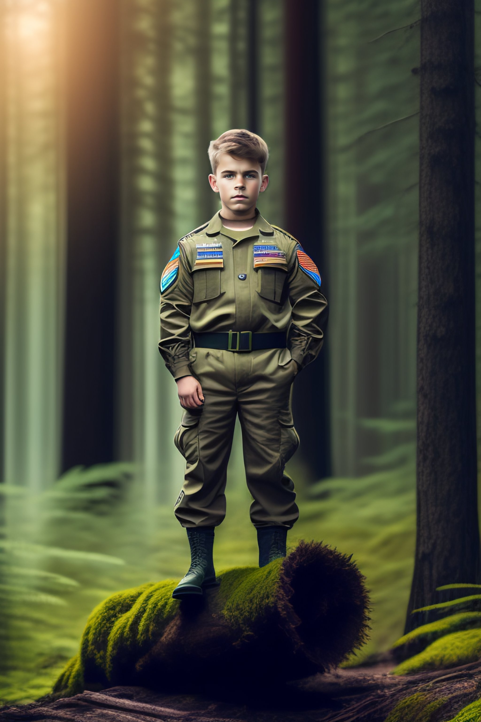 Realistic photo of soldier boy from tv-show "the boys" standing on a log in the forest