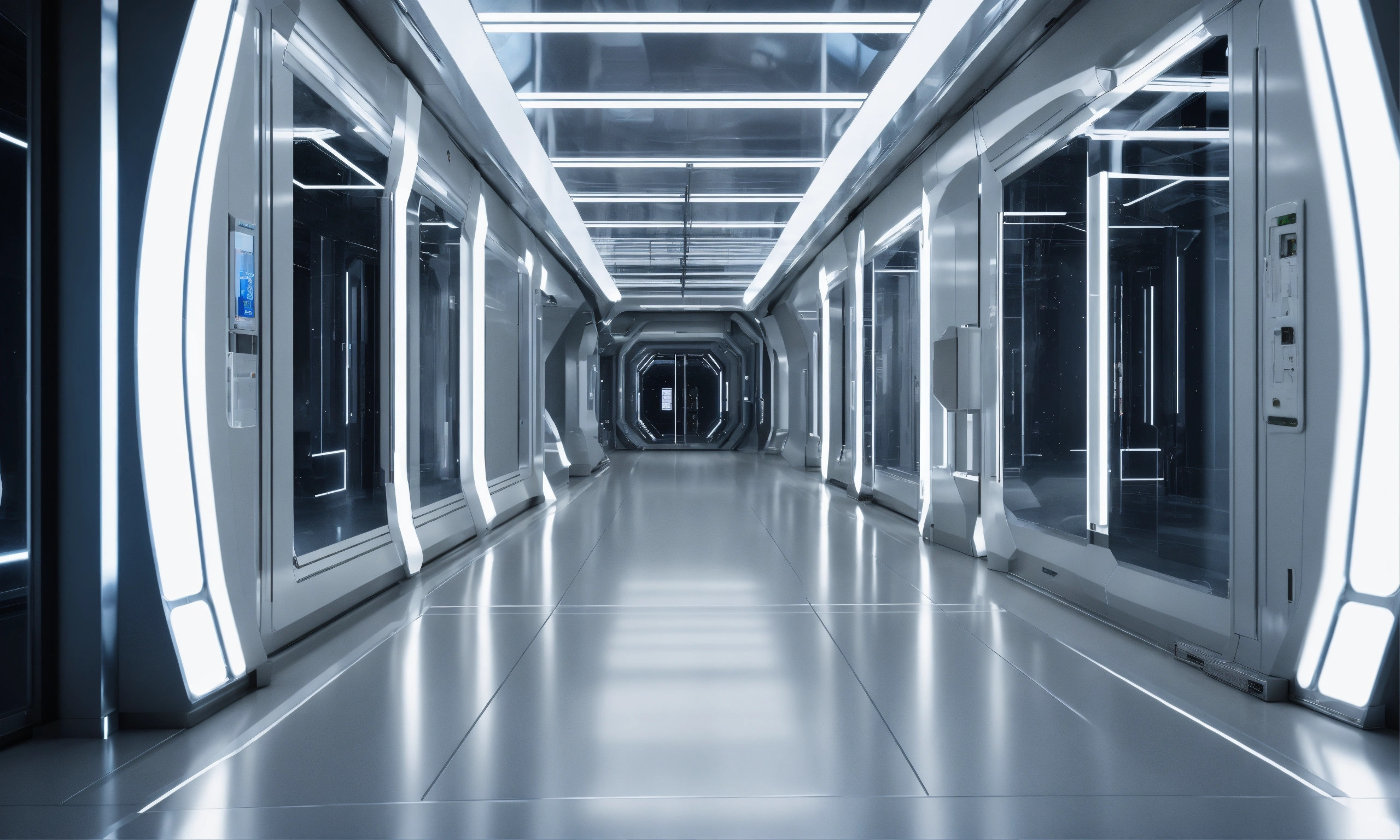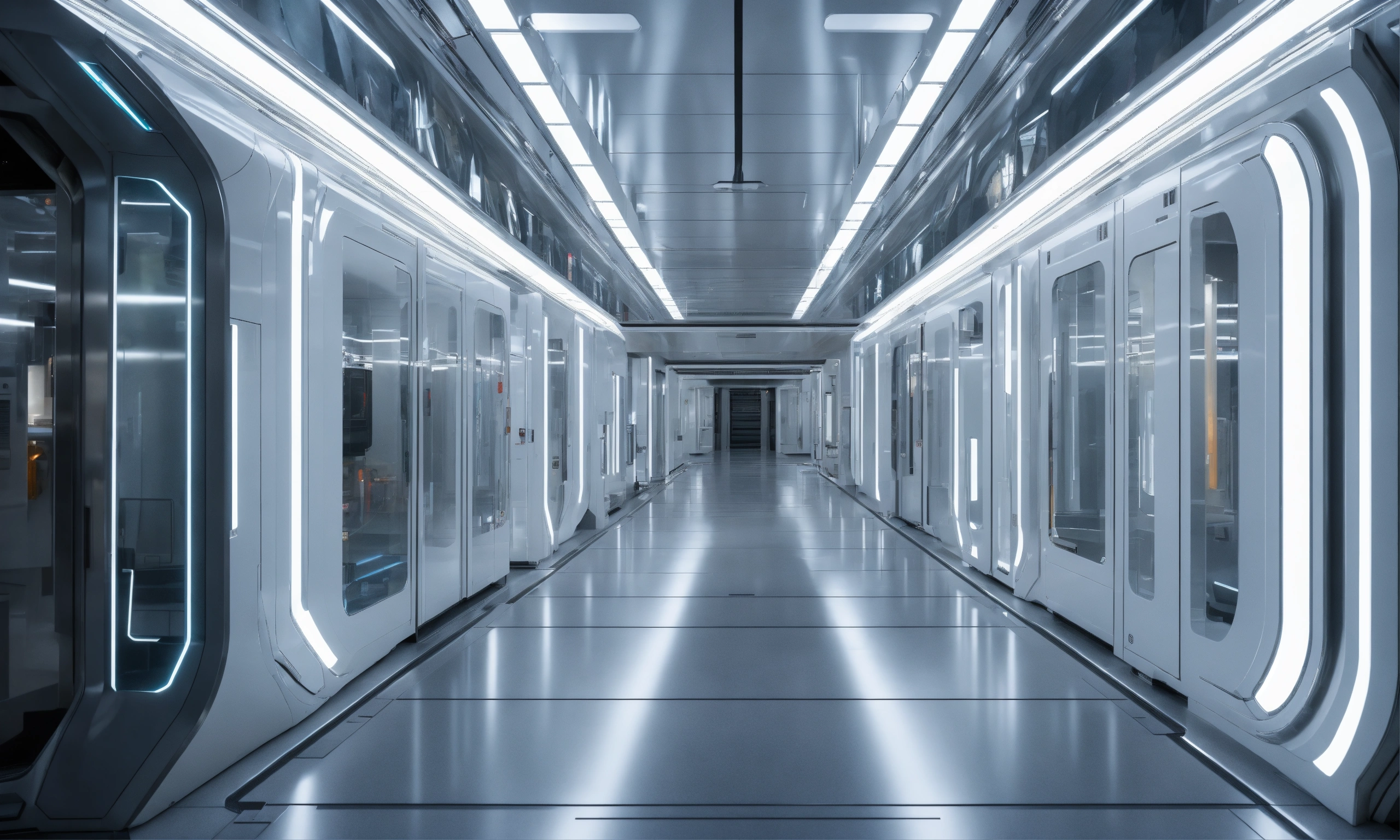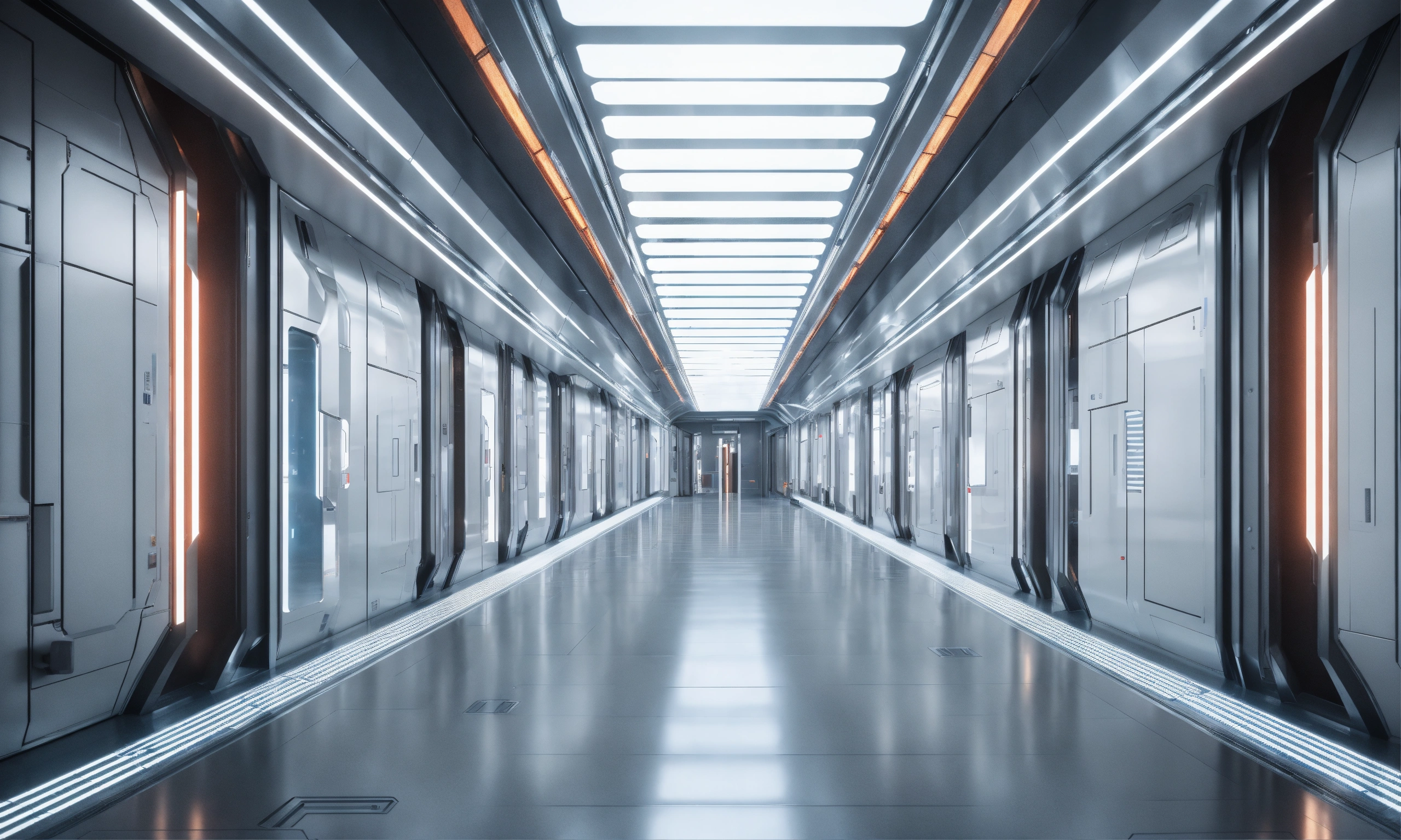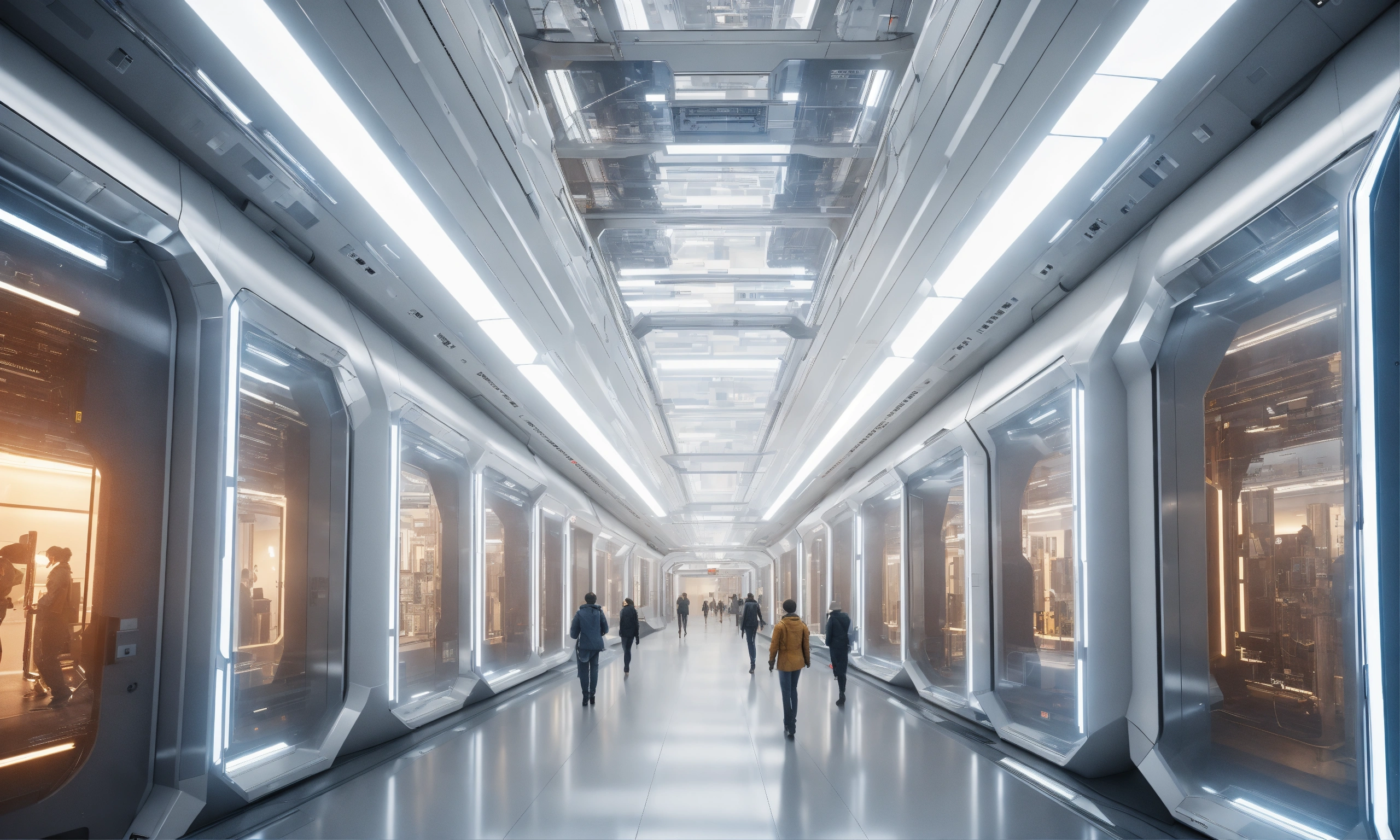 A realistic photo of a crowded very wide and tall futuristic corridor in the interior of a futuristic space station, infinite, white metal walls, with a glass wall on one side and many doors on the other side, white illumination, no windows, hyperrealistic, hyperdetailed, 8k