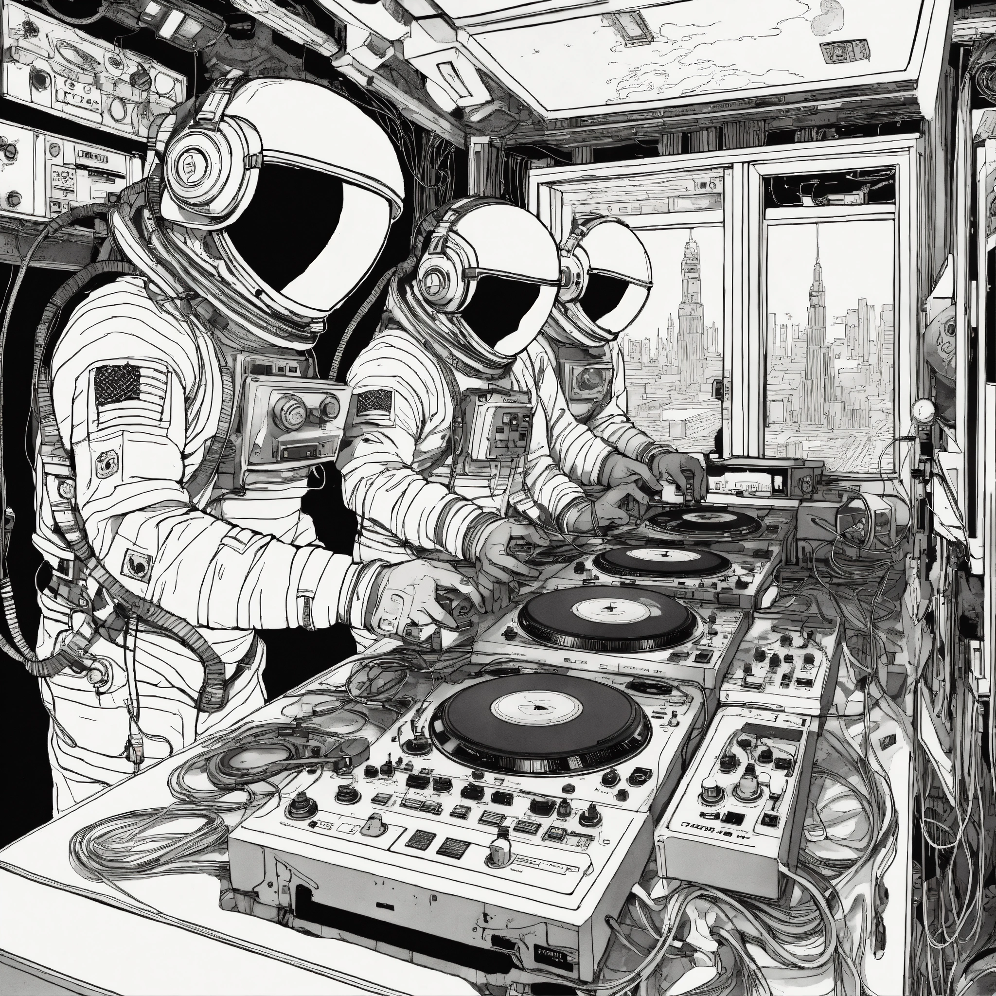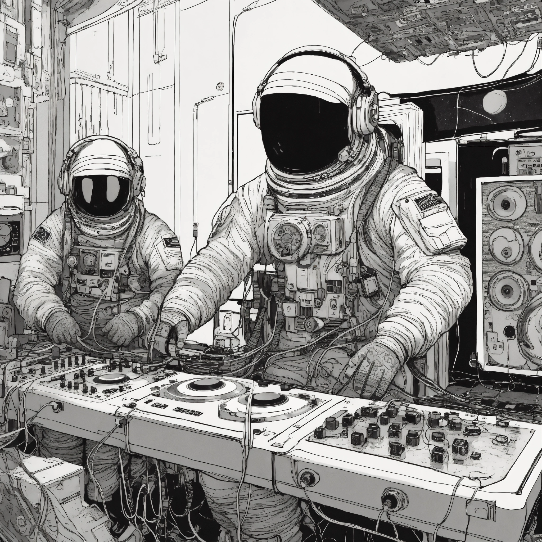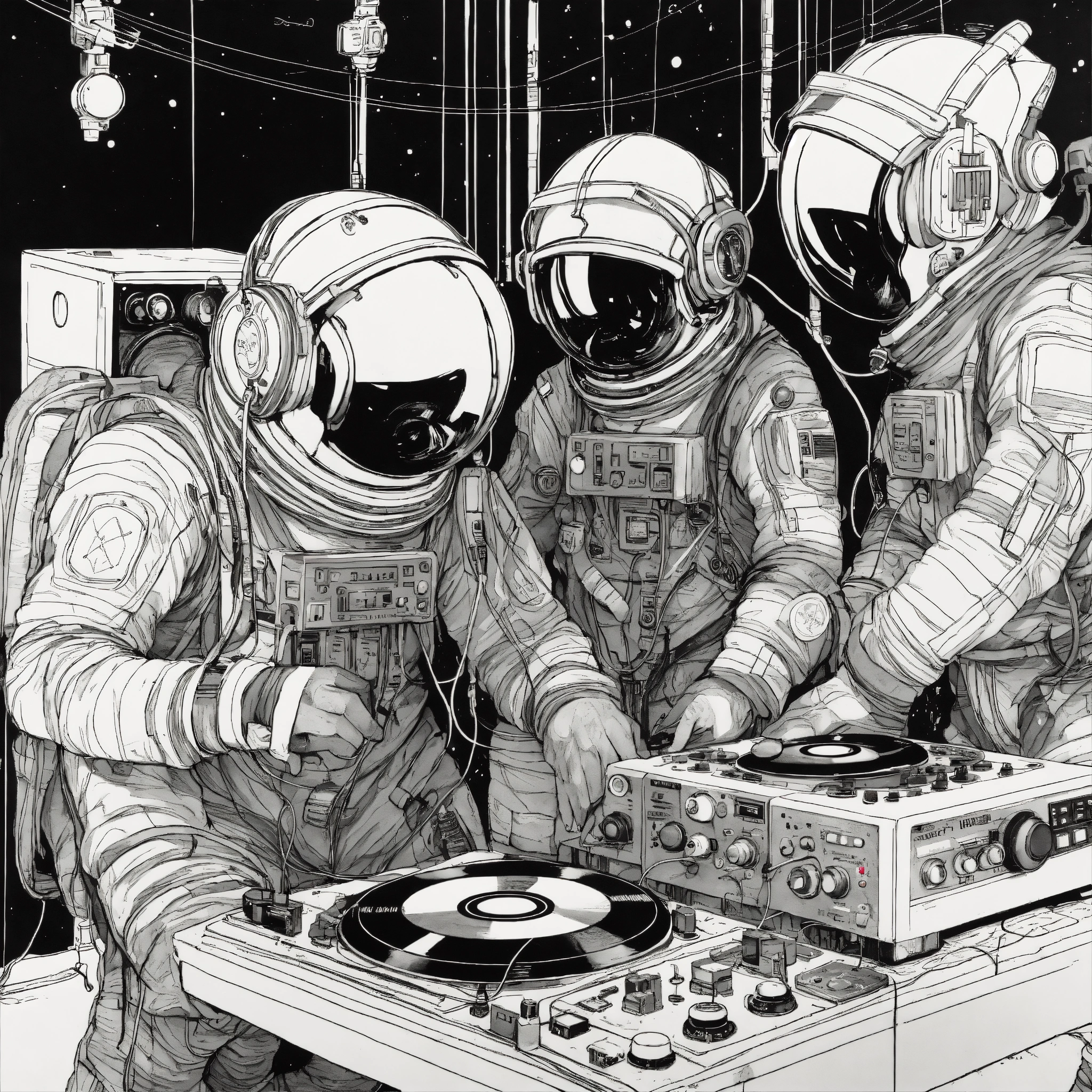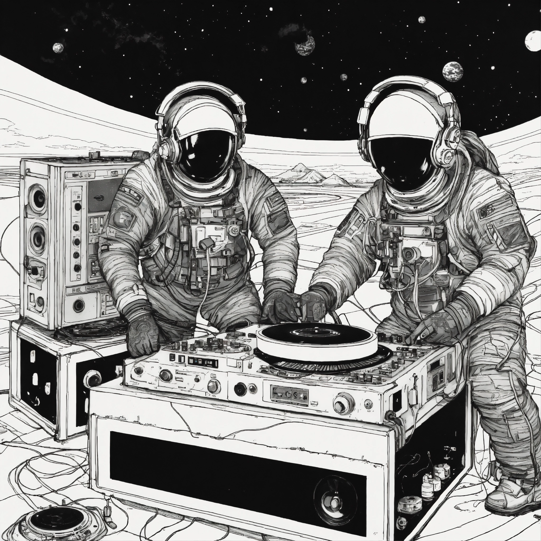 Intricate detailed artwork of astronauts using dj controller playing techno house music, in the style of moebius, wires, speakers, black and white ink, some ink drips