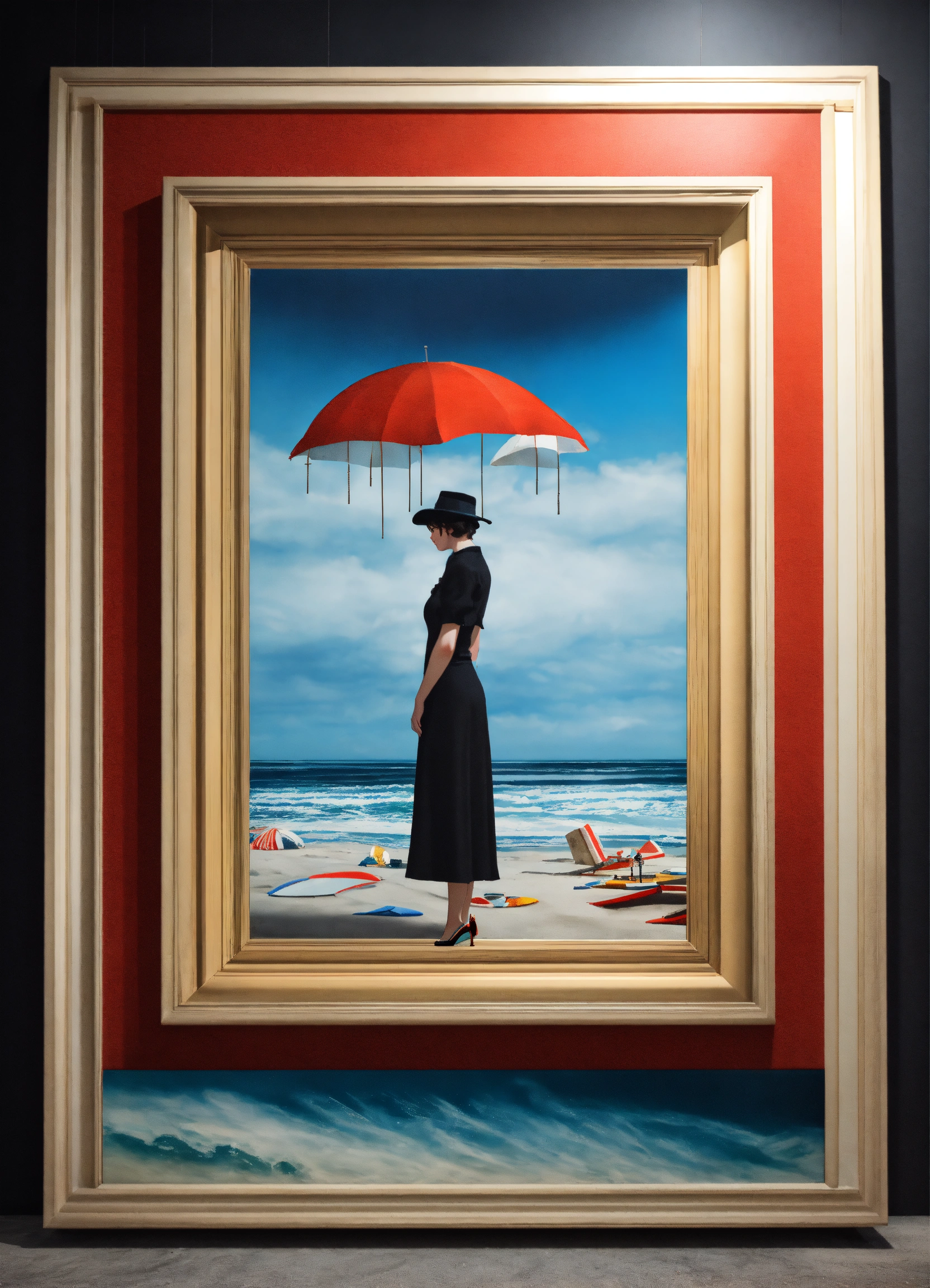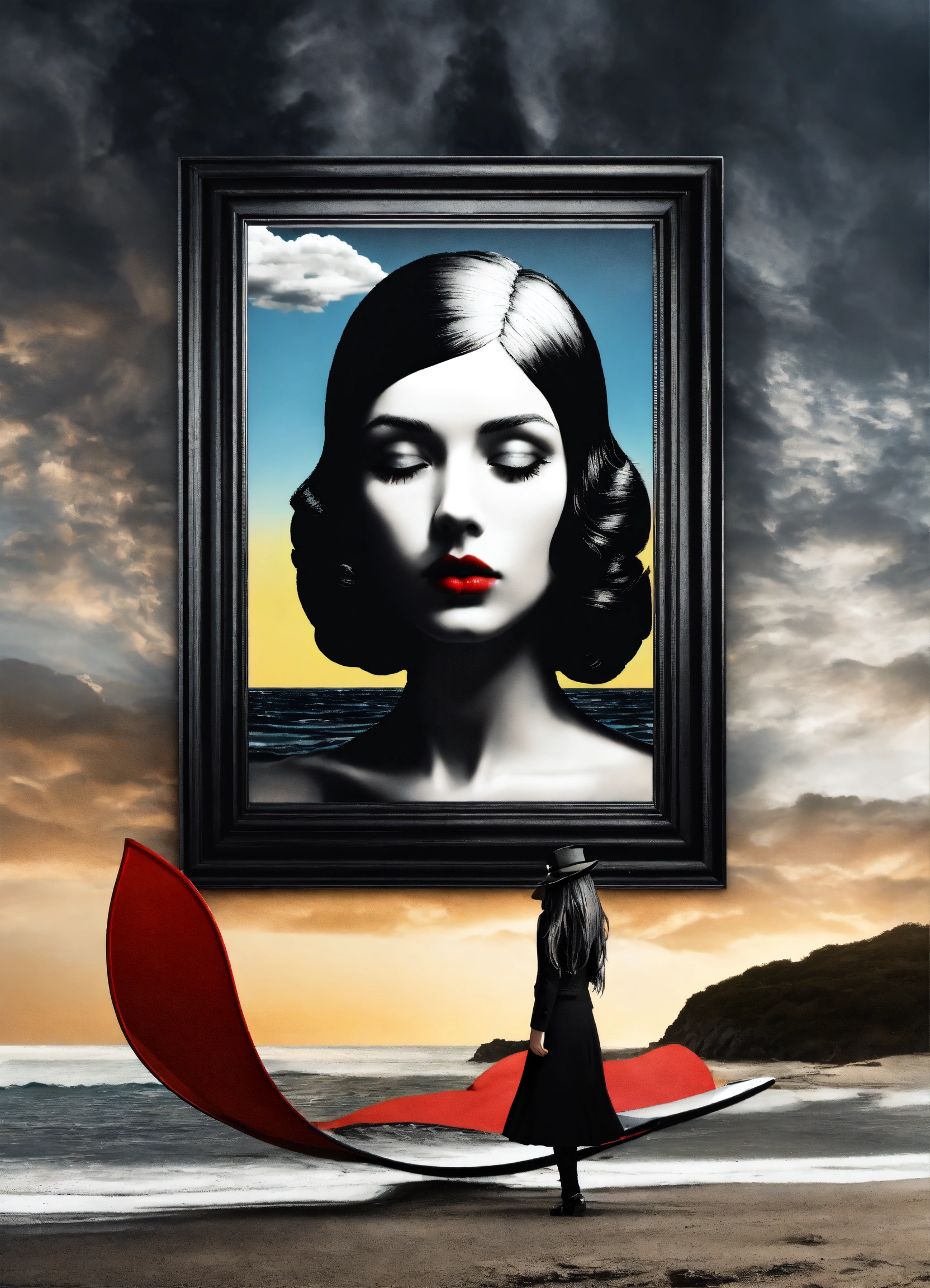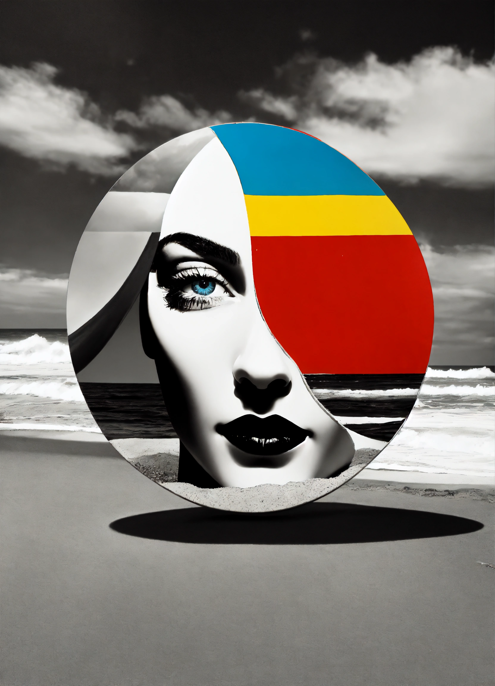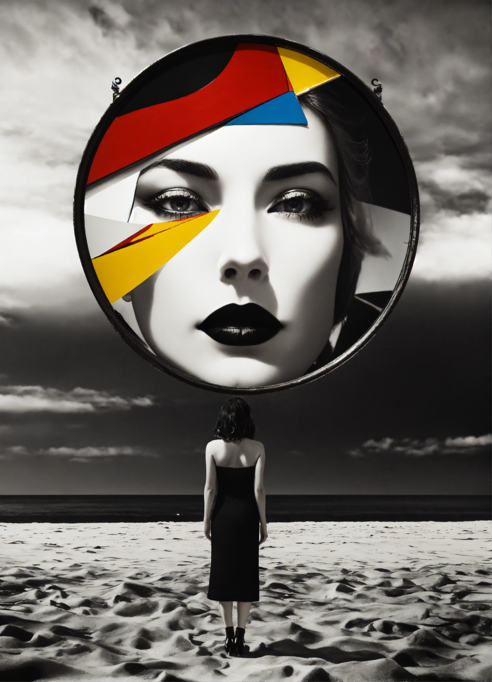 Black and white and primary colors, 3d surreal seascape, realistic woman portrait, immersive inspired beach art deco seascape, all upside down mirror, rene magritte inspiration.