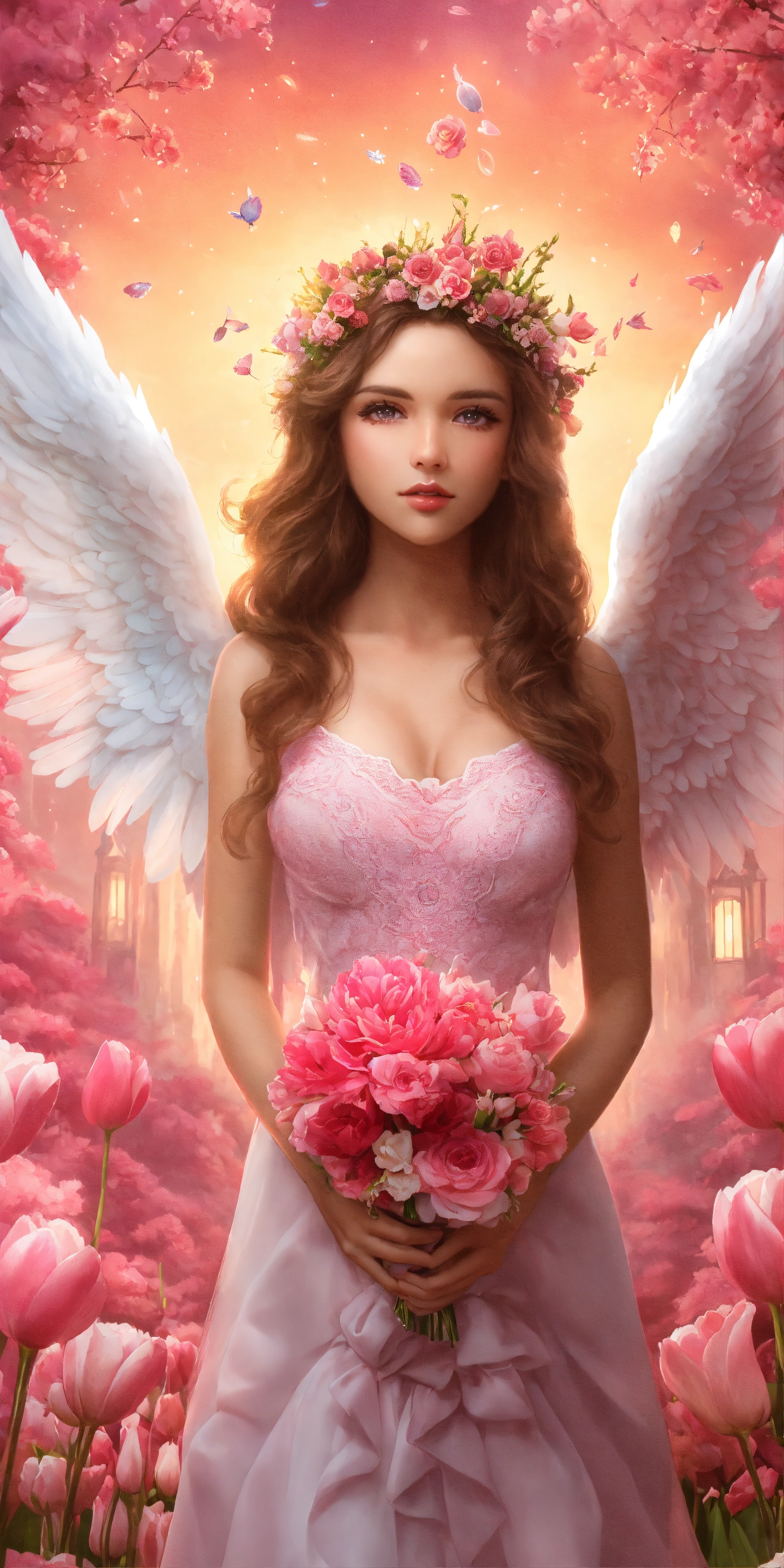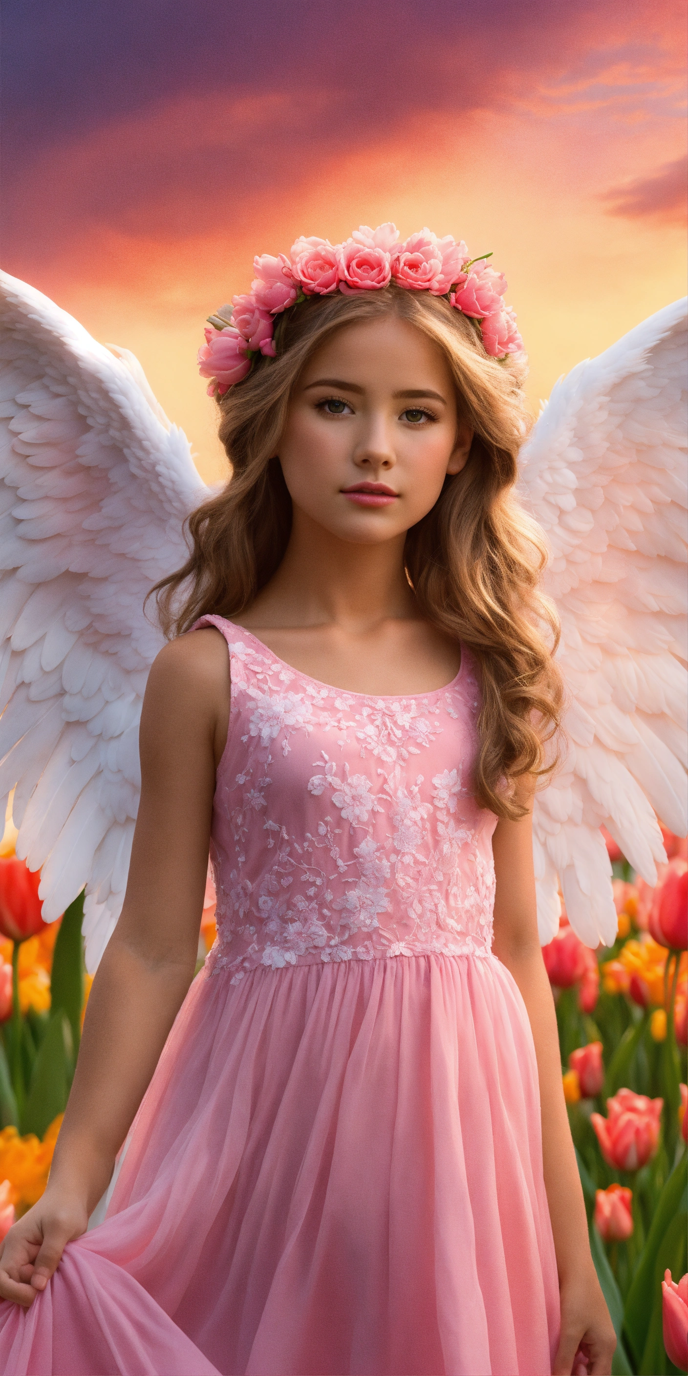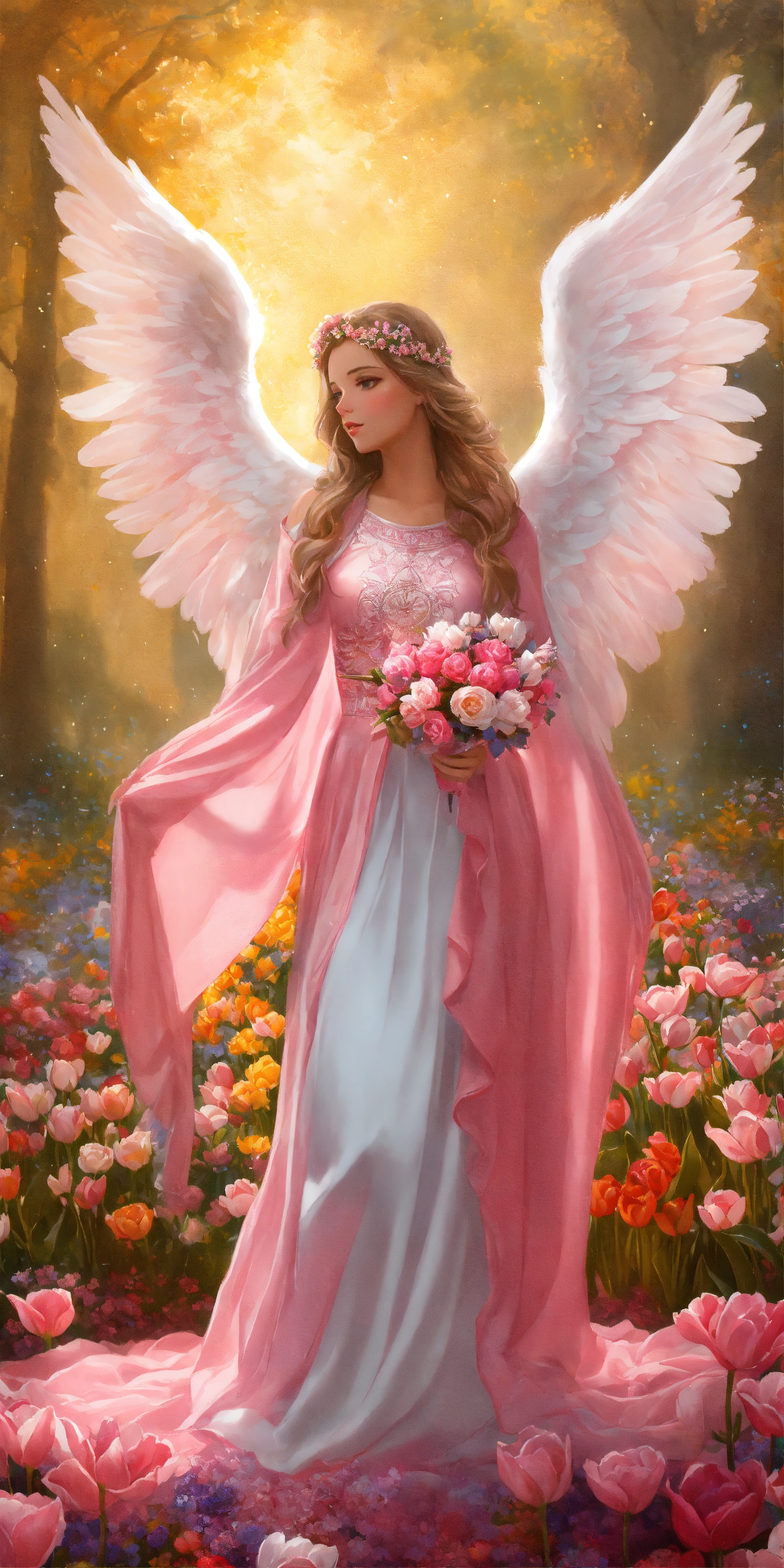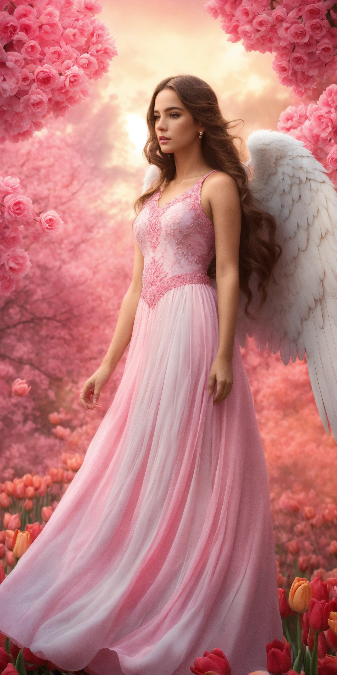 1 ilustracion hiperdetallada y hiperrealista. 1ángel de la guarda hermosa y perfecta abrazando a una niña con alas de ángel. ángel de la guarda mujer con una angelita hermosas y perfectas con alas de ángel definidas y detalladas de color rosado. alas son rosadas con destellos plateados. rostros preciosos y detallados. ojos muy claros con una mirada profunda y penetrante. cabellos rubios detallado con decoraciónes en color rosado como flores de tulipanes fucsia y gemas y cristales de color tornasol. vestido tipo tunica de color blanco y detalles rosados y destellos luminosos. la mujer ángel abre sus alas luminosas y protege a la niña ángel. alrededor hay jardines de tulipanes y un riachuelo de agua cristalina hermoso y muy natural. el cielo esta divino y precioso con nubes de colores y un sol radiante y se van formando mandalas en inmersion muy poderosos de color rosado. realismo. ilustracion hiperdetallada. obra maestra. arte digital, hd, alta calidad . alta resolución. 8k.