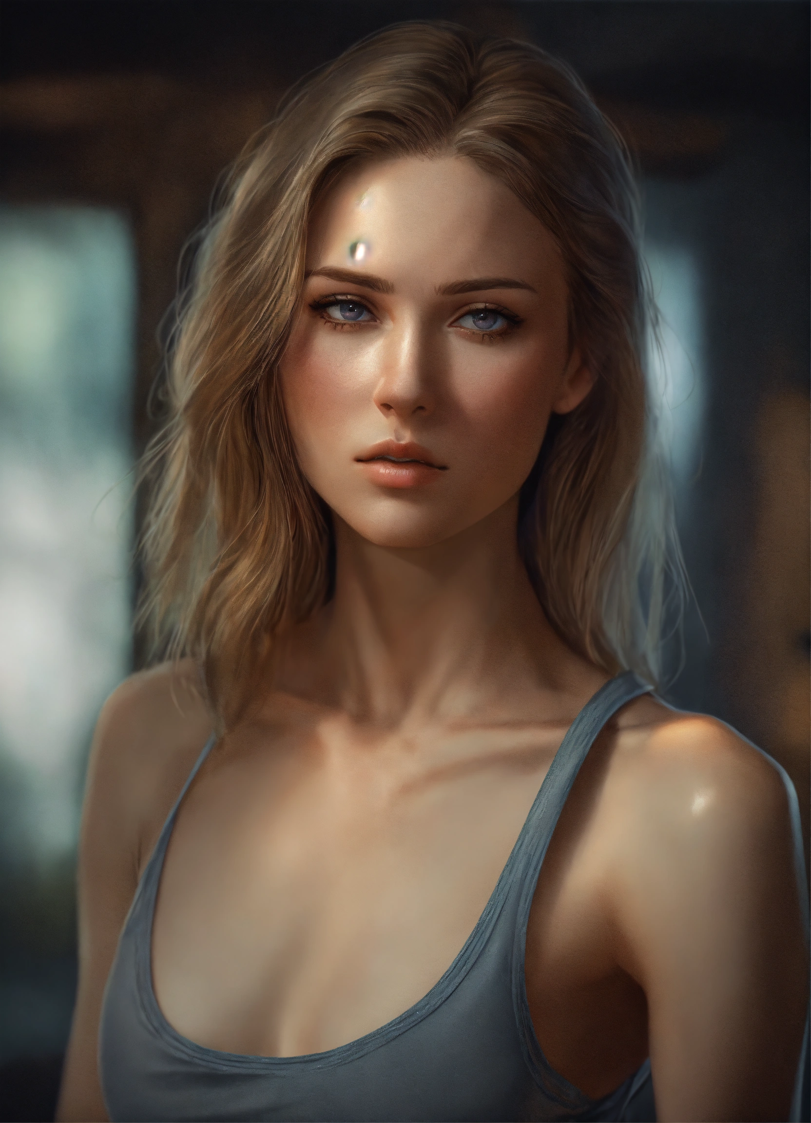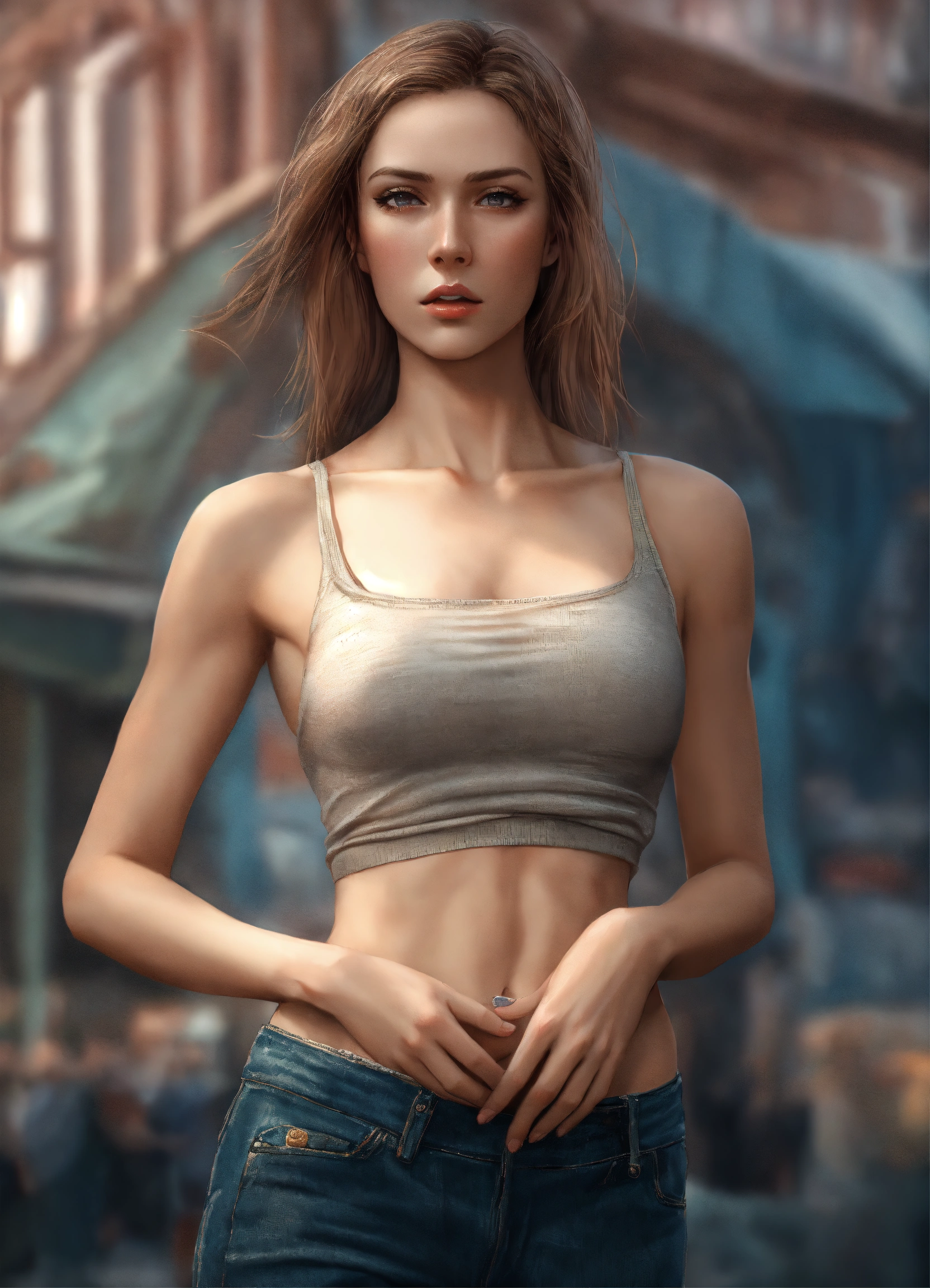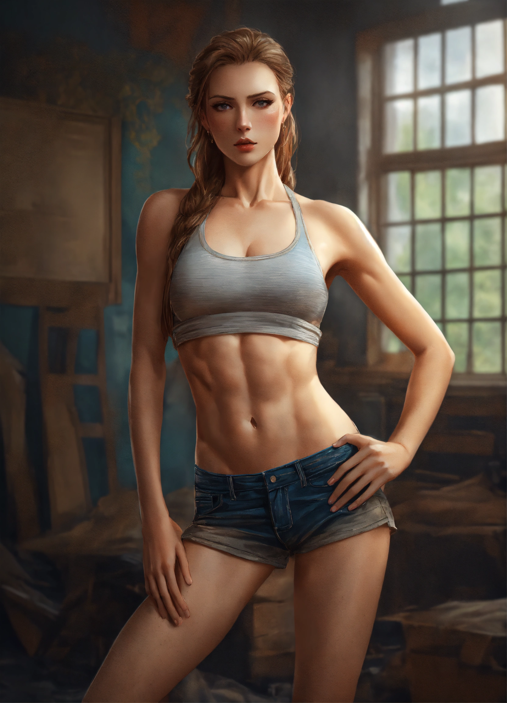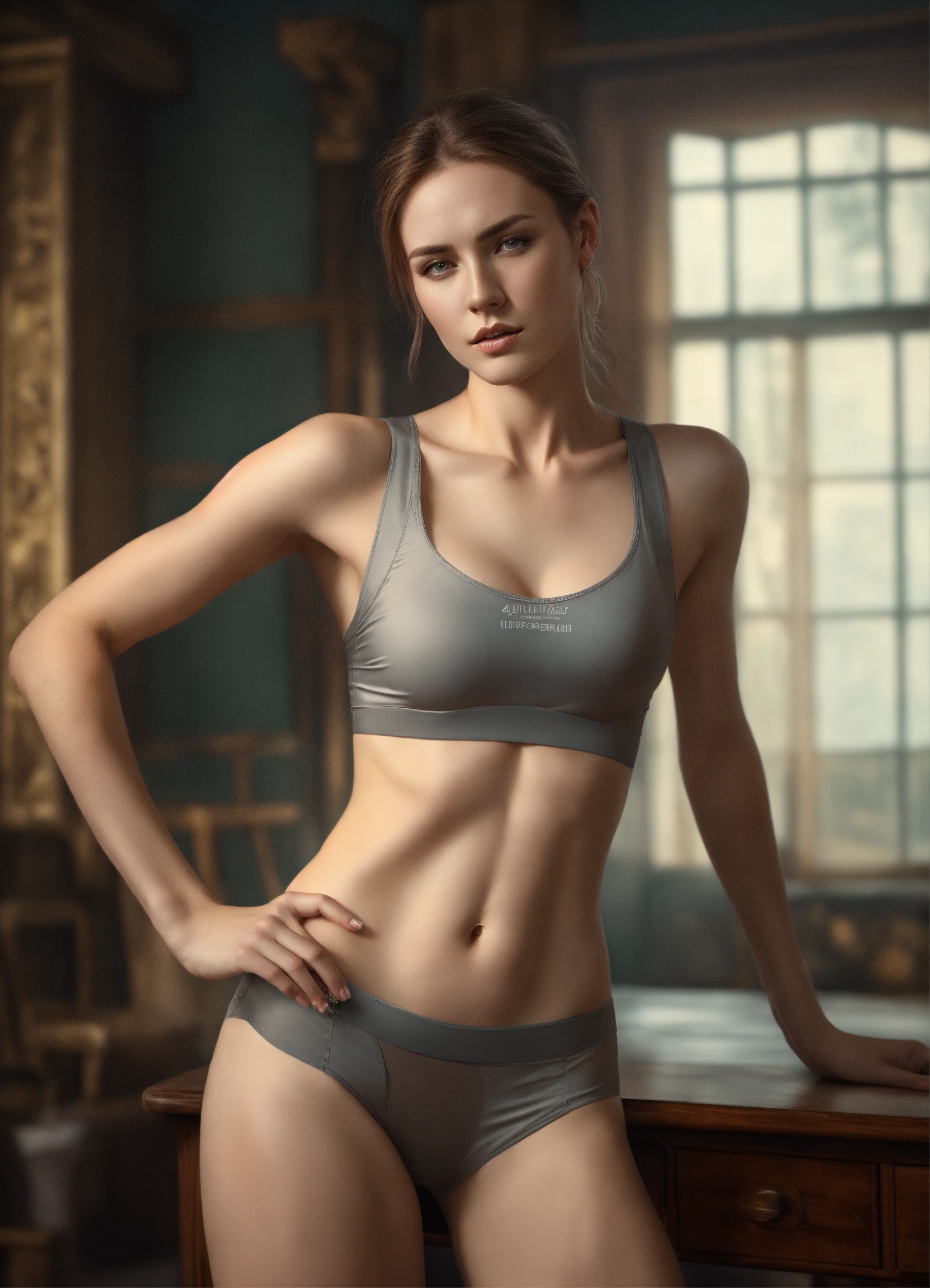 Full body potrait of thin beautiful faced tall russian woman with high cheekbones, pale skin, heavy chest, thin muscular midriff in pain, illustration, hyper realistic, highly detailed, side glamor pose, 4k, hdr, smooth, sharp focus, high resolution, realistic photography