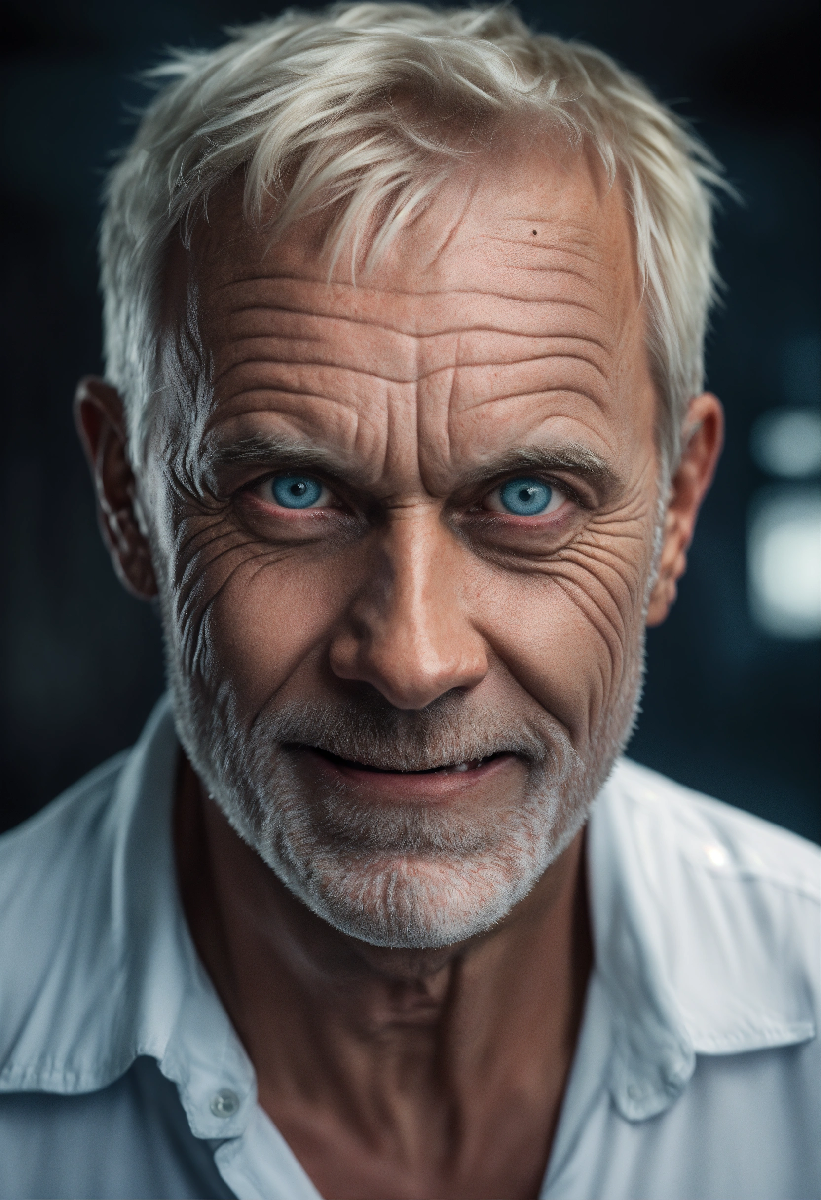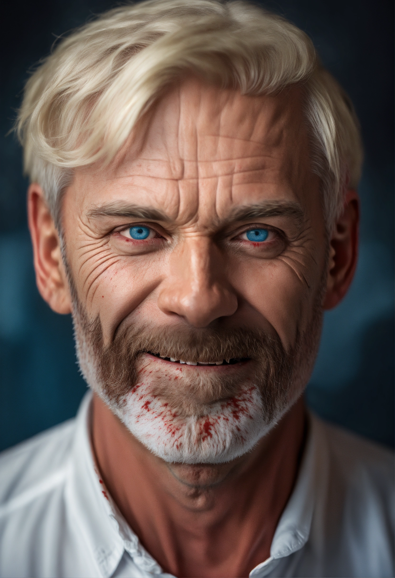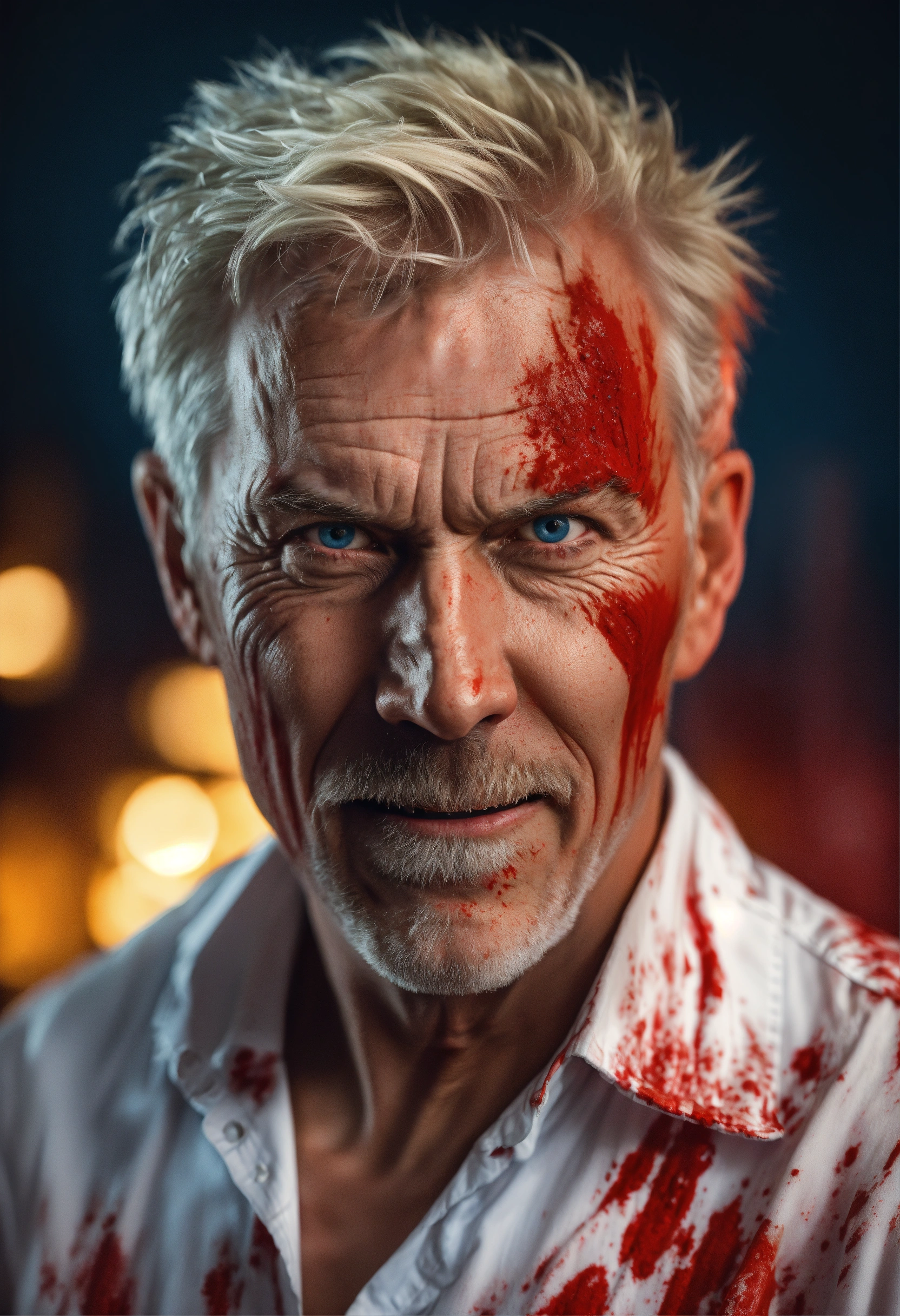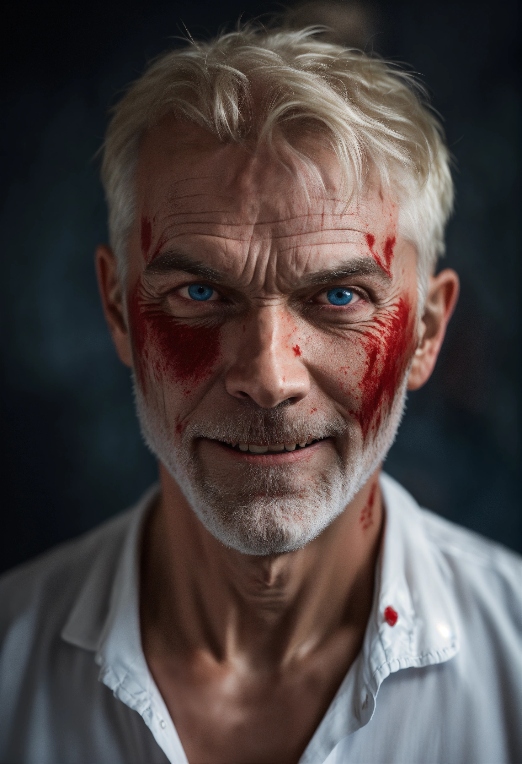 A realistic photo of scary 55 years old scary man with deep blue eyes, intimidating traits, creepy scary smiling face, sharp nose, white blonde well groomed very short hair, angry expression, wearing a wrinkled white shirt, with red dye over his face, hyperrealistic, hyperdetailed, 8 k