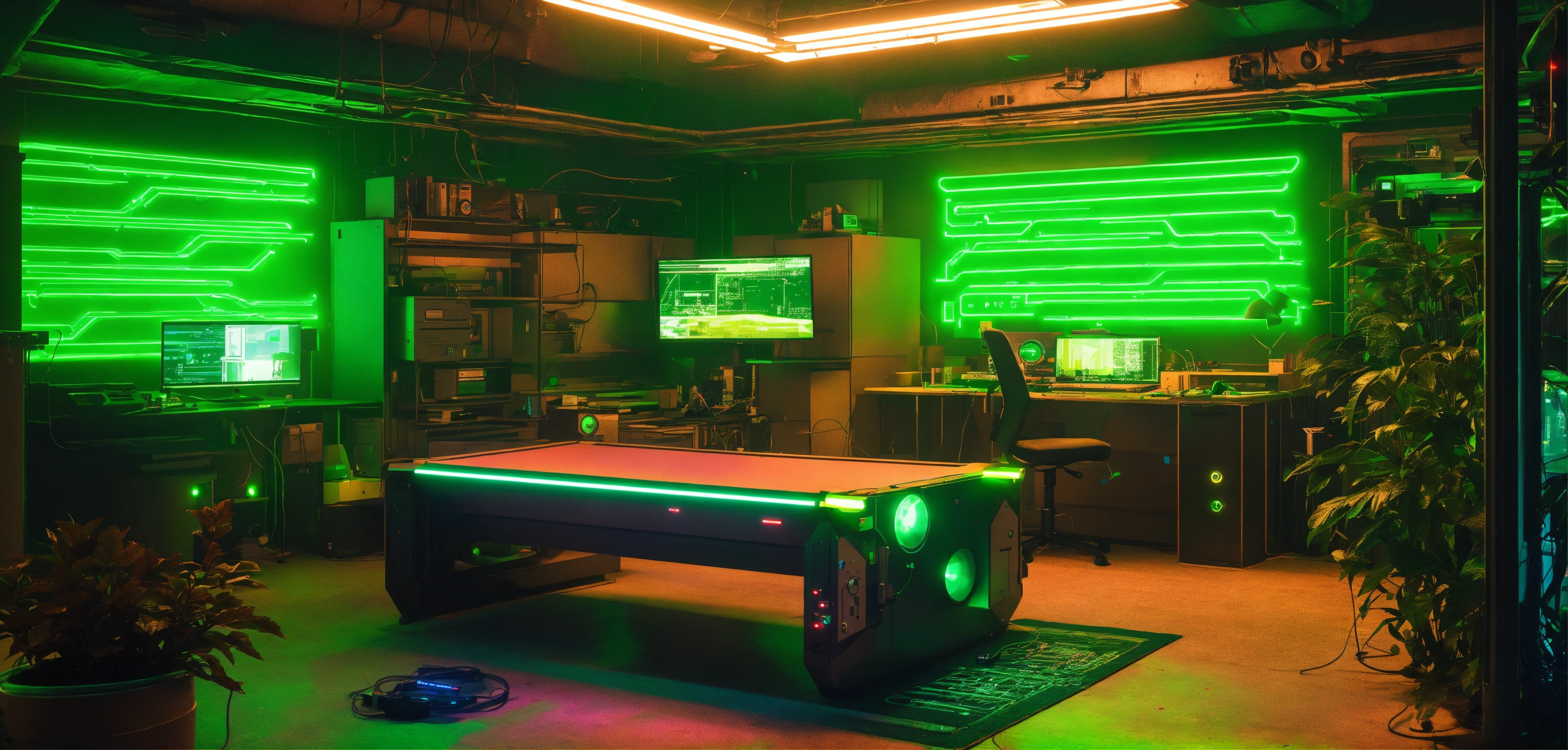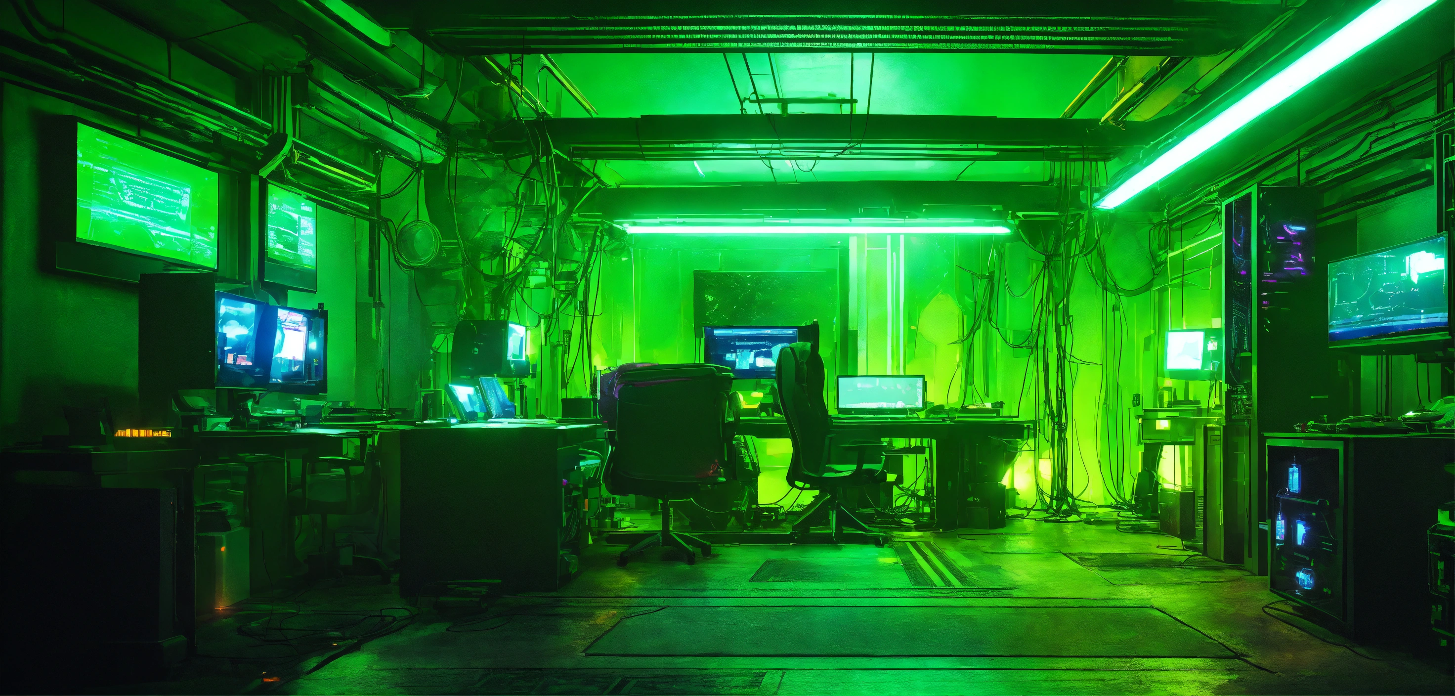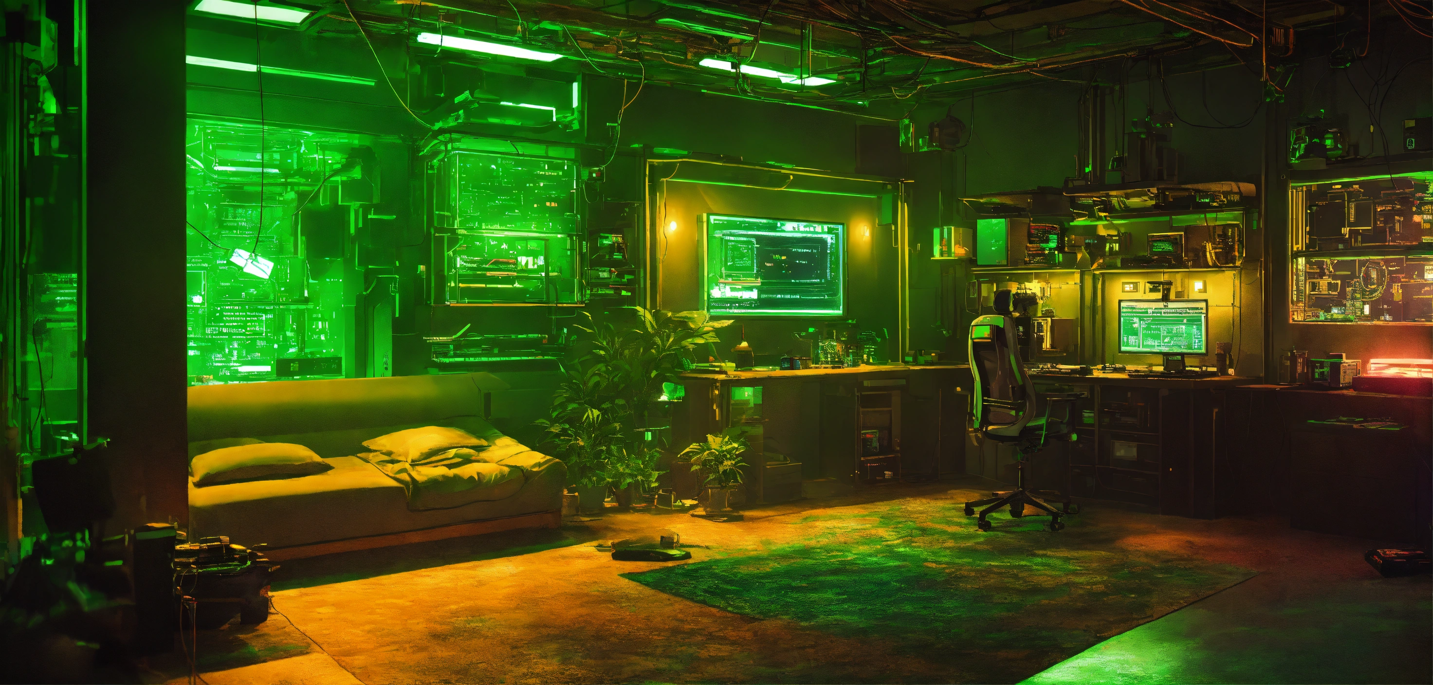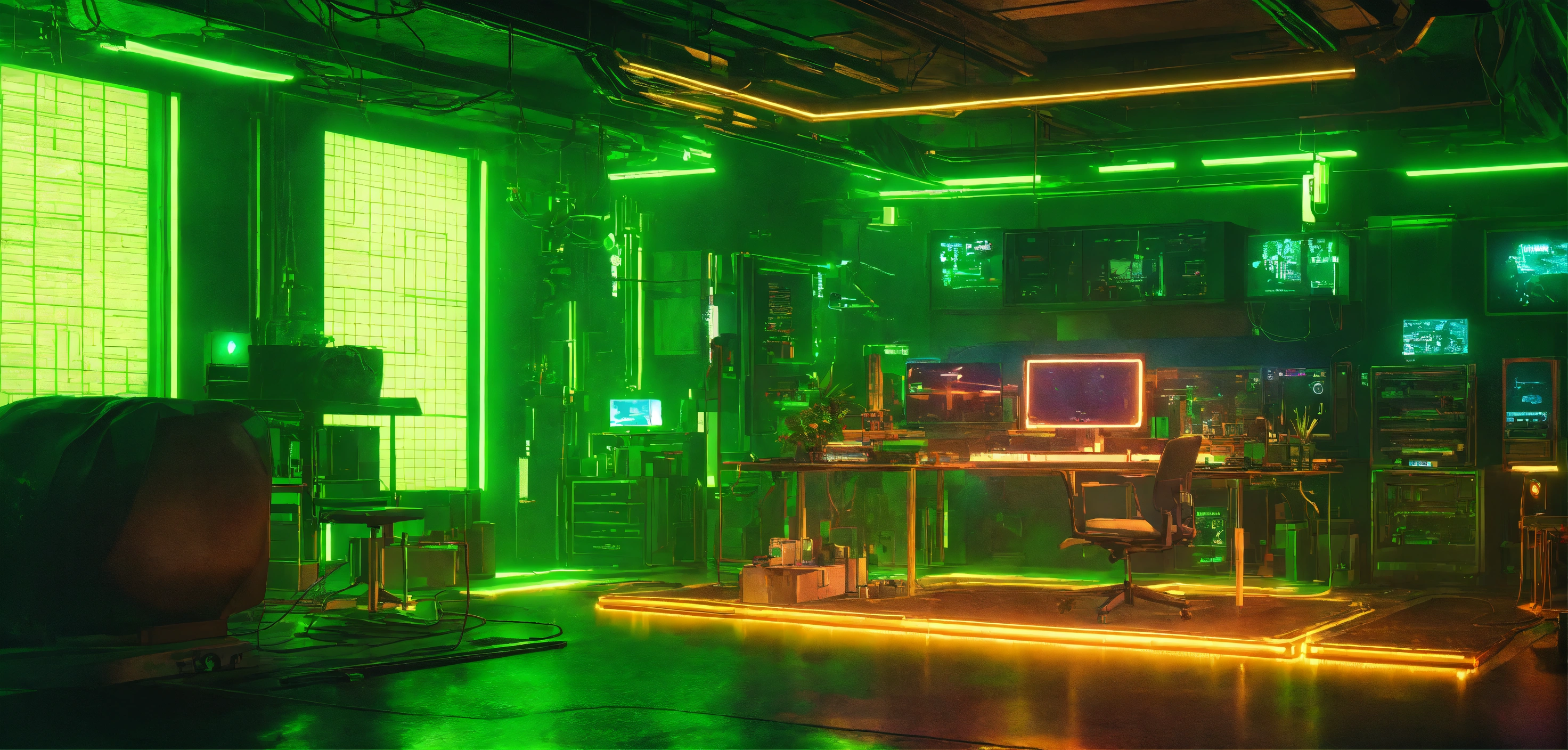 A cyberpunk styled hacker room with future technologies lighted with green and incandescent light