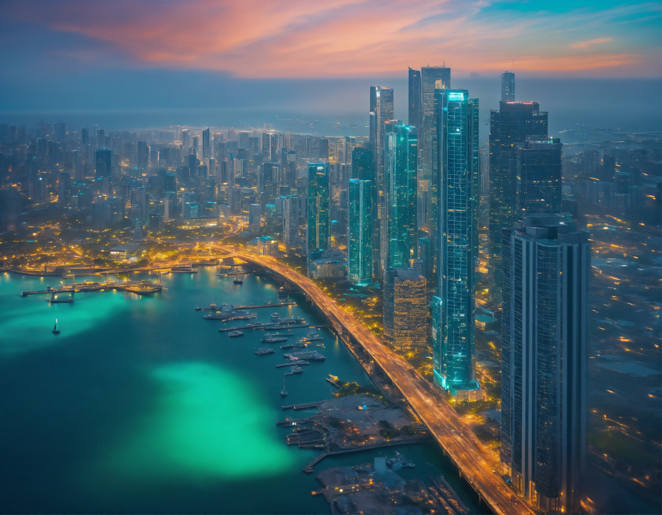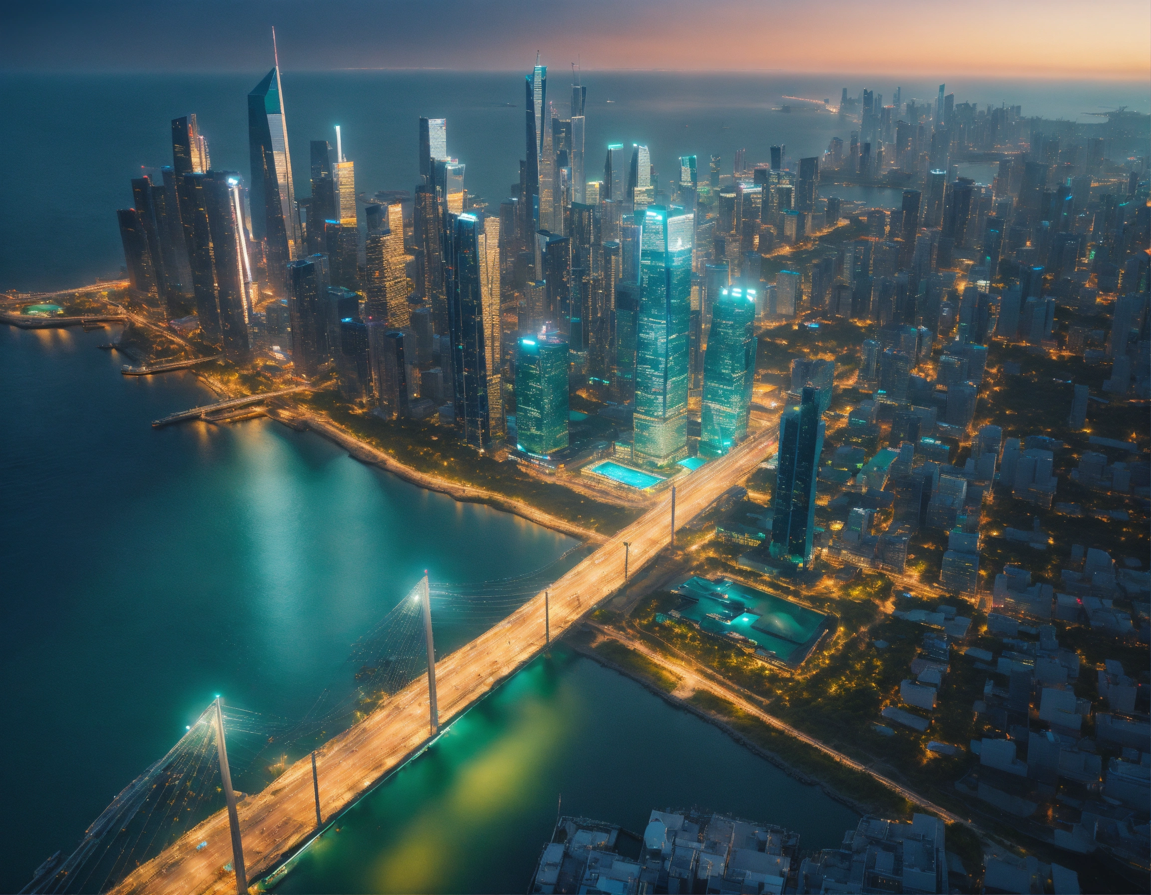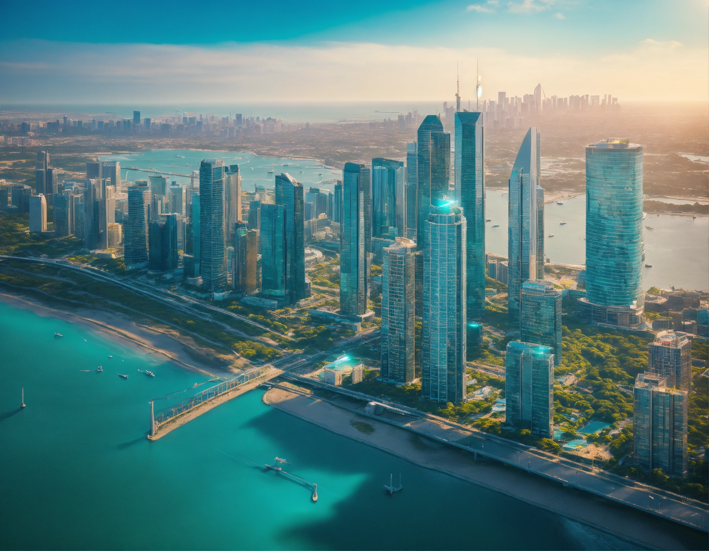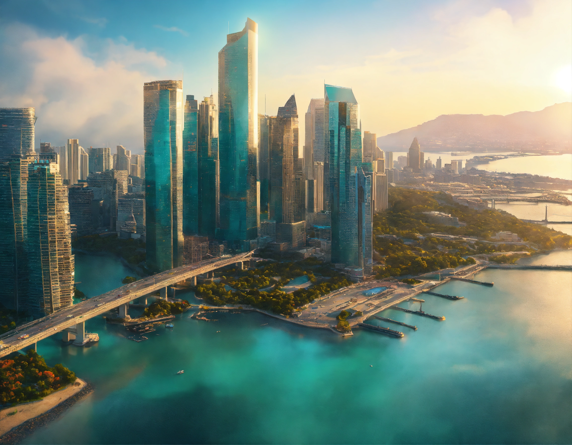 Ultra realistic drone close view of an early morning bright lit teal colored megapolis downtown skyscrapers near ocean with bridge, the shot is peaceful, graceful and full of sunshine light