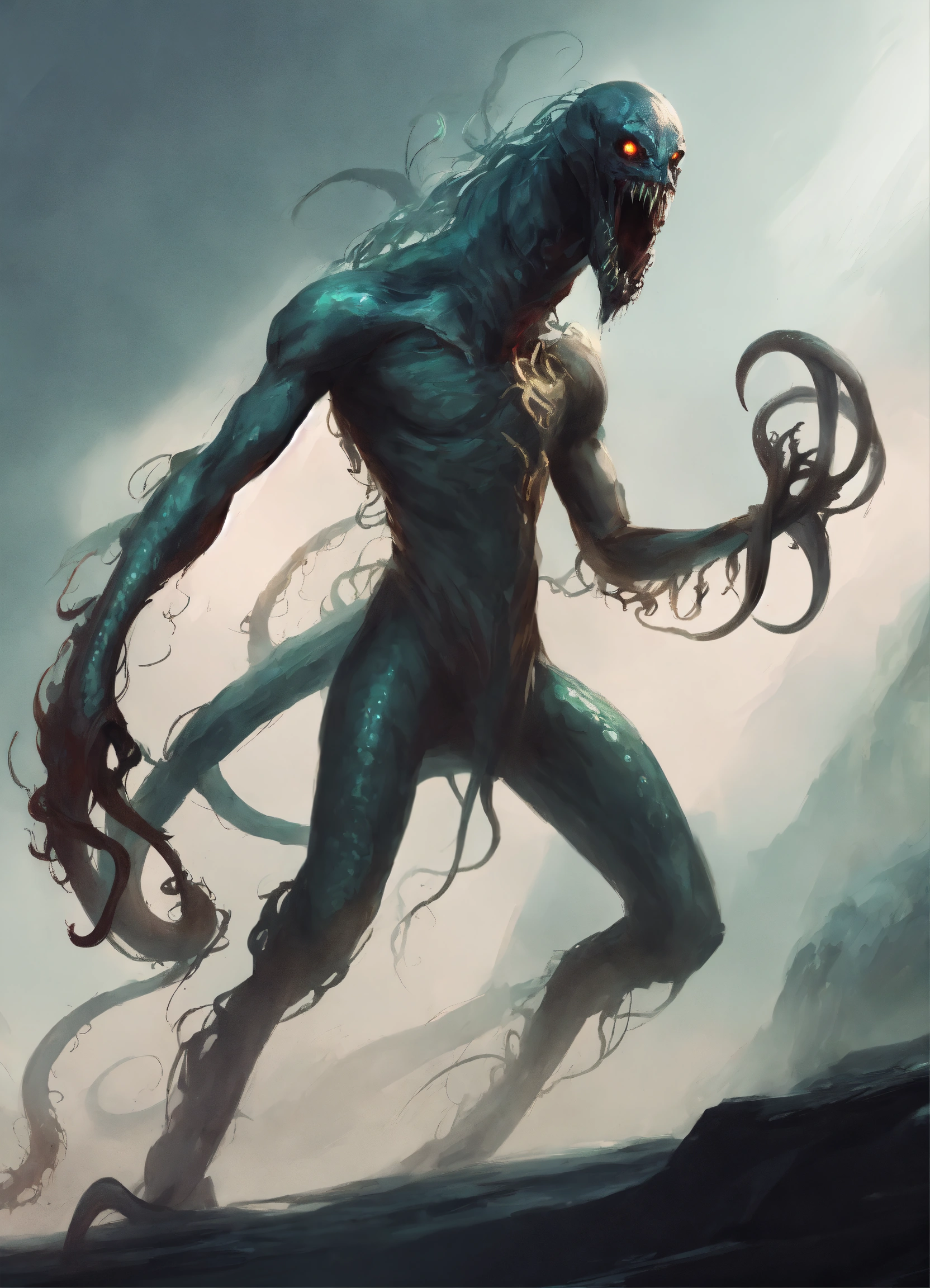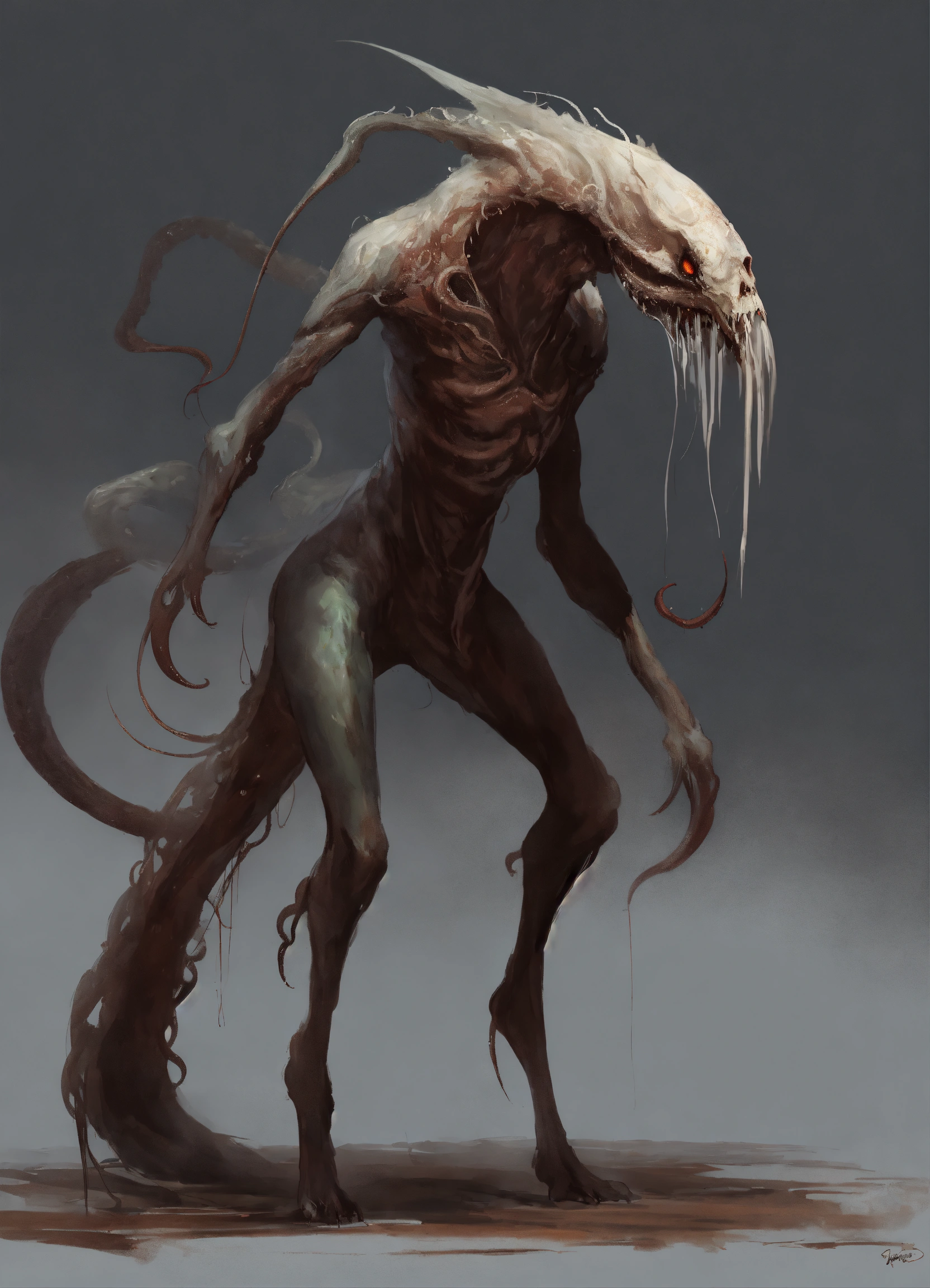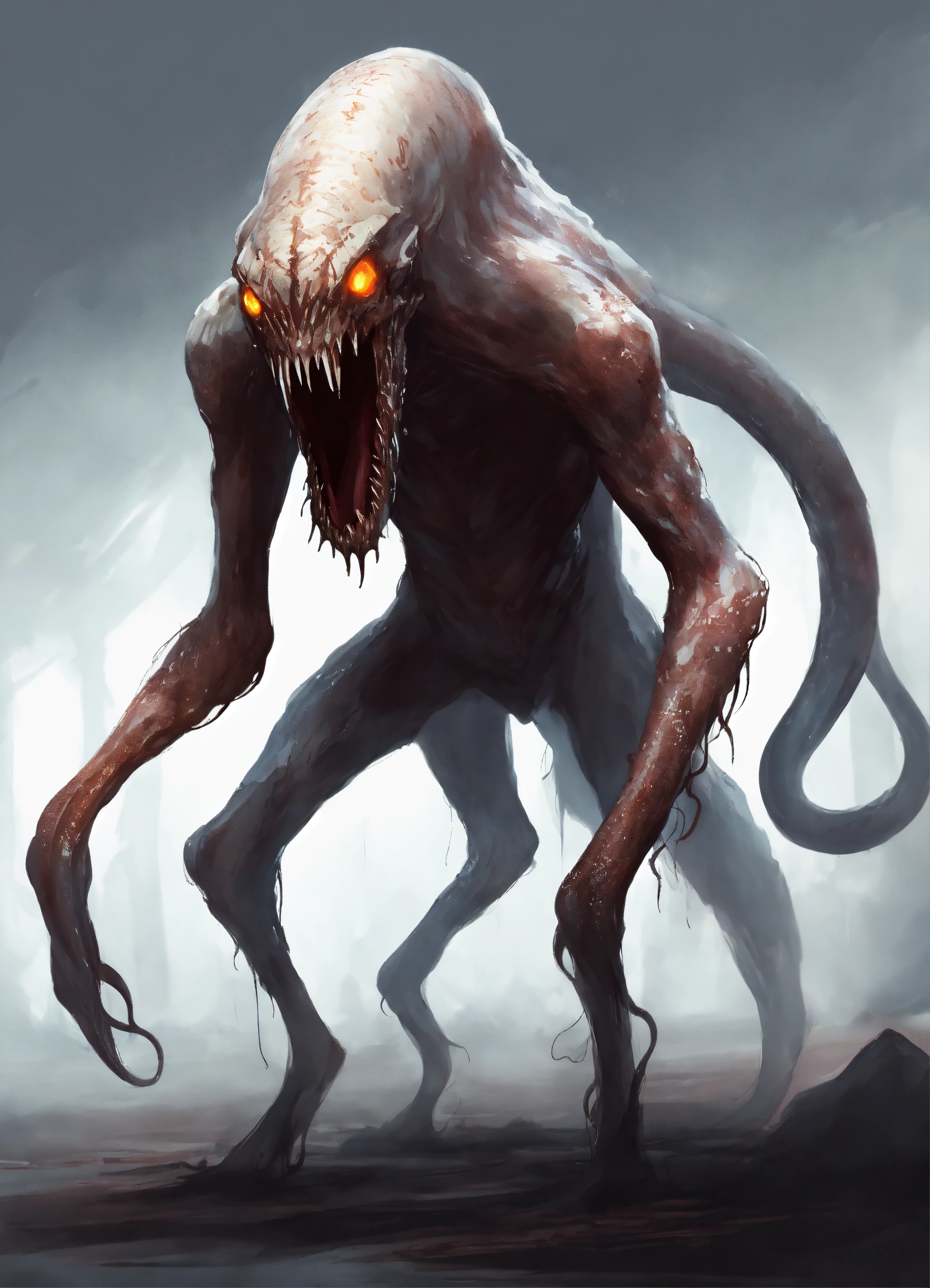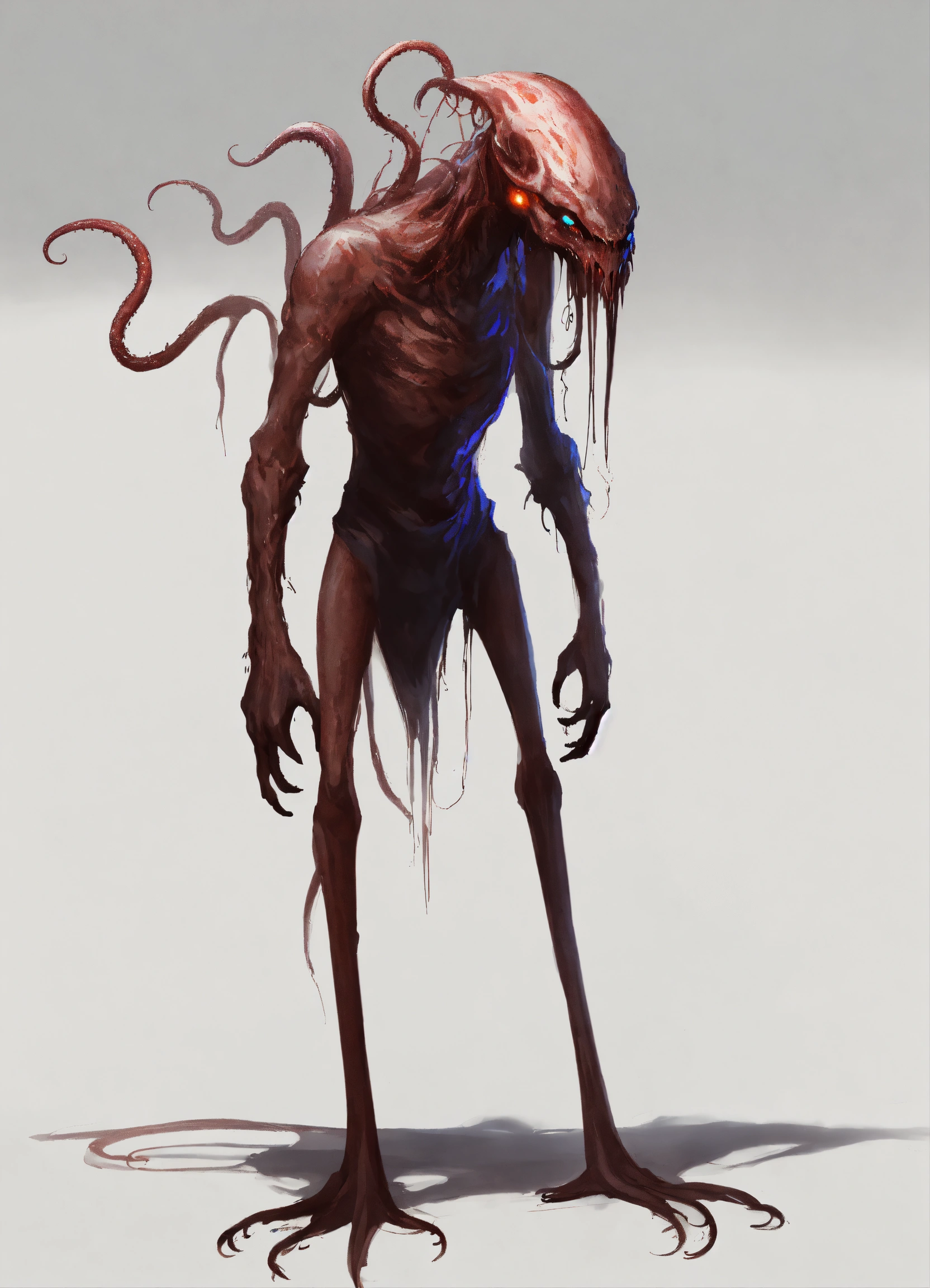 Concept art, side view, digital paintng, skiny ghostly monster, two long legs, tentacle arms, dark skin, mouth with fangs, empty eye sockets, clean white background, no background