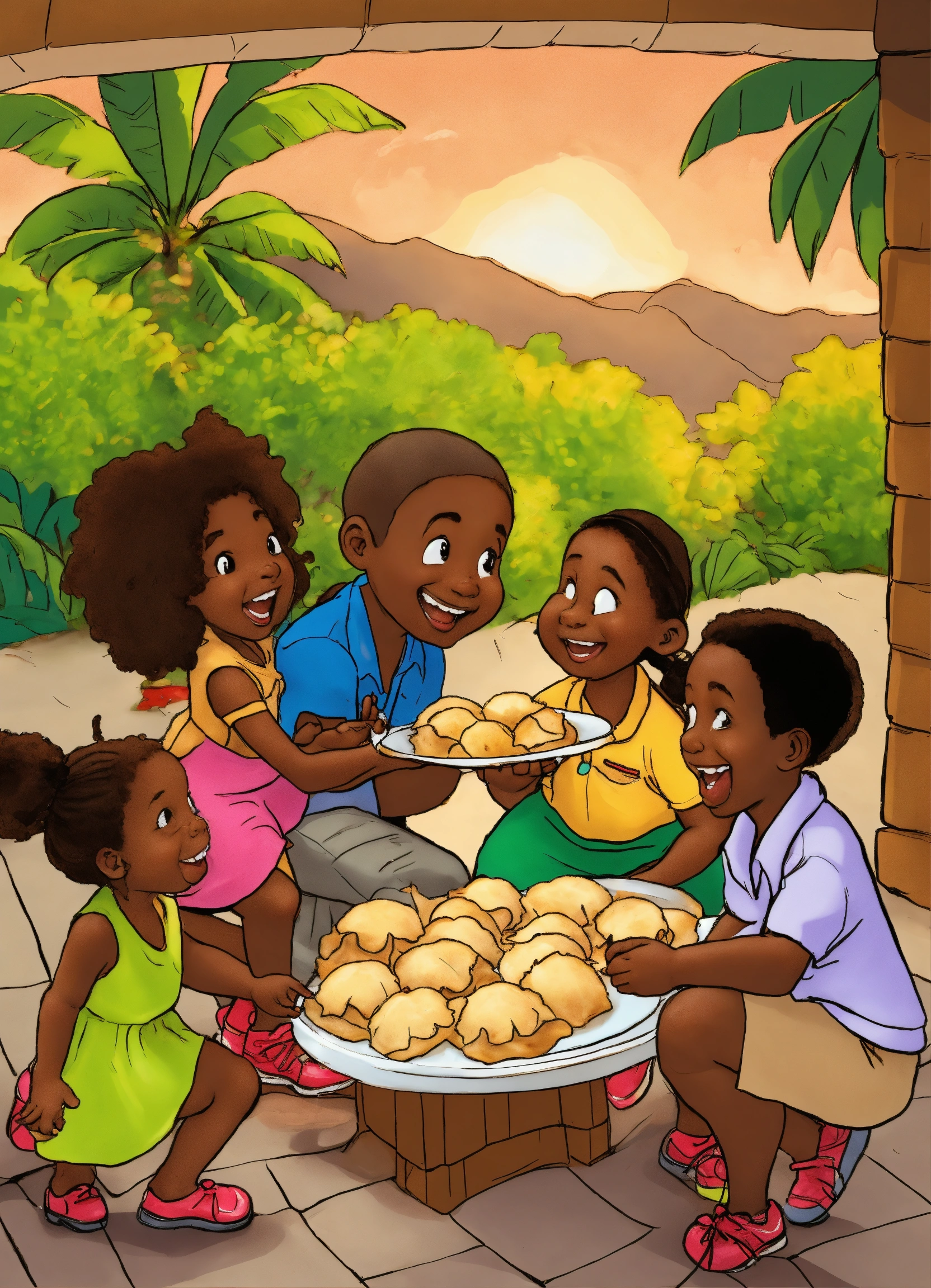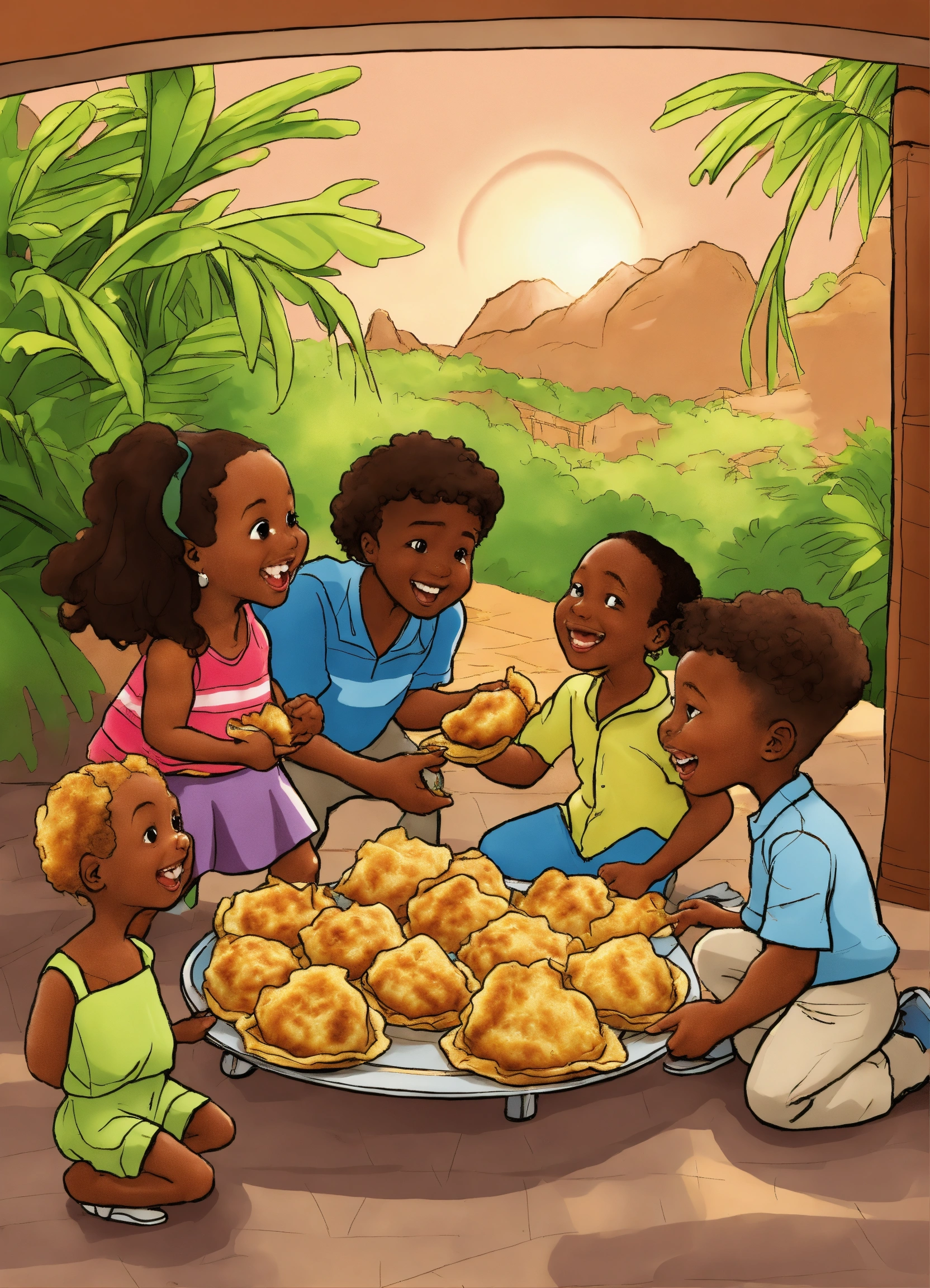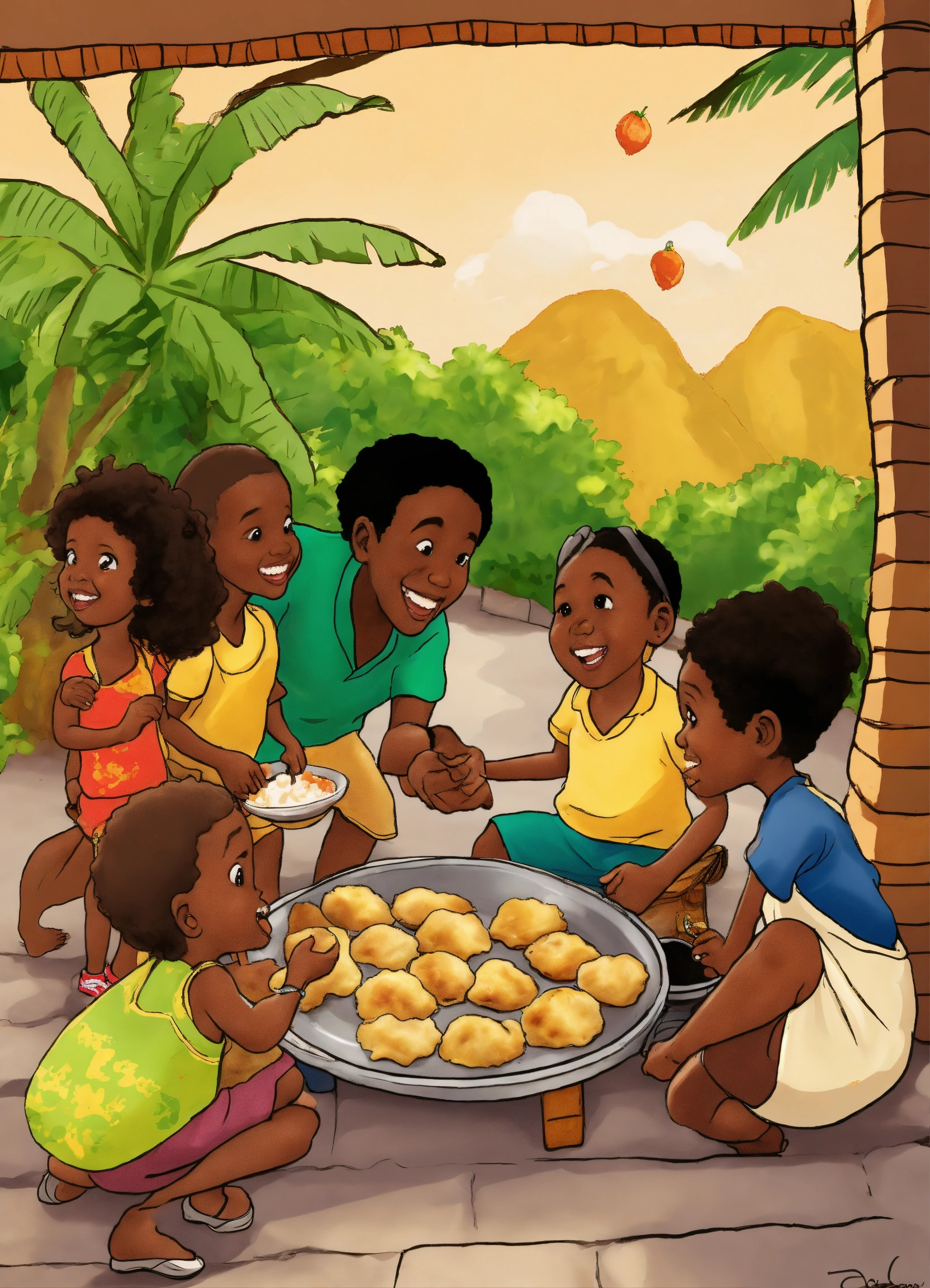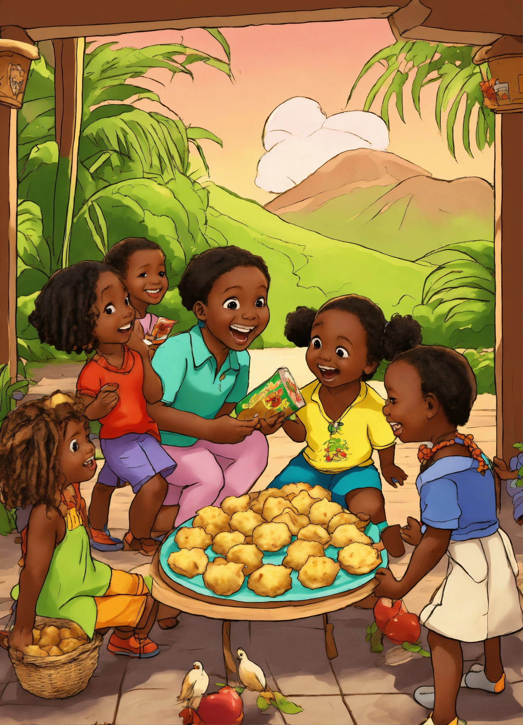 A cartoon of dancing talking caribbean fried dumplings sharing montserrat stories with caribbean 3 year old children of montserrat's virtue of children asking for some fried dumplings rather than stealing the dumplings
