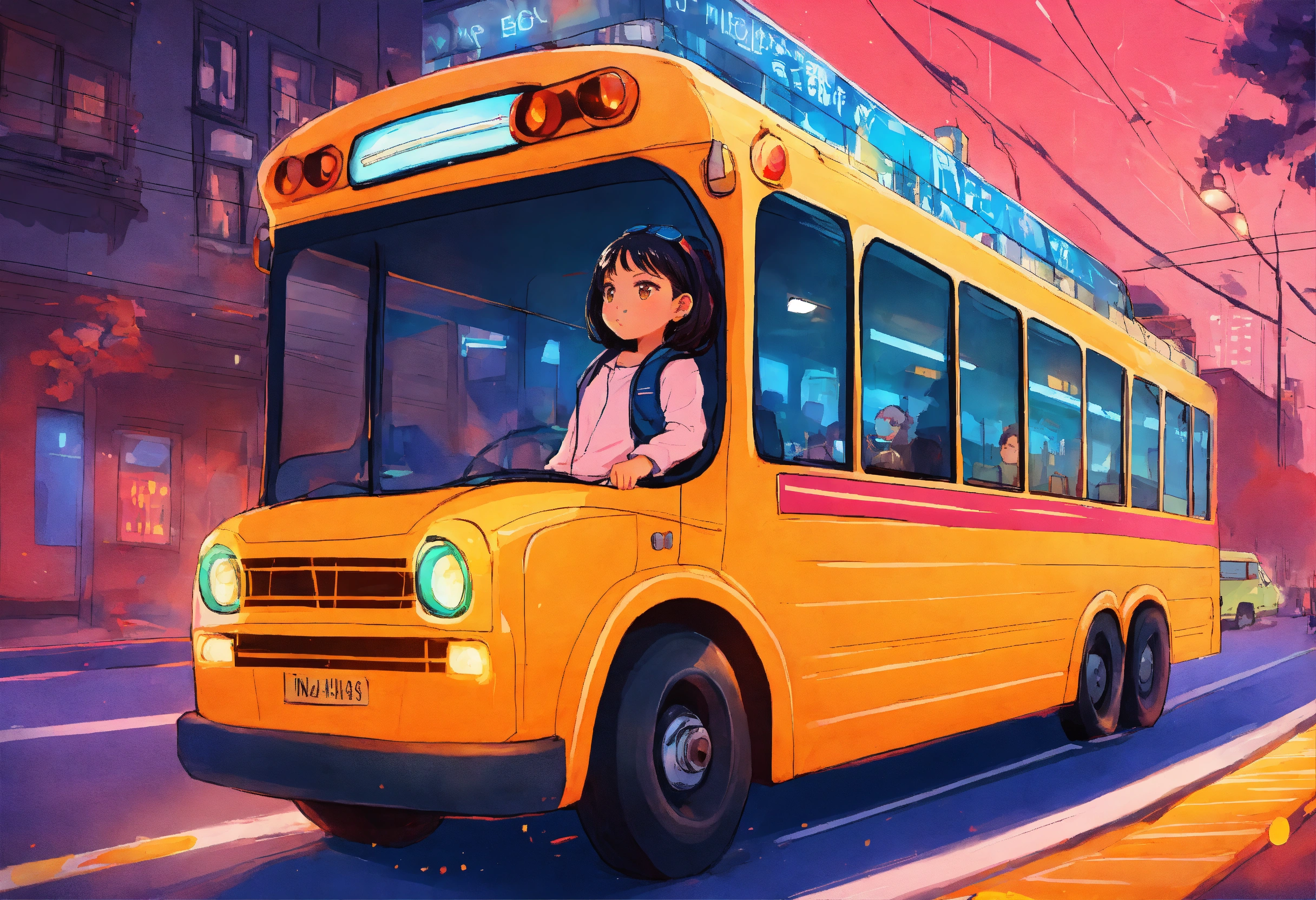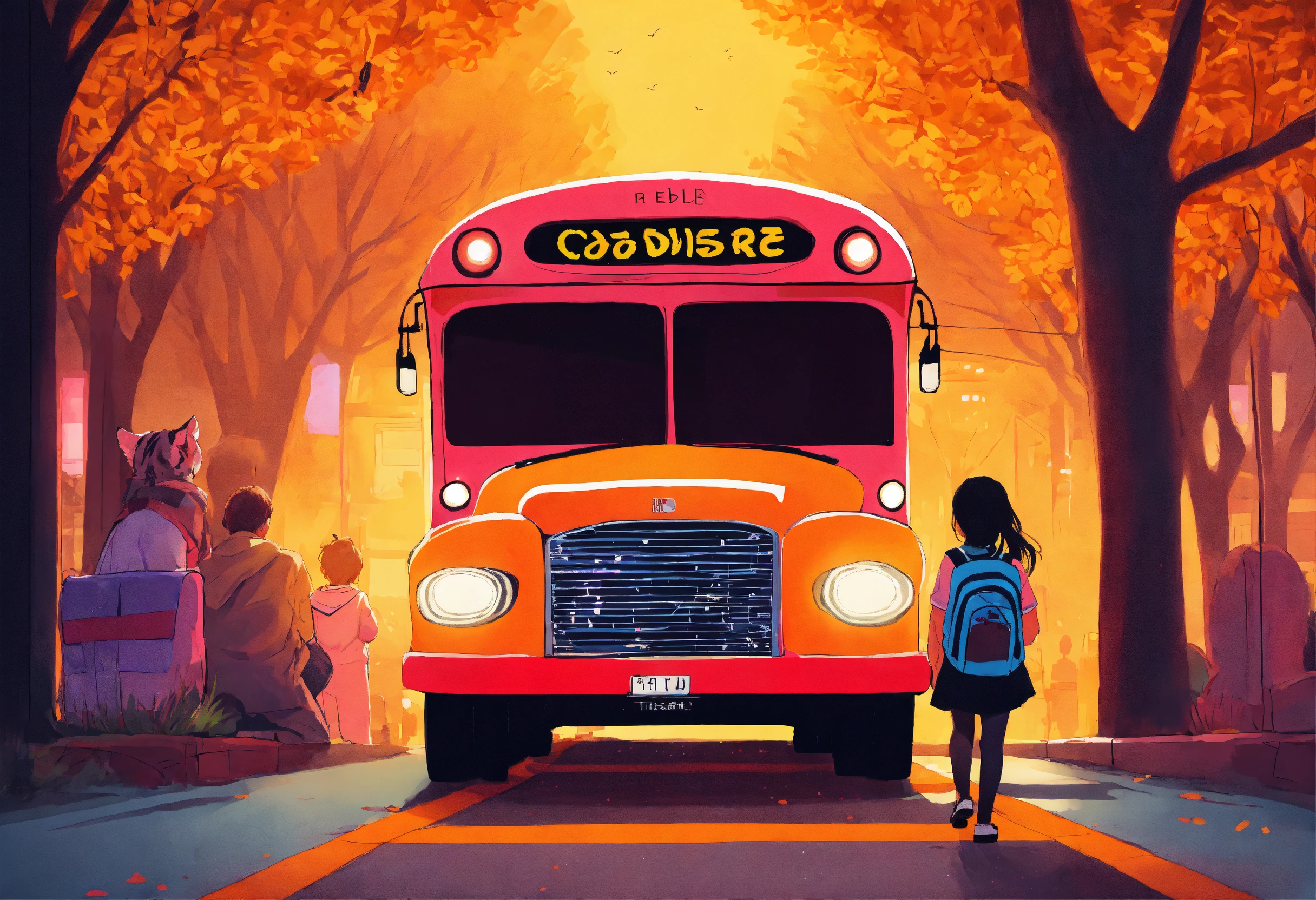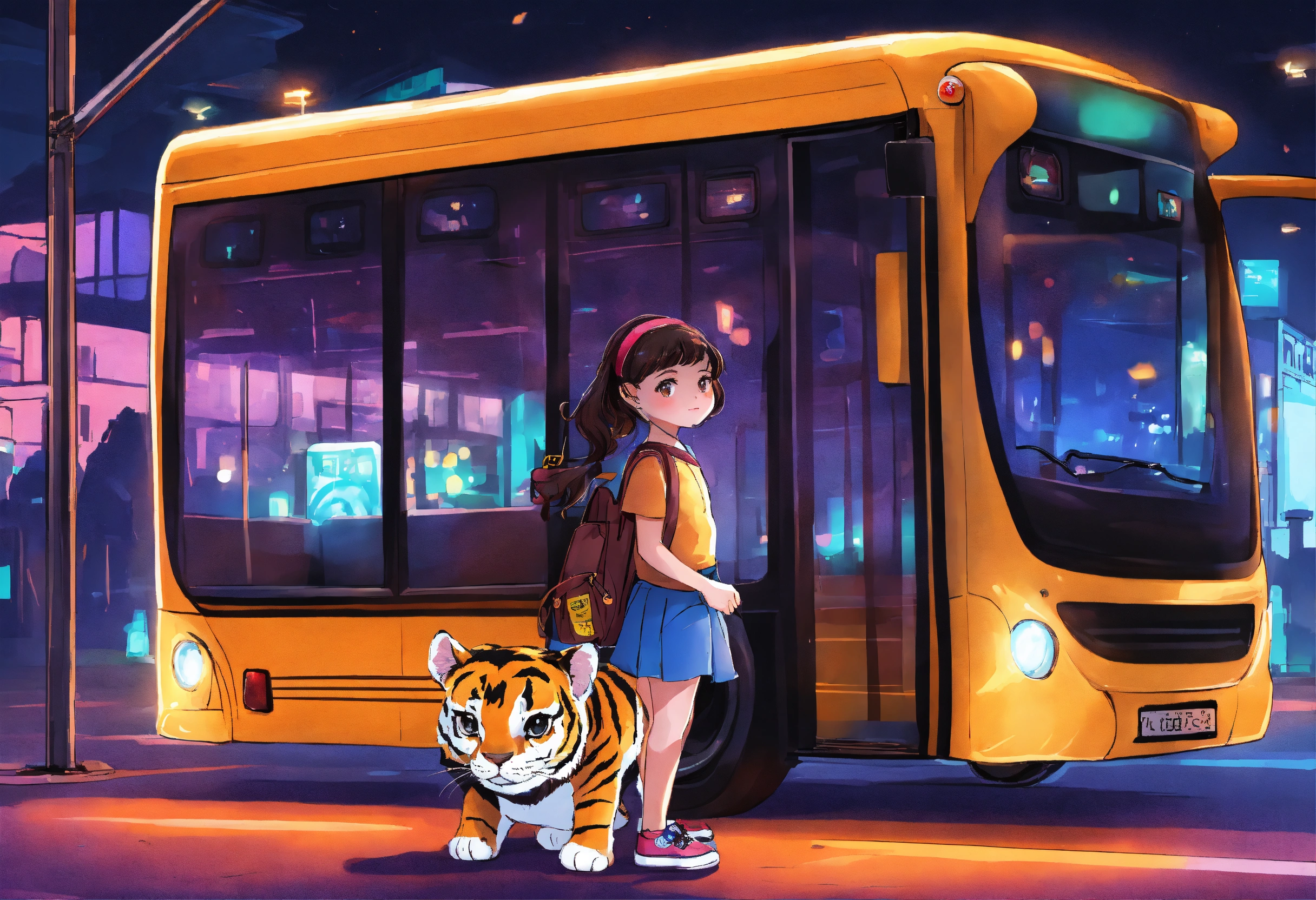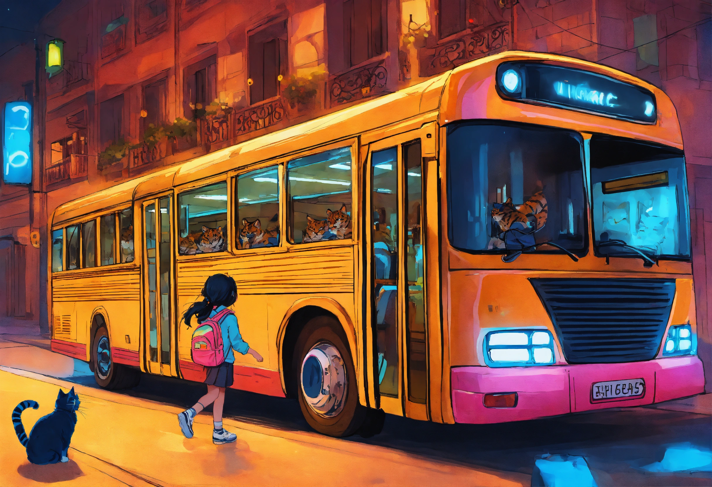 Parada de bus escolar, niña morena con gato negro esperando en parada bus, luces neón, dibujo animado, nítido y preciso los rostros. bus en forma de tigre.