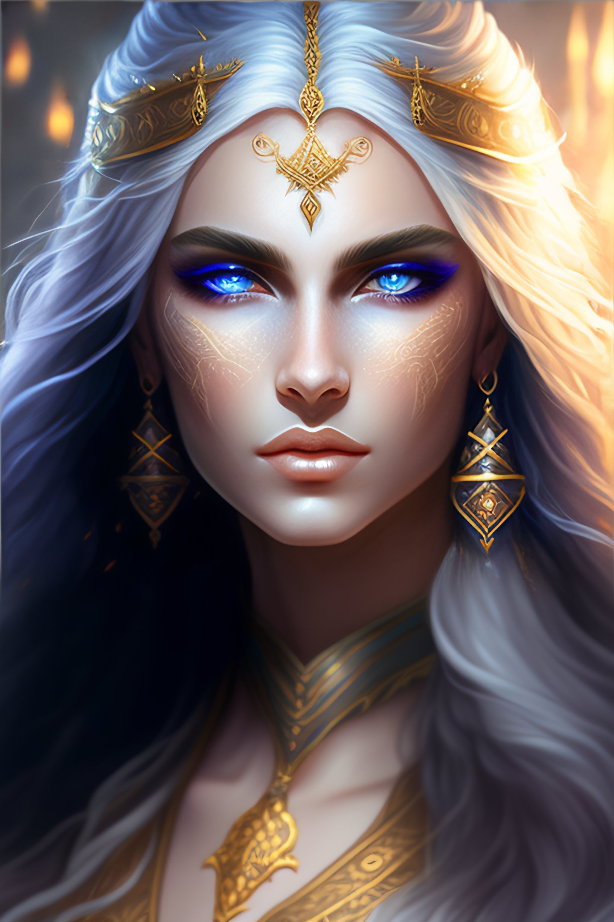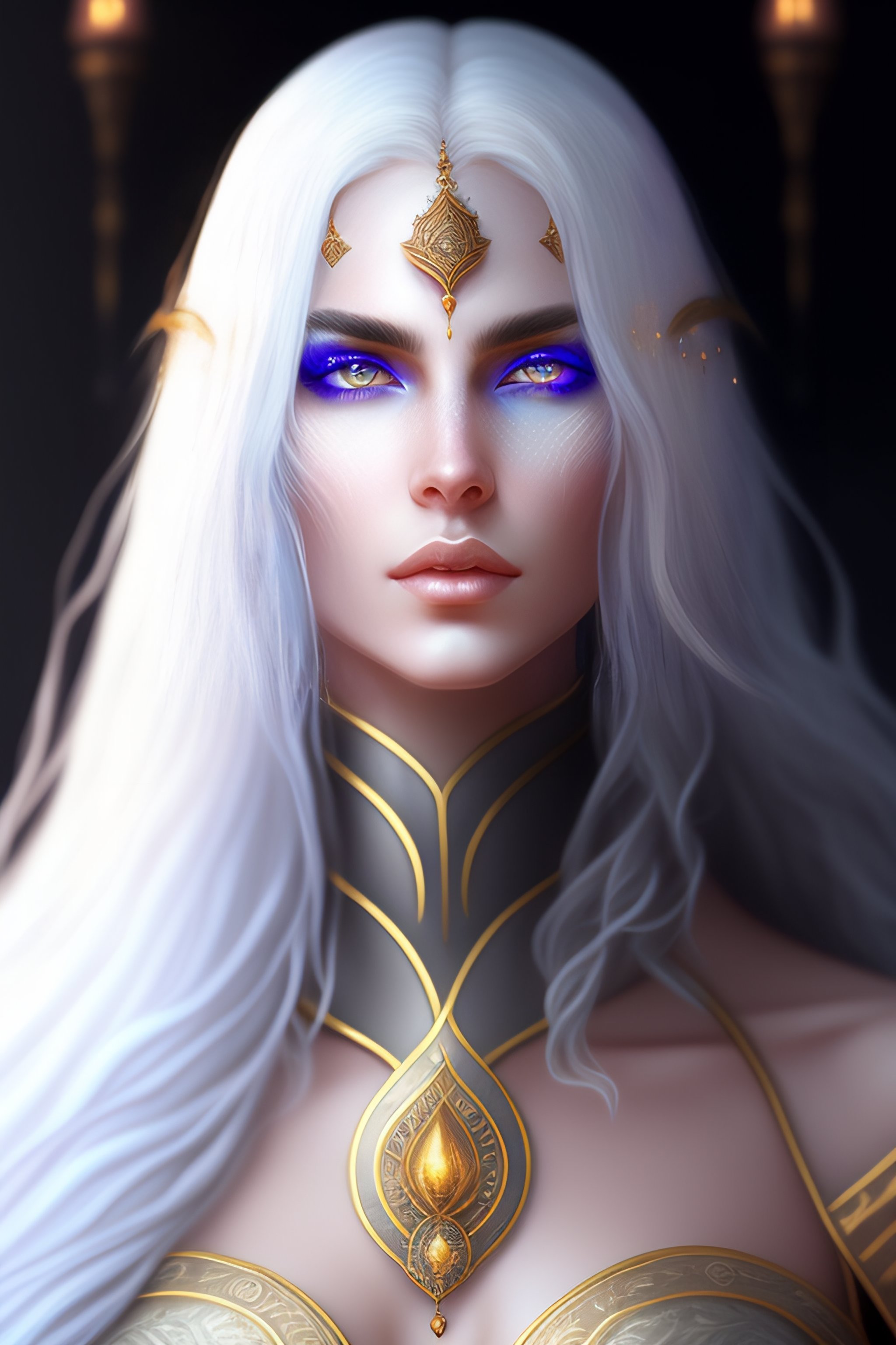 Female, mage godess with long white hair, sorcerer, shaved temple, fantasy, one eye is gold and the other eye is blue, pale skin, dark elf sharp focus, intricate, elegant, illustration, ambient lighting, art by stefanie law, qistina khalidah, tranding on artstation, art by luis royo higly detailed studio lighting