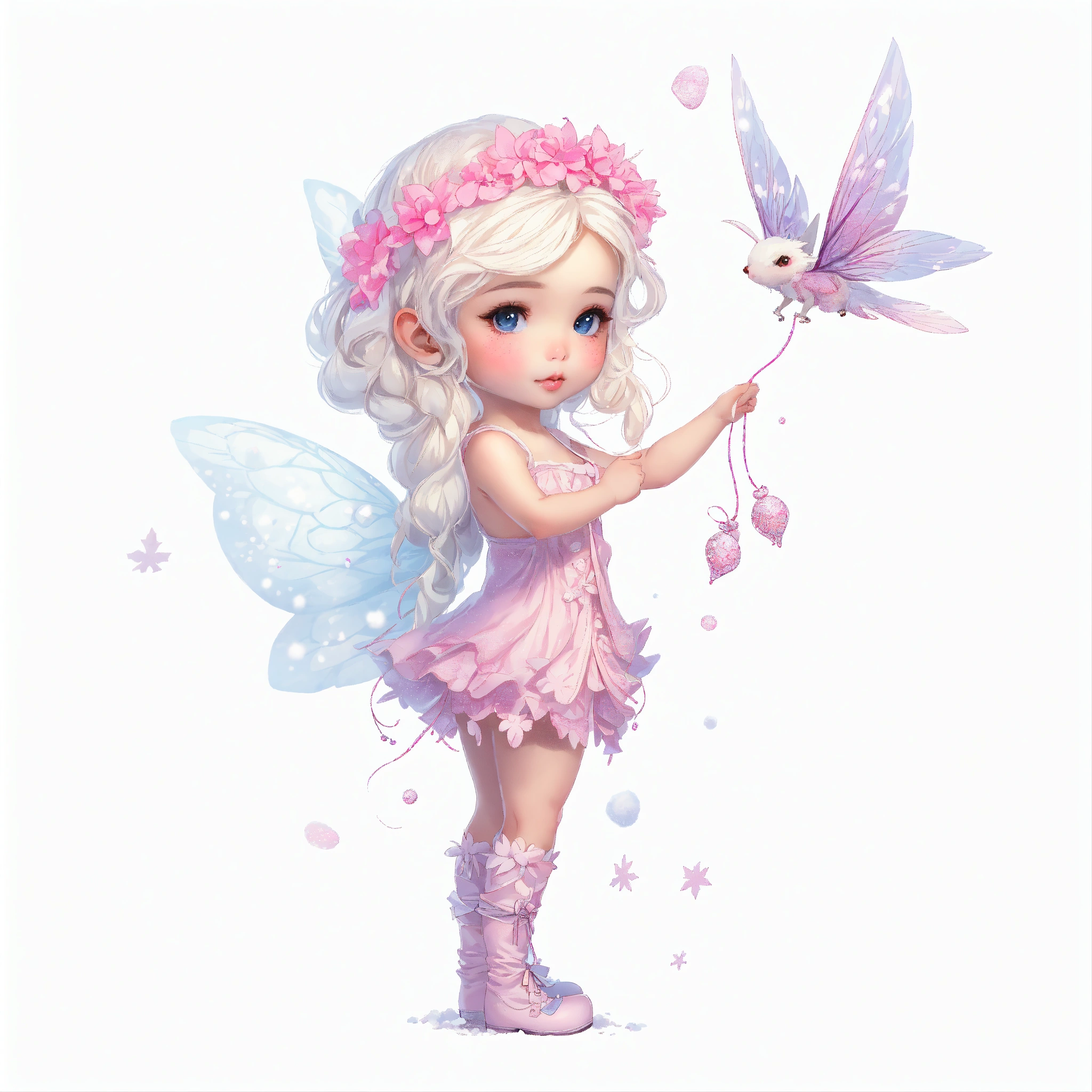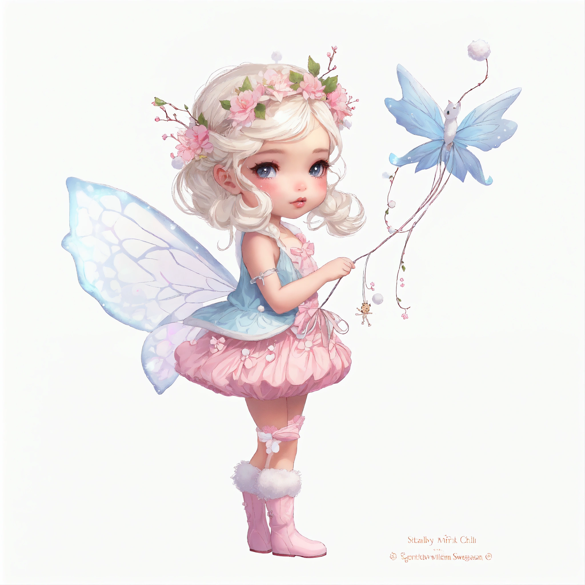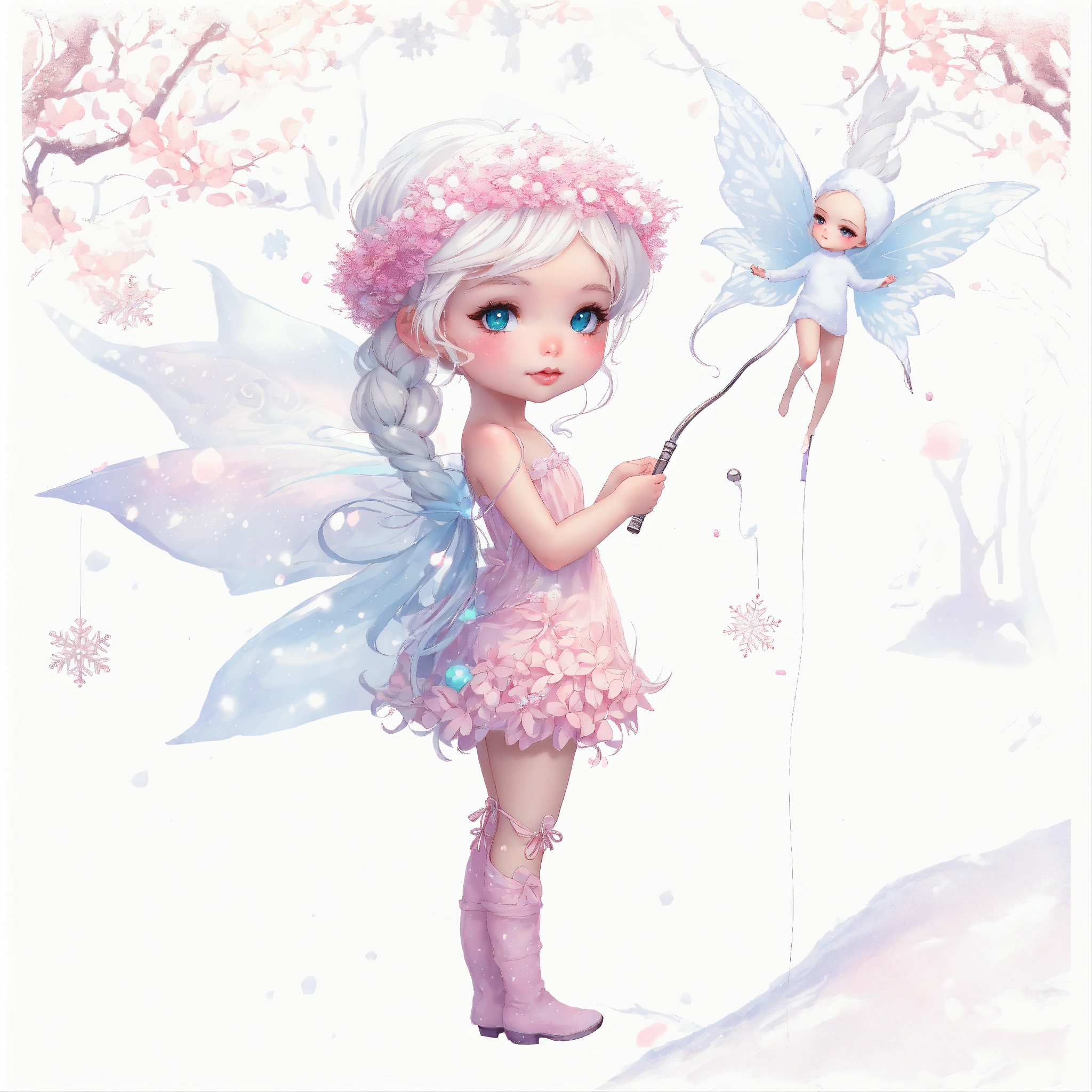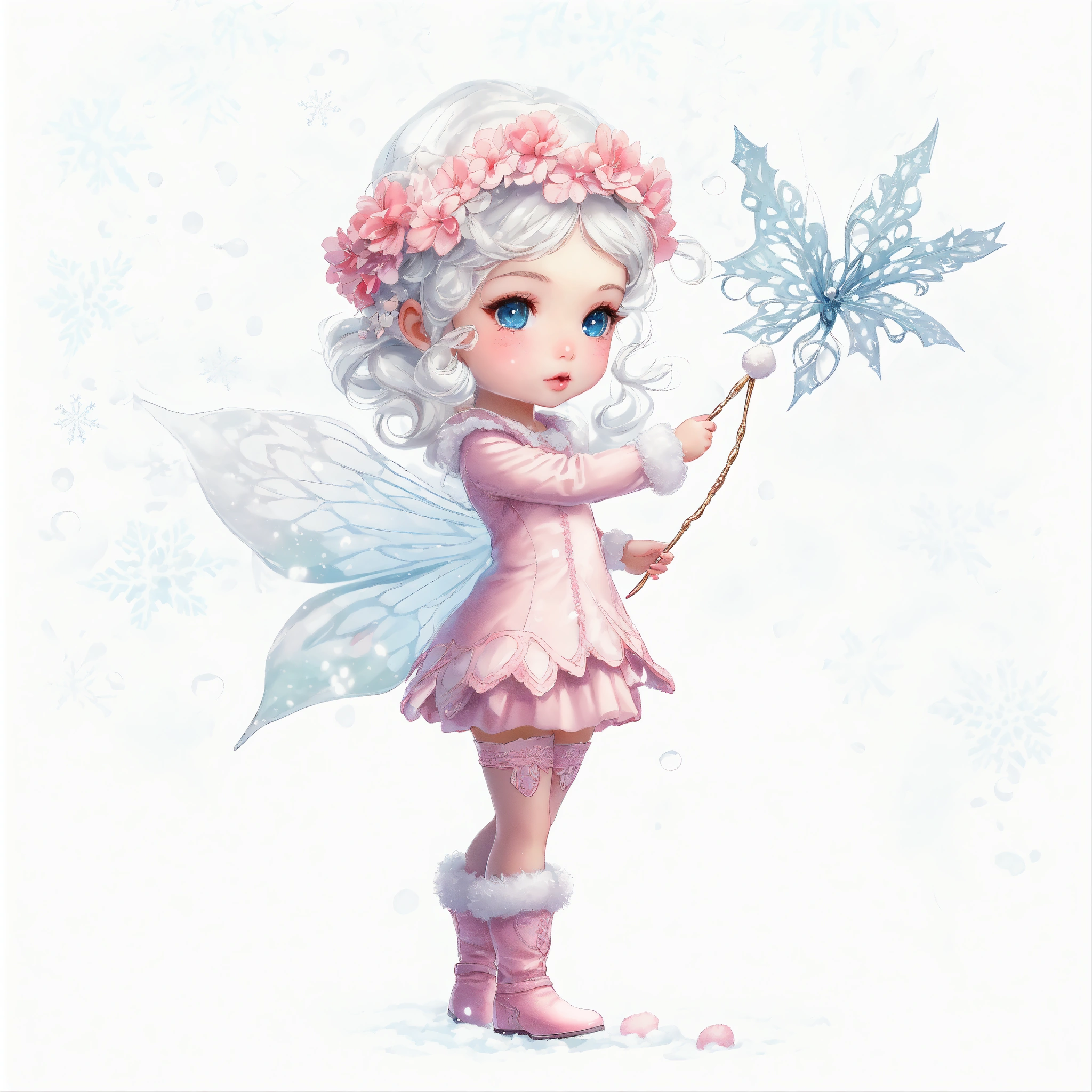Full body of a realistic sweetness baby chibi snow fairy girl winter freckled two braids in her long white blonde hair she is playing in a enchanted winter magic garden, clipart digital art style, pink colors, very detailed, by stanley artgerm and tom bagshaw, 32k