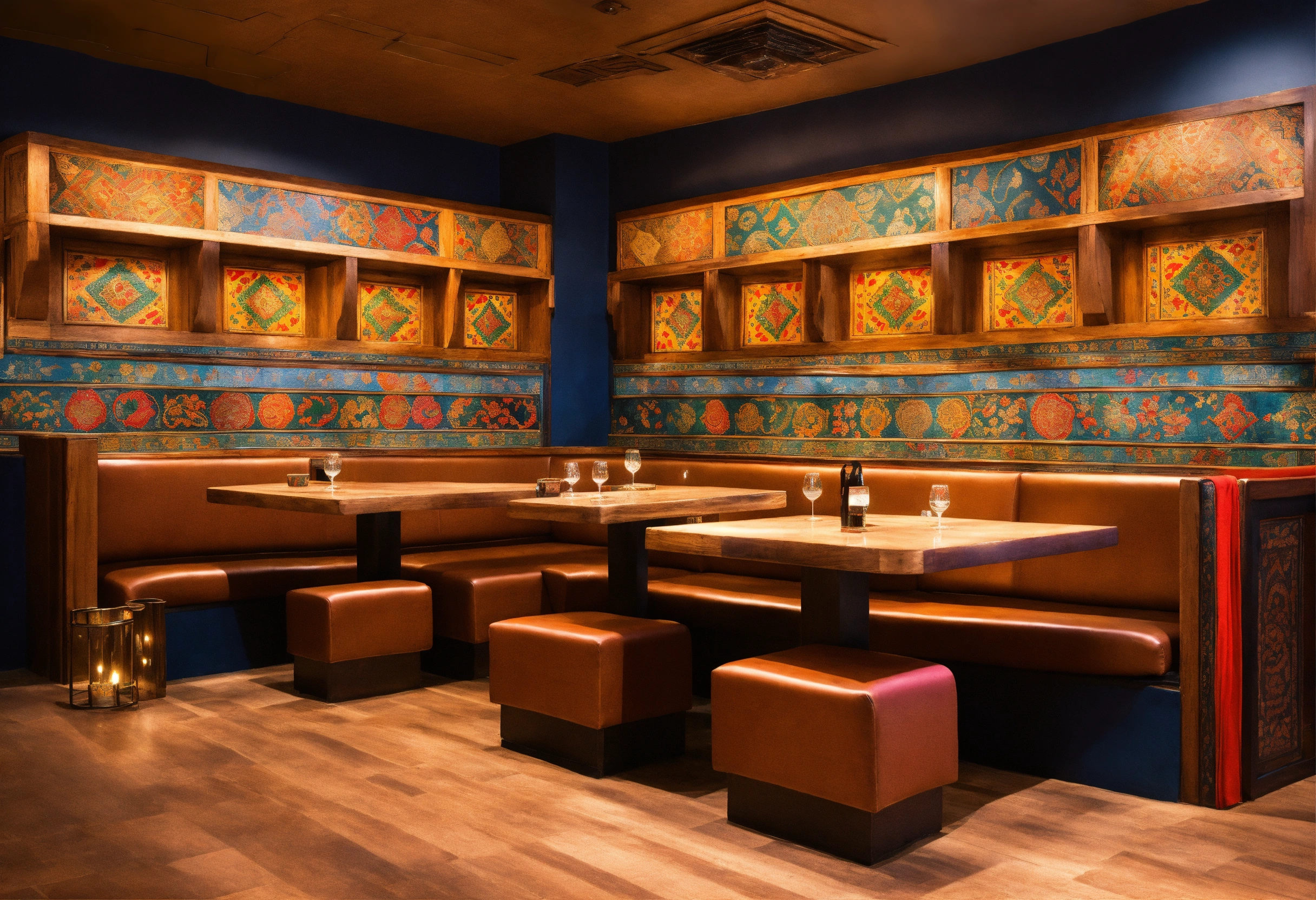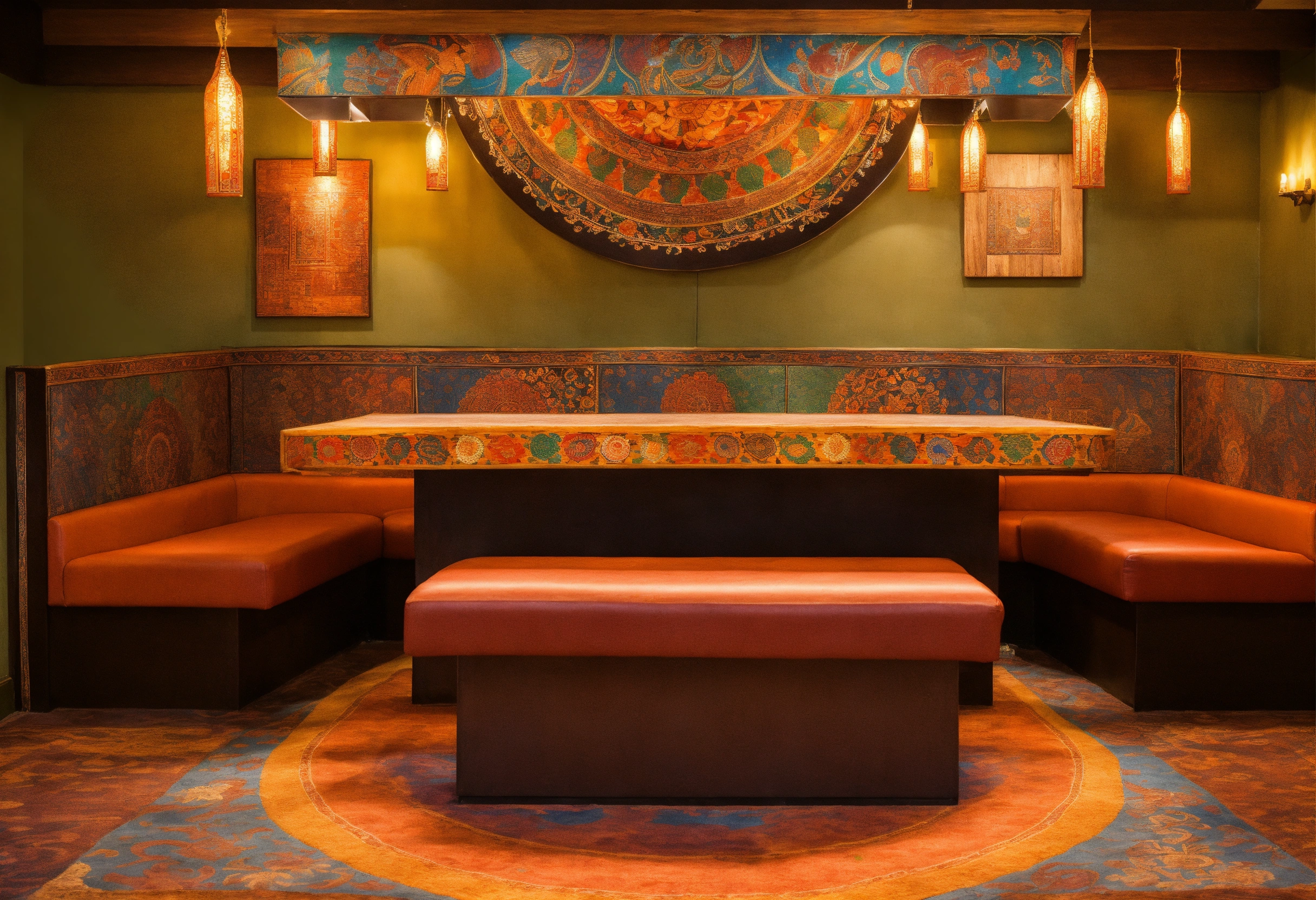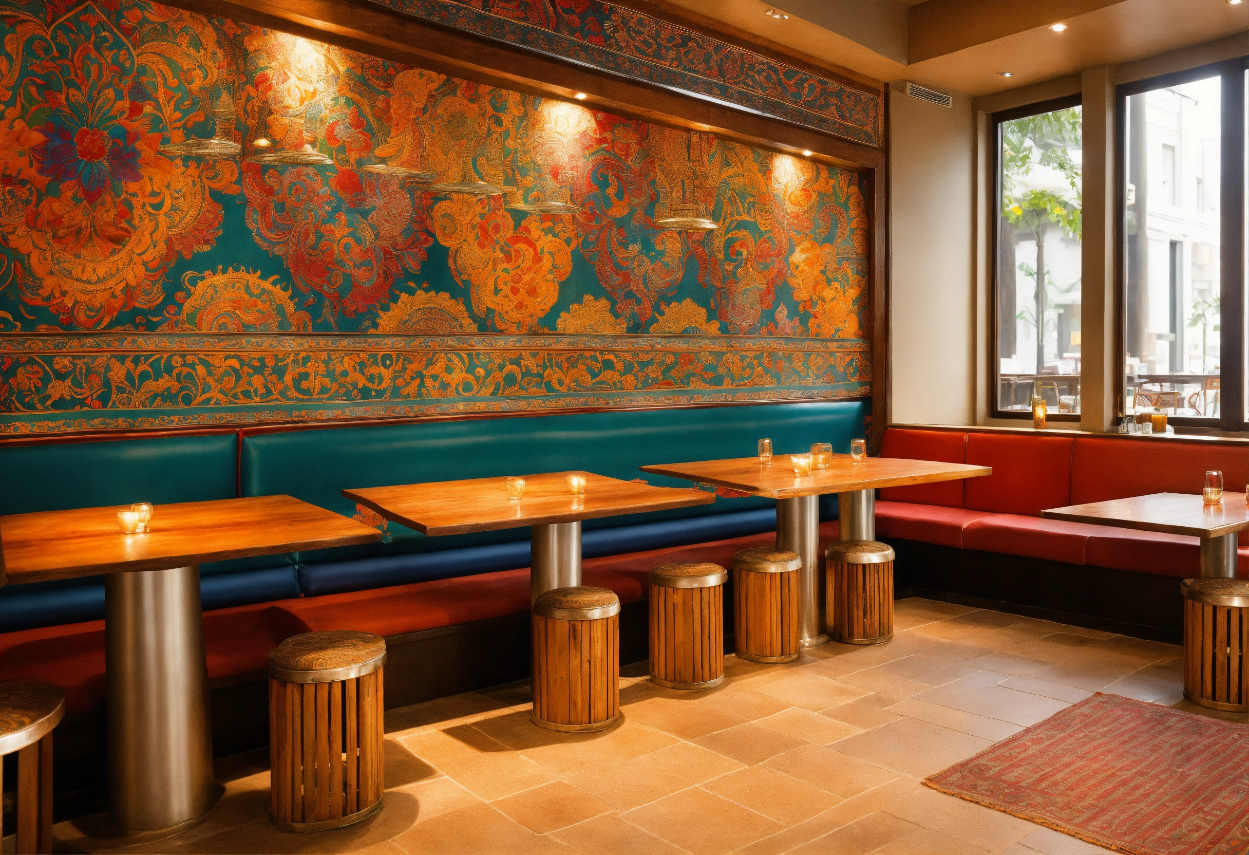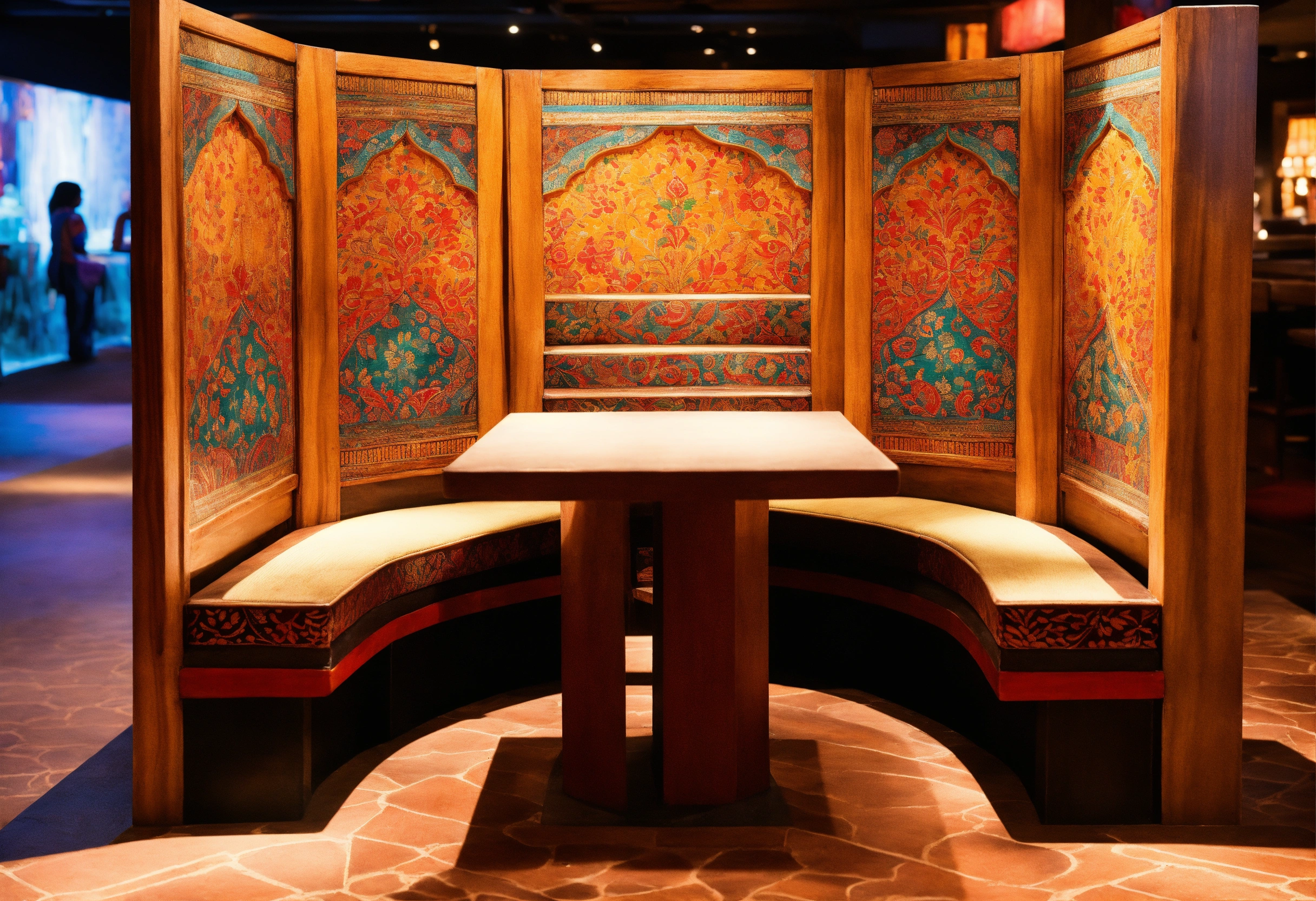 "create an image of a small wooden frame booth-style u-shaped seating table with intricate and colorful indian patterns, motifs, and decor. the design should authentically capture the essence of indian culture and cuisine, immersing diners in an inviting and culturally rich dining experience."