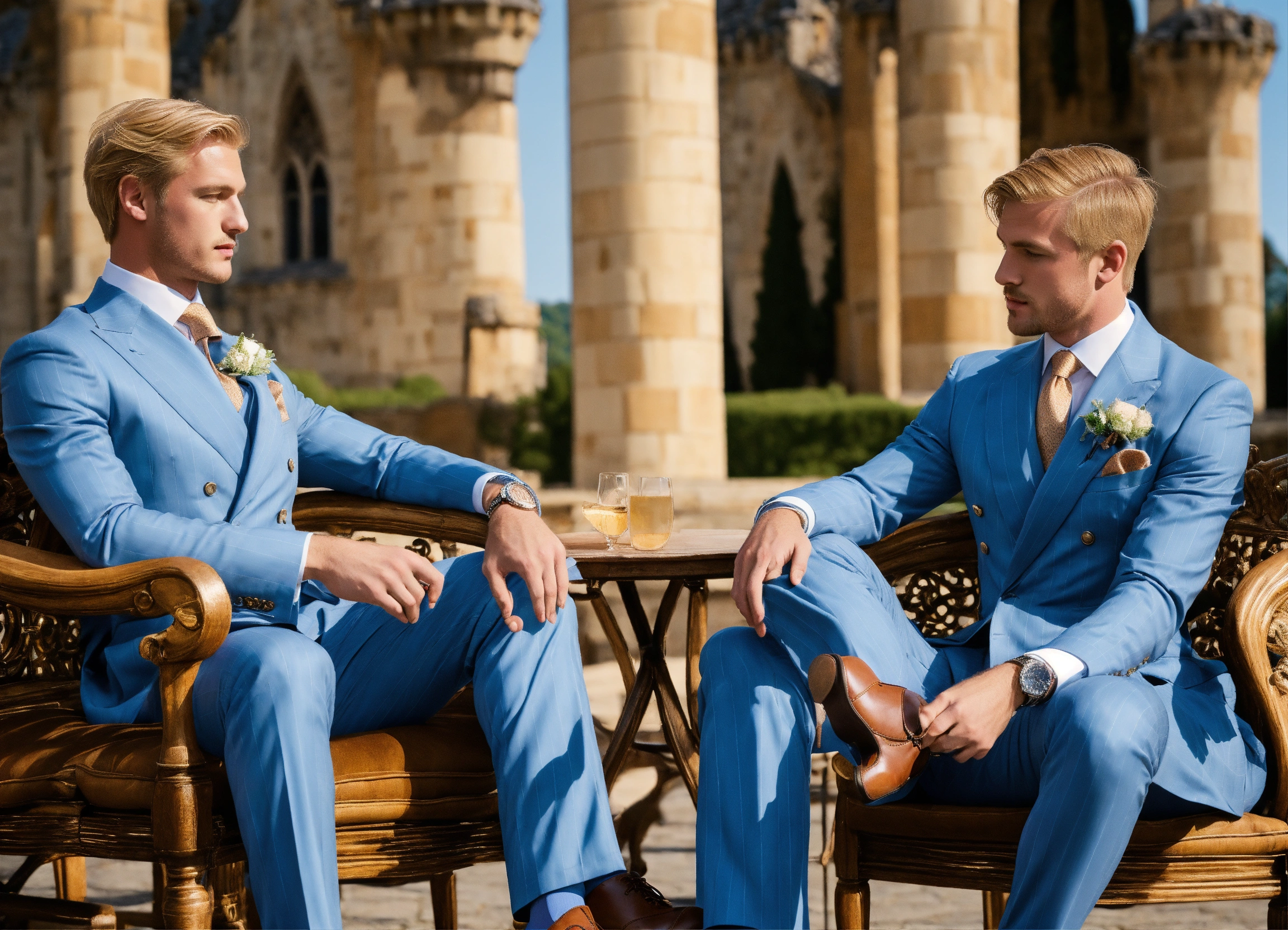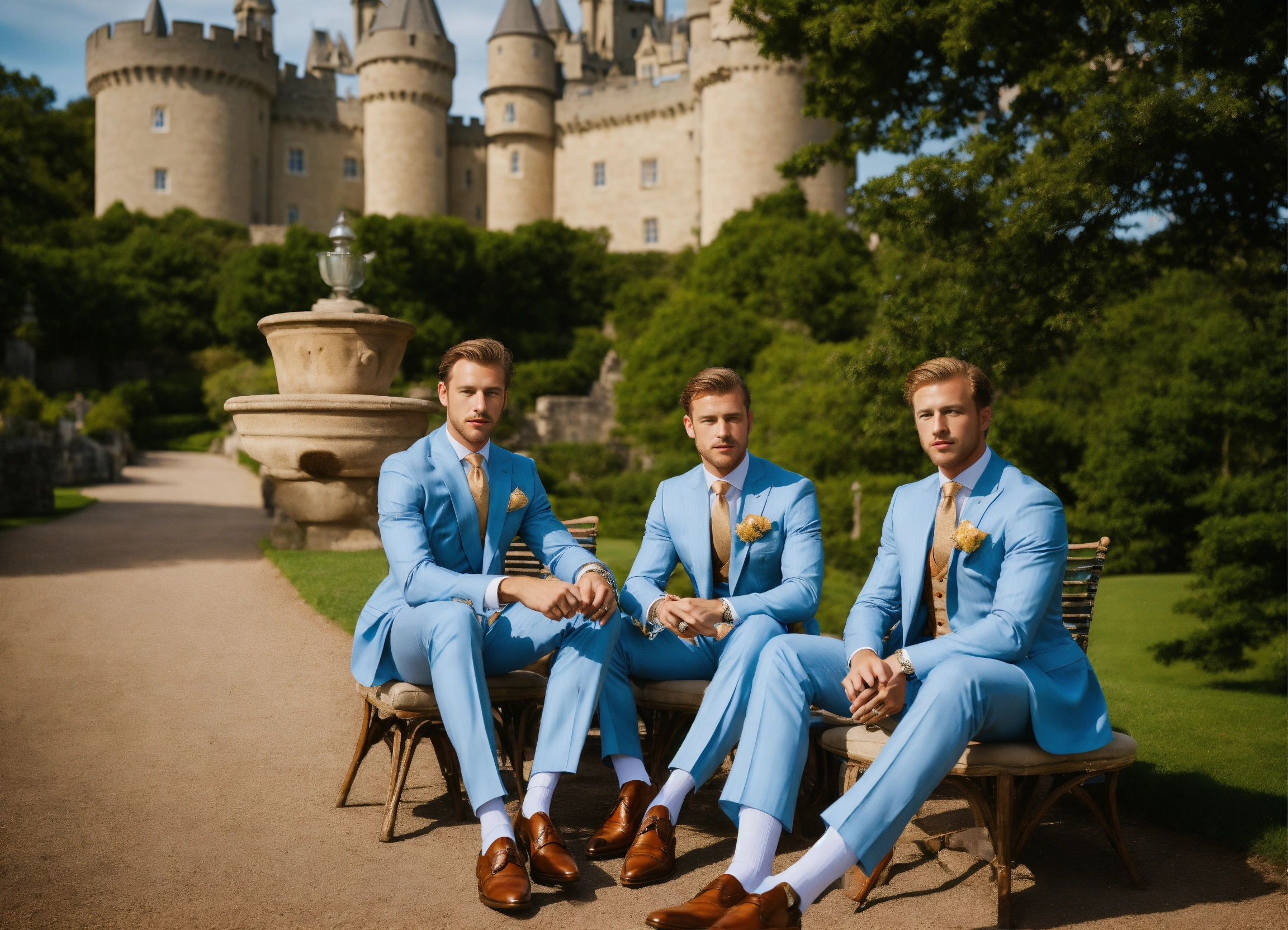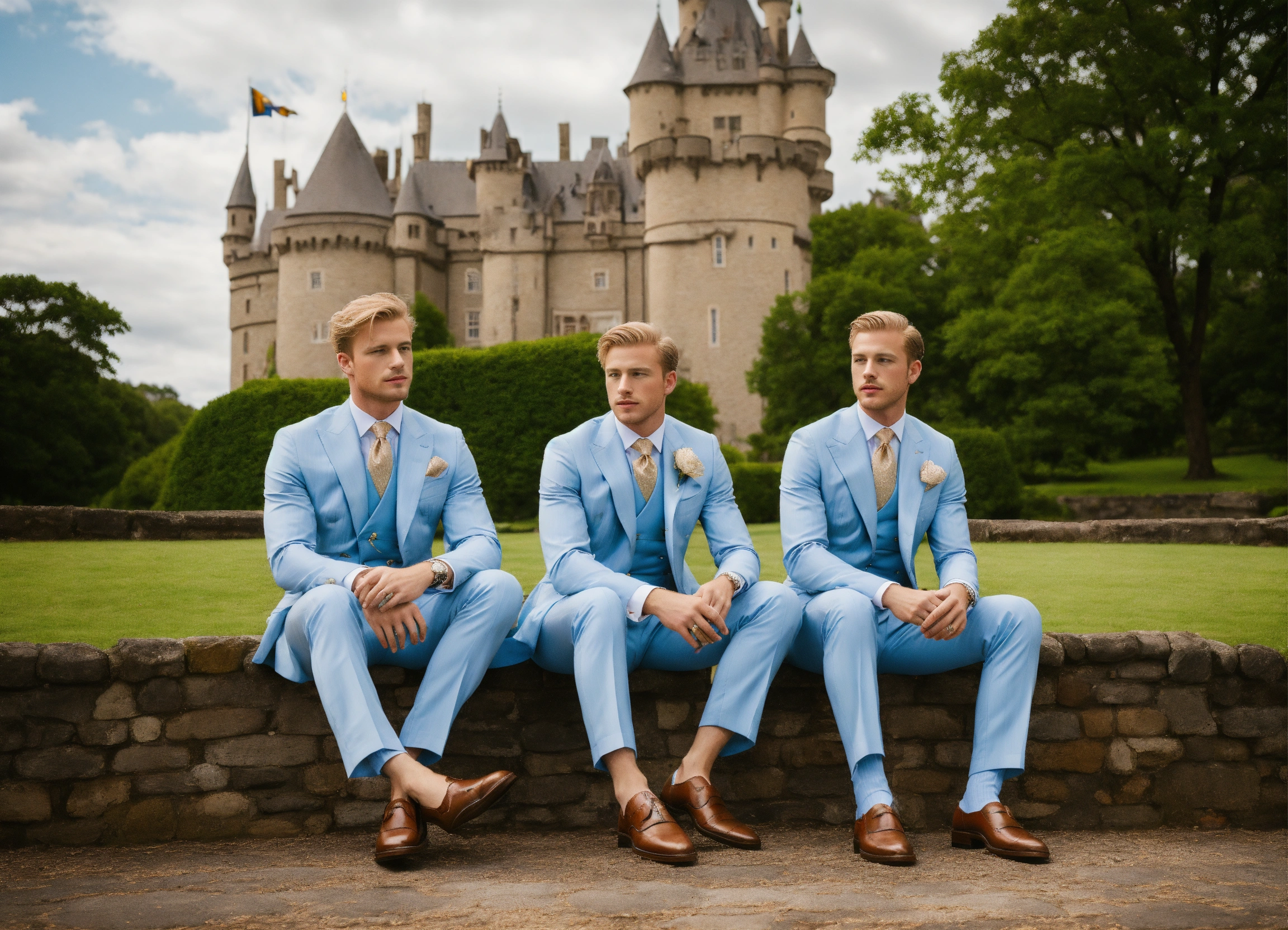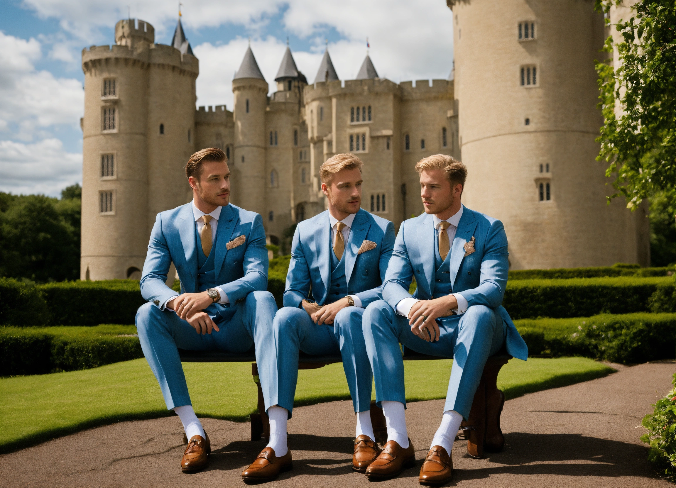 Three blonde gentlemen, in pale blue pinstripe double breasted suit, club tie, light brown monkstrap shoes, affectionately seating side by side in front of a castle