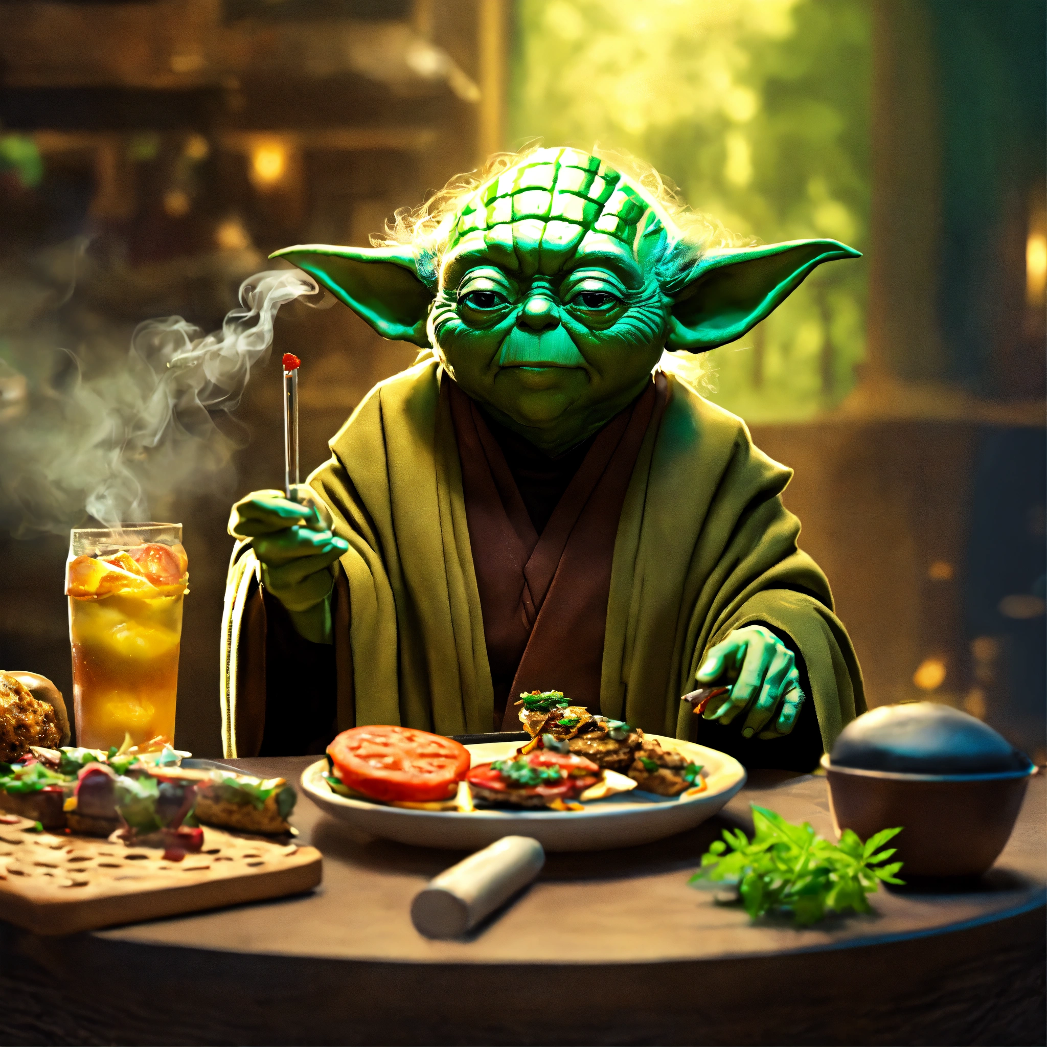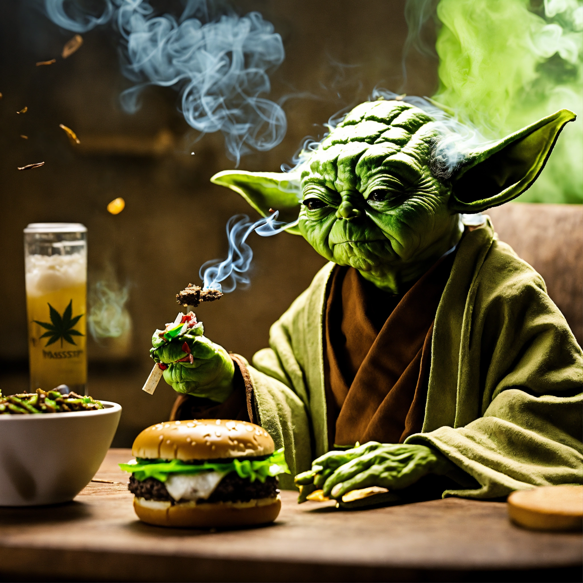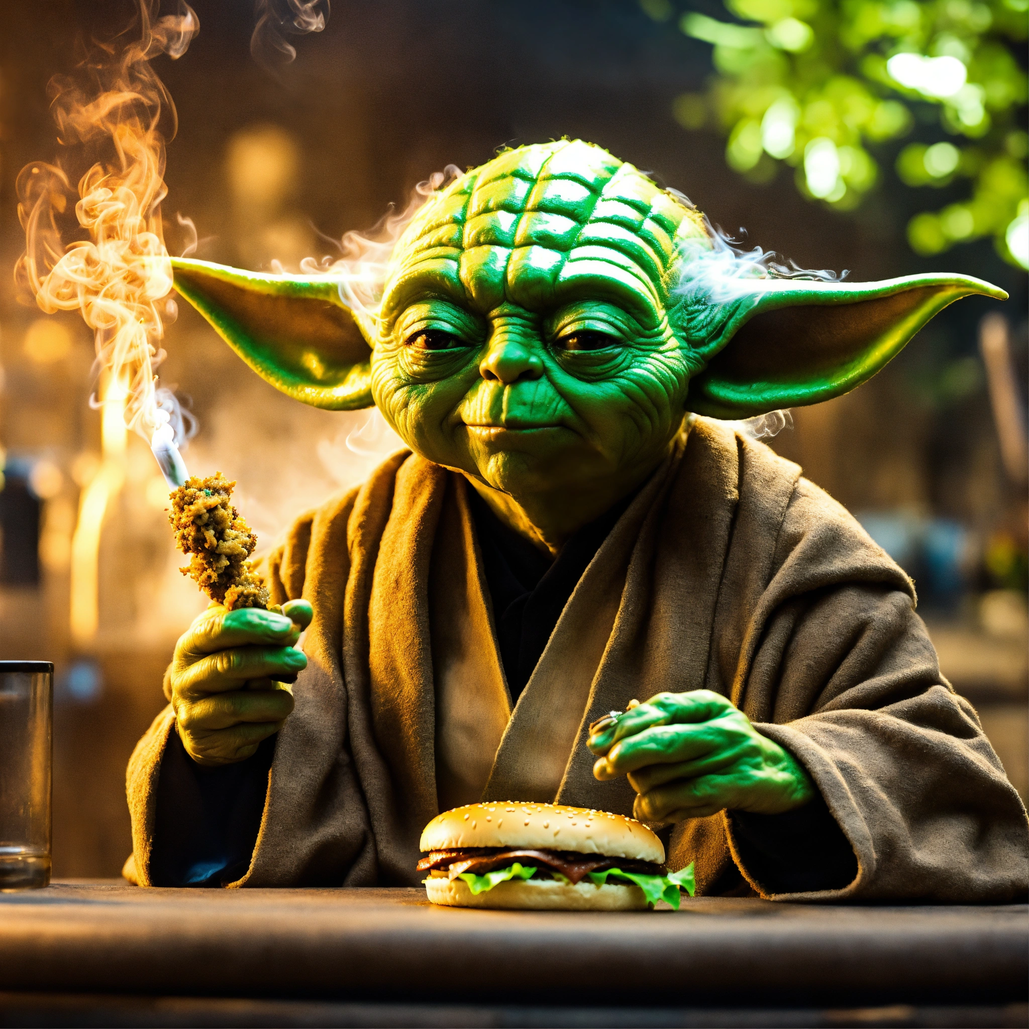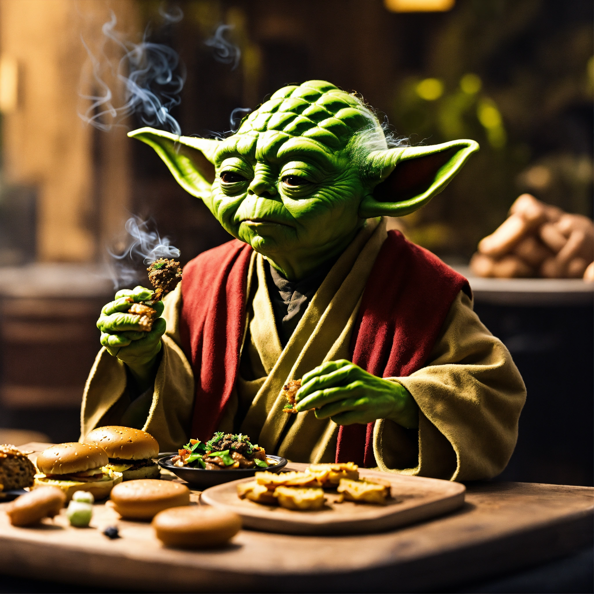 Magister yoda smokes a blunt with ganja and ready to eat a fine burger