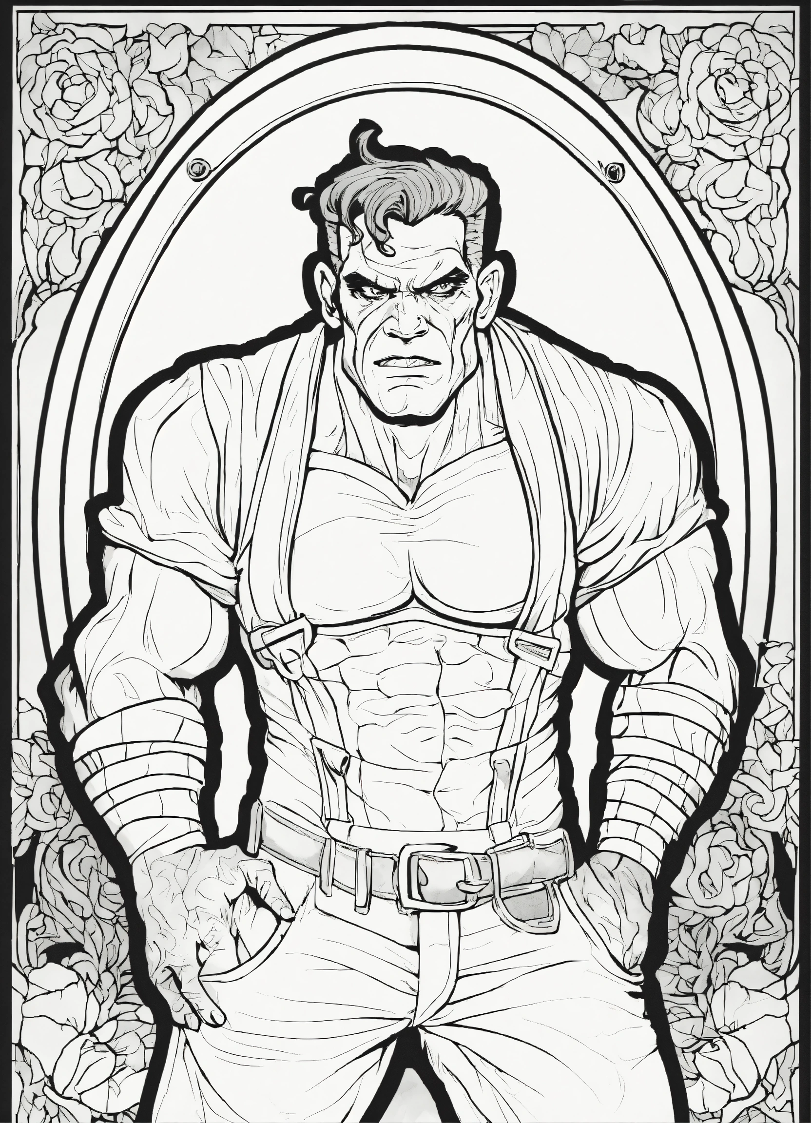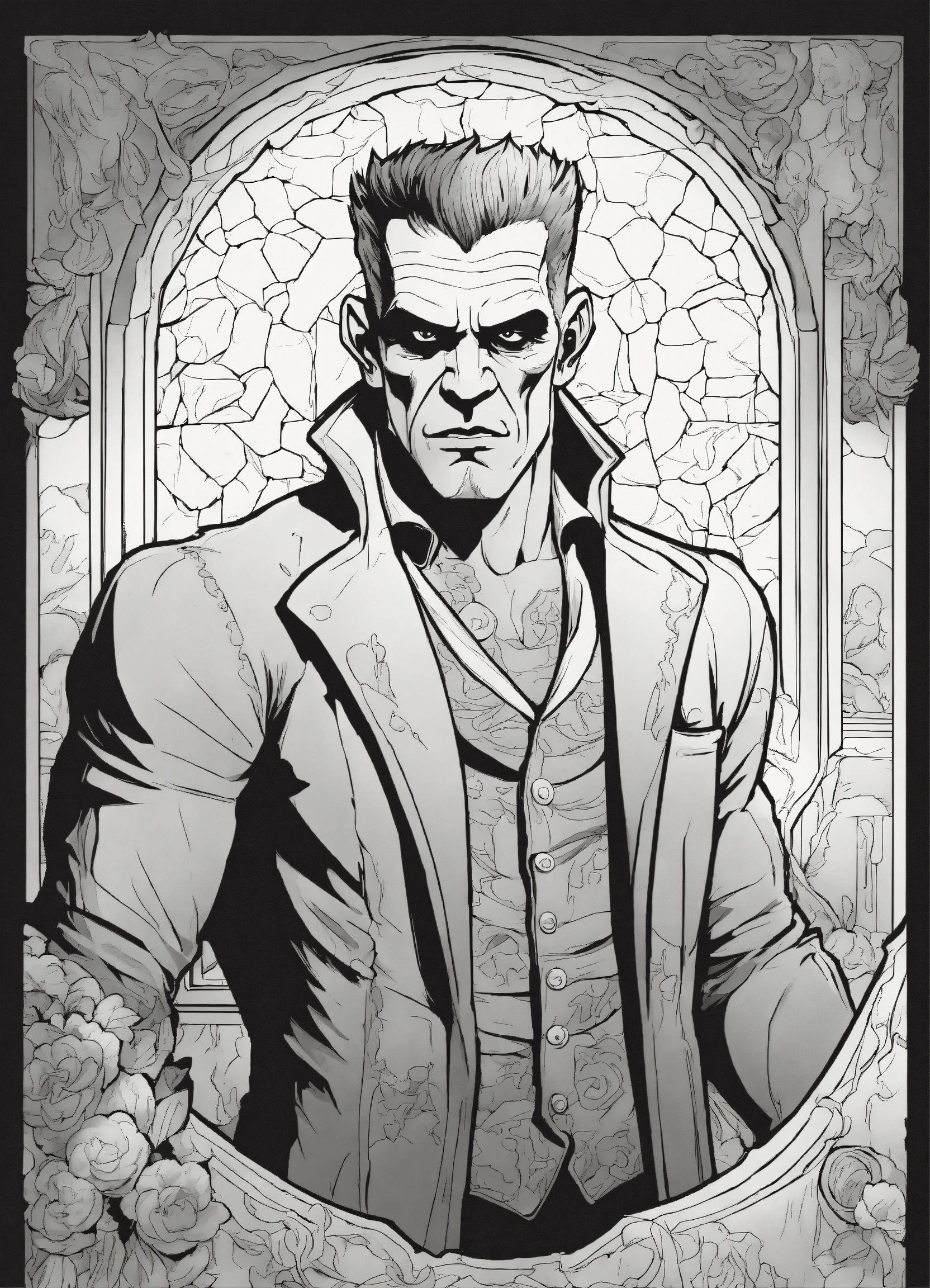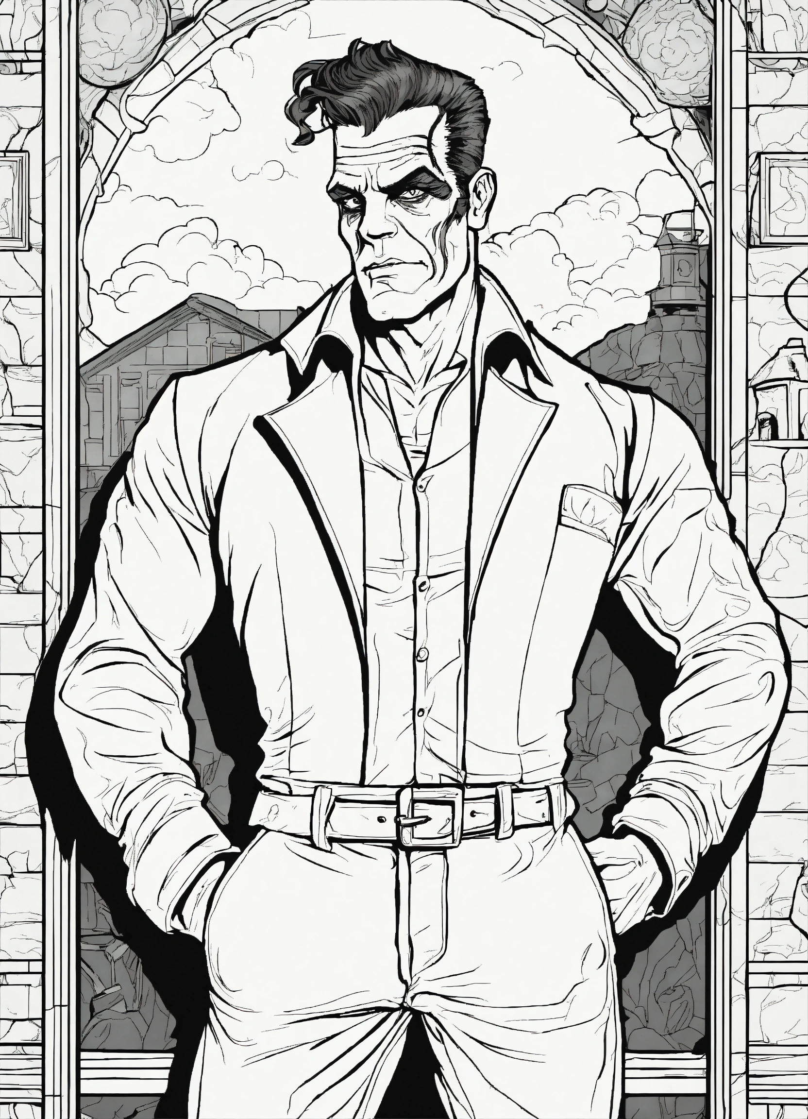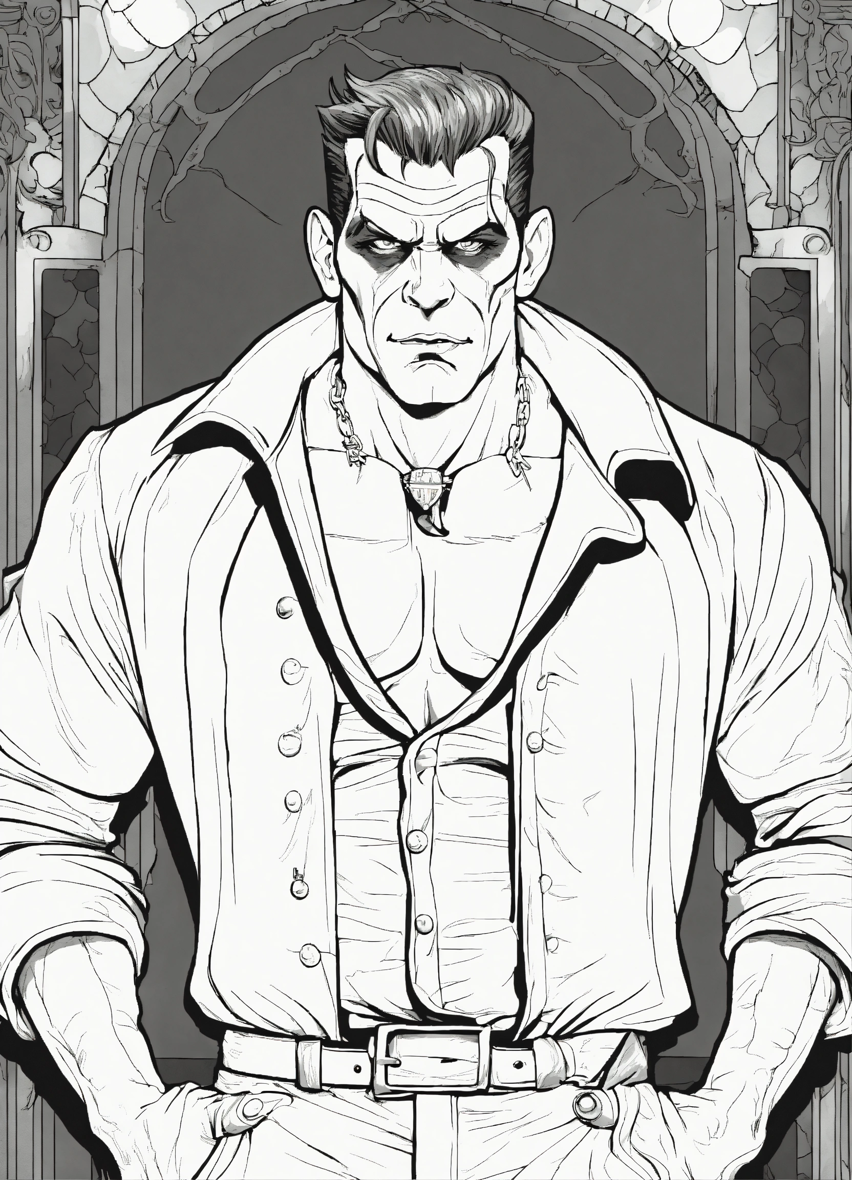 Adult coloring book page of a handsome frankenstein's monster pin-up, line art, black and white, vector art, full body