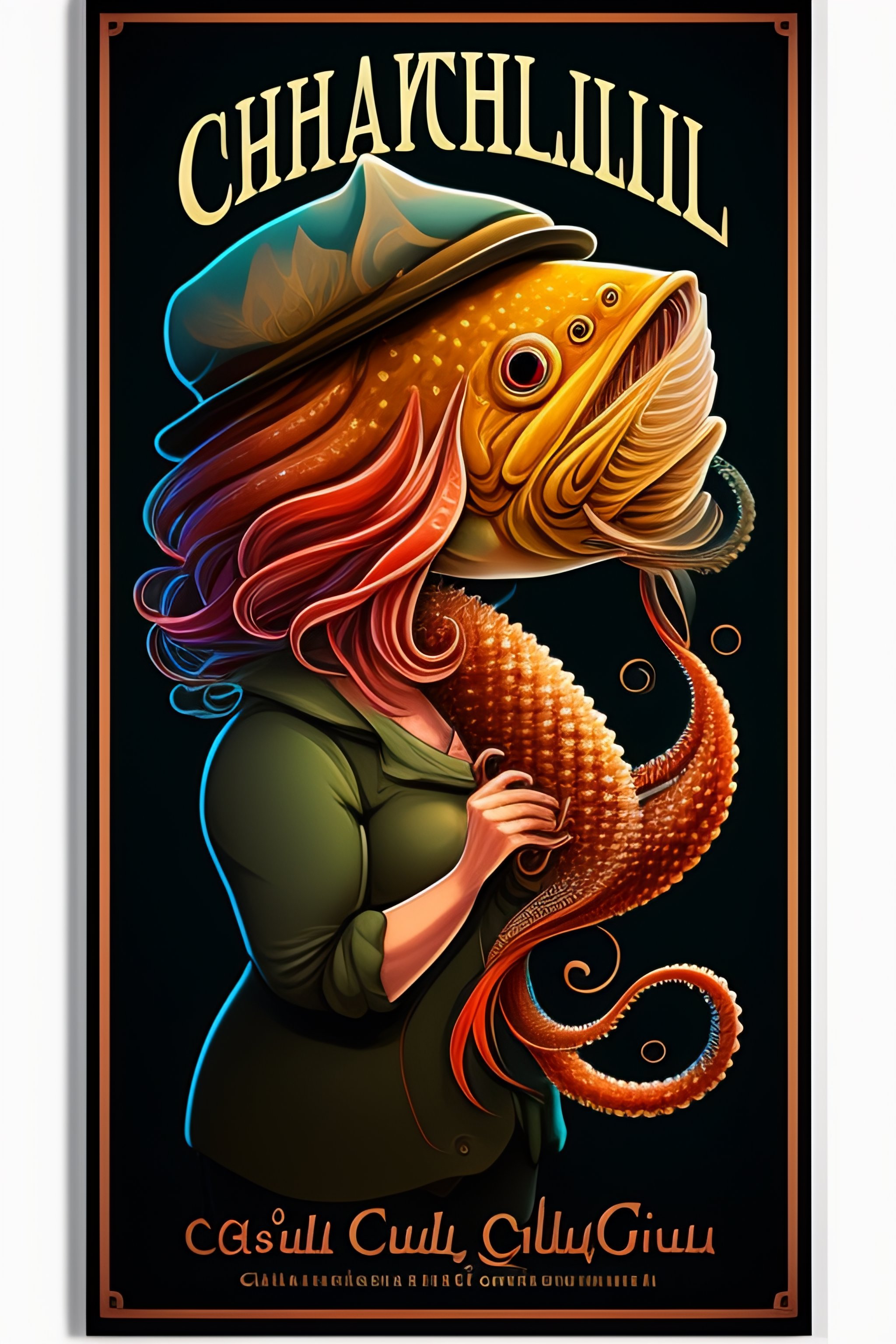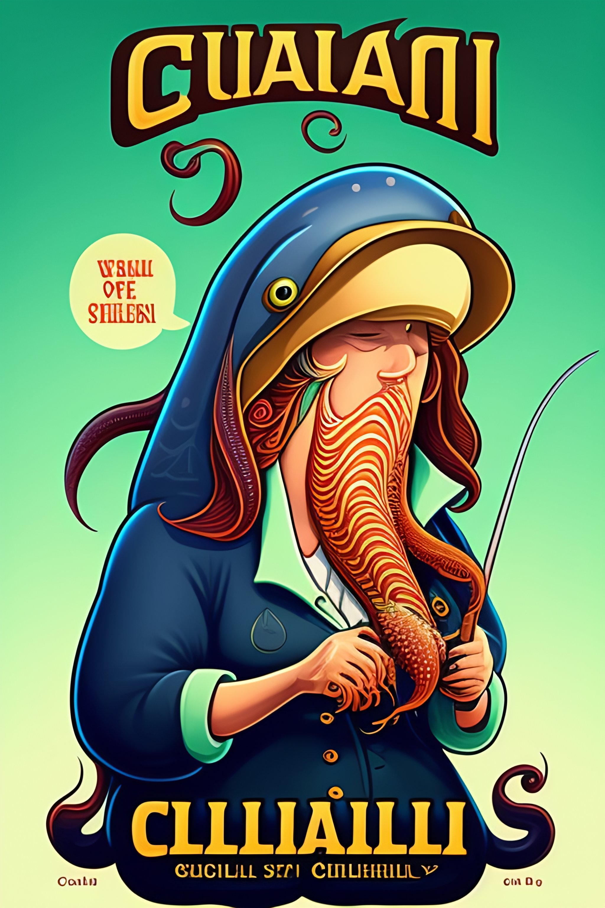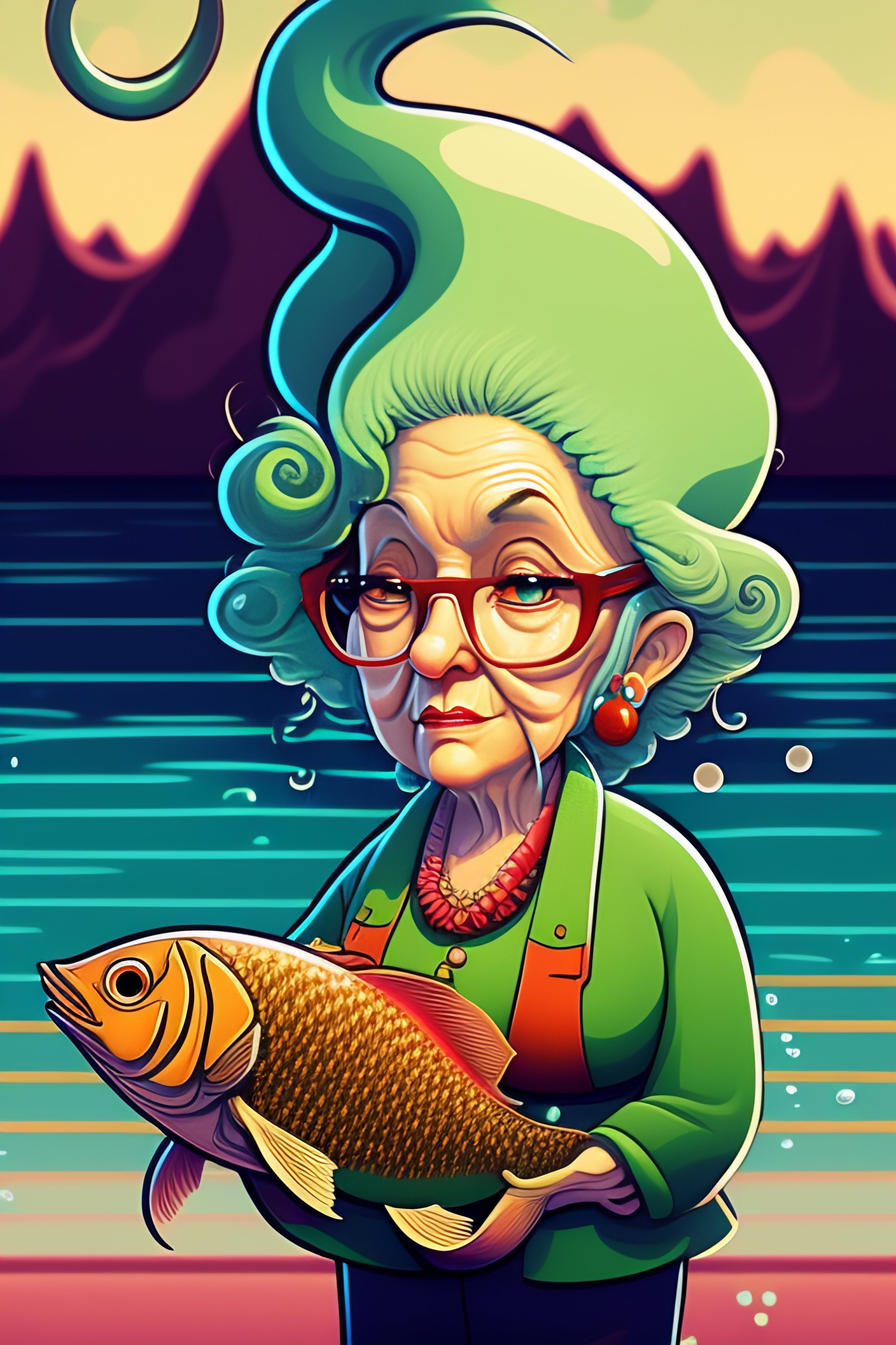 Cthulu squid grandma gutting a fish cartoon style