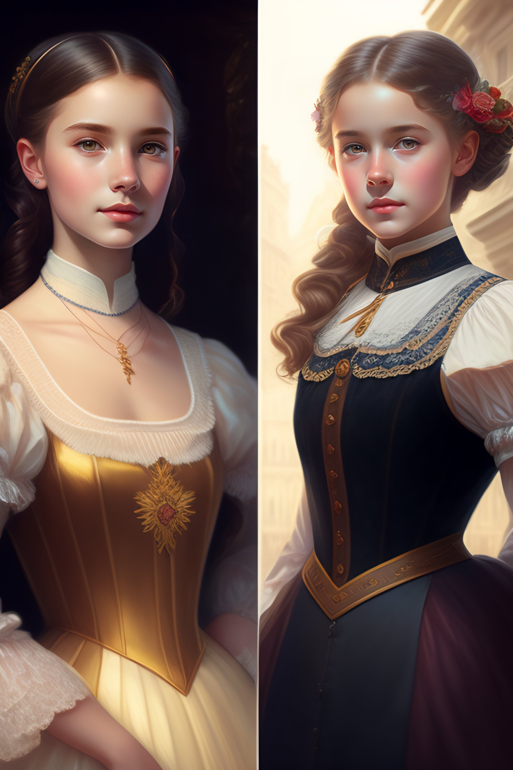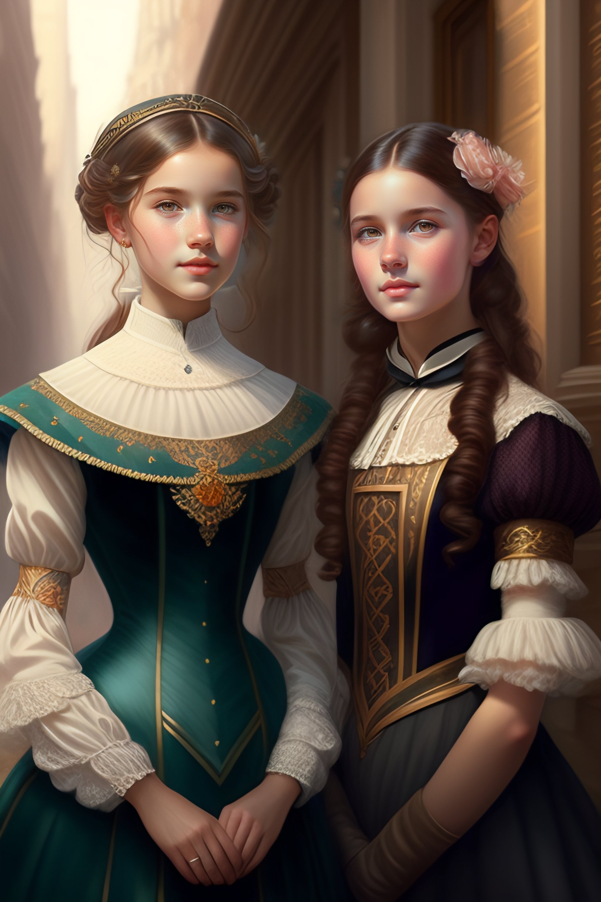 Portrait of two beautiful young girls, victorian dress, victorian city london, photorealism. highly detailed, digital painting, artstation, concept art, smooth, sharp focus, illustration, art by artgerm and greg rutkowski and alphonse mucha and loish and wlop