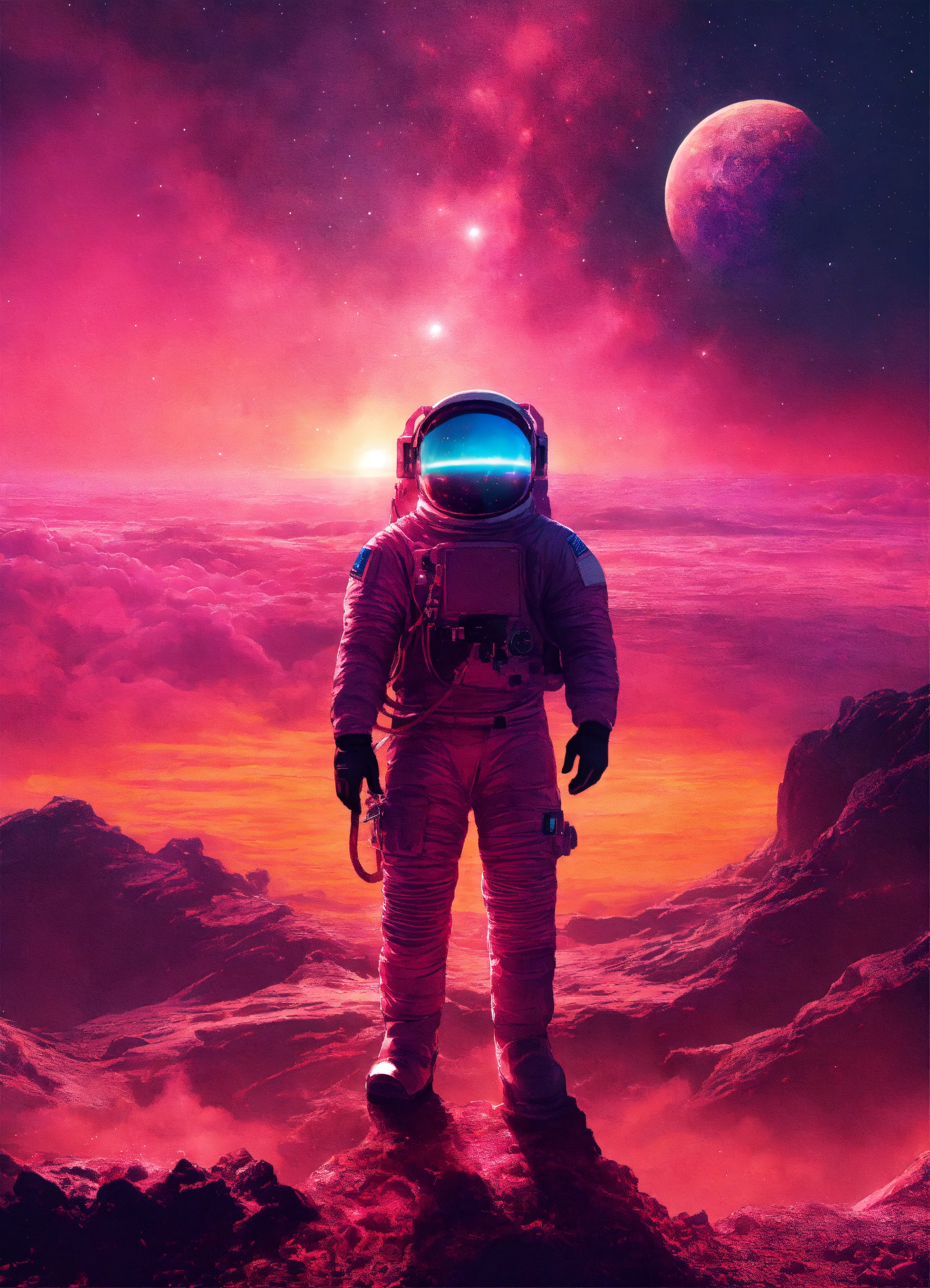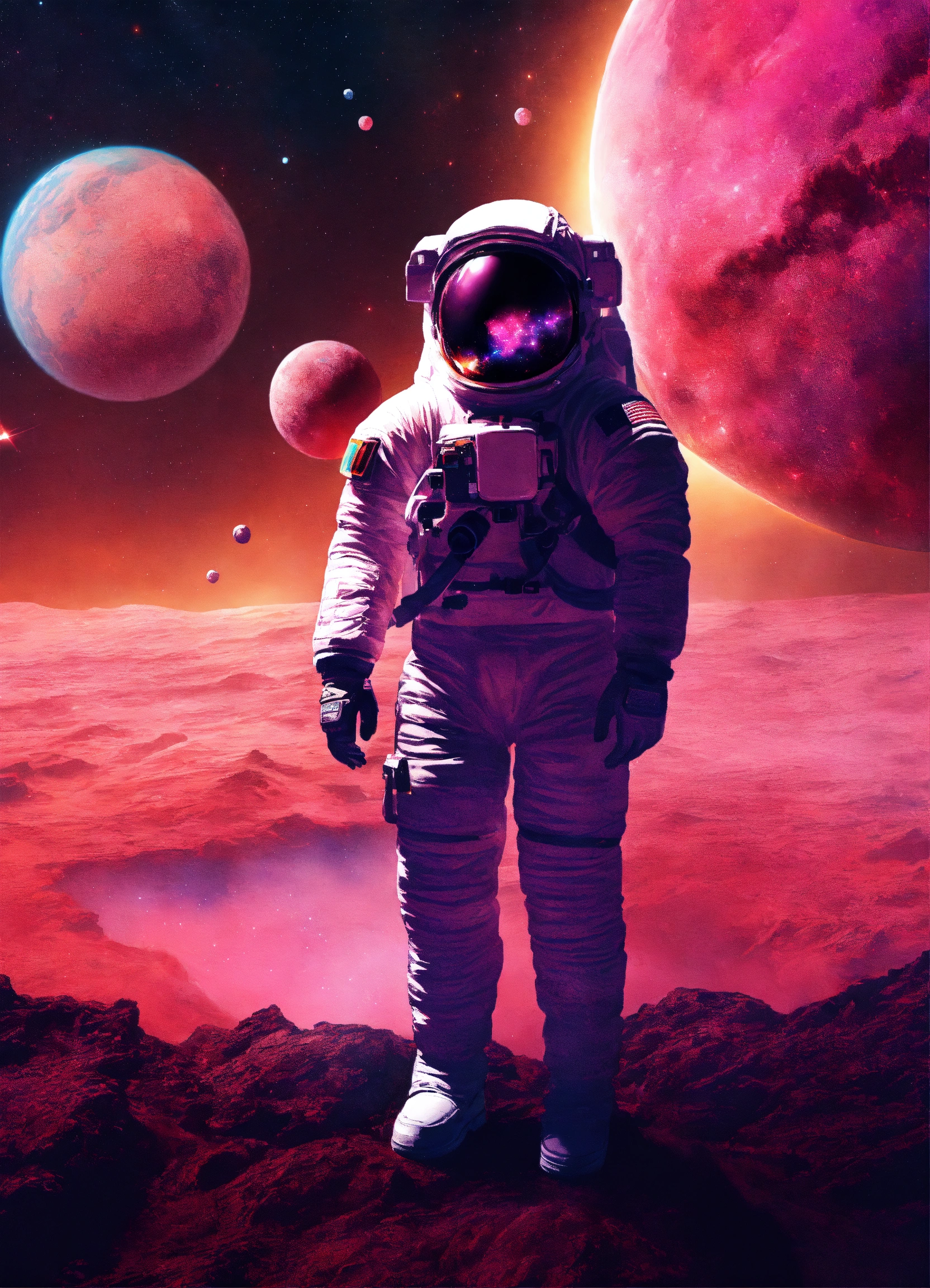A digital art of galaxy containing enigmatic substance in sunset pink astronaut