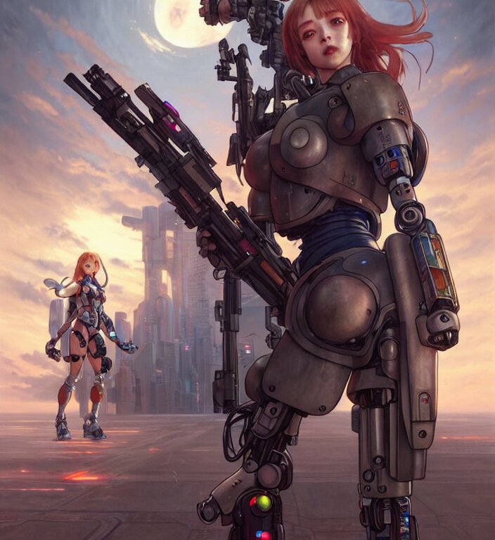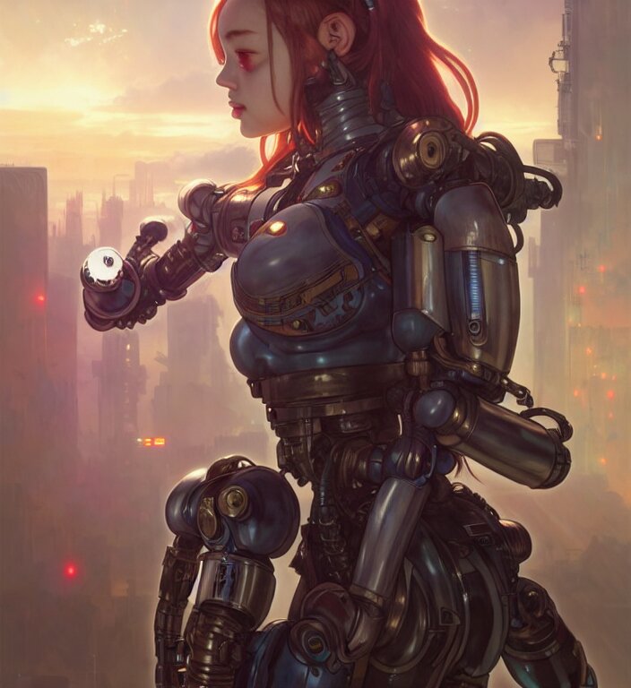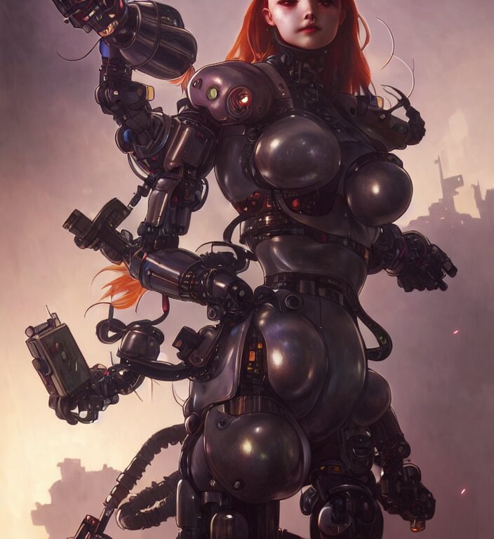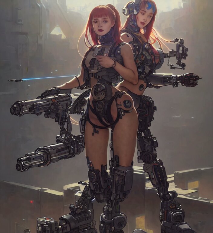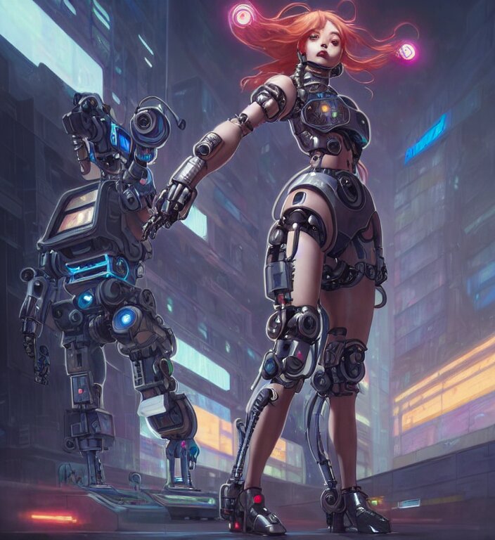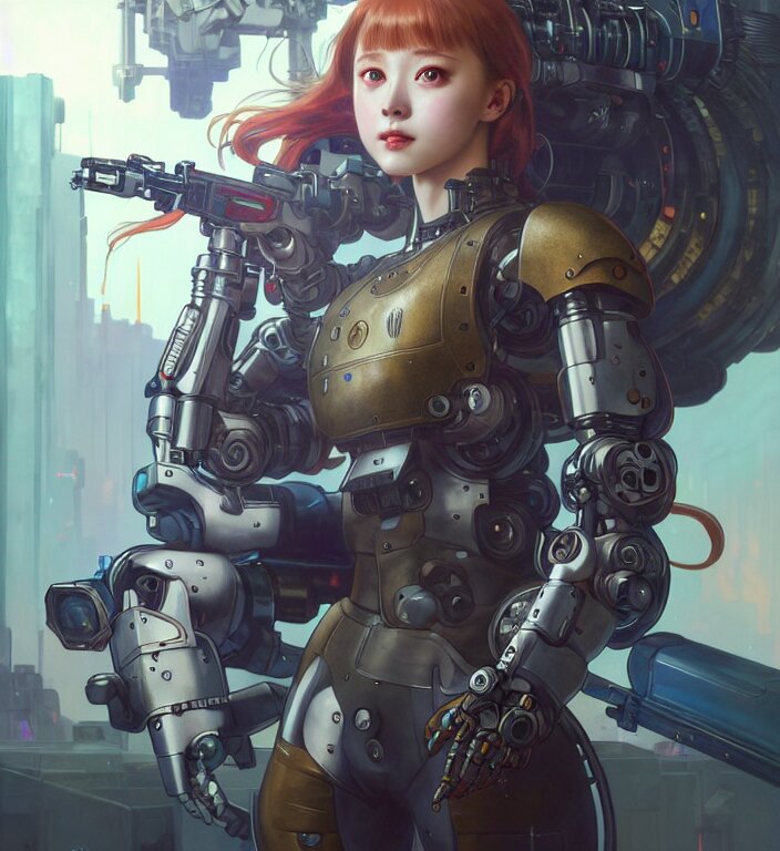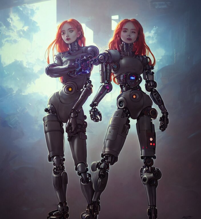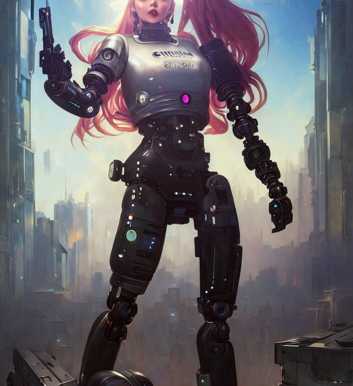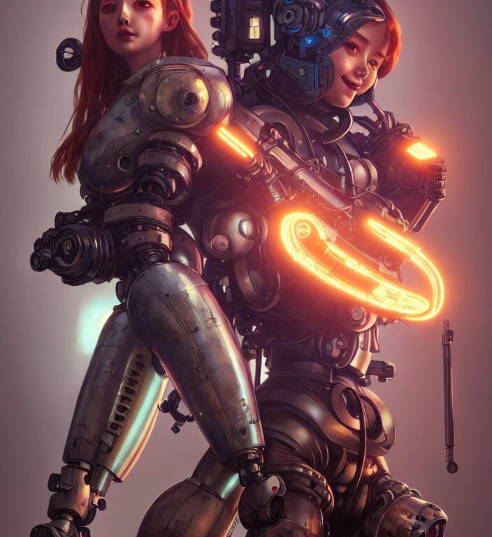 Full body painting of chuu loona cyberpunk mercenary smiling and fighting a robot, ultra realistic, concept art, intricate details, eerie, highly detailed, photorealistic, octane render, 8 k, unreal engine. art by artgerm and greg rutkowski and magali villeneuve and alphonse mucha