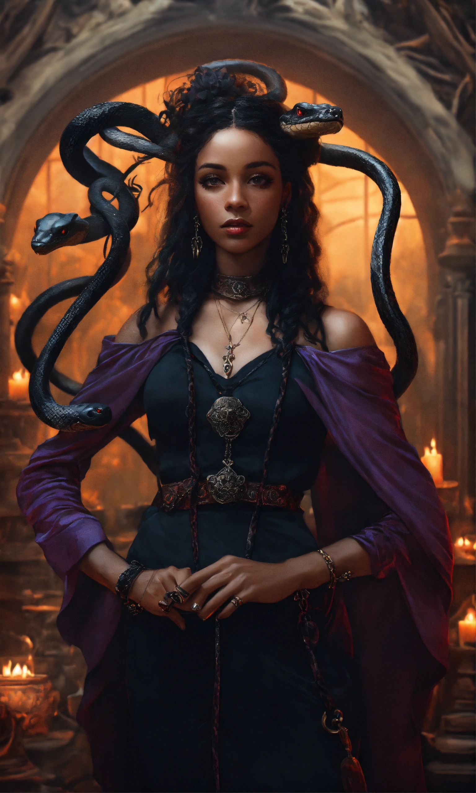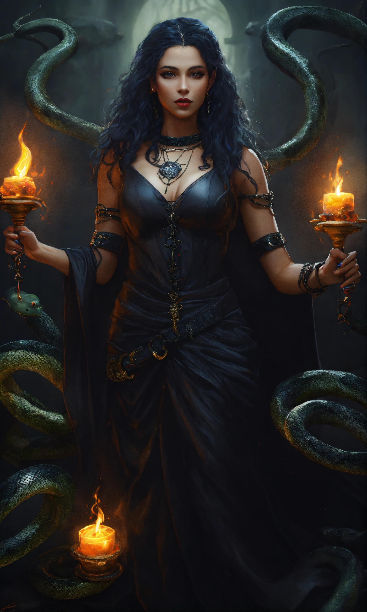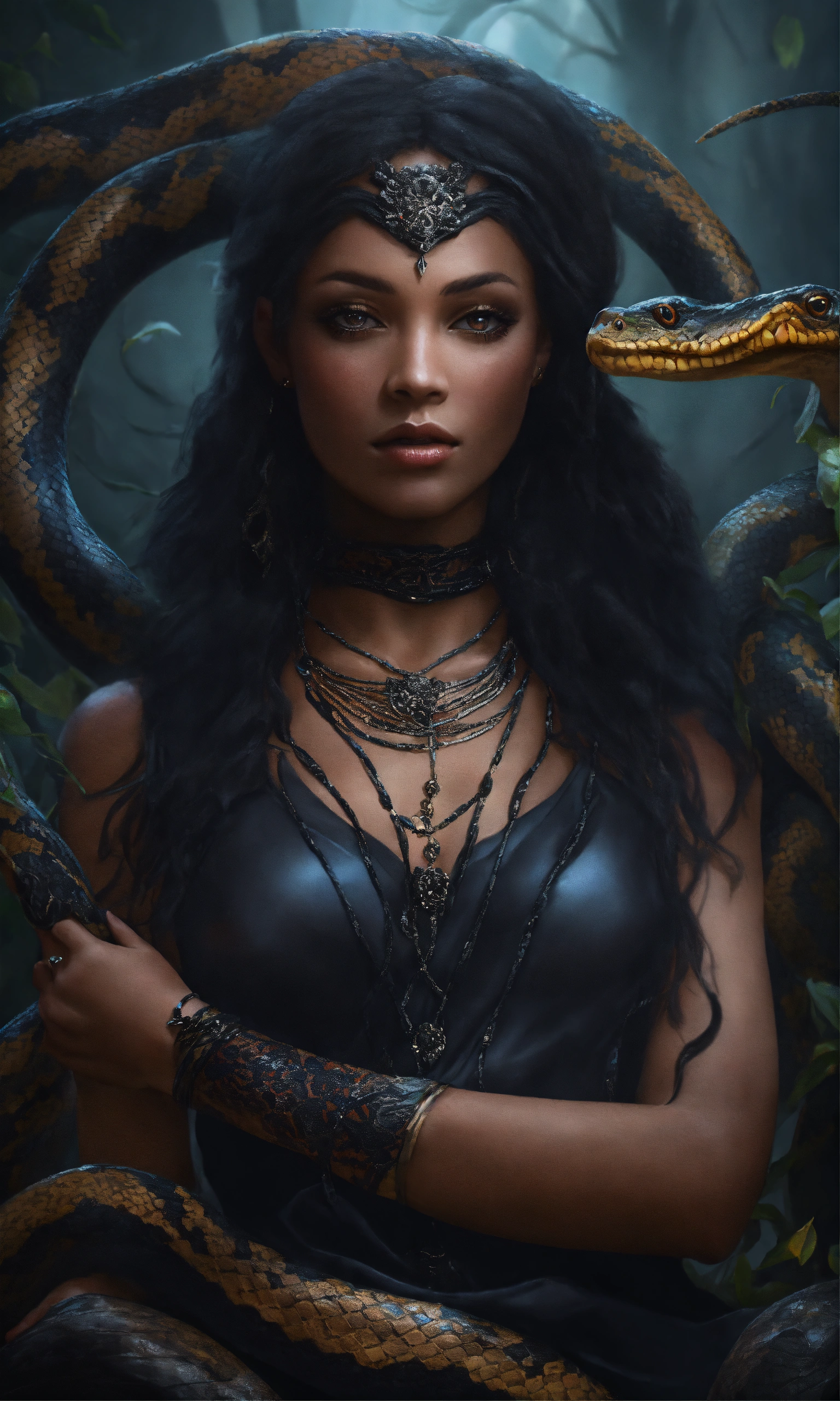 Realistic female dark witch showing blacks snakes surrounding her arm