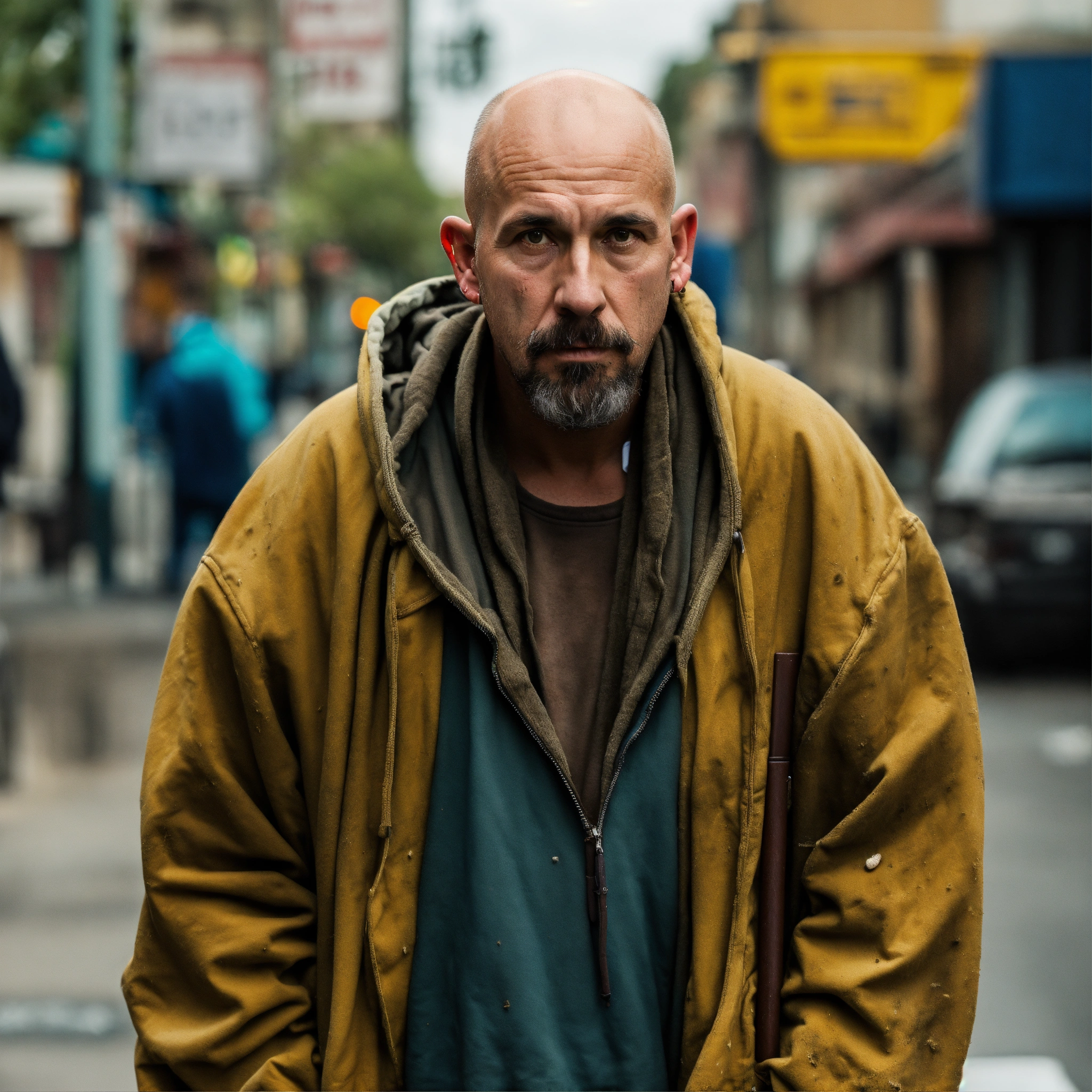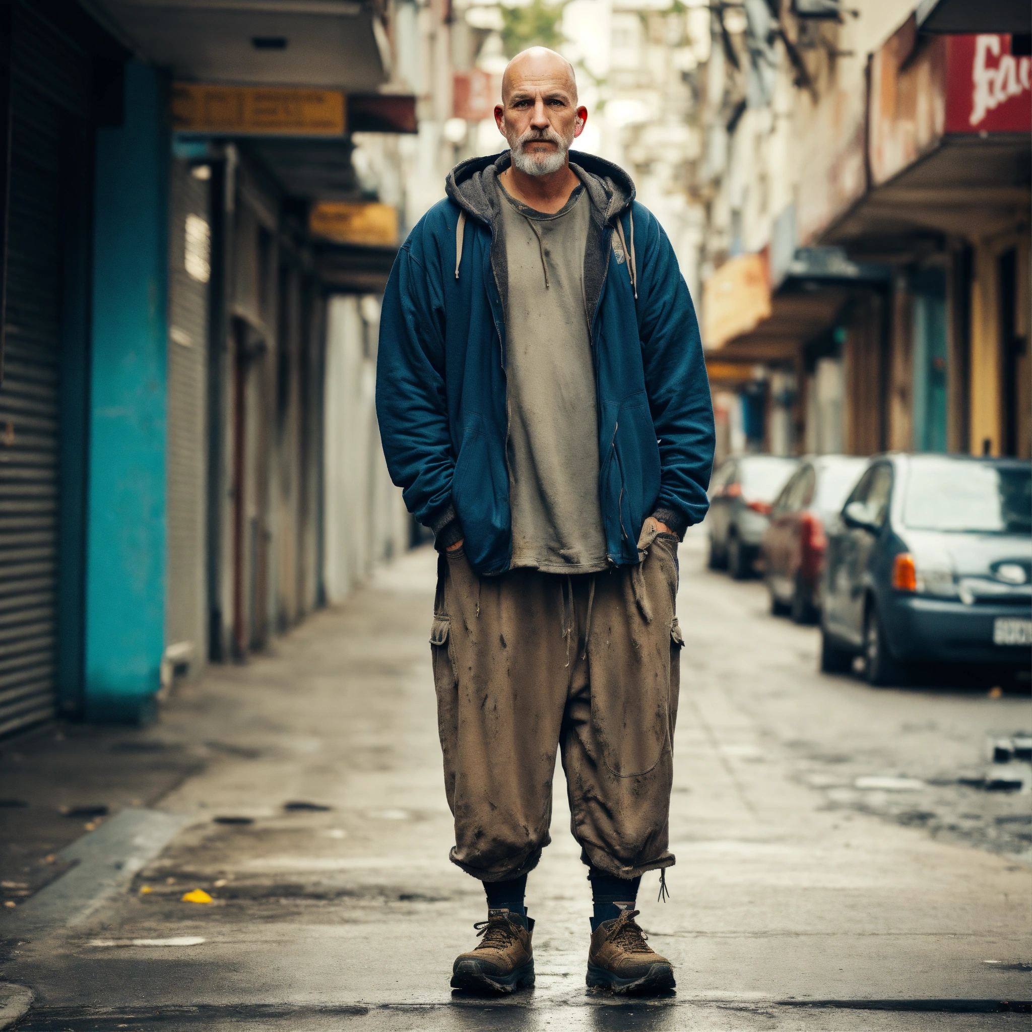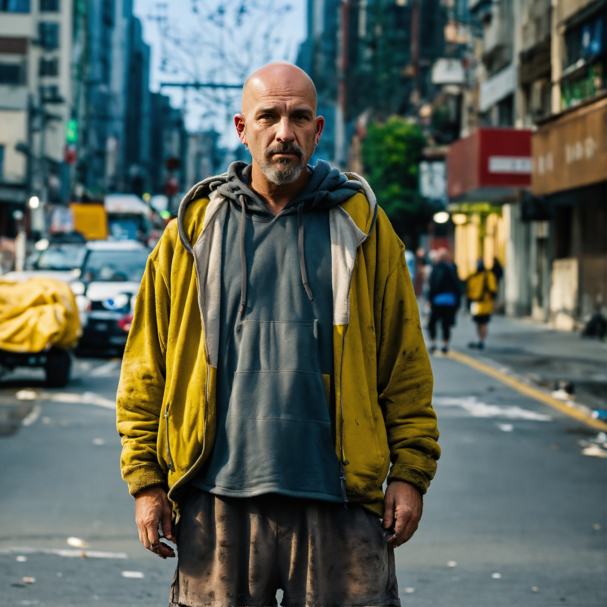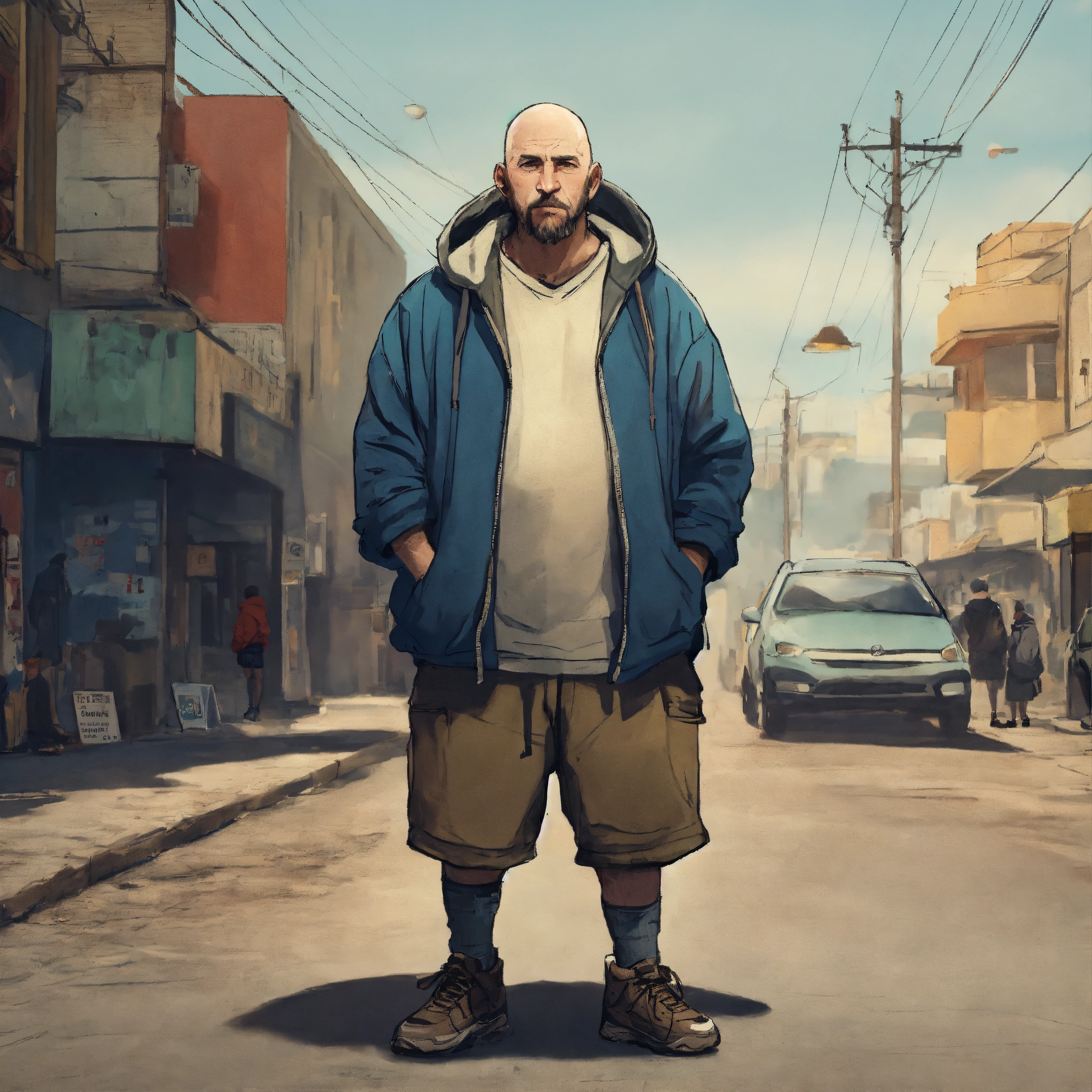 A huge bald homeless man, small goatee, large ears, wearing dirty shorts and a hoodie, standing in the street
