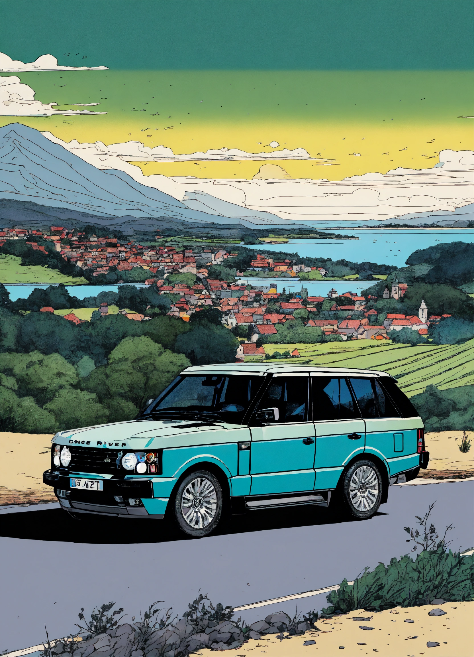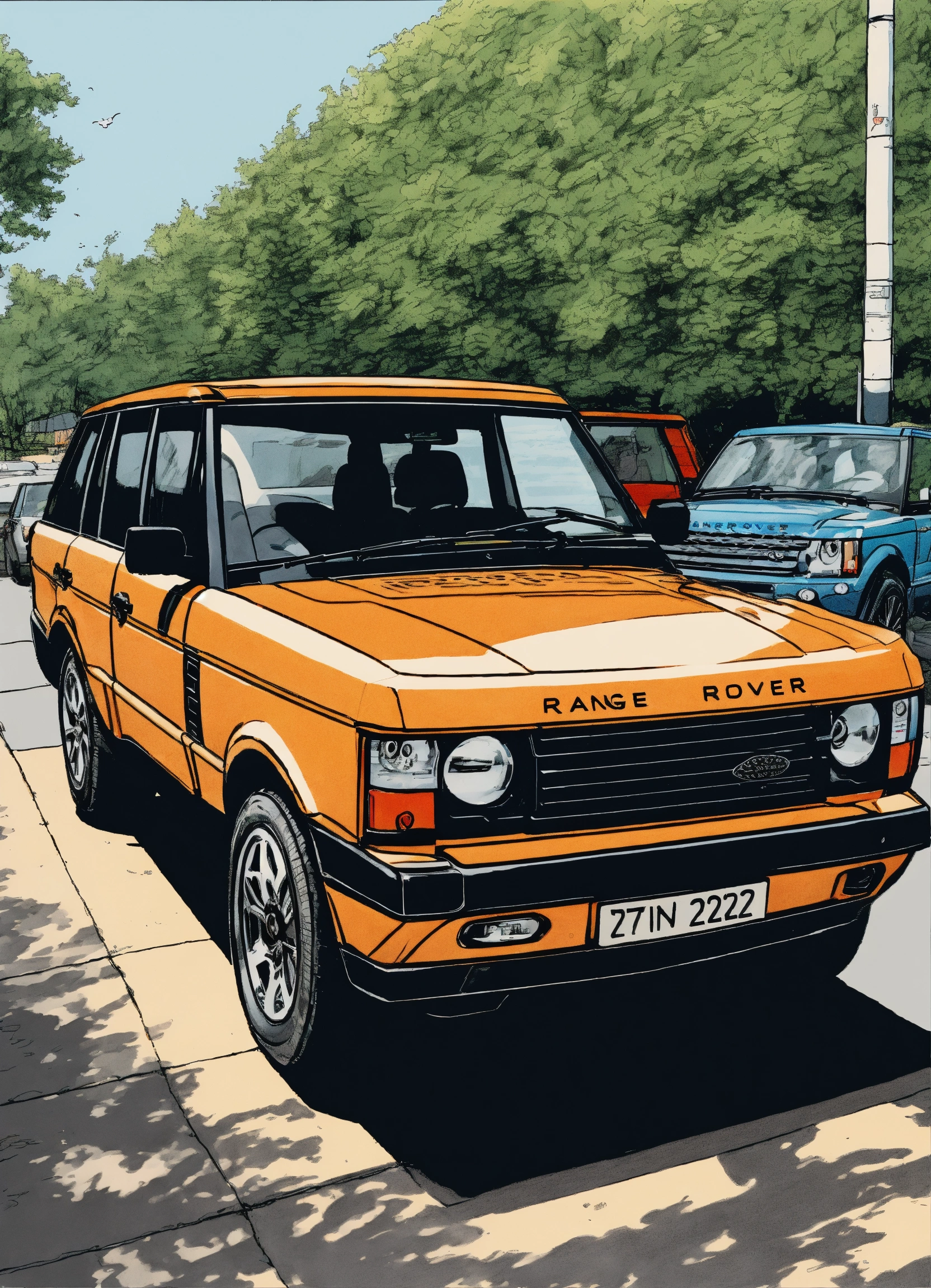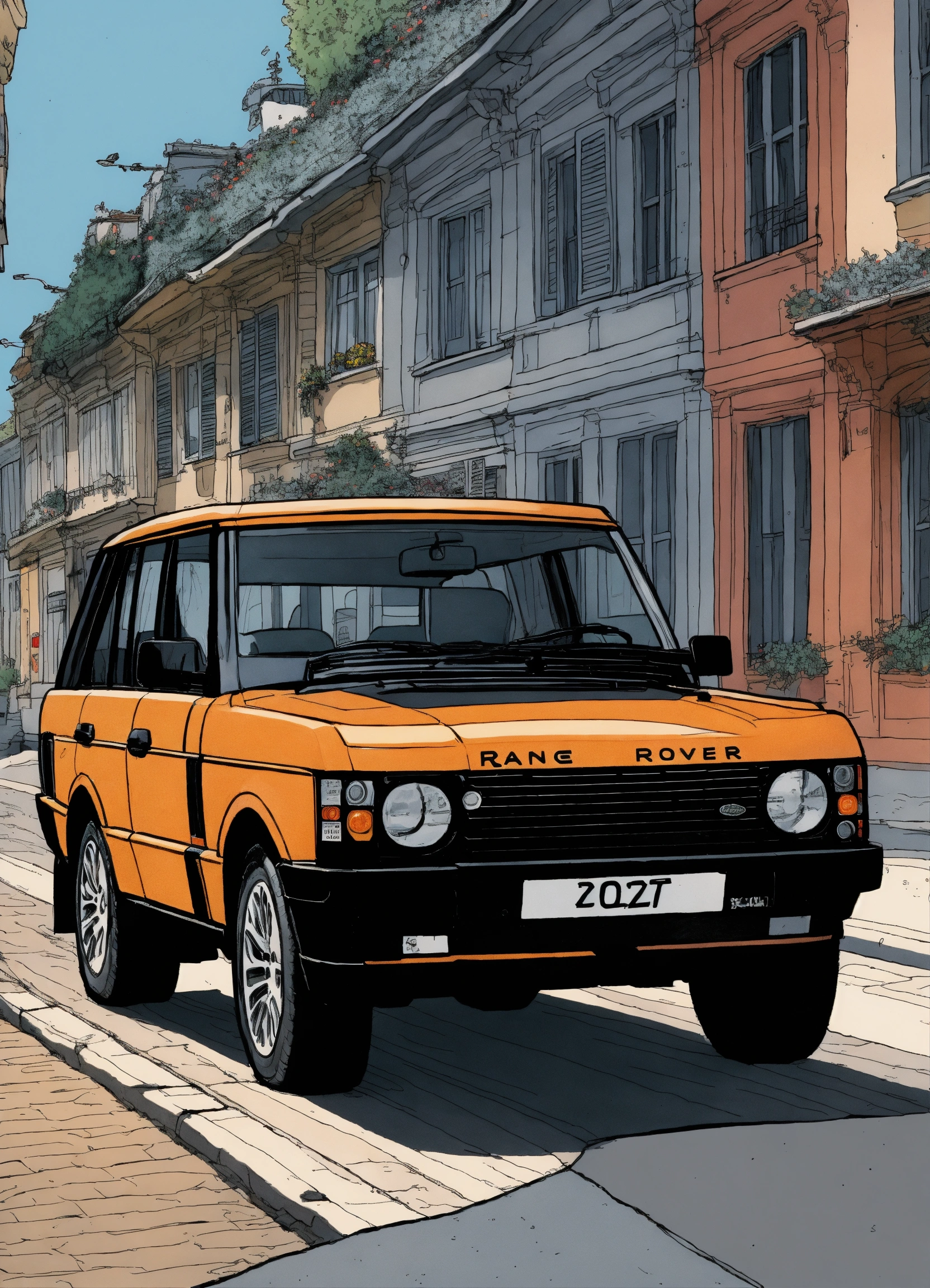 Detailed pen and ink illustration of range rover sport 2022, dark color of the car, by herge, in the style of tin-tin comics, colorful, detailed, high quality, minimalism, aesthetic