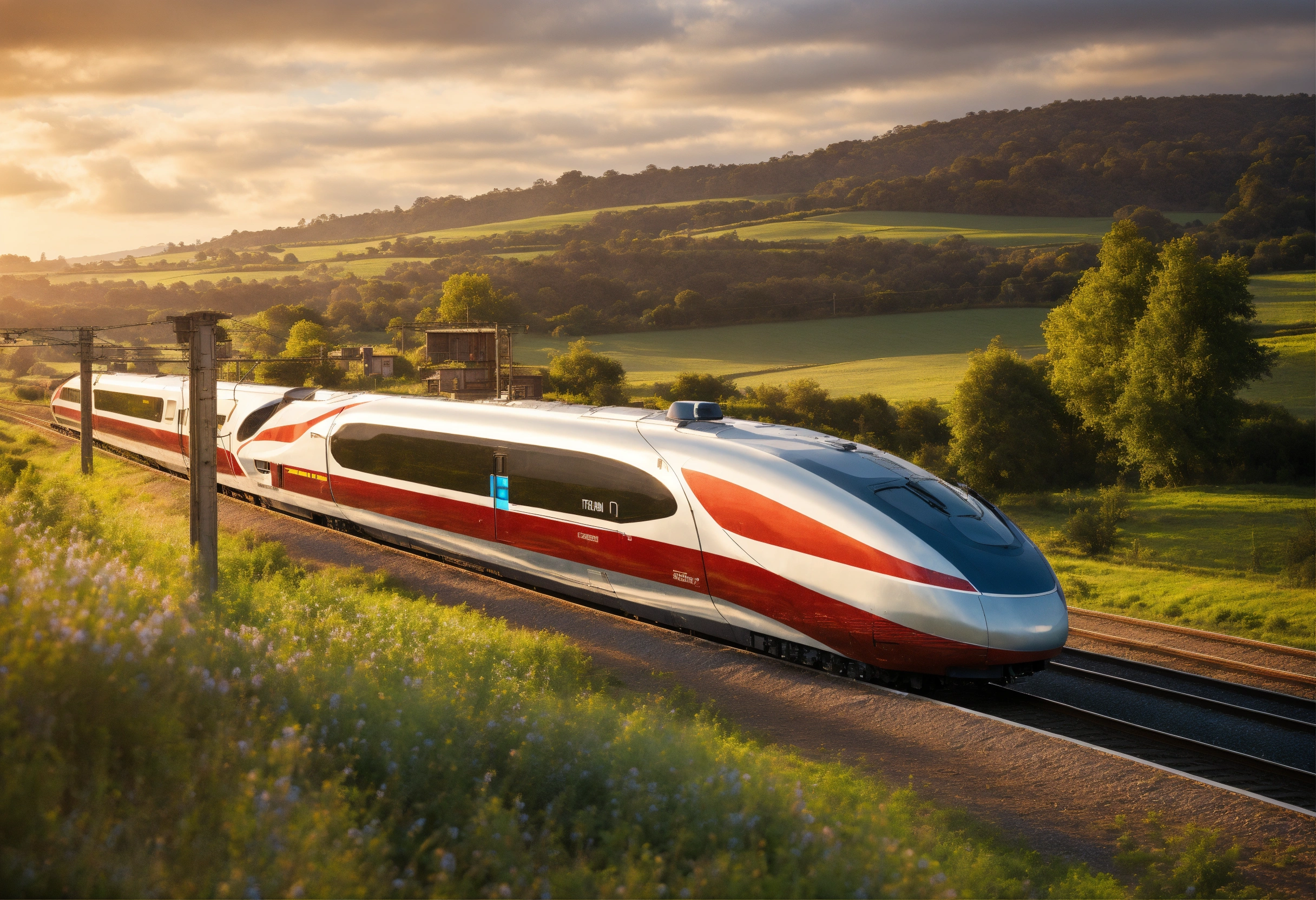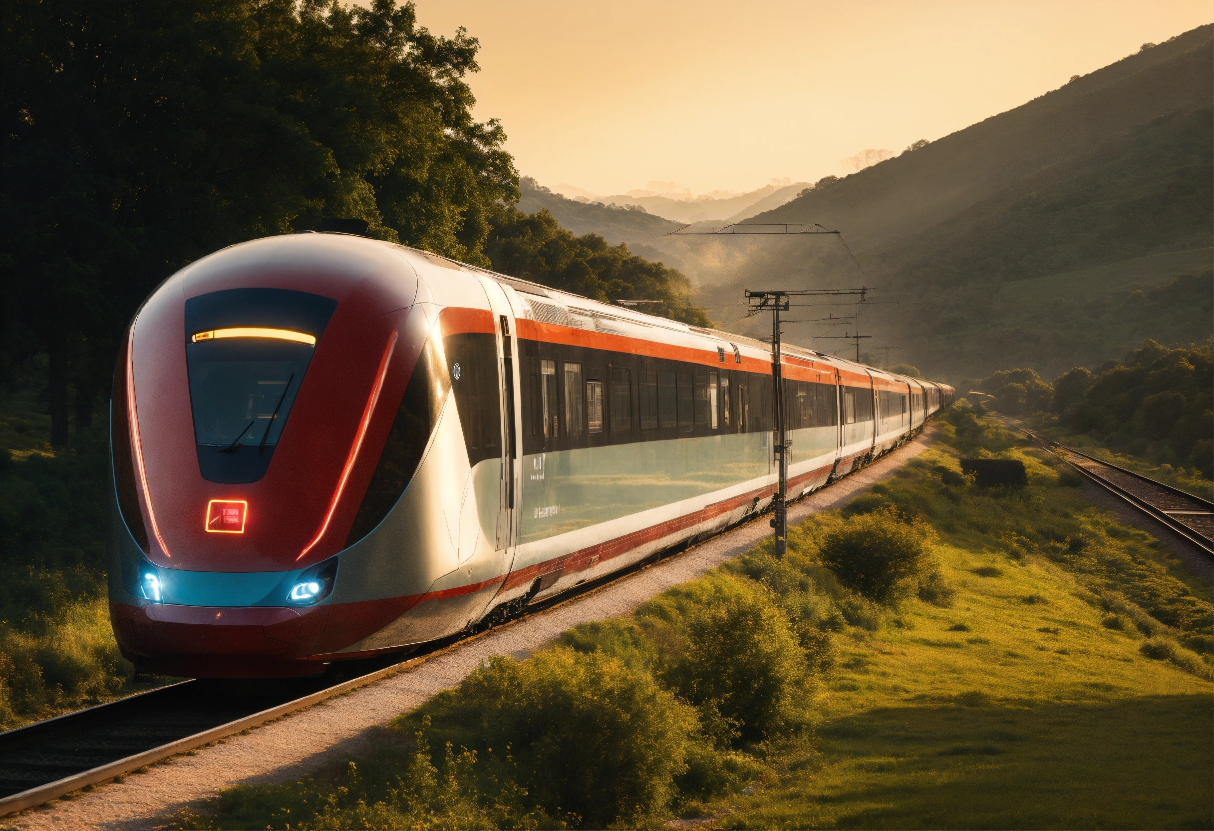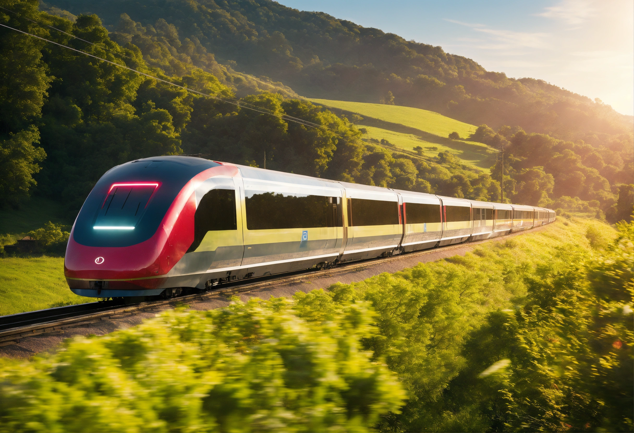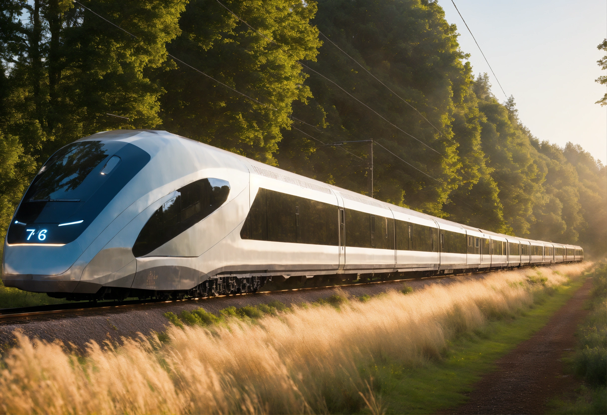 Train of the future running through the countryside in the morning