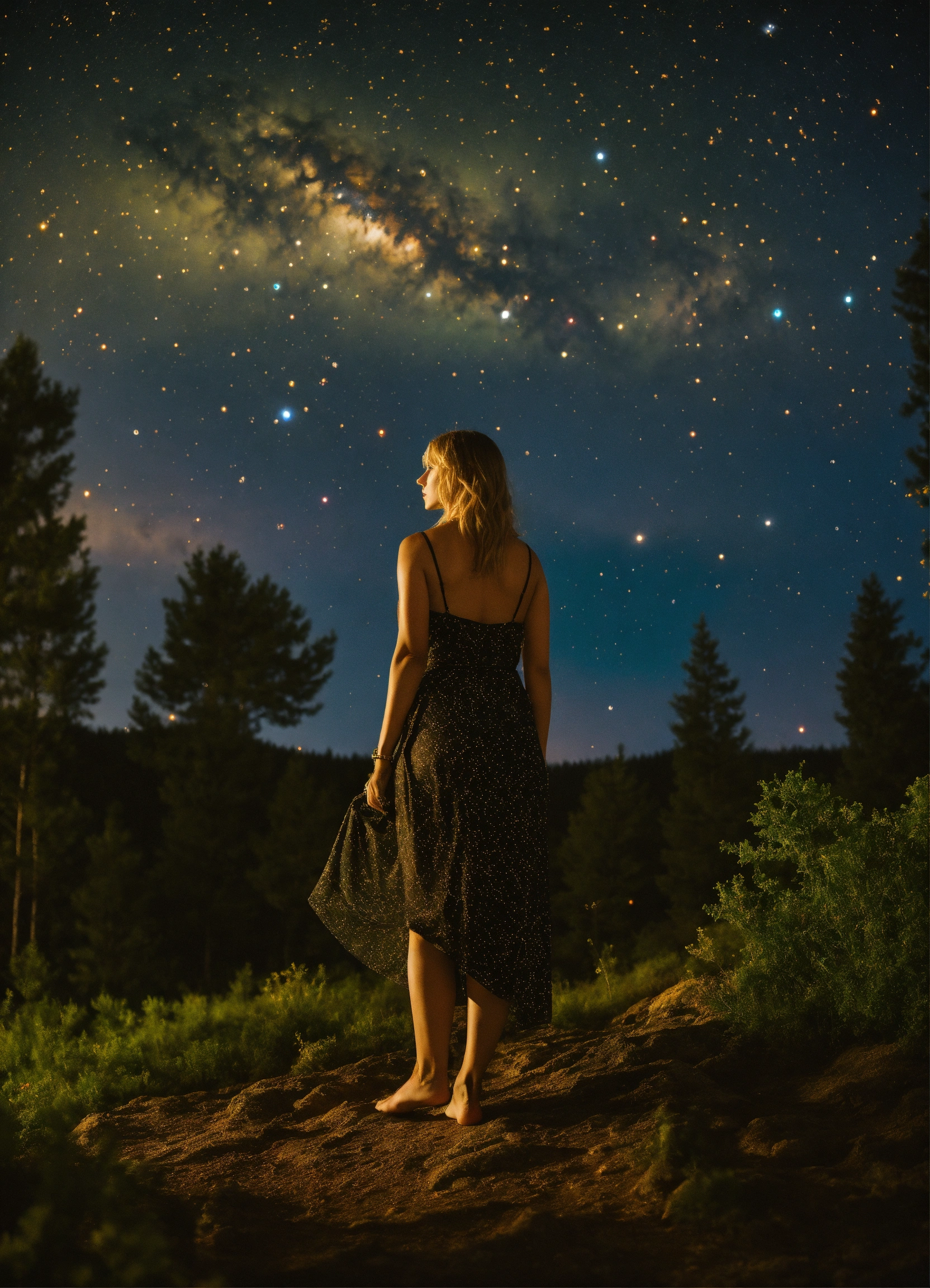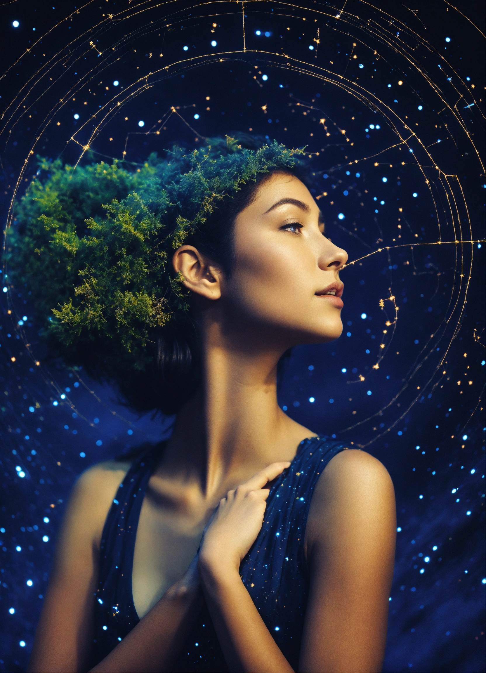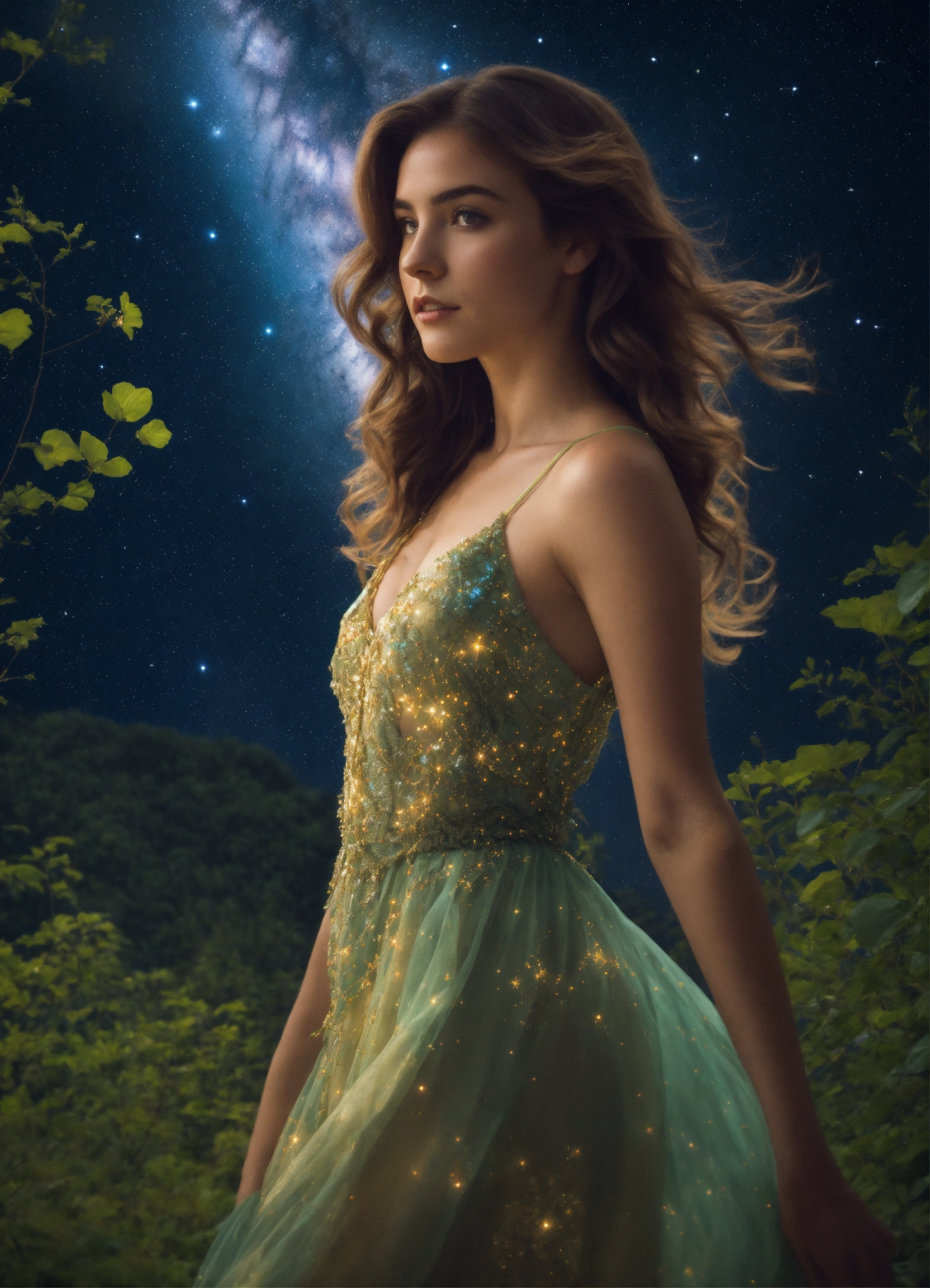Portrait ultra réaliste d'une exploratrice astrologue se tenant face a nous incarnés d'un film d'aventure photographié au plan moyen qui invoque une constellation debout au millieu d'une clairière dans la forêt entourée de beaucoup de végétations en pleine nuit sous un ciel sombre et très étoilé avec des constellations une très belle jeune femme nous regarde avec détermination son corps est musclé avec une très belle silhouette est est vêtue d'une tenue d'exploratrice verte kaki au décolleté plongeant ses cheveux sont châtain foncée et un peu ondulée