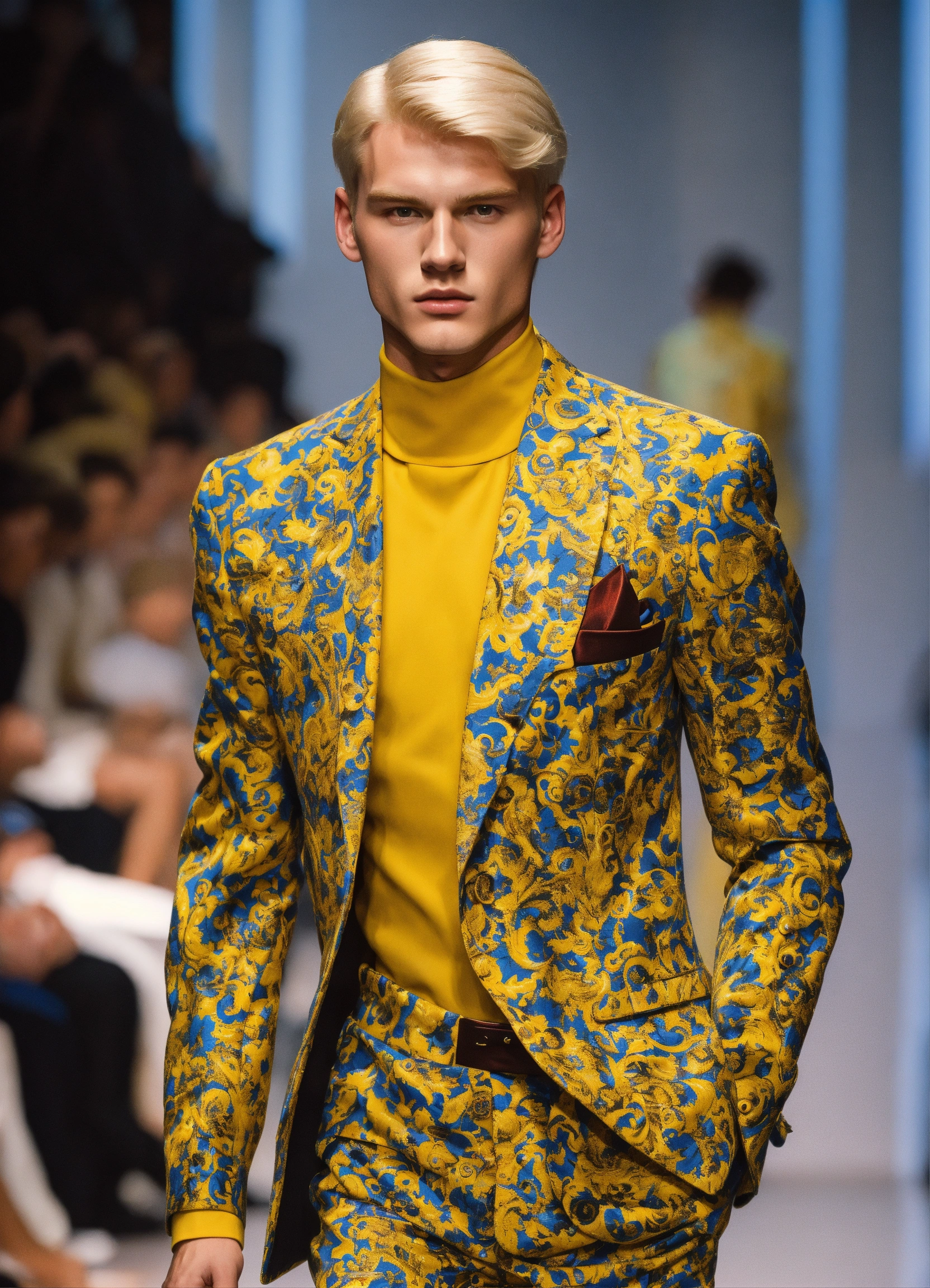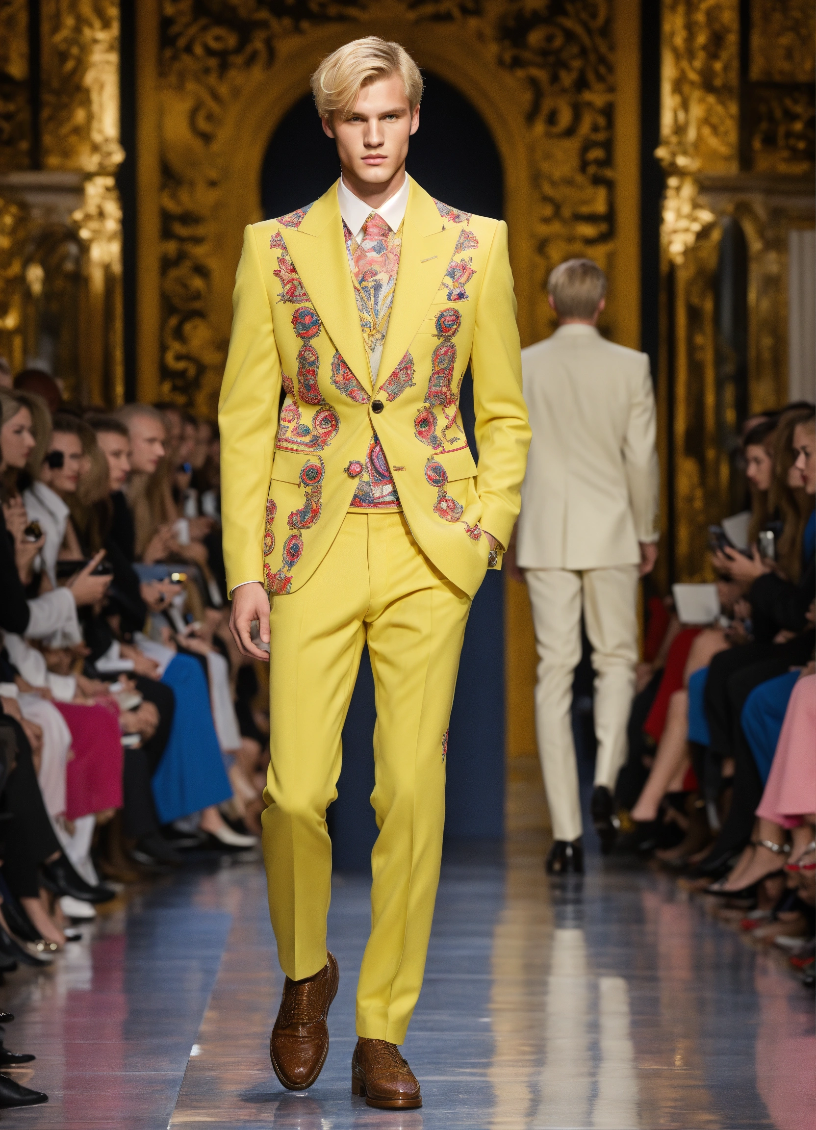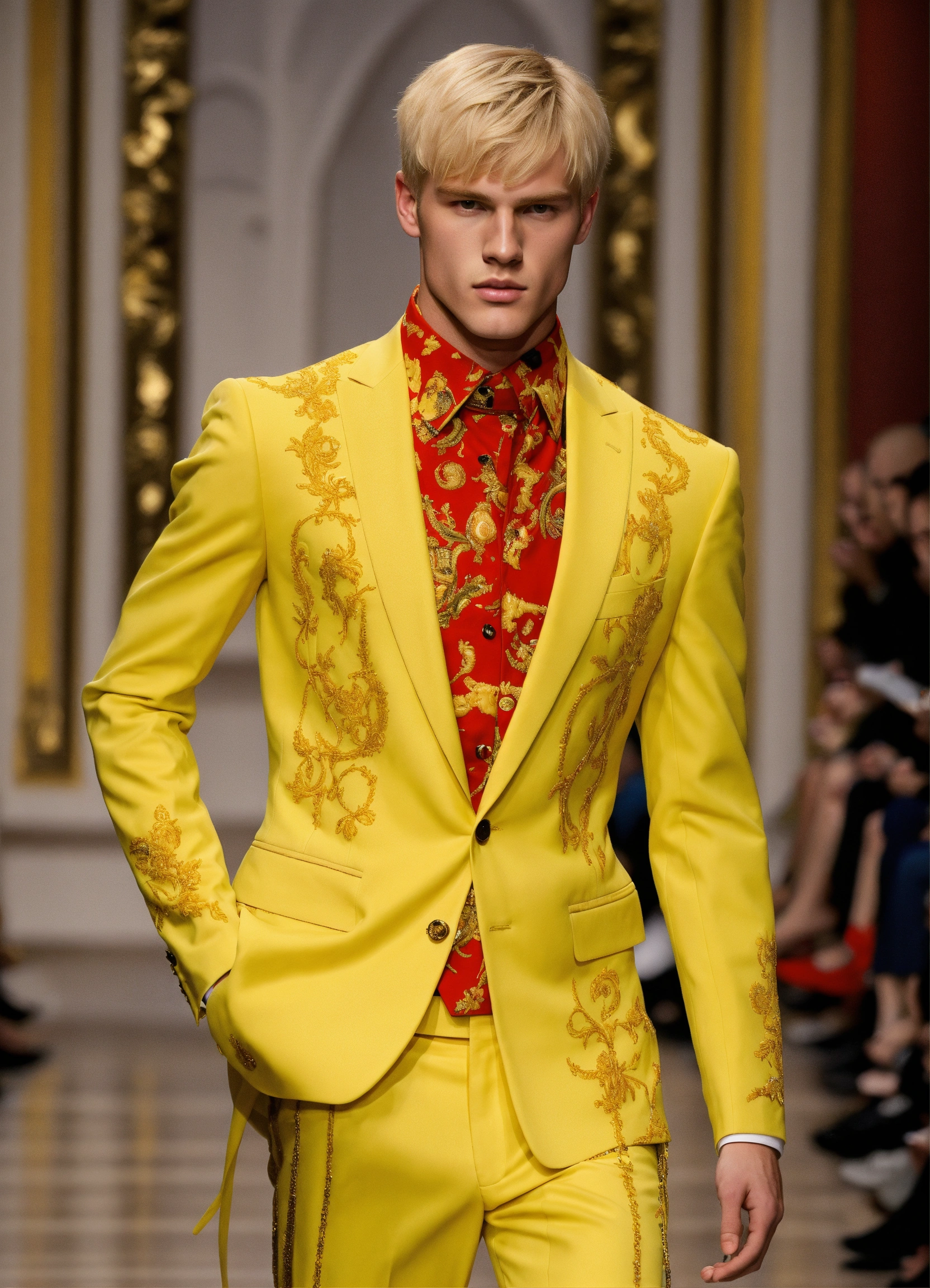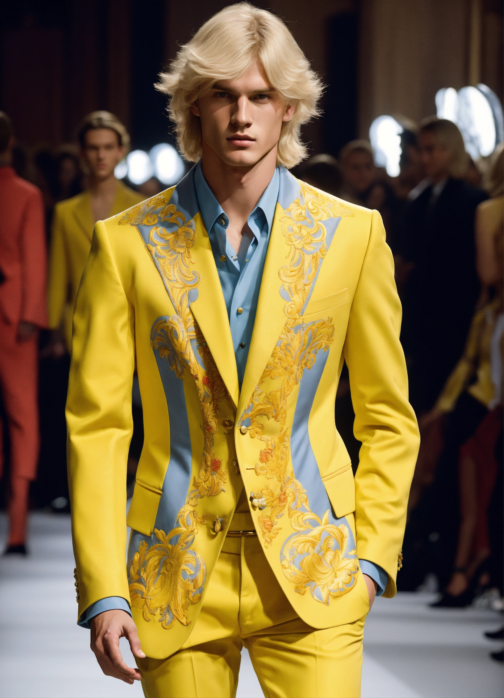 A full-body portrait of a pale blonde young man male fashion model with gianni versace style suit on the catwalk