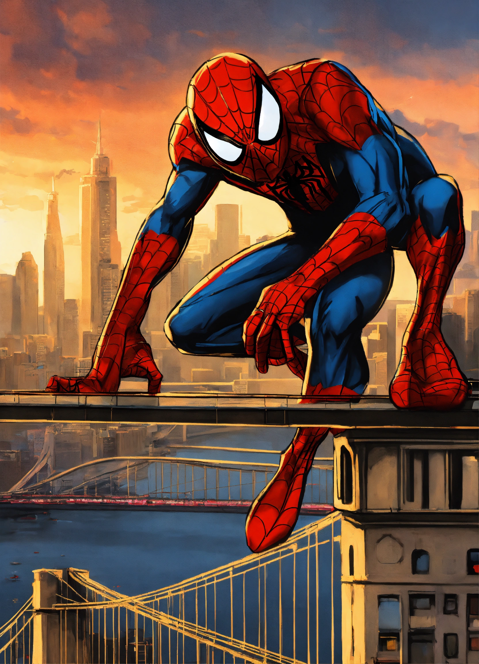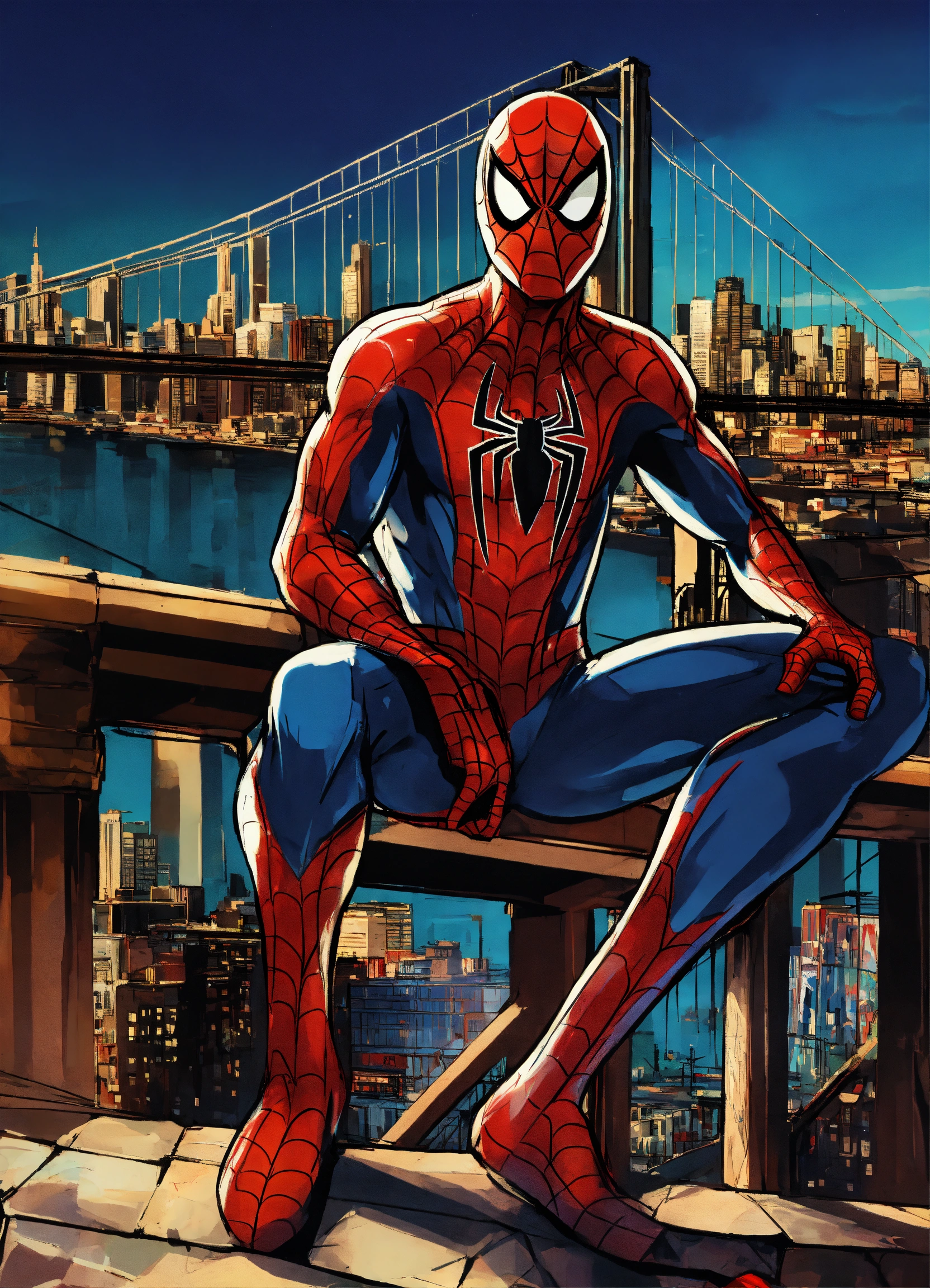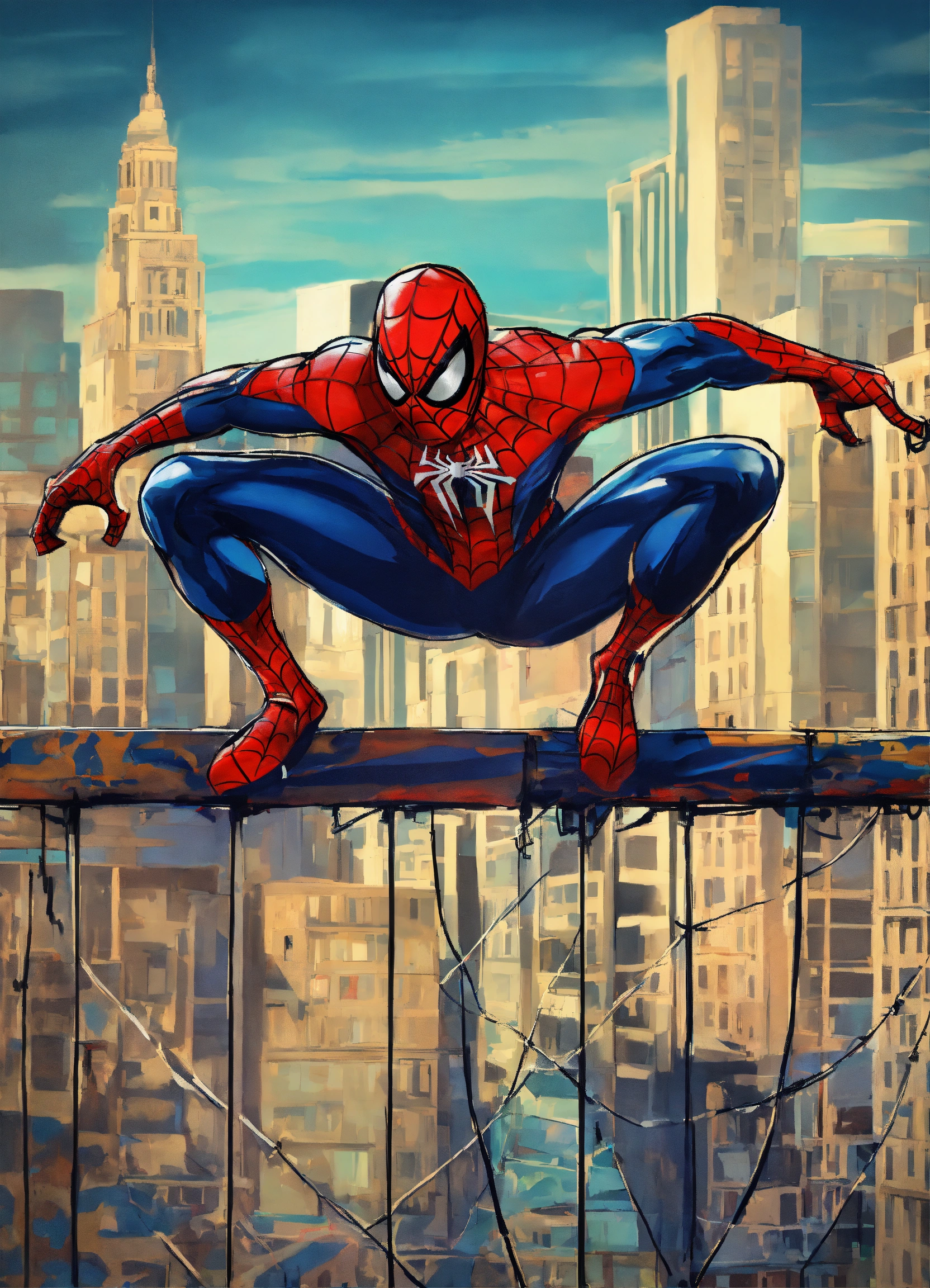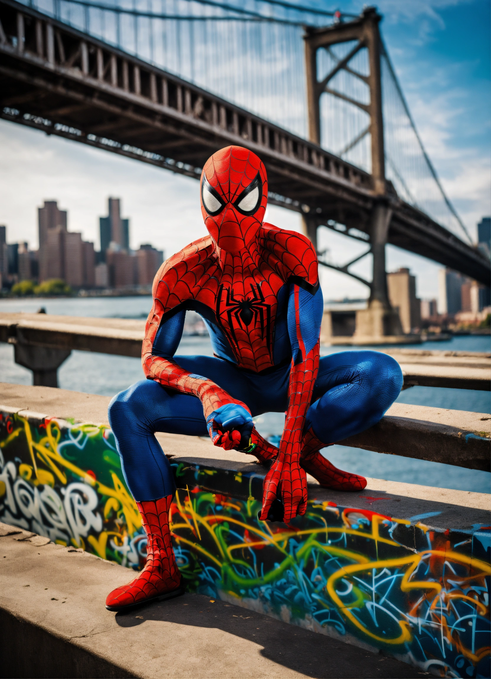 A graffiti spiderman with a city background and a bridge