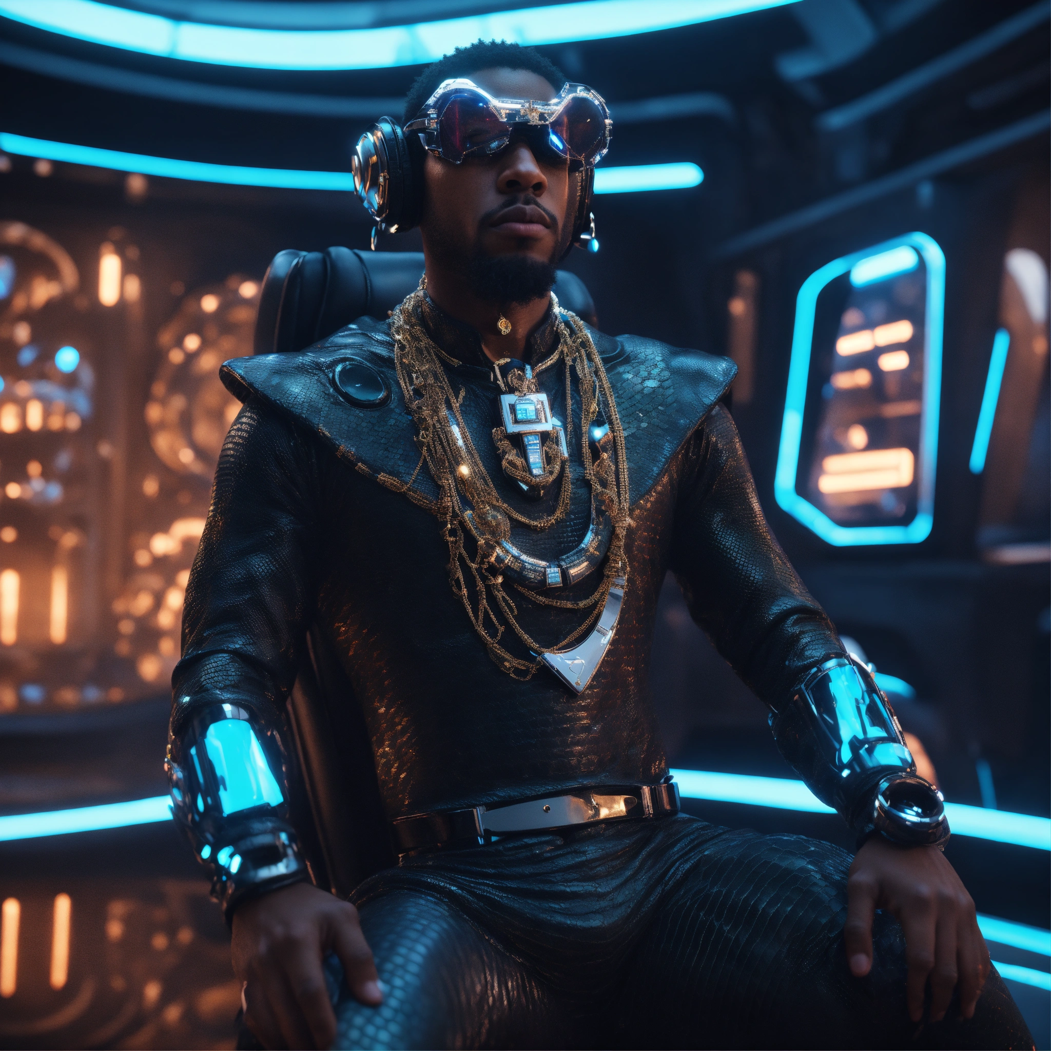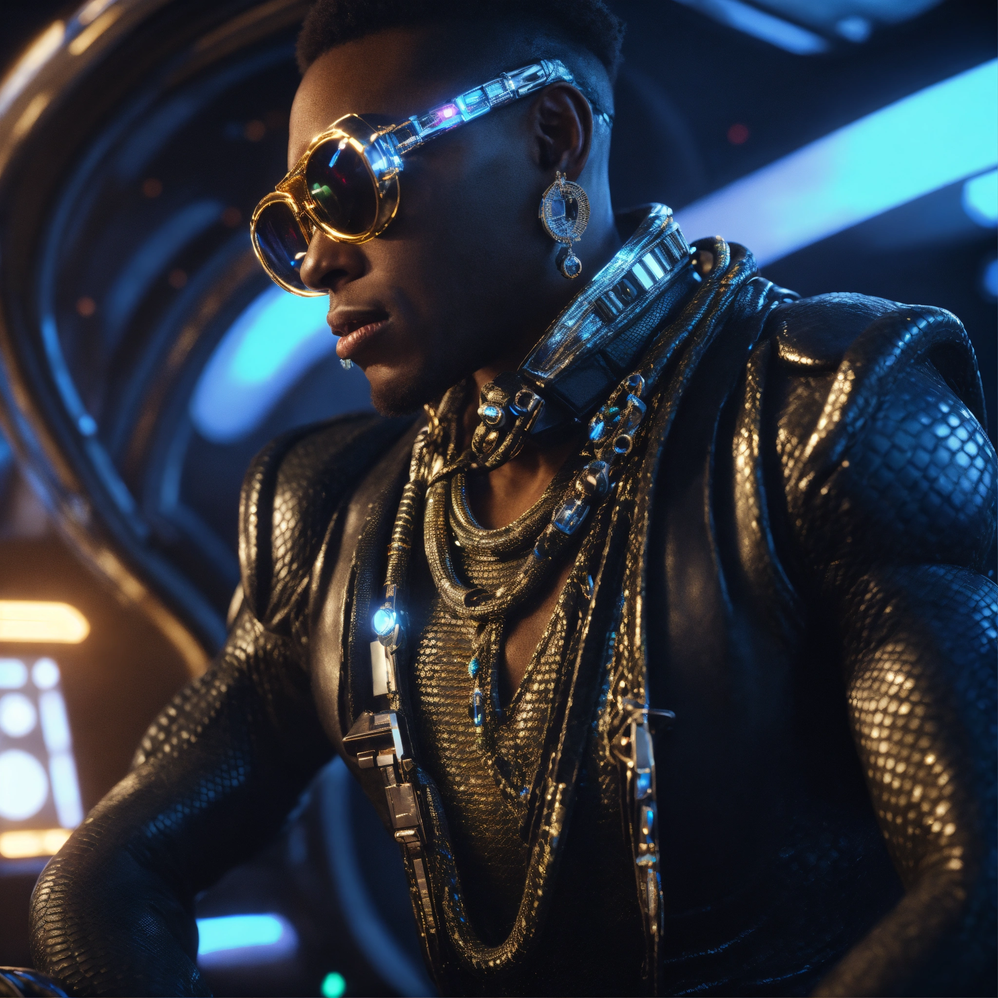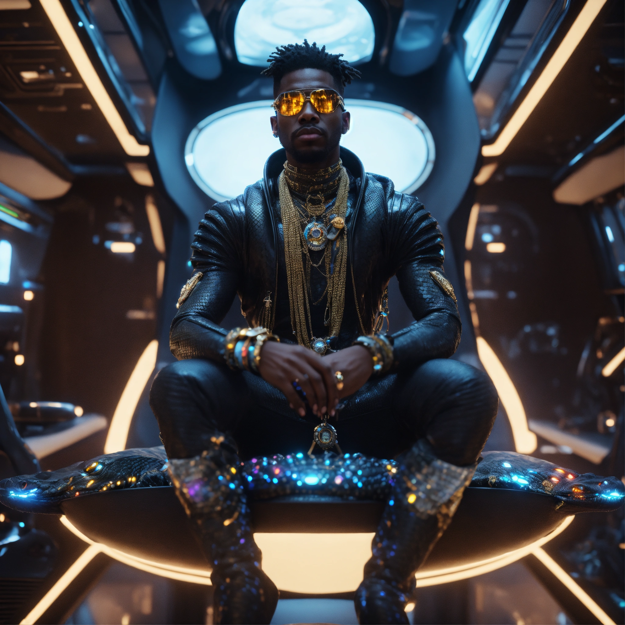 Zoom out from a cool black male reptile wearing space fashion with alot of jewelry lounging in a futuristic space yacht, realistic, futuristic, sci-fi, 8k, unreal engine