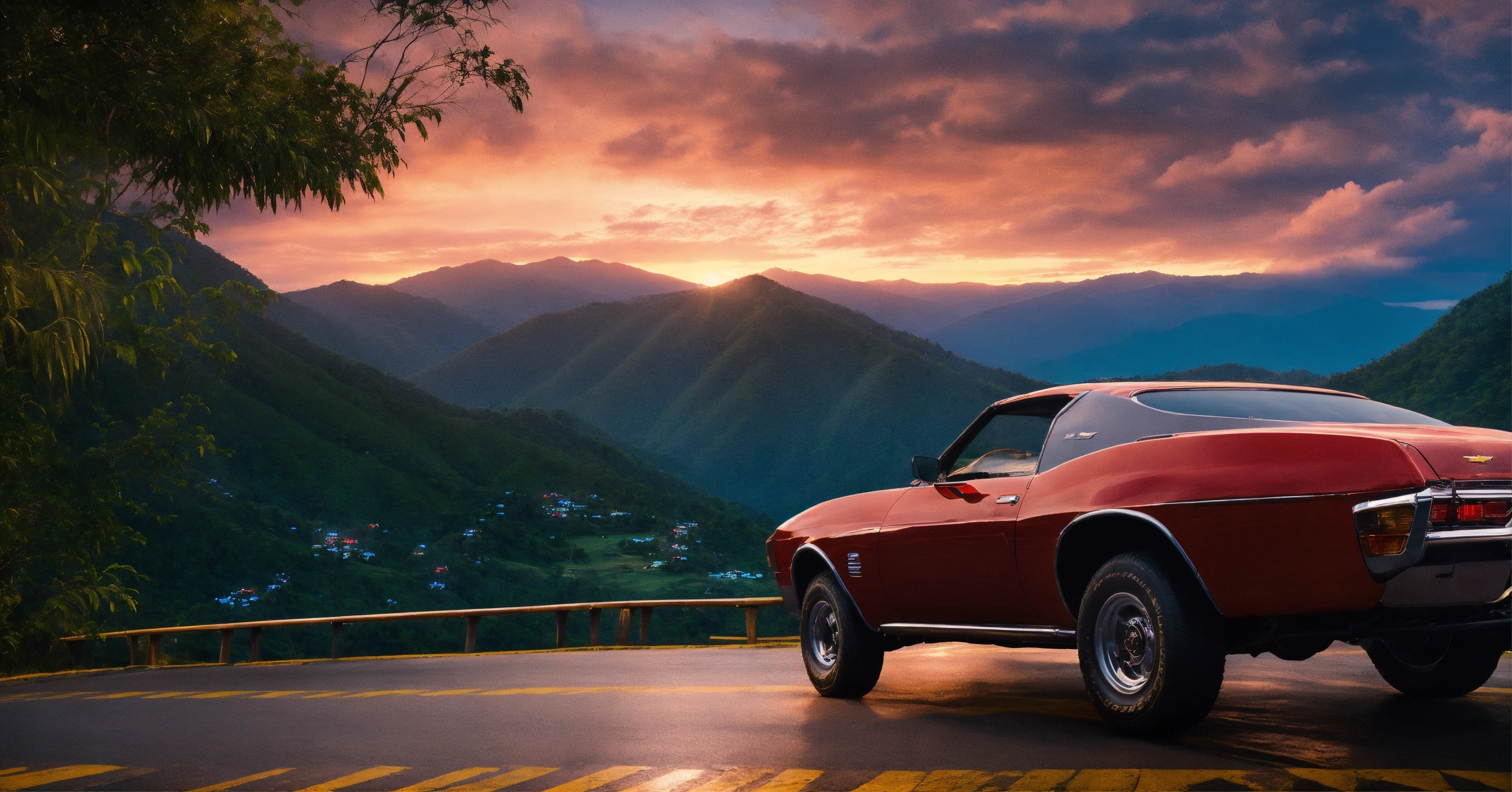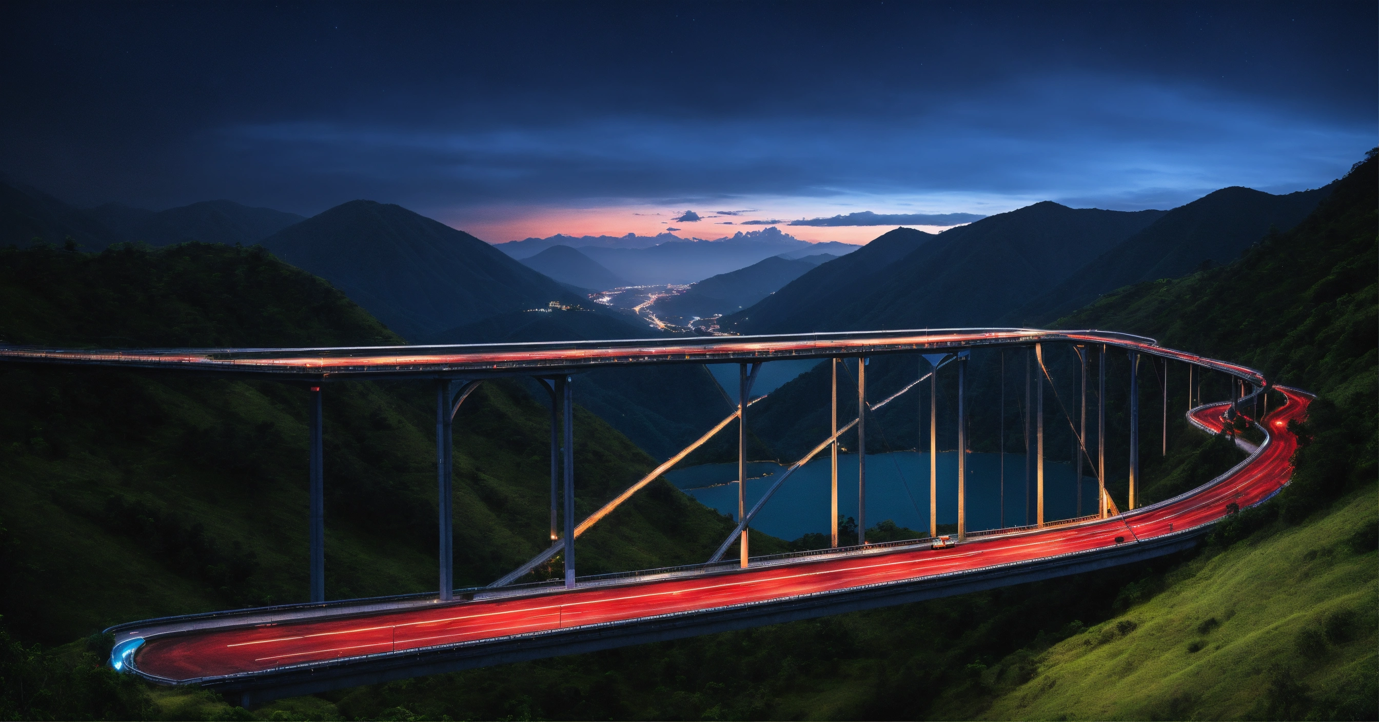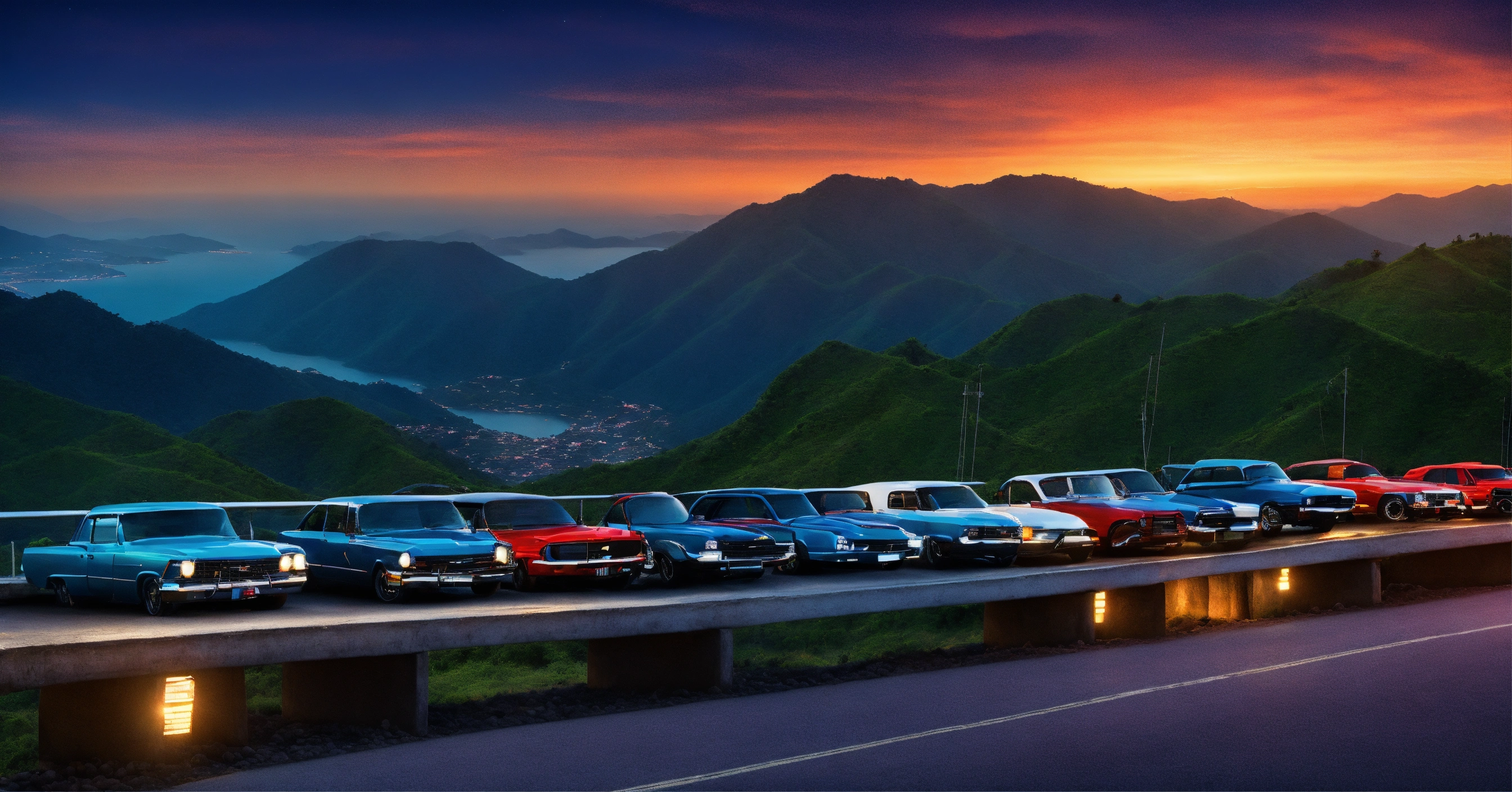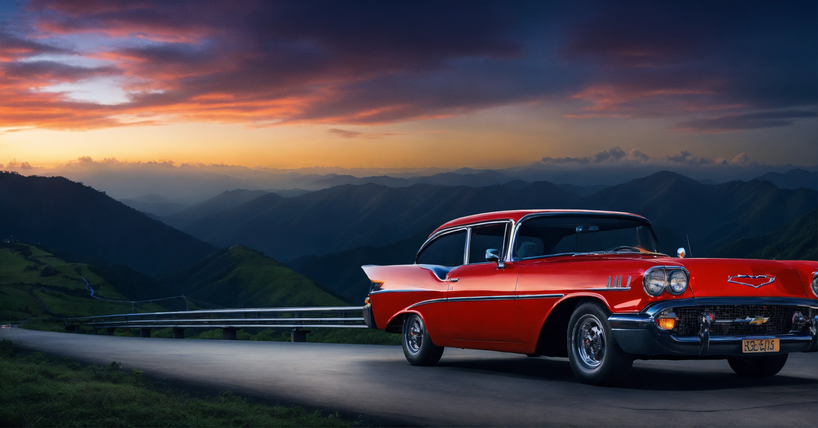 Create a nighttime colombian mountain landscape with a horizontally spanning bridge featuring five chevrolet cars. the image should be illuminated in shades of blue and red, with a full resolution, super-detailed, 4k quality, resembling a movie poster.