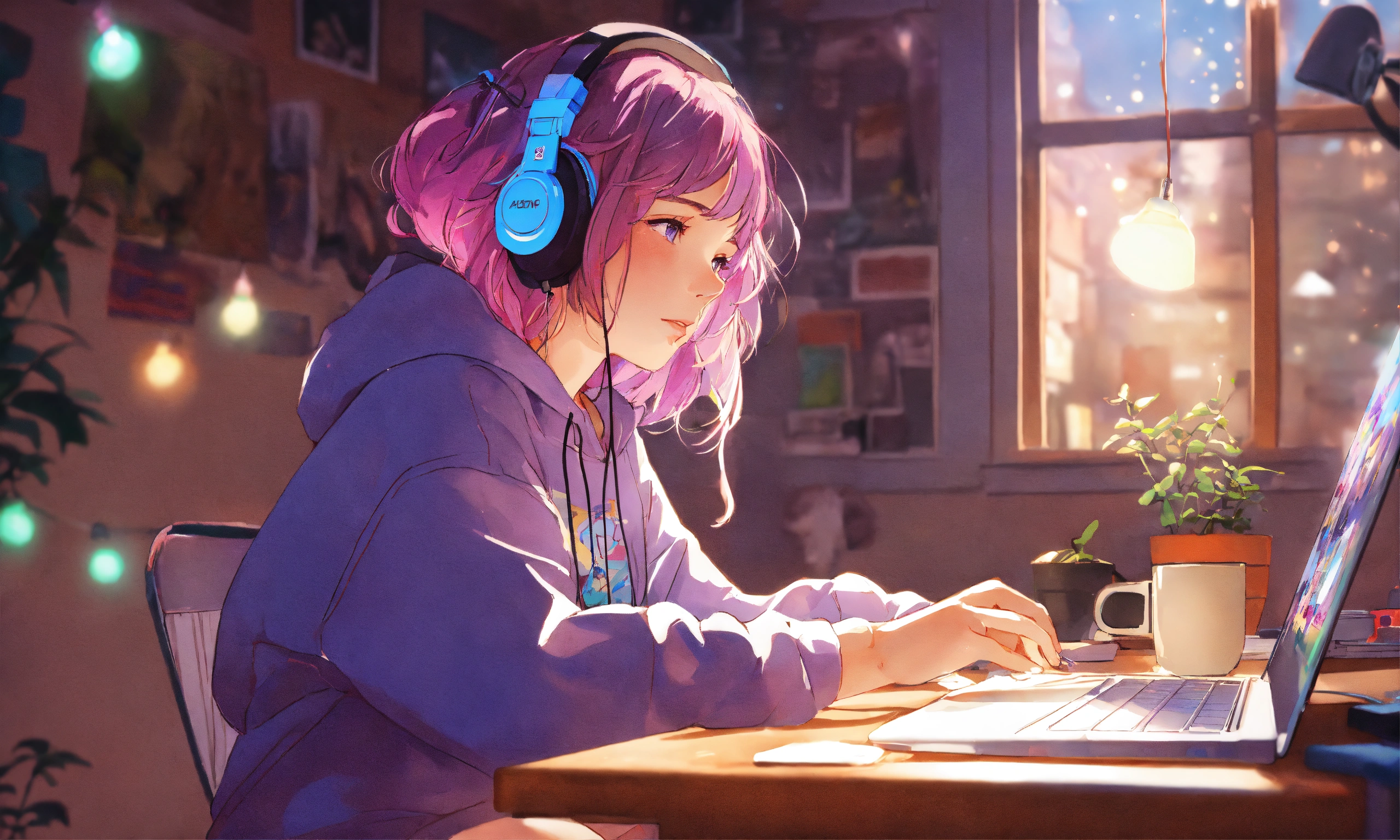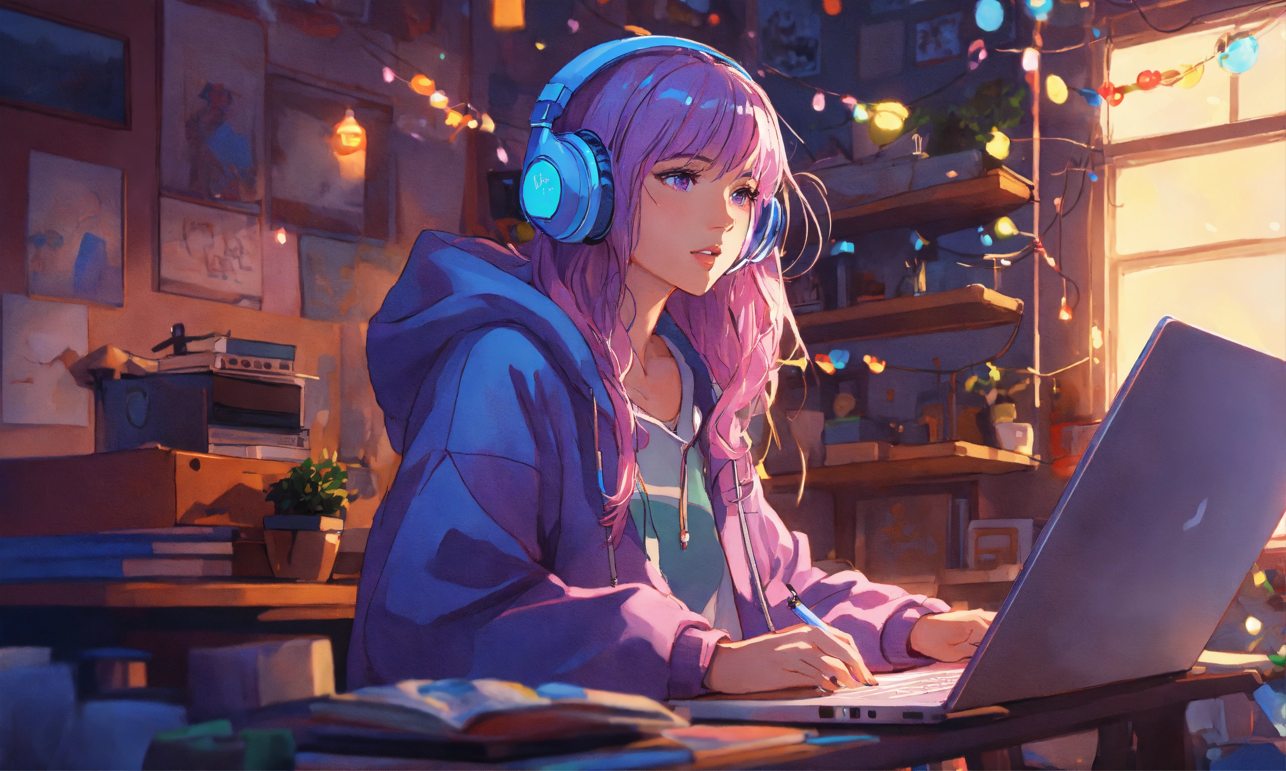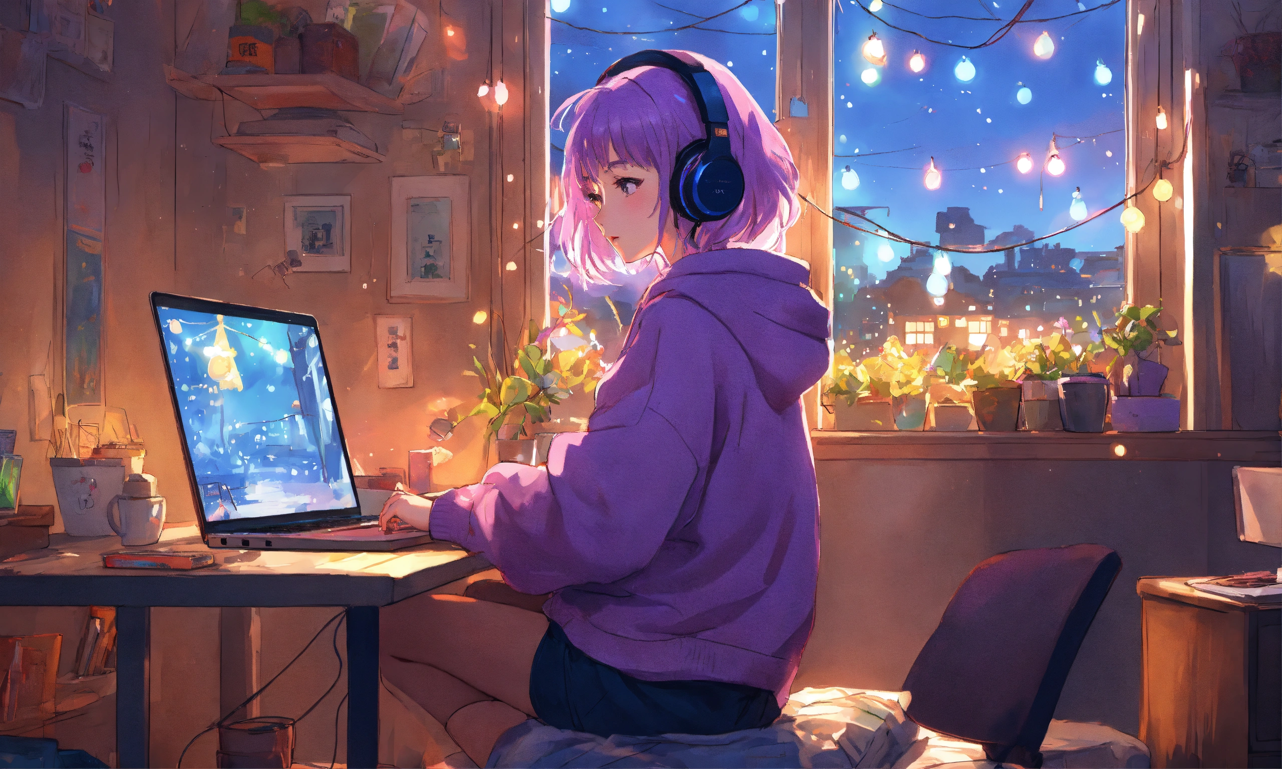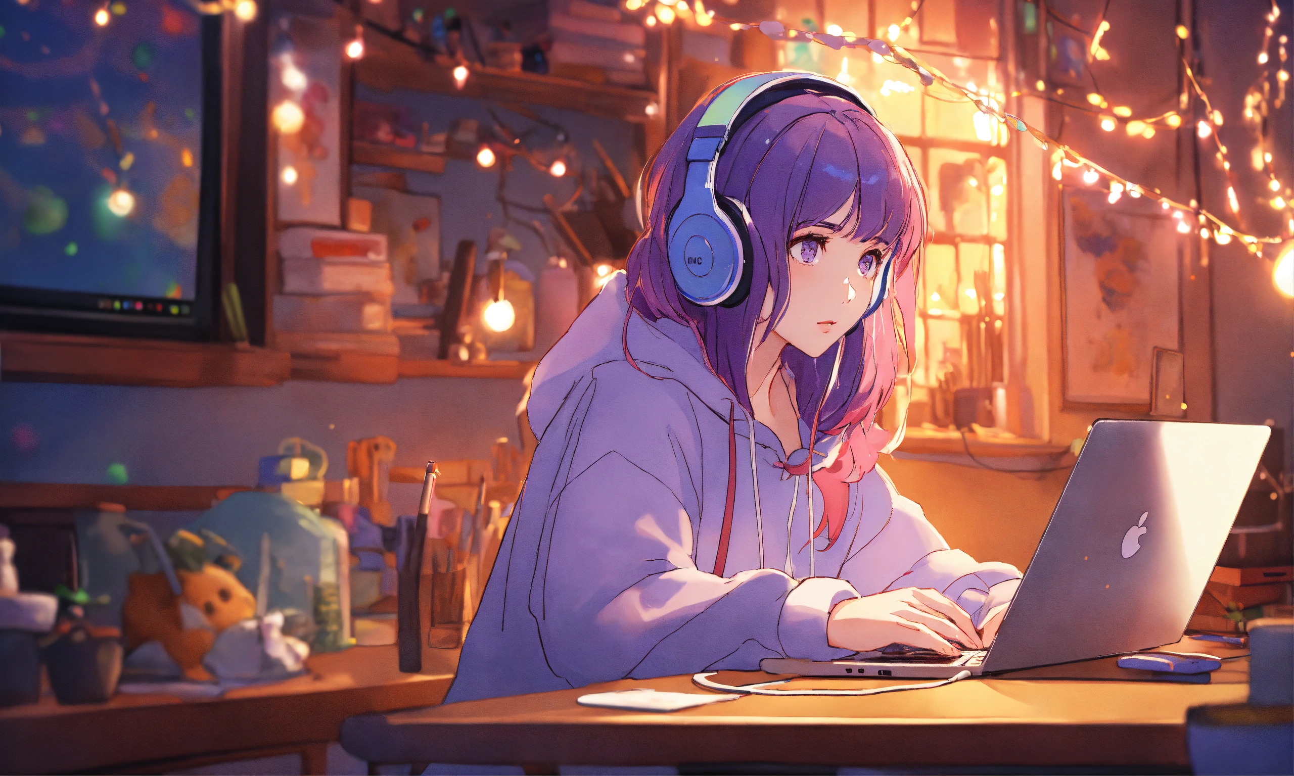 8k photo portrait of a stunning woman with violet hair in a pastel hoodie wearing headphones, working on a laptop, sitting on her bed in her cozy messy big room with lots of string lights at night, highly detailed, studio ghibli, akira toriyama, james gilleard, genshin impact, trending pixiv fanbox, acrylic palette knife, 4k, vibrant colors, far shot