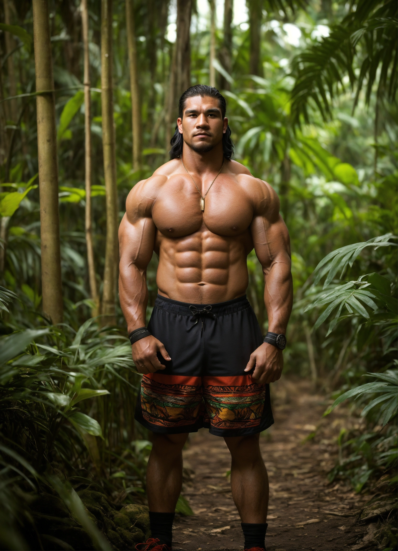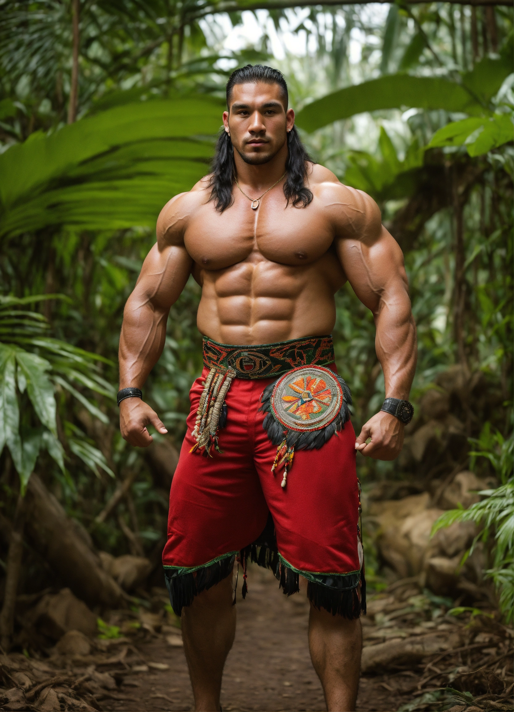 30-year-old man with big muscles, big bodybuilder, native american, body like a wrestler, in a jungle
