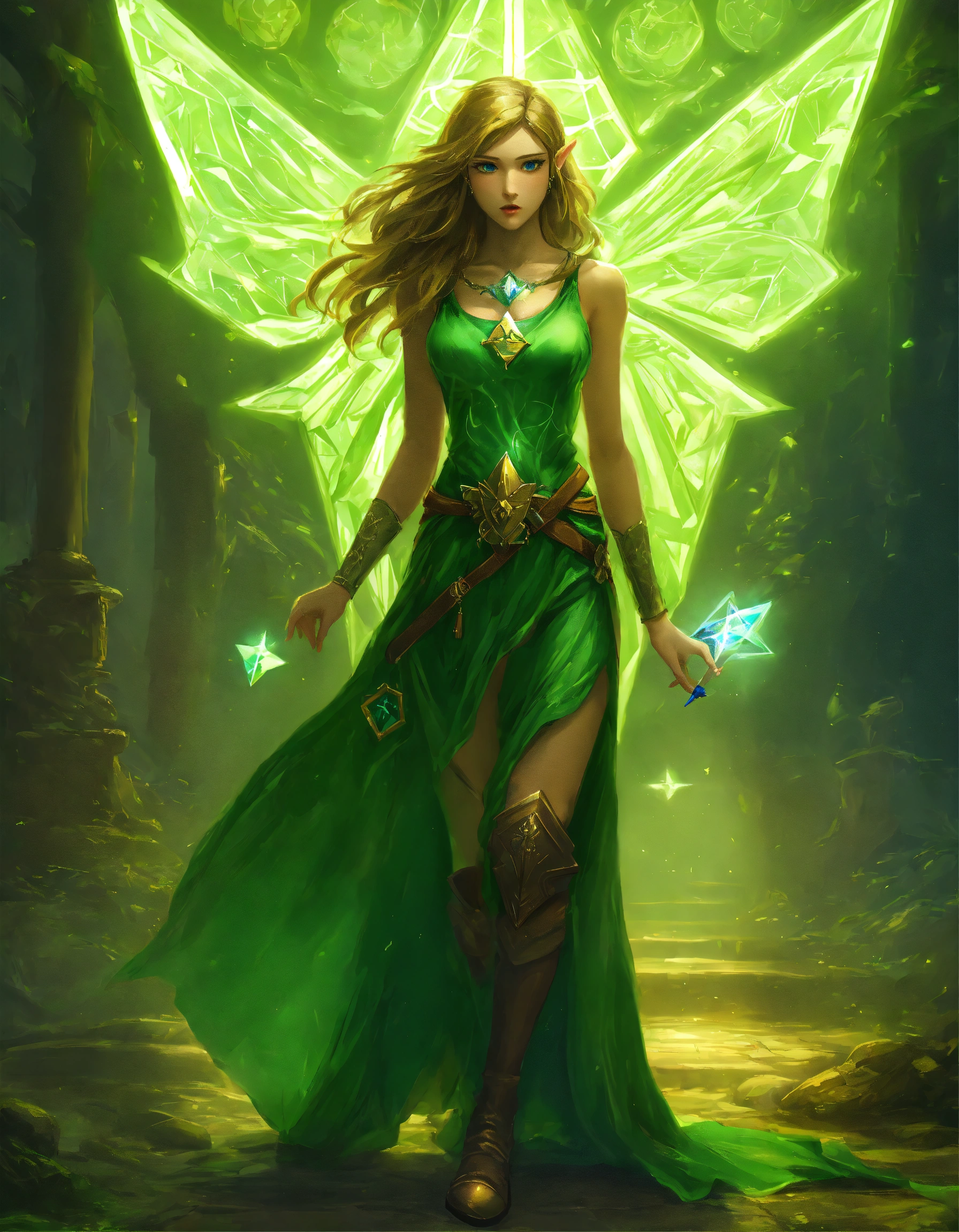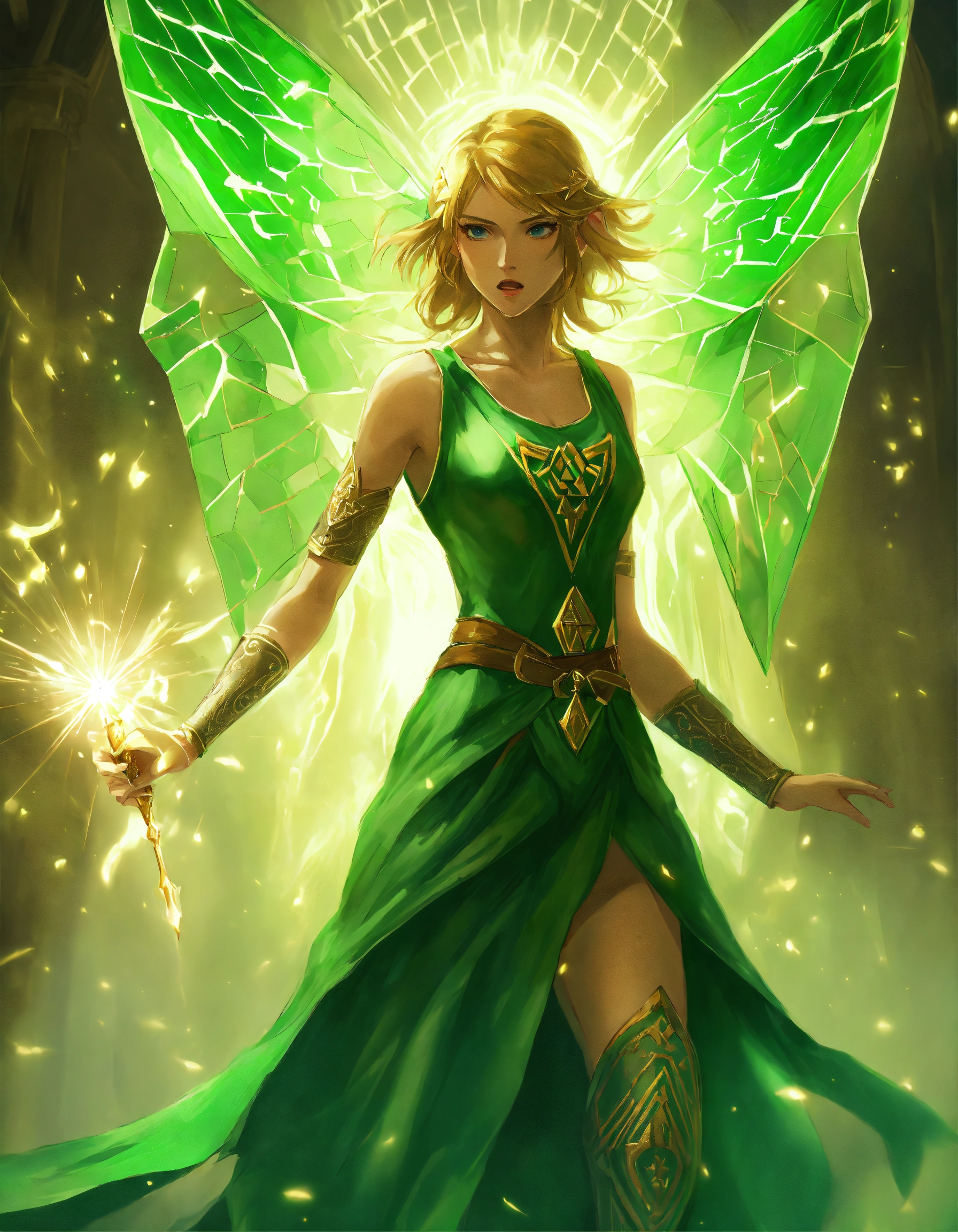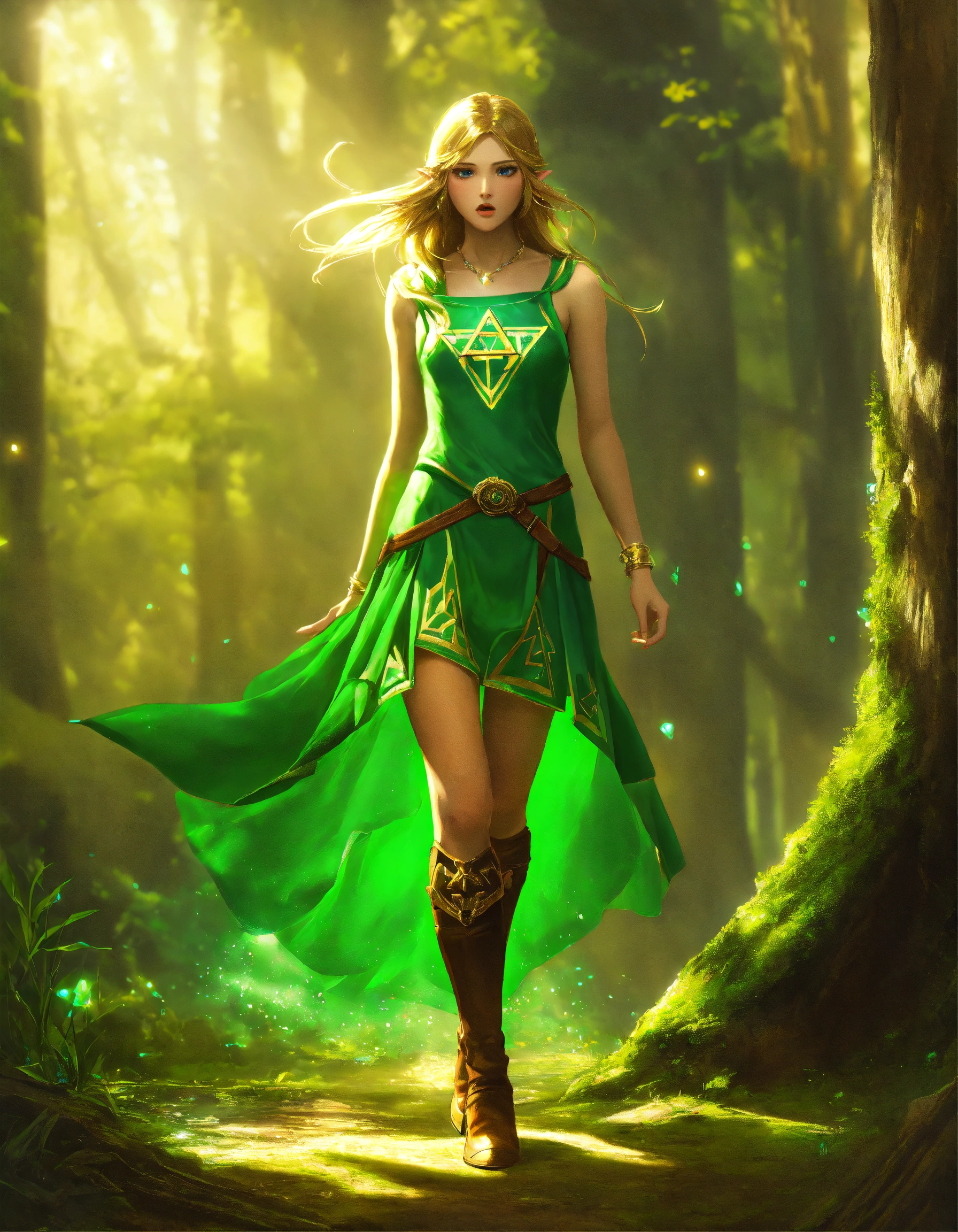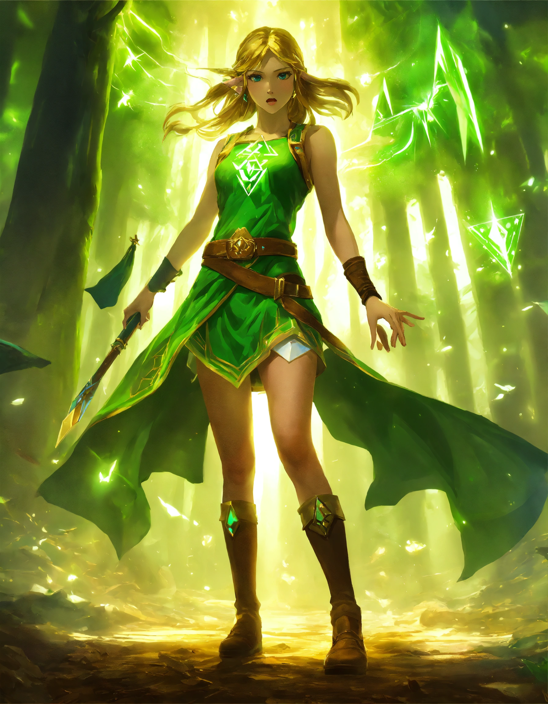 Full body fantasy art portrait of magic spell rays transforming link from legend of zelda into a slender woman sleeveless green silk short dress triforce looking down at themselves afraid shocked