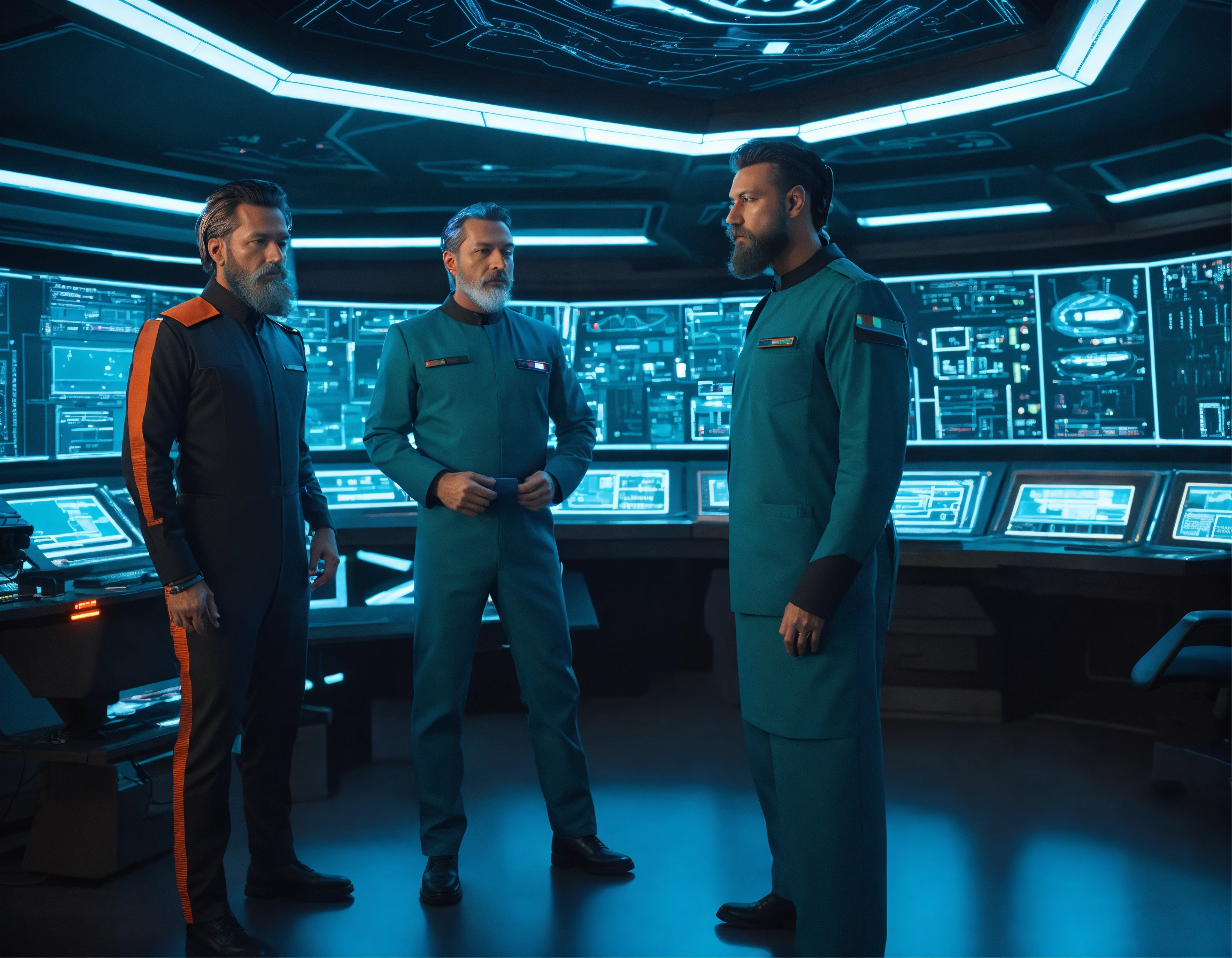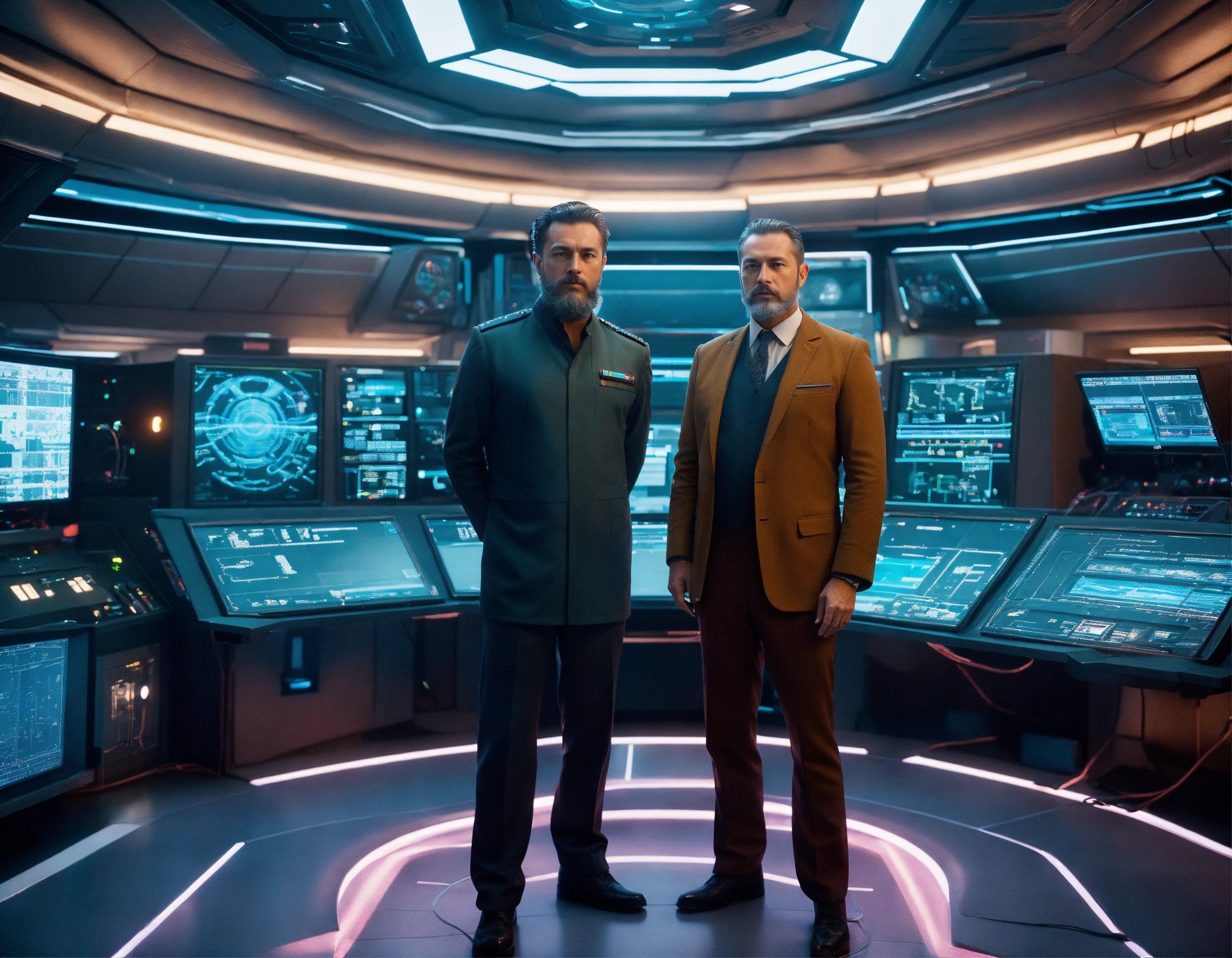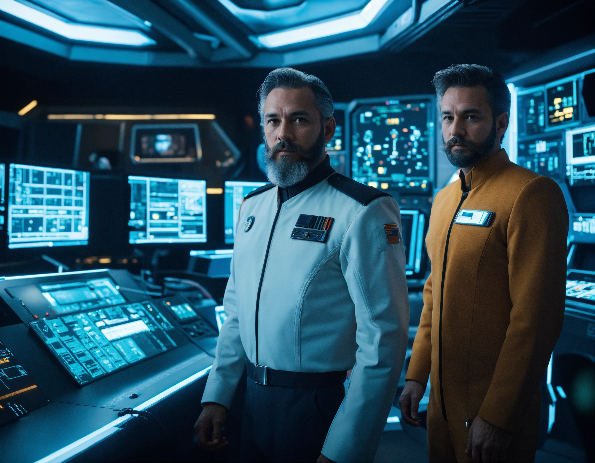 50 year old masculine star commander and nice trim beard standing with a younger doctor with no beard wearing a sleek uniform in a hi tech control room of a alien mother ship, 8k, tron, realistic