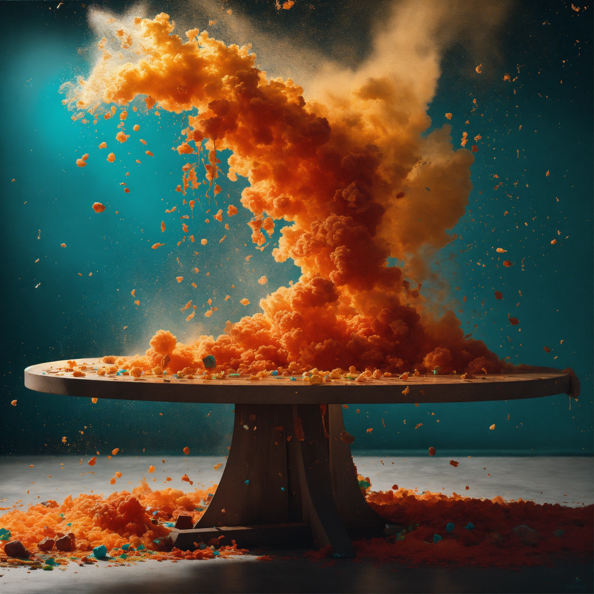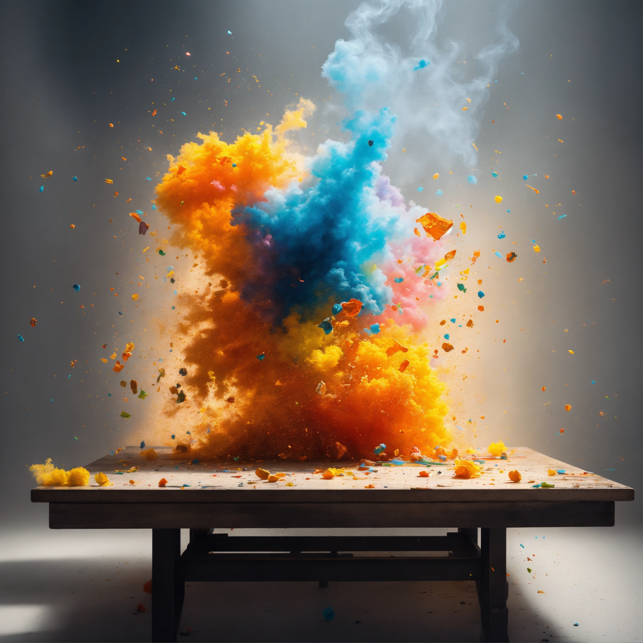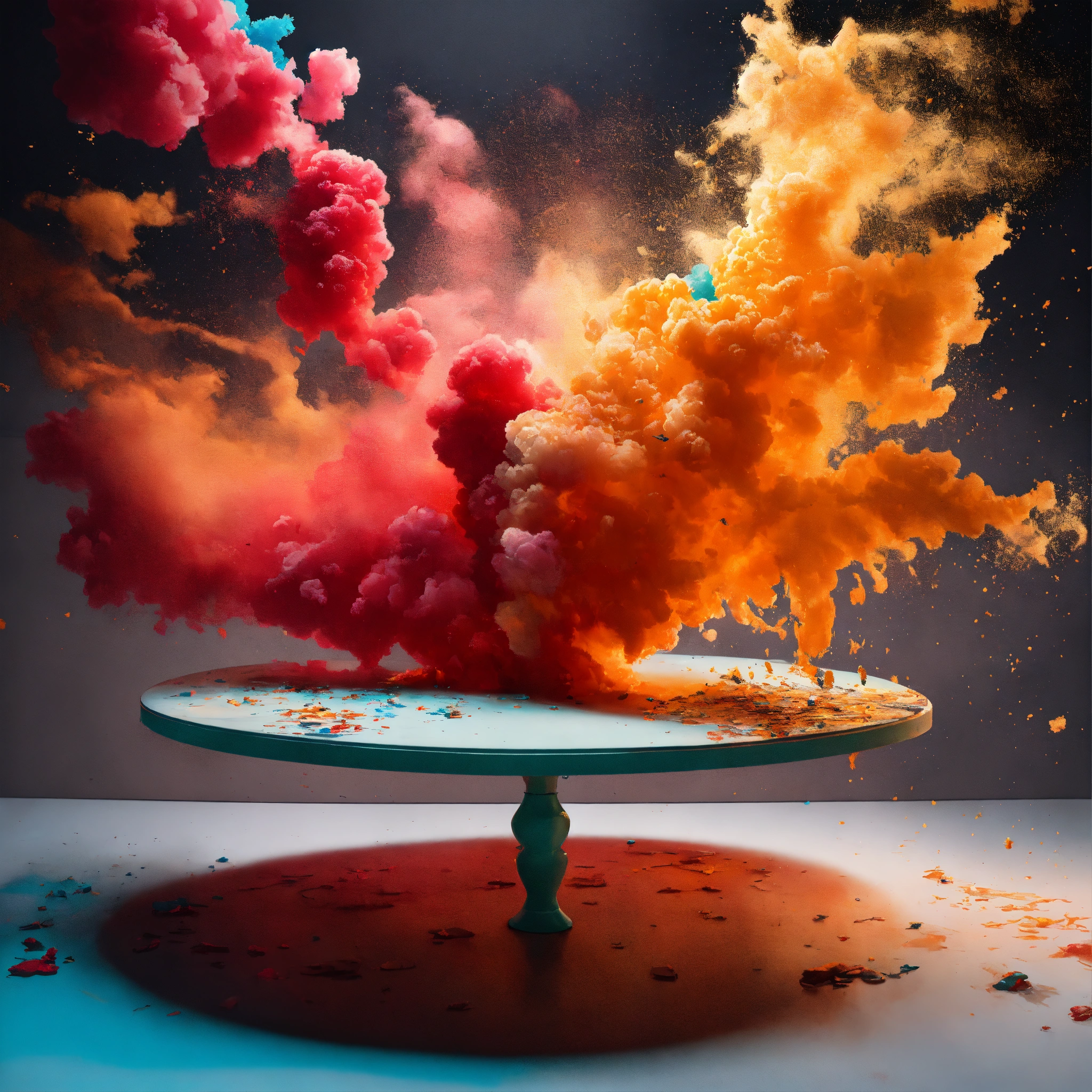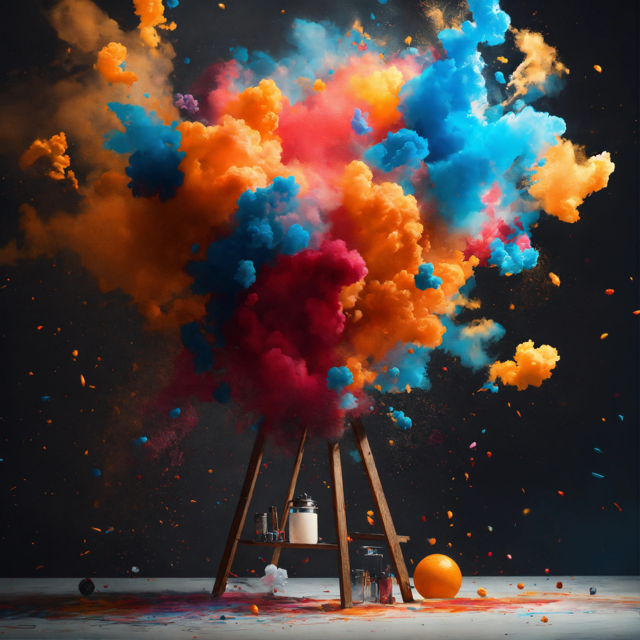 ((("capture dynamic splashes of art in a flying fashion photography" with art as the main subject, showcasing splashes of color and sparkle including pencil, orange and cyan paint, putty, fabric, special model, easel, and intense lighting. utilize high-speed photography for photorealistic surrealism style, with a white background and trending clean minimalist backdrop. include cuware, table, charcoal, and art medium elements. create 3 ad posters with pro-grade color grading, studio lighting, rim lights, layered comps, and shot with an eos-1d x mark iii camera. publish on 500px, behance, and consider concept art."), photorealistic images, high-speed photography, surrealism, white background, clean background, minimalist, cuware, table, steam, smoke, ad posters, pro-grade color grading, studio lighting, rim lights, layered comps, eos-1d x mark iii, 500px, behance, concept art), photo