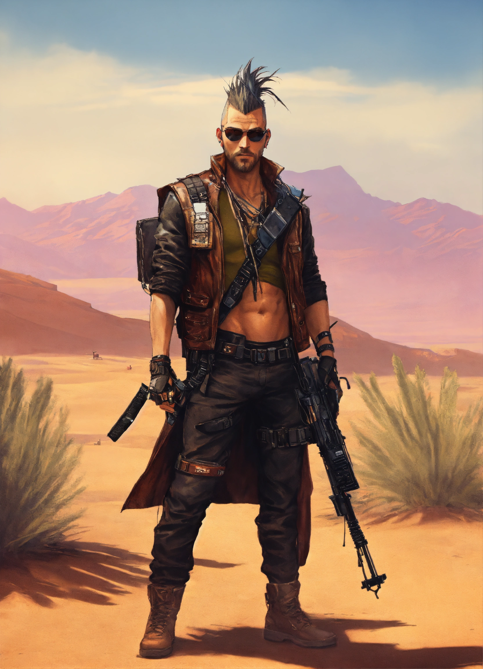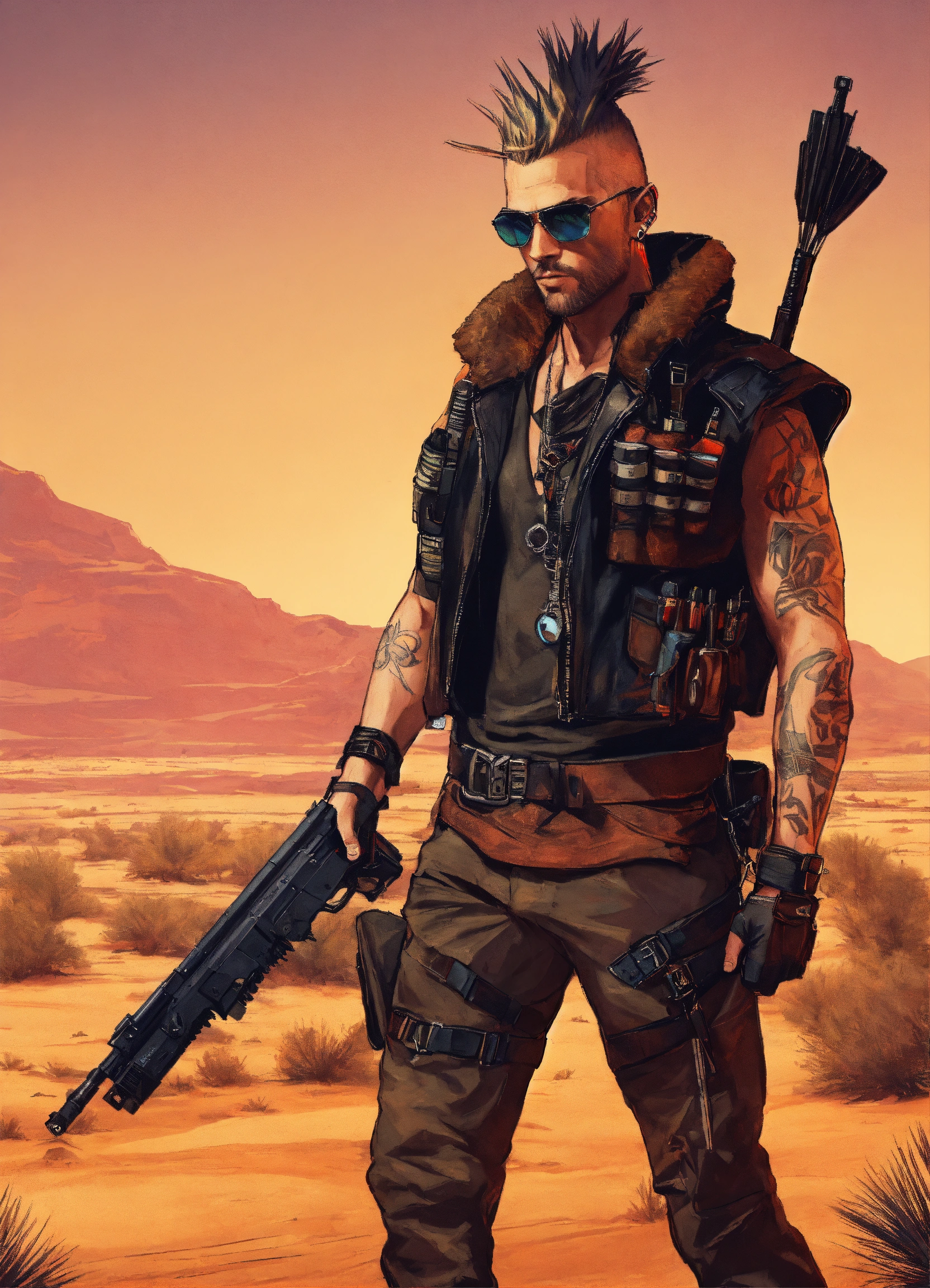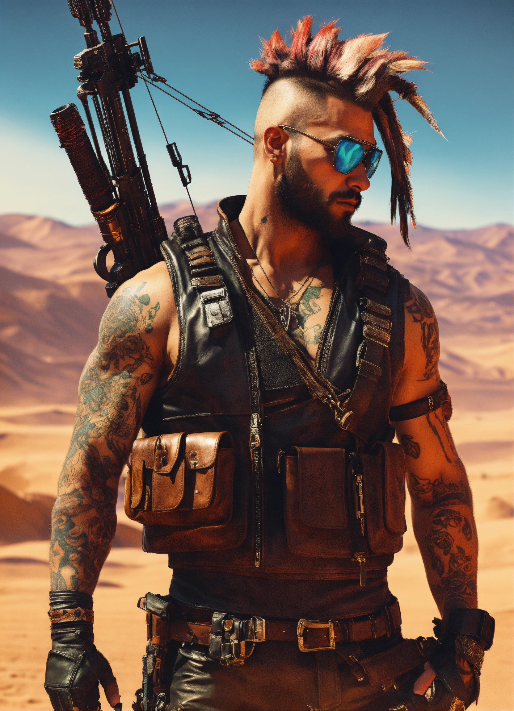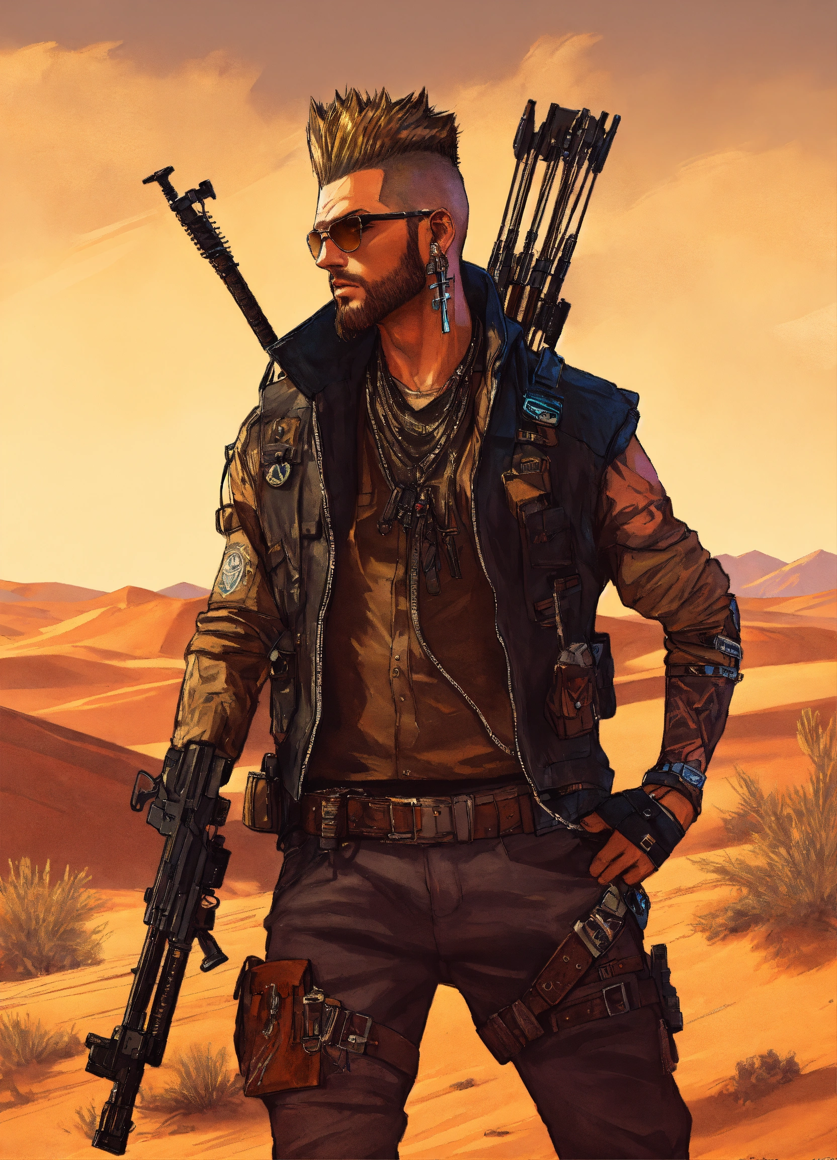 Dangerous cyberpunk nomad with mohawk and leather vest with cross bow in desert gta poster style art