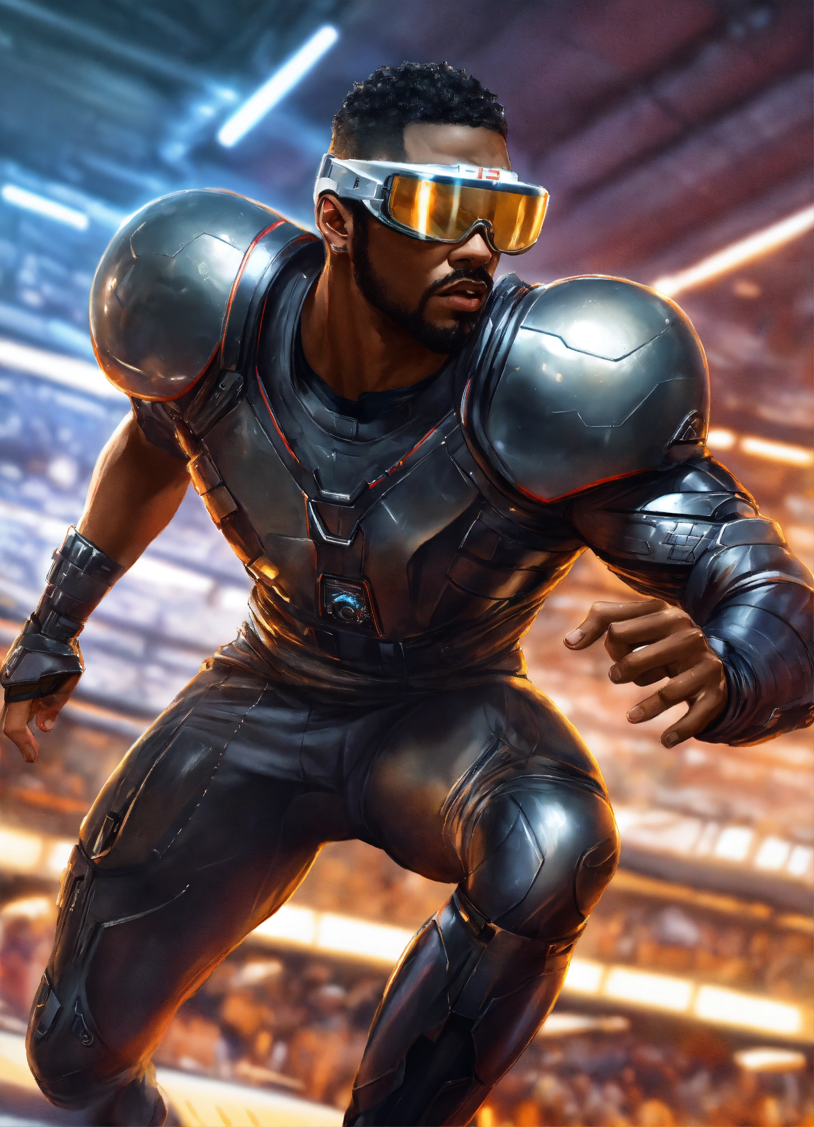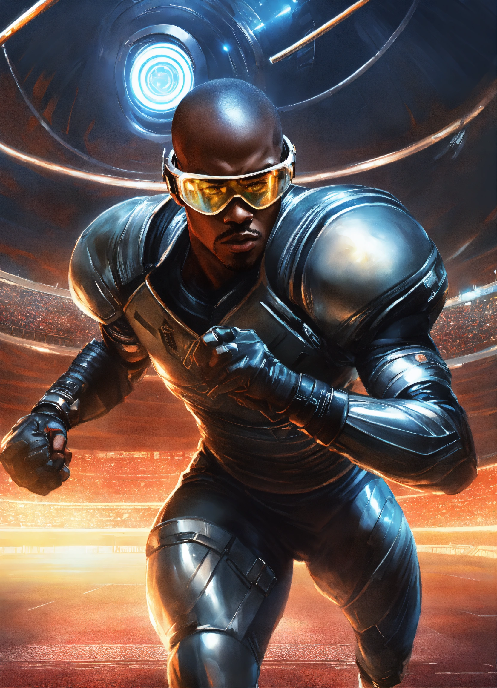 Muscular rude black male defiant speedball scifi player on a steel game field, wearing cyberpunk glasses, scifi stadium background, running, wielding a metal ball, wearing retrofuturistic spandex sport uniform black and silver, scifi, fantasy, speedball, rollerball, fantasy football, highly detailed, art by donnato giancola, greg rutkowsky