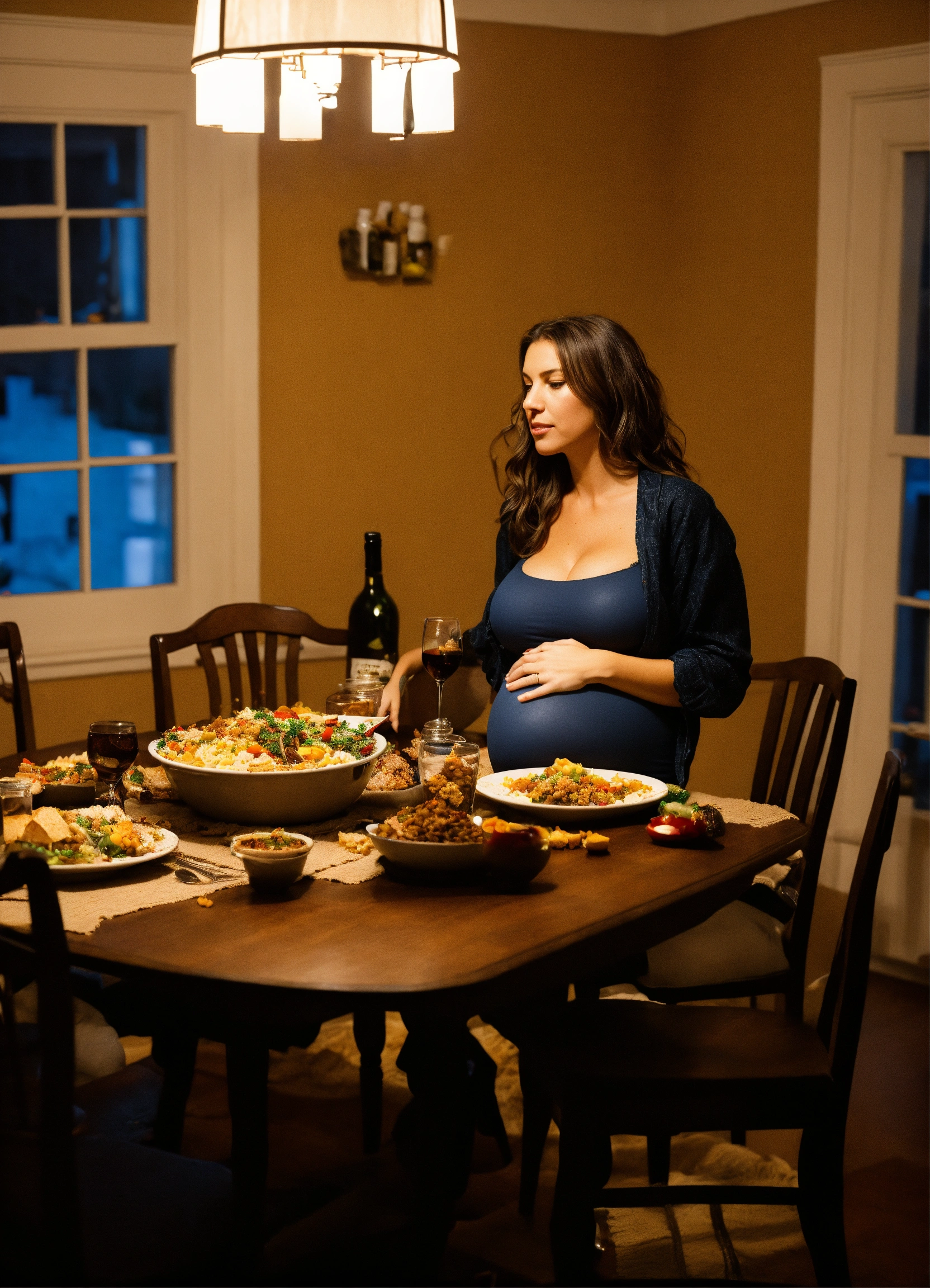 Pregnant-looking caucasian woman in her 20s. unbuttoned jeans, bra. leaning back at a dining table after a huge thanksgiving dinner. they appear very full and relaxed, feeling about to burst. in front of them is a dining table littered with crumbs and leftovers, highlighting the completion of a hearty meal. the scene conveys a feeling of heaviness post-dinner.