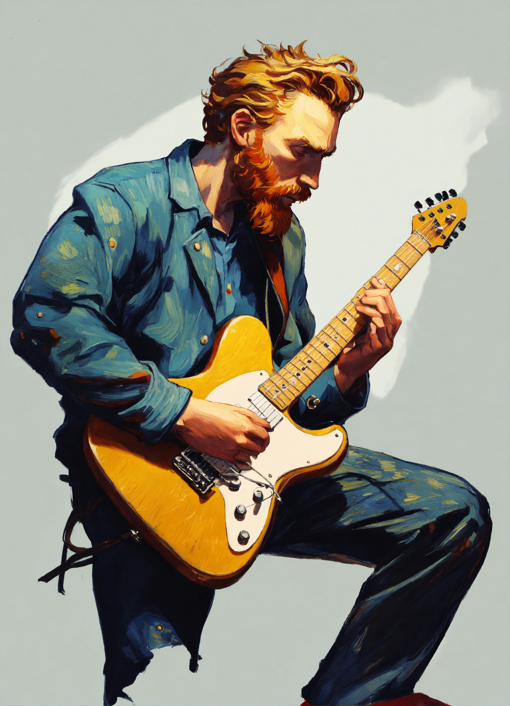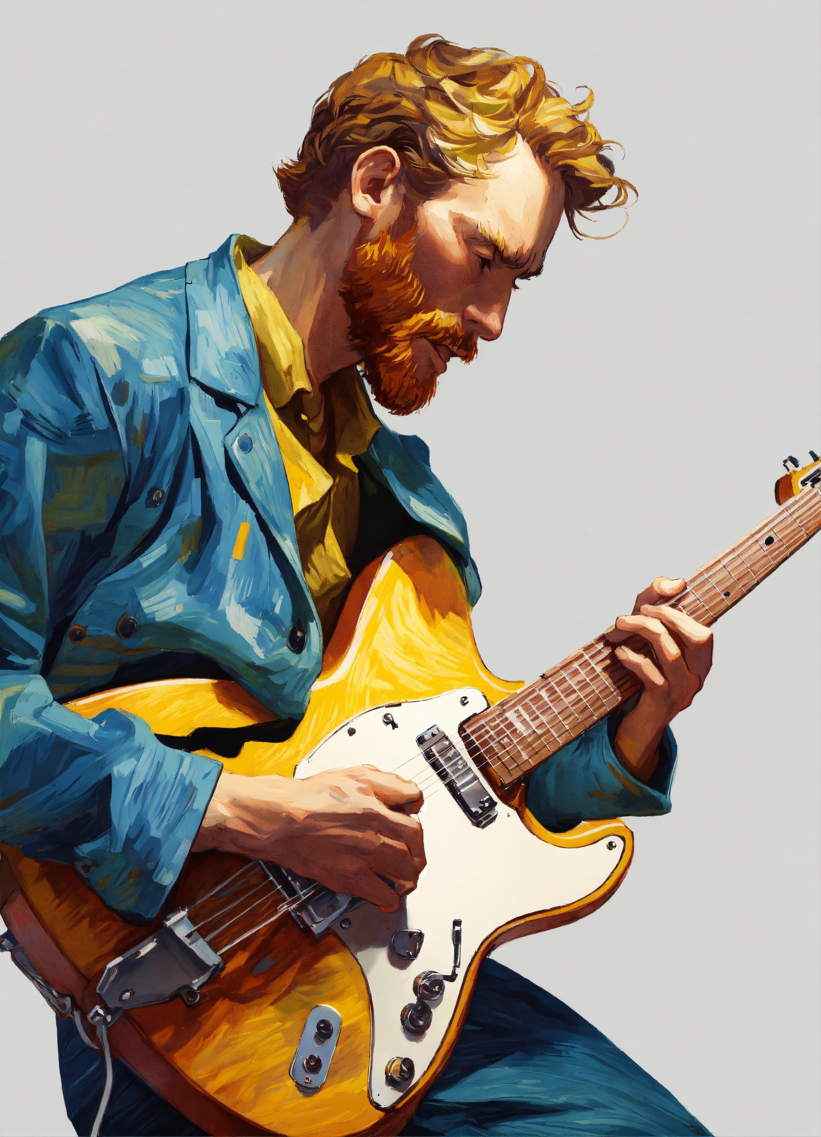 White background, a realistic accurate representation of vincent van gogh playing electric guitar, striking action pose, modern cartoon, highly detailed, vibrant colors, concept art, on a plain solid white background